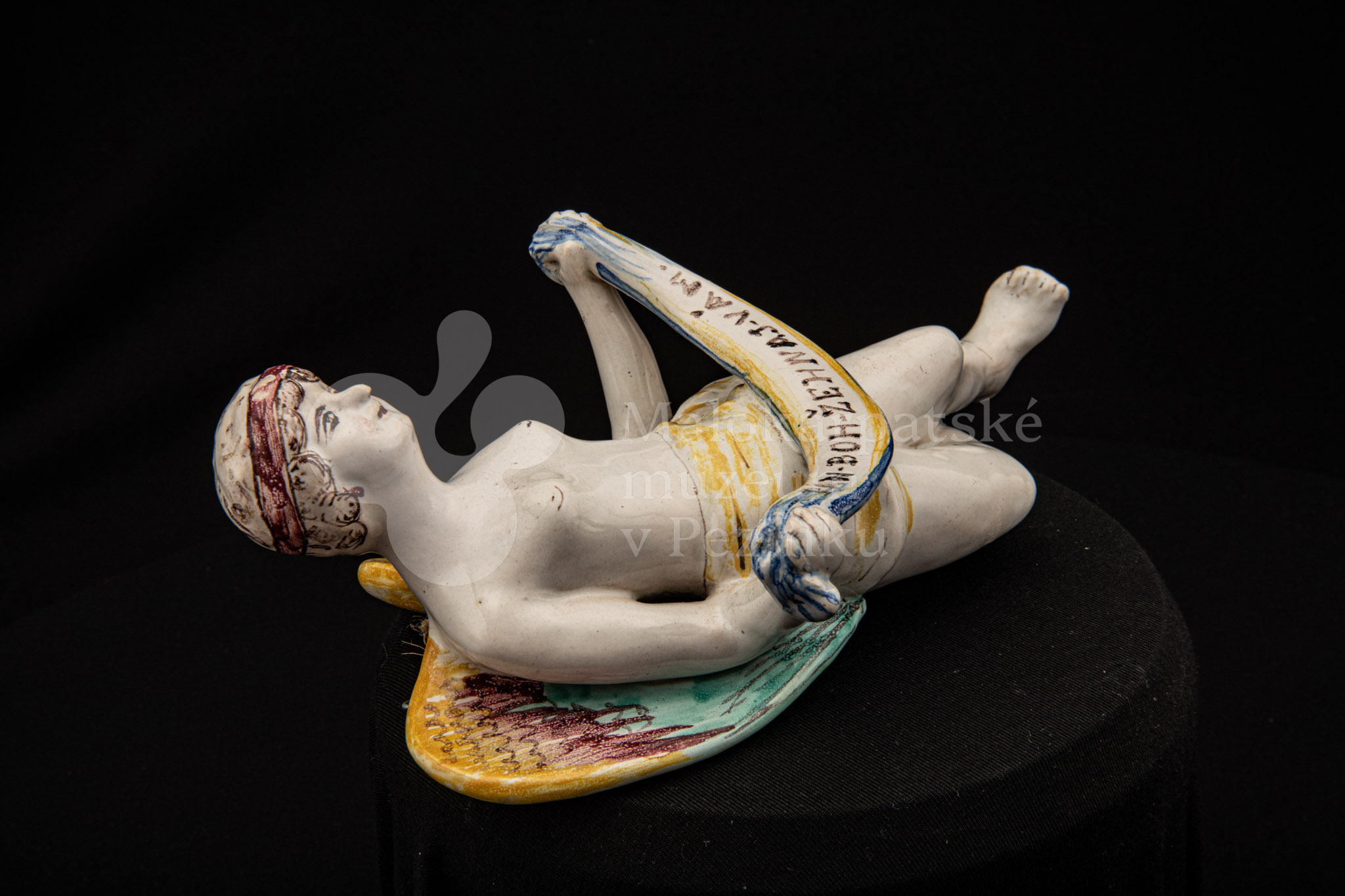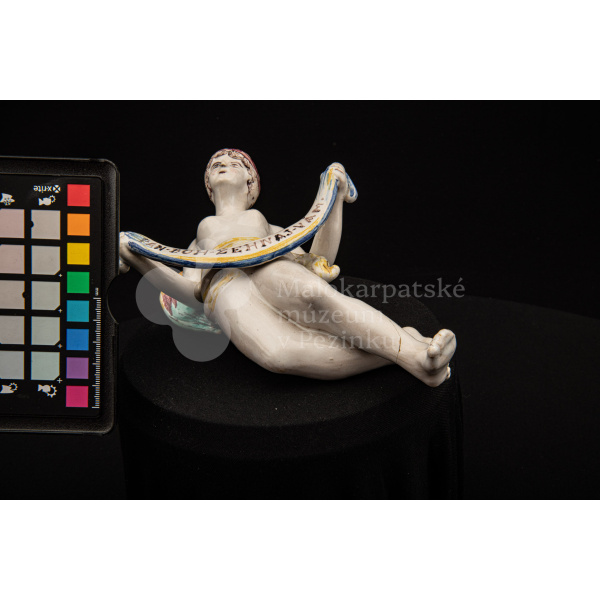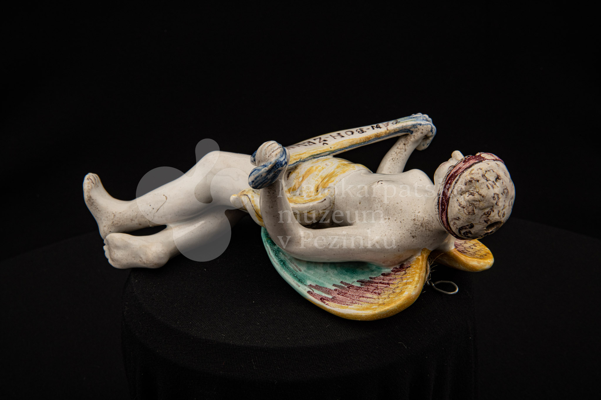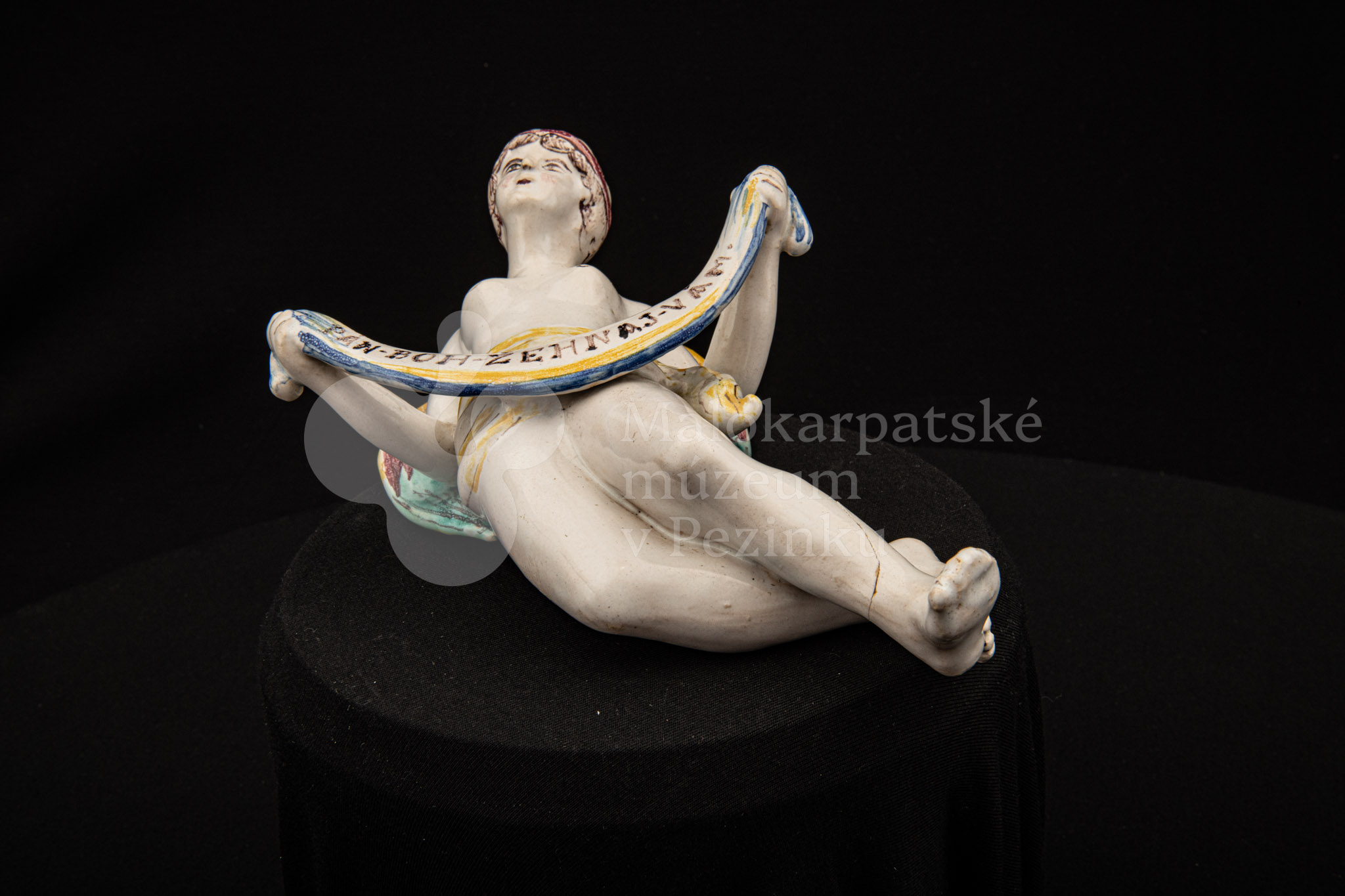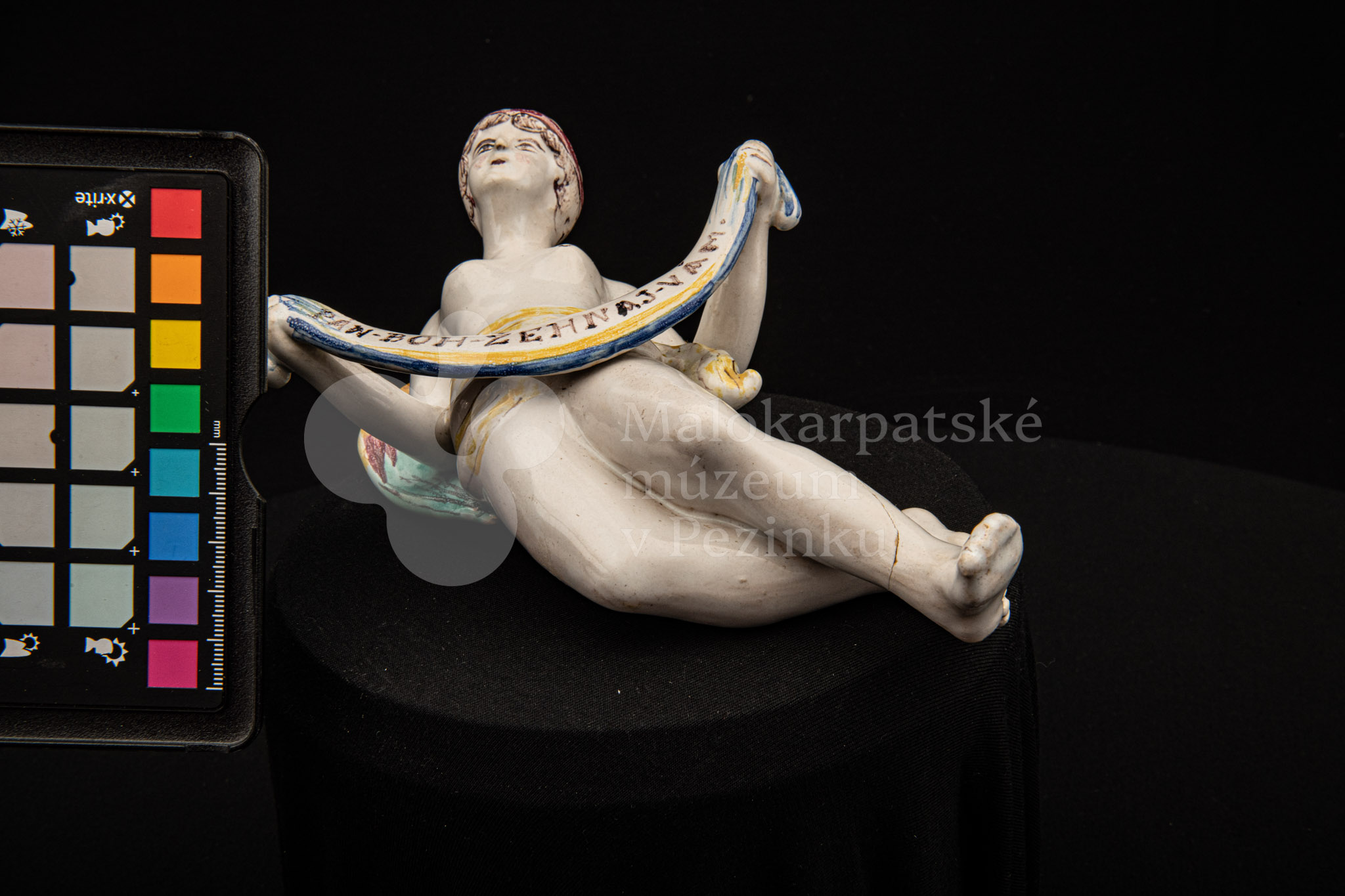 Závesná plastika fajansová – letiaci anjel v rukách drží stuhu s nápisom „Nech Boh žehná Vám“. Bieloglazovaný so žltočervenými a zelenými krídlami. V krátkych vlasoch má červenú stuhu. Na rube krídel značenie FK.ST.