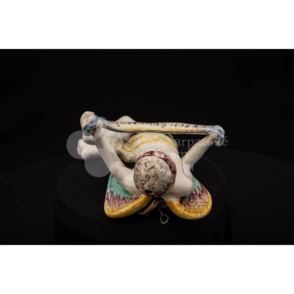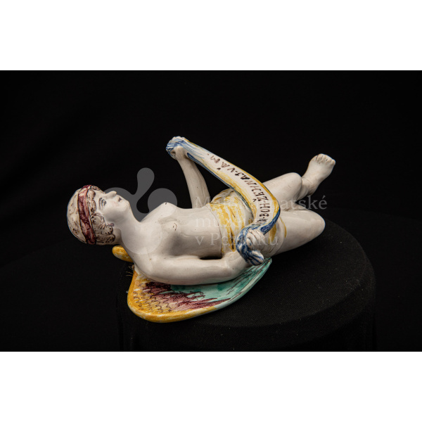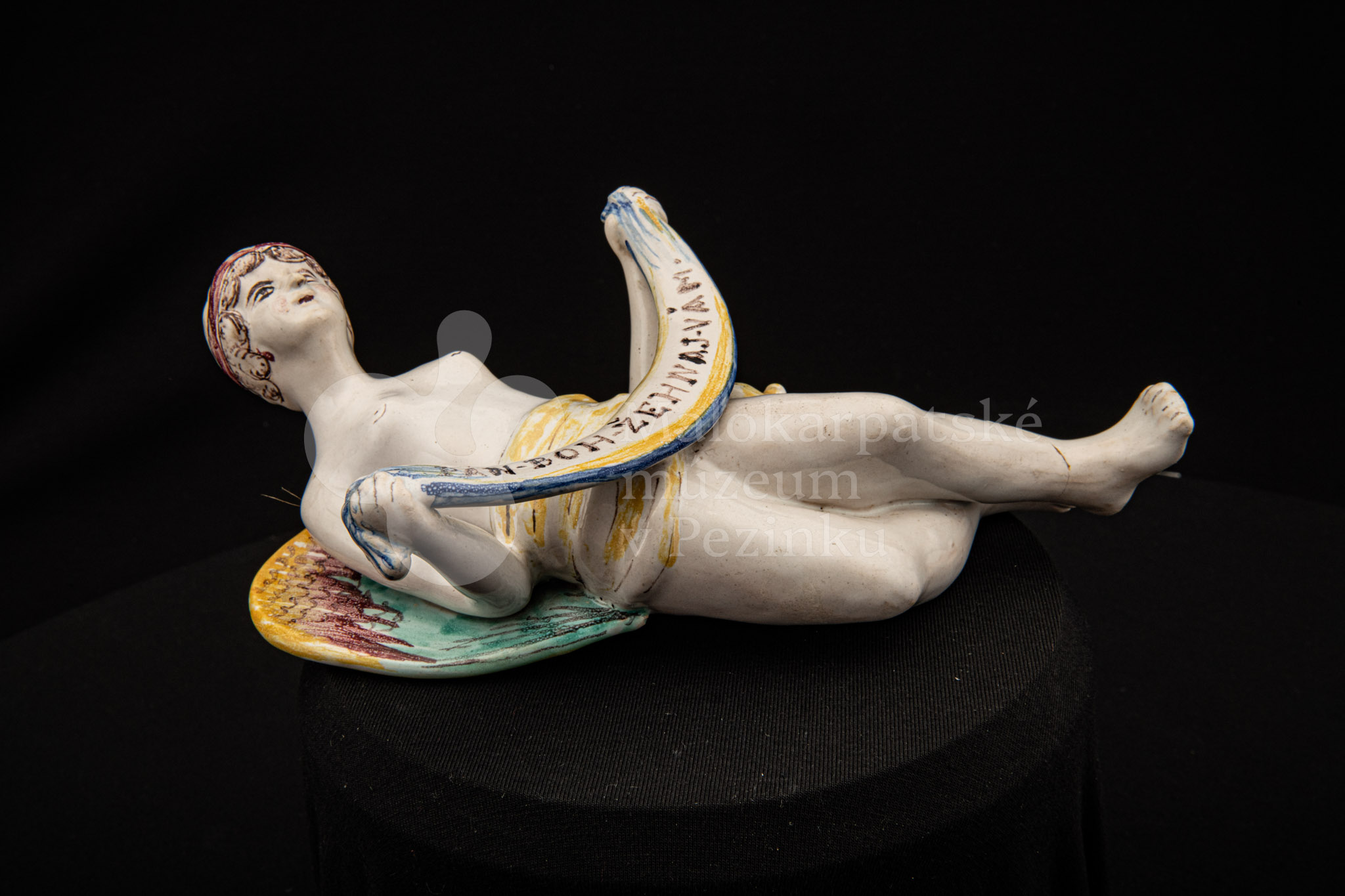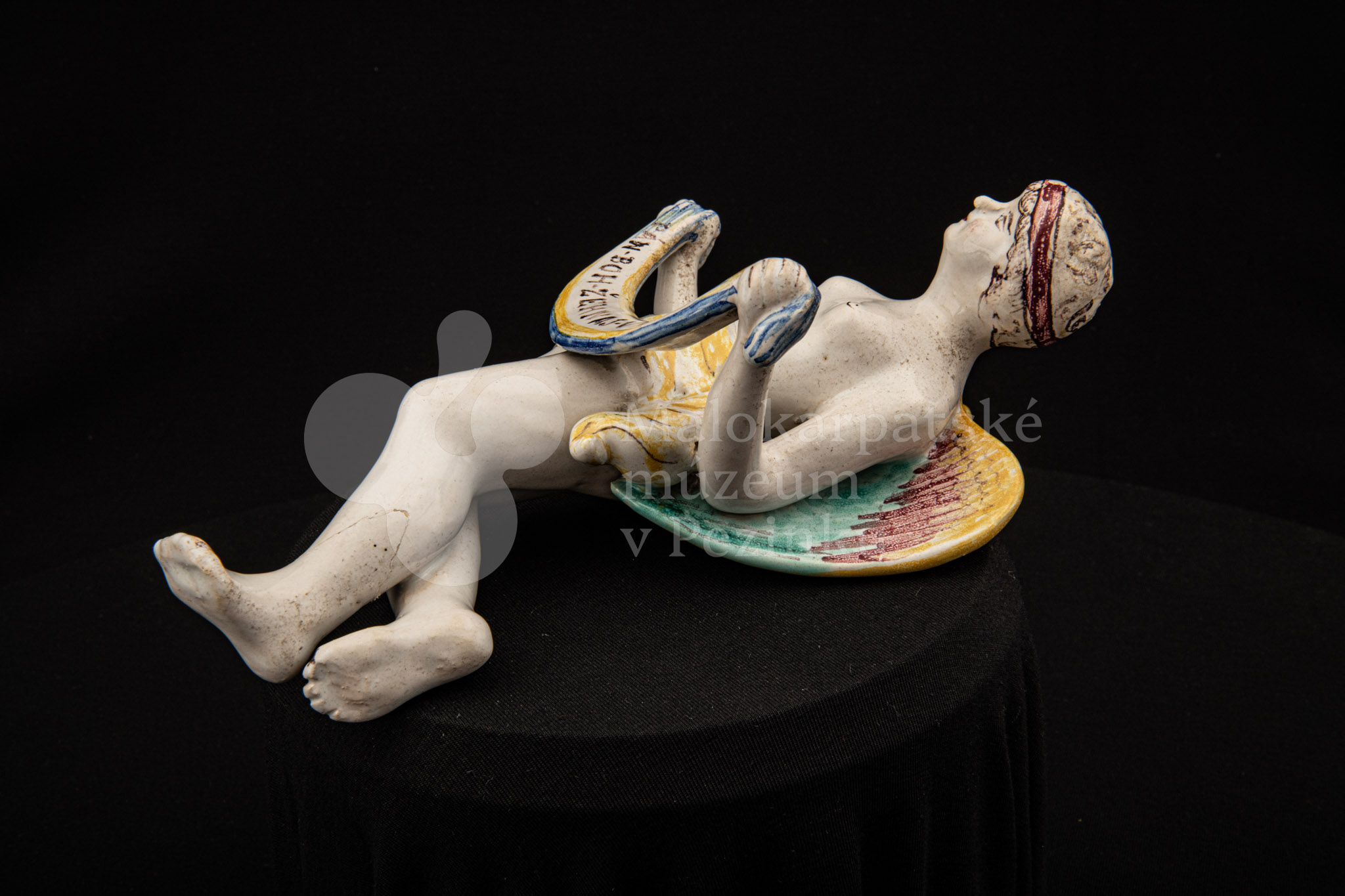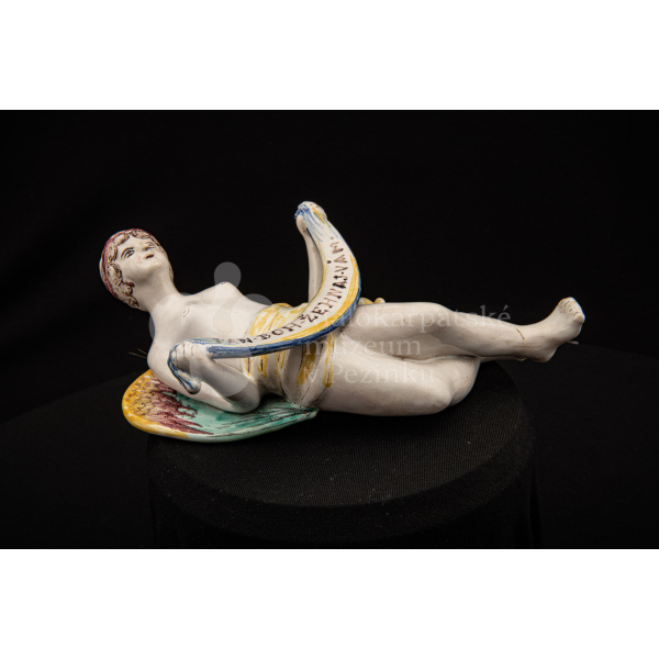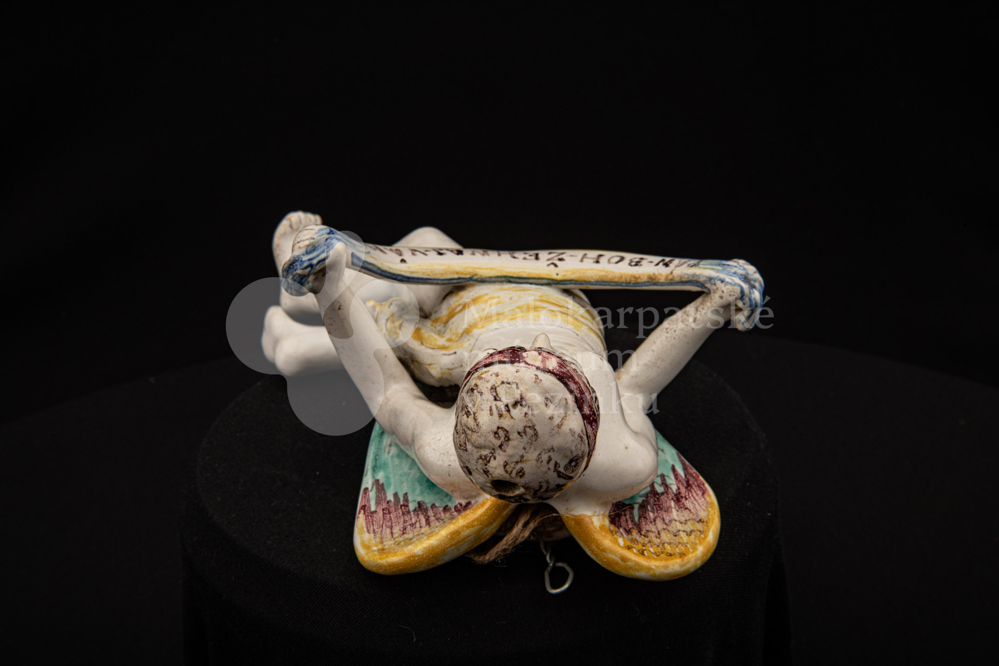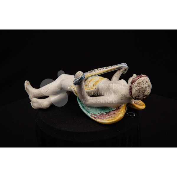 Závesná plastika fajansová – letiaci anjel v rukách drží stuhu s nápisom „Nech Boh žehná Vám“. Bieloglazovaný so žltočervenými a zelenými krídlami. V krátkych vlasoch má červenú stuhu. Na rube krídel značenie FK.ST.