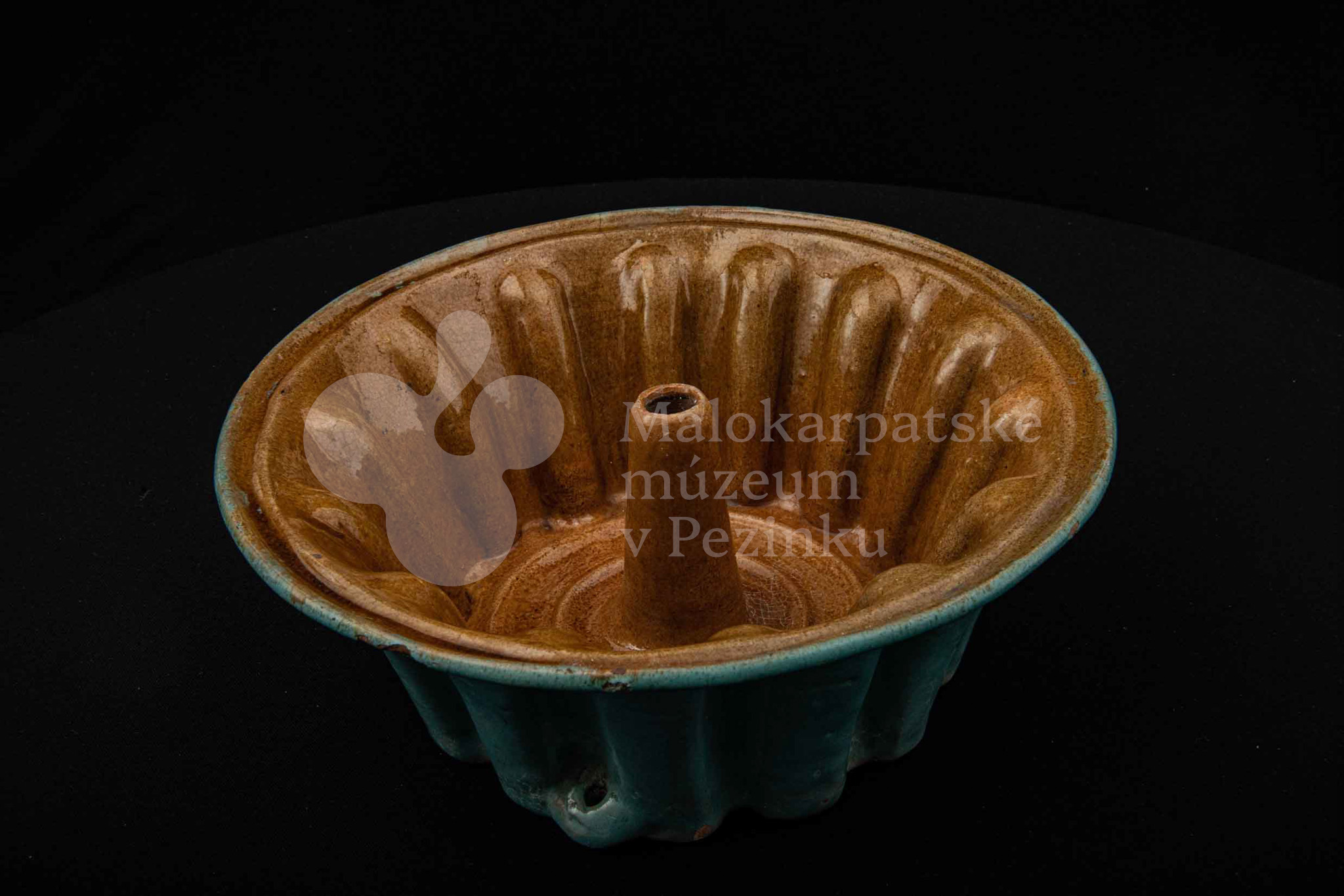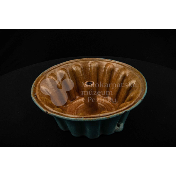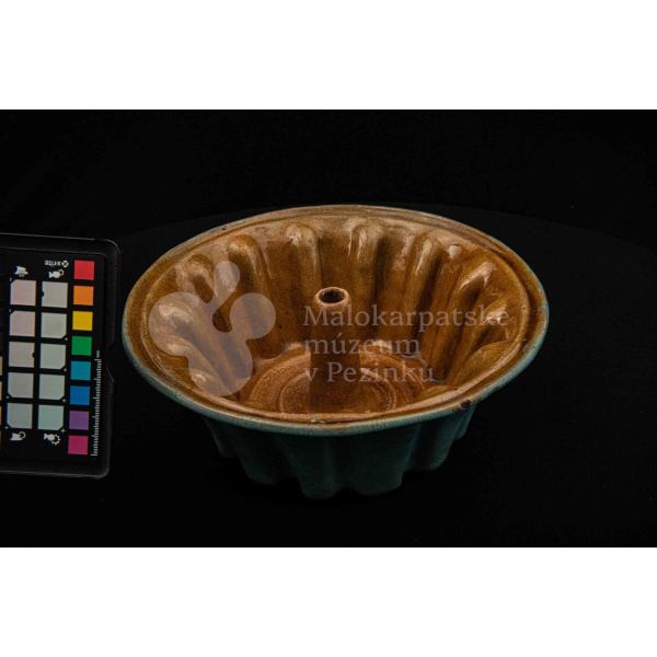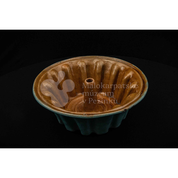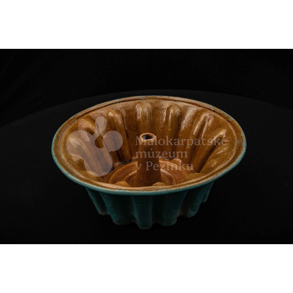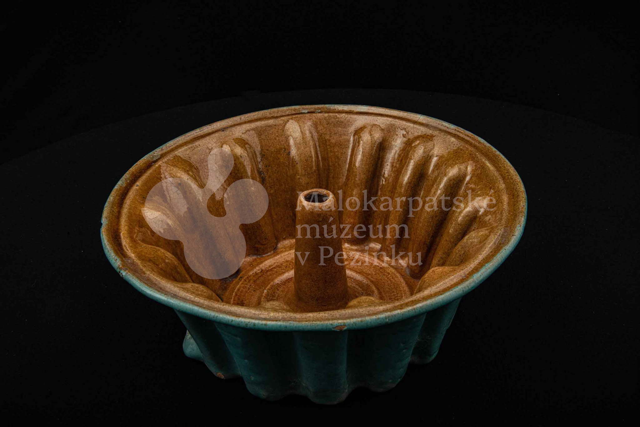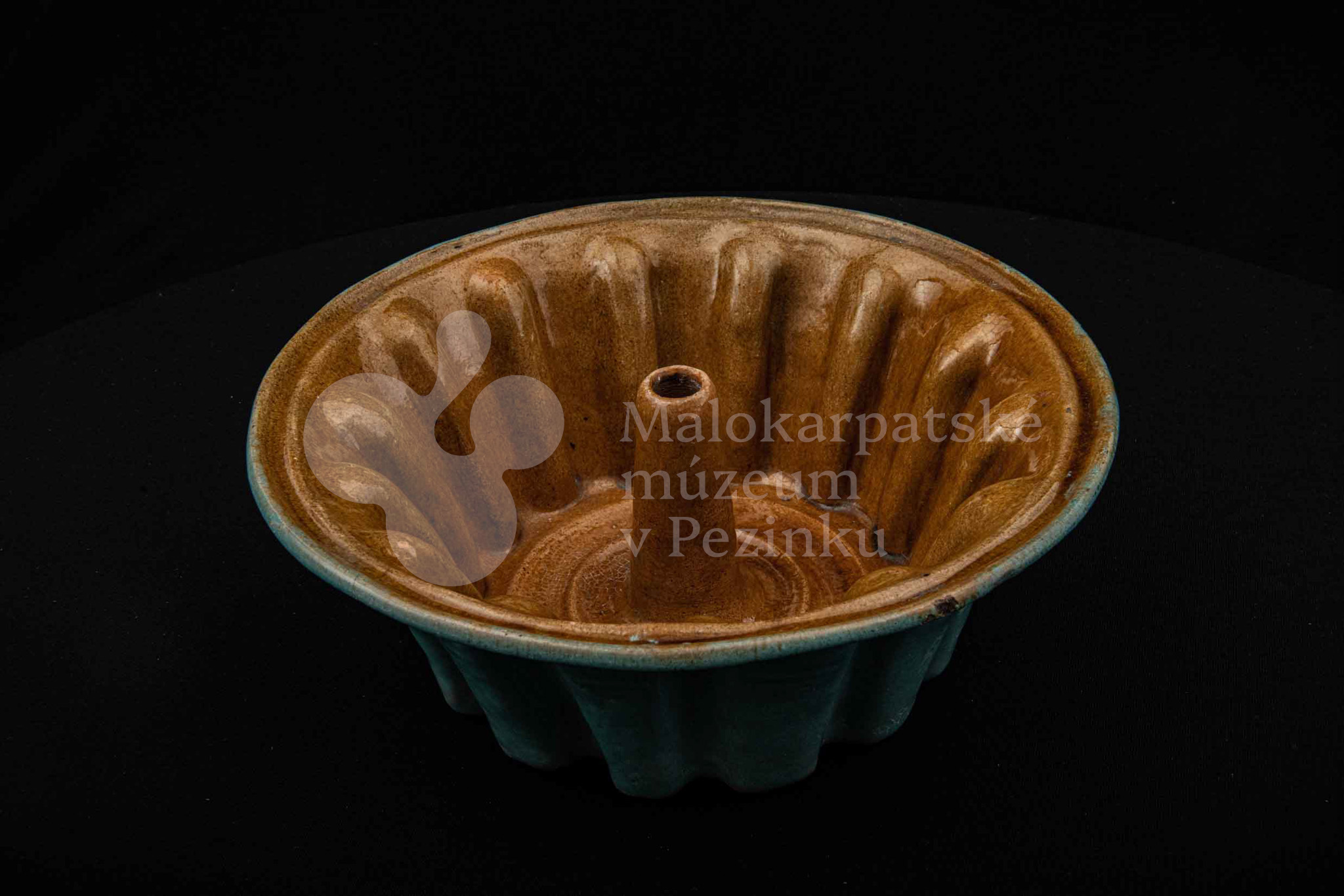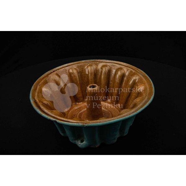 Forma zelená, zvaná „kugluf“ na pečenie bábovky. Z vnútornej strany je farby hnedej. Na dne vyryté značenie K K 1910.