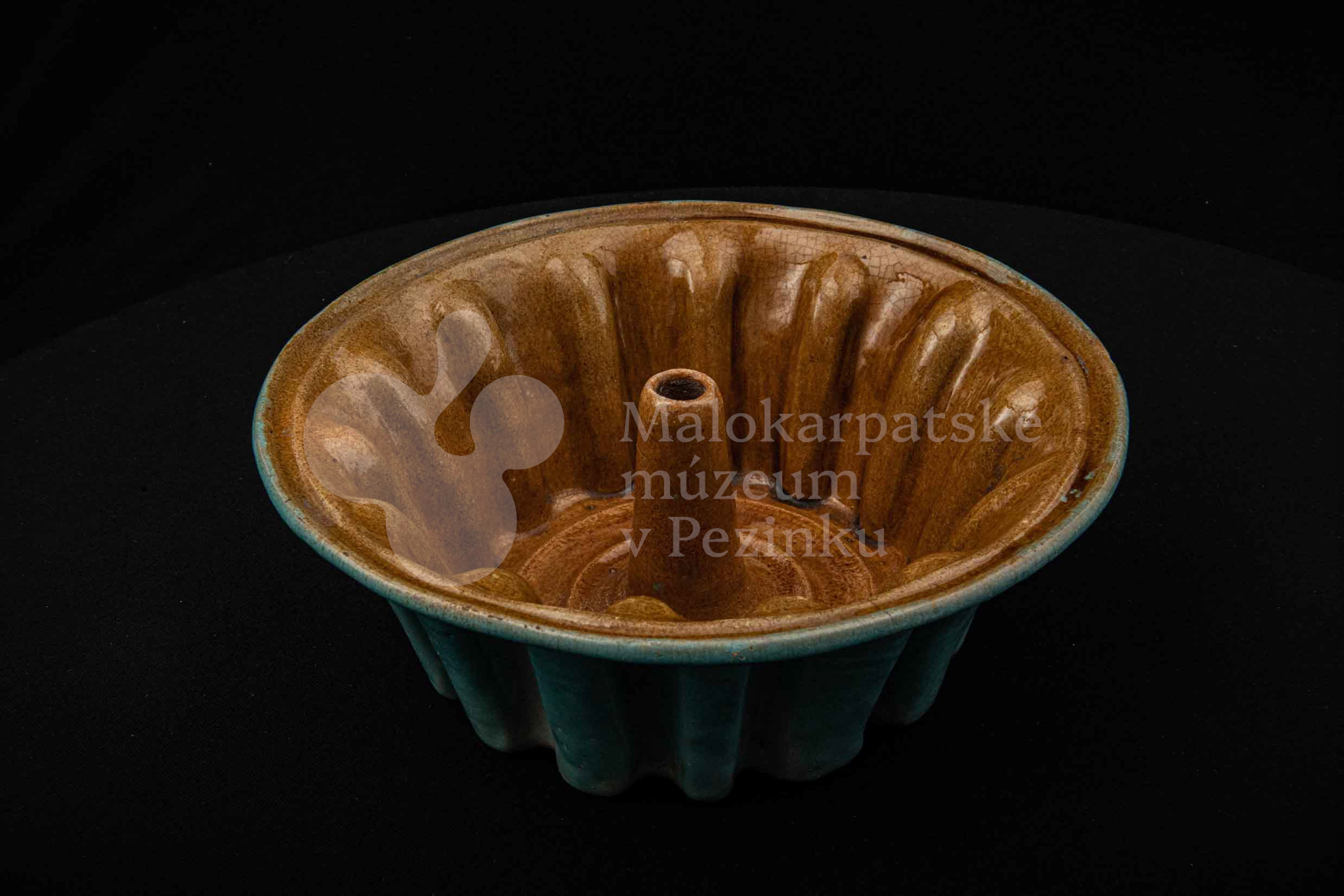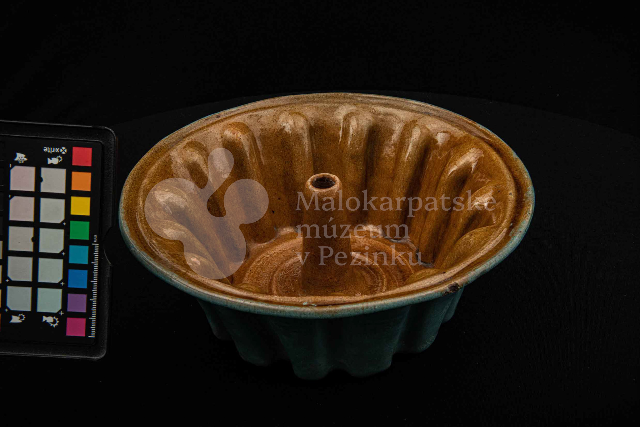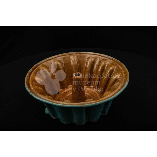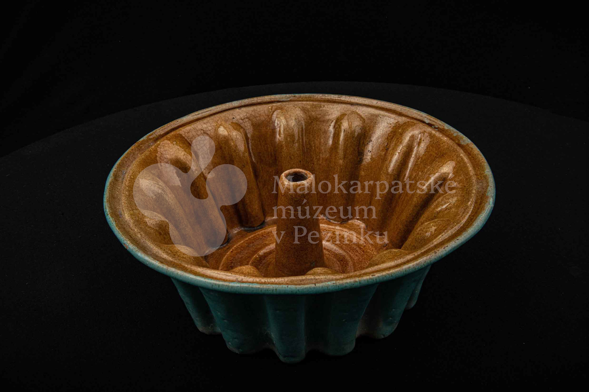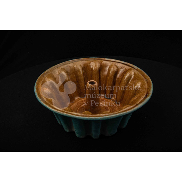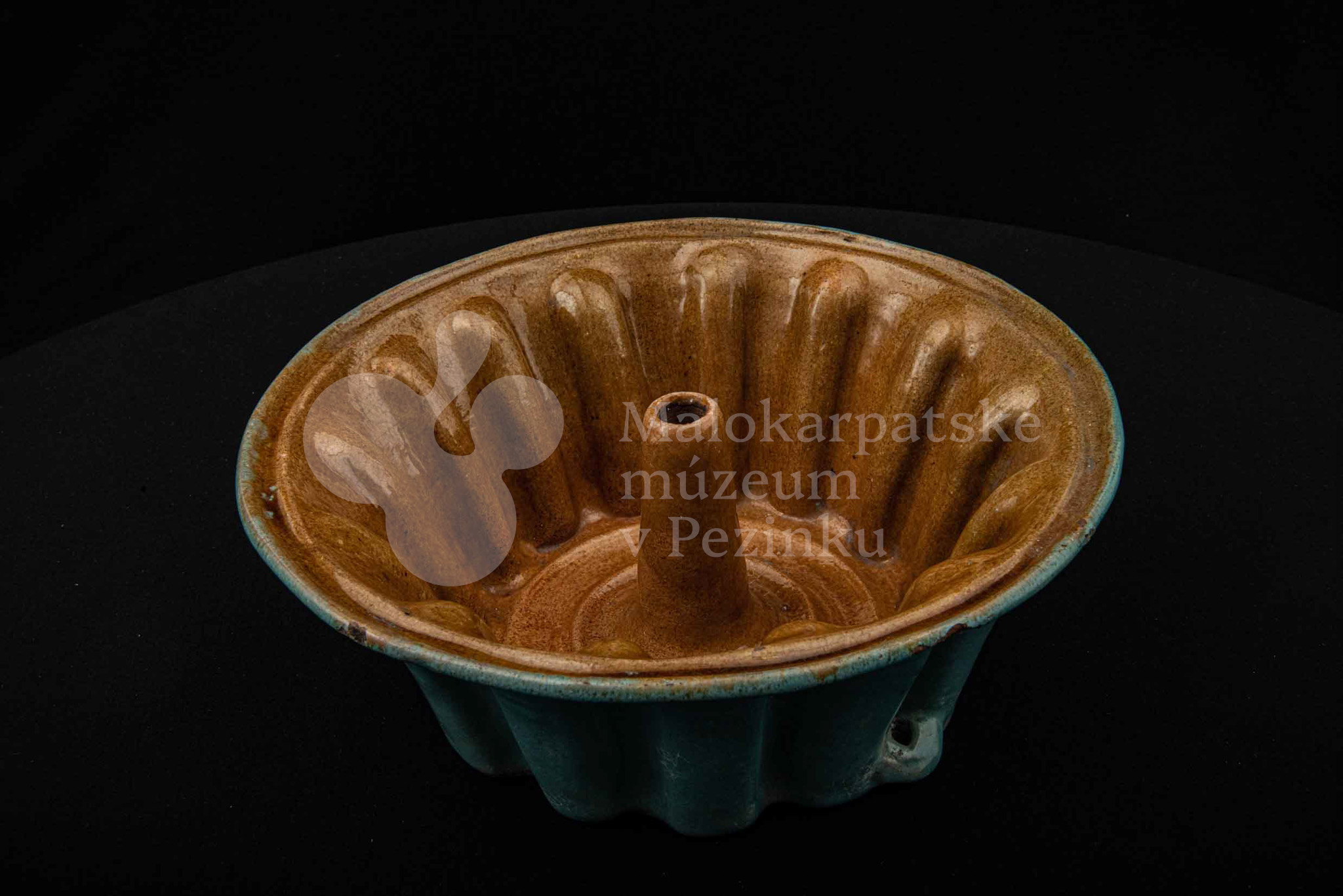 Forma zelená, zvaná „kugluf“ na pečenie bábovky. Z vnútornej strany je farby hnedej. Na dne vyryté značenie K K 1910.