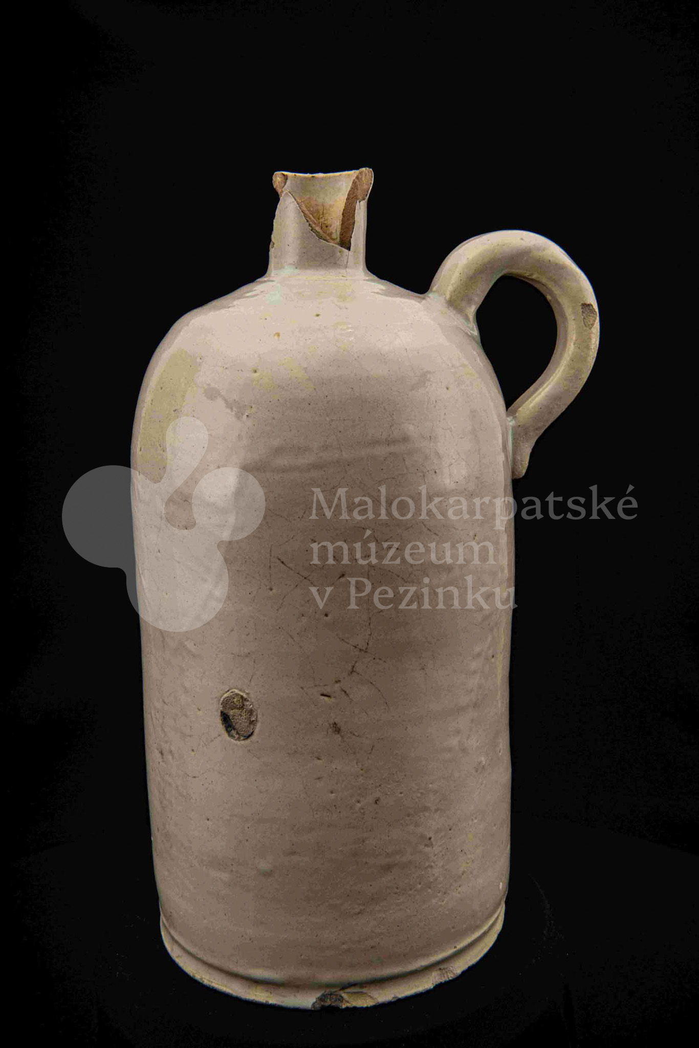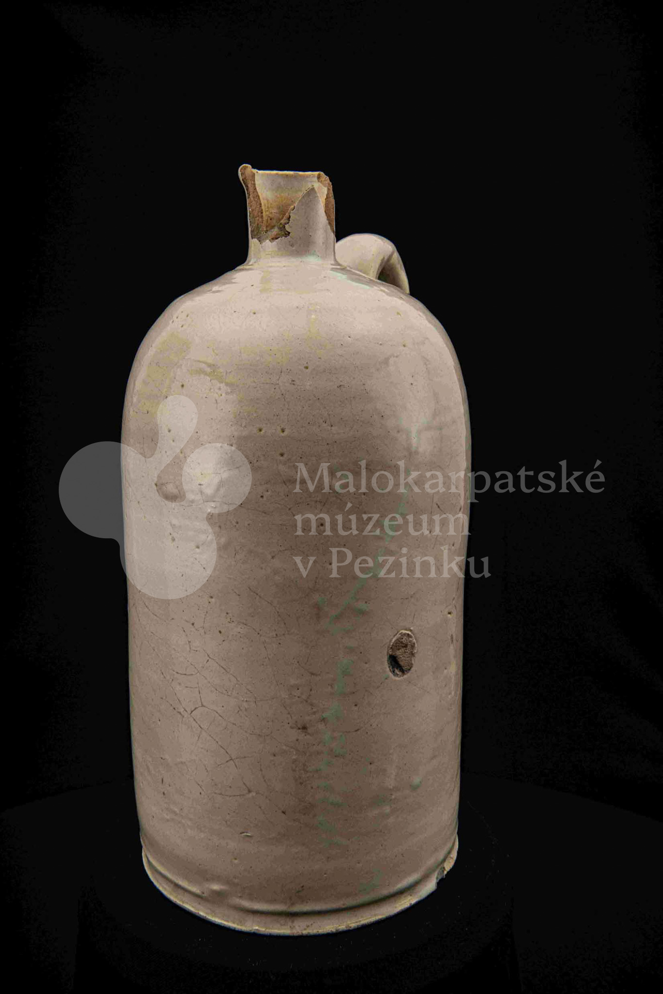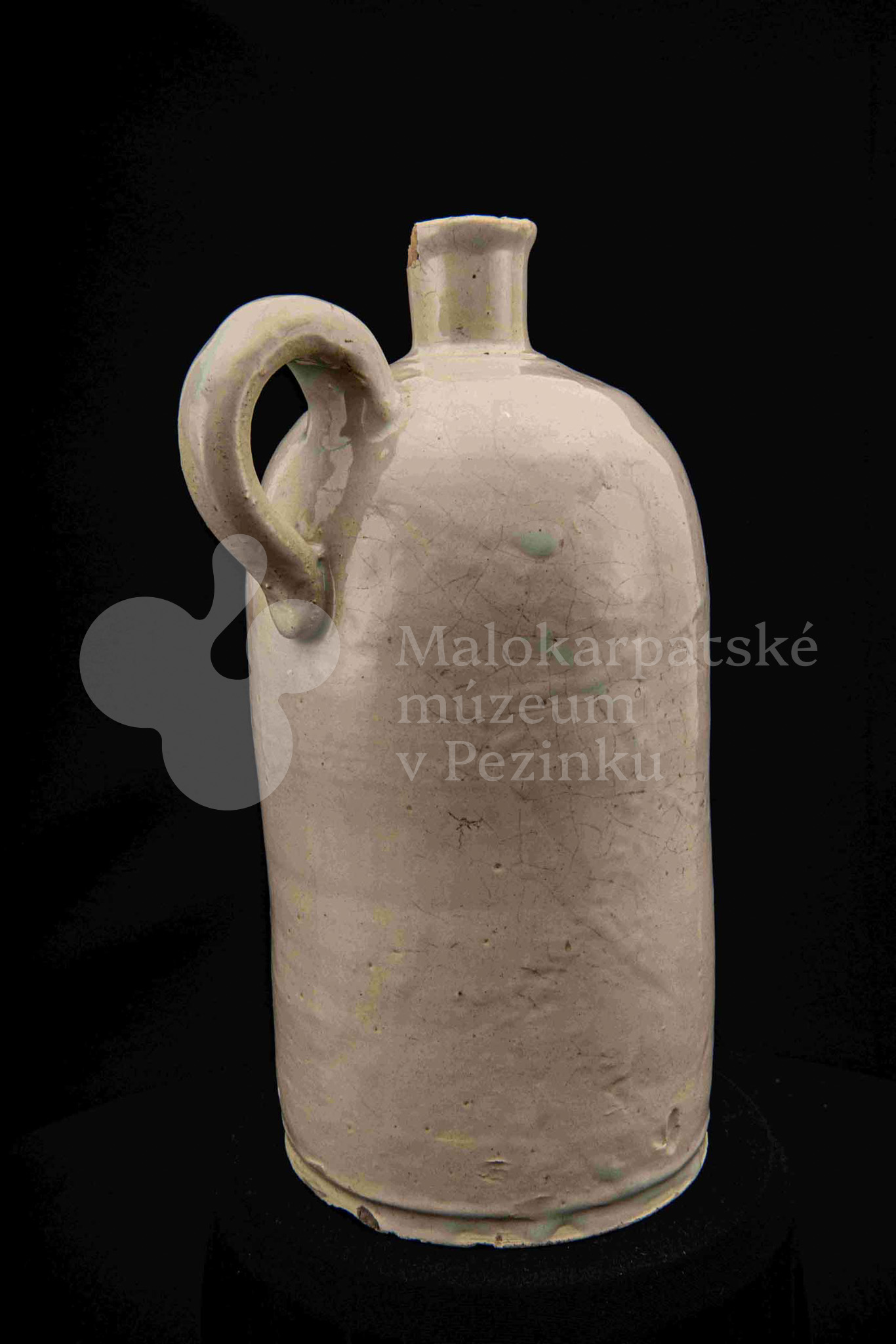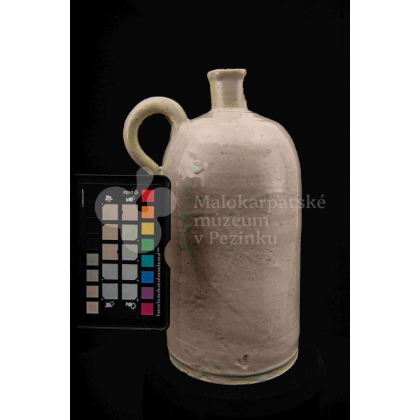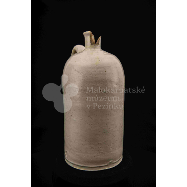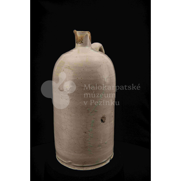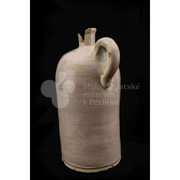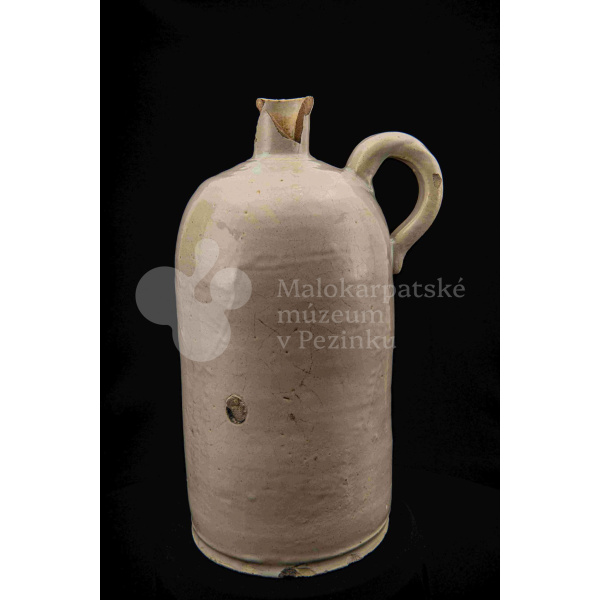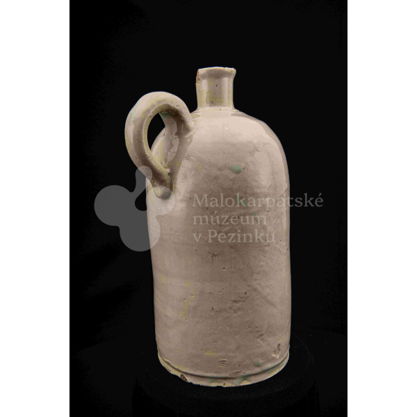 Fajansová fľaša na vodu, valcovitého tvaru, zúžené hrdlo odrozbité, jedno ucho. Dolu zdobená plastickým vrúbkom. Po celej ploche bielo glazovaná. Bez značenia.