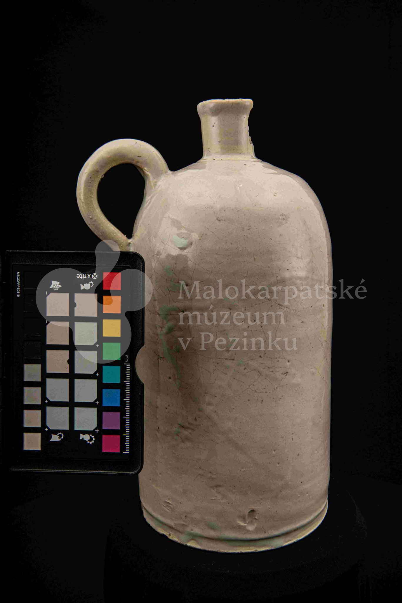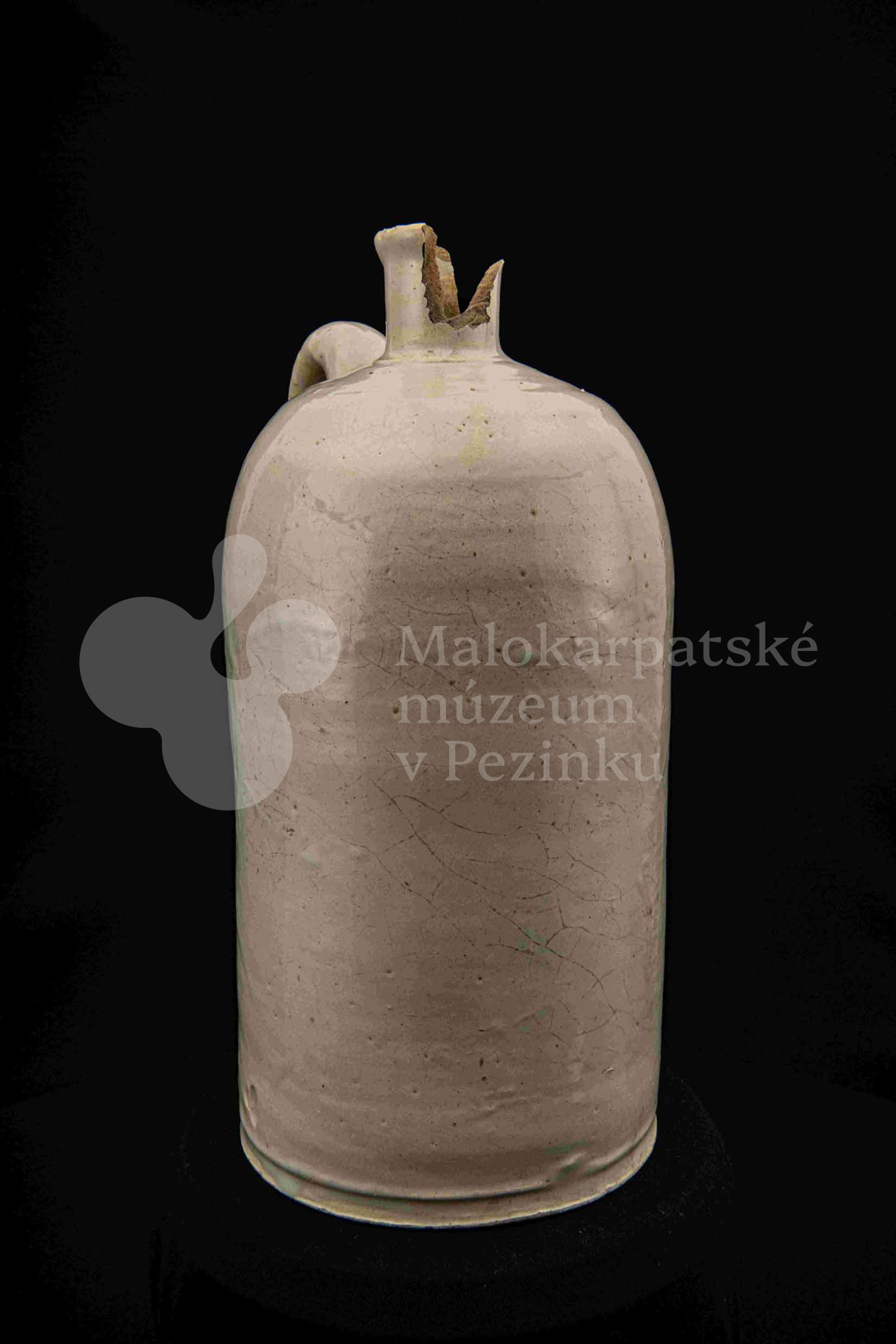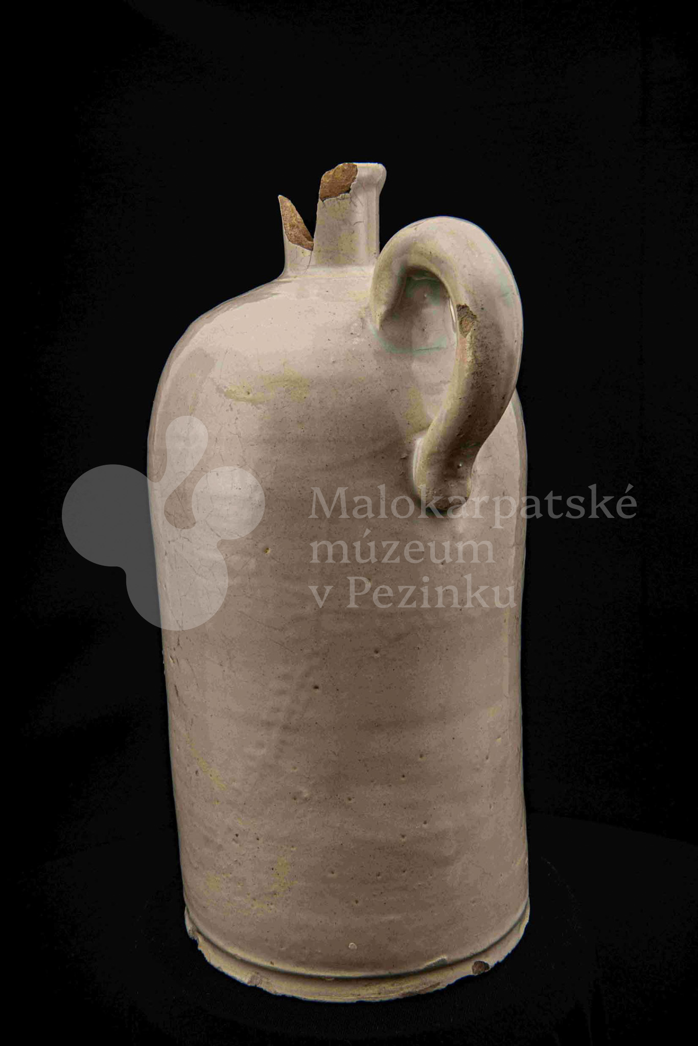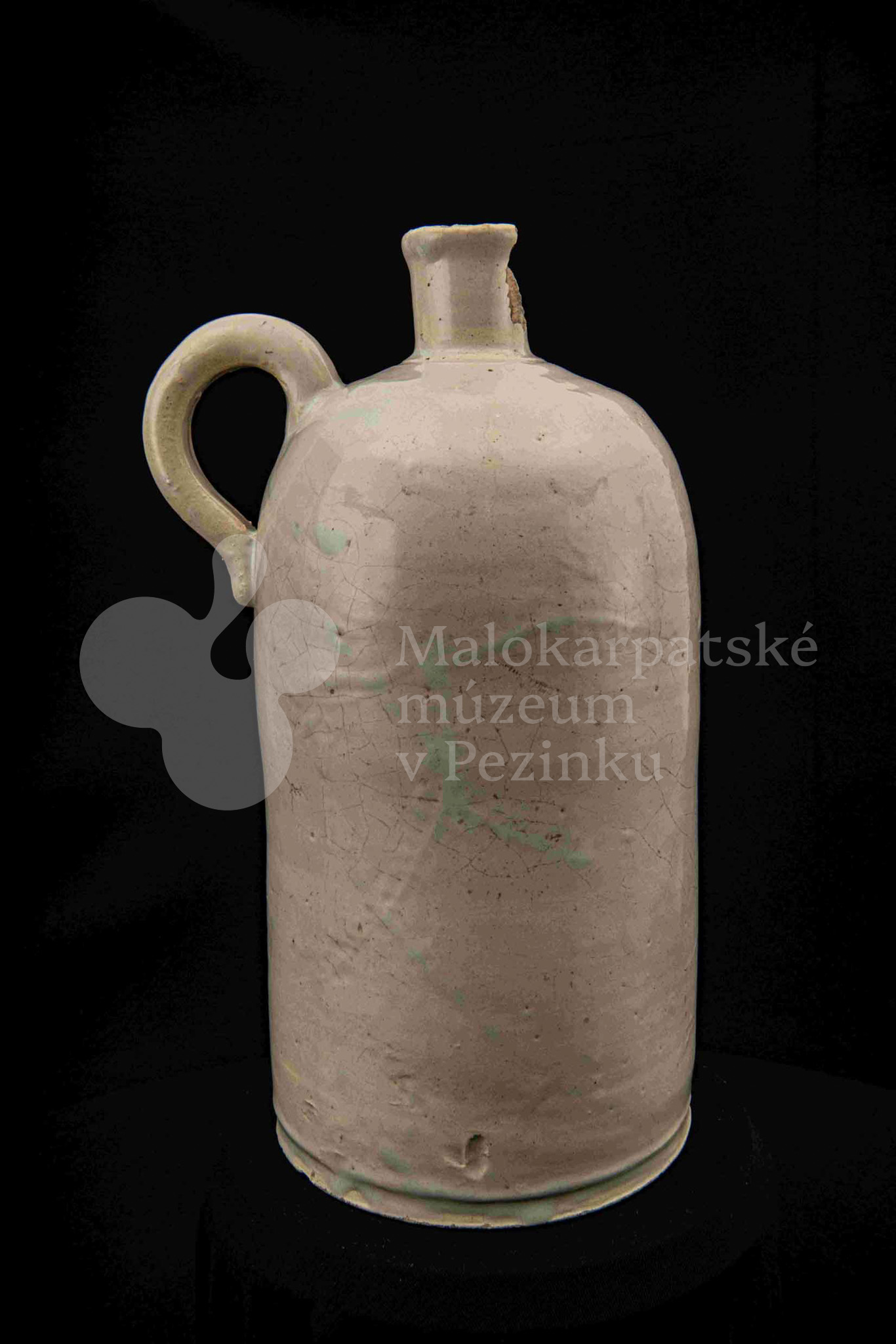 Fajansová fľaša na vodu, valcovitého tvaru, zúžené hrdlo odrozbité, jedno ucho. Dolu zdobená plastickým vrúbkom. Po celej ploche bielo glazovaná. Bez značenia.