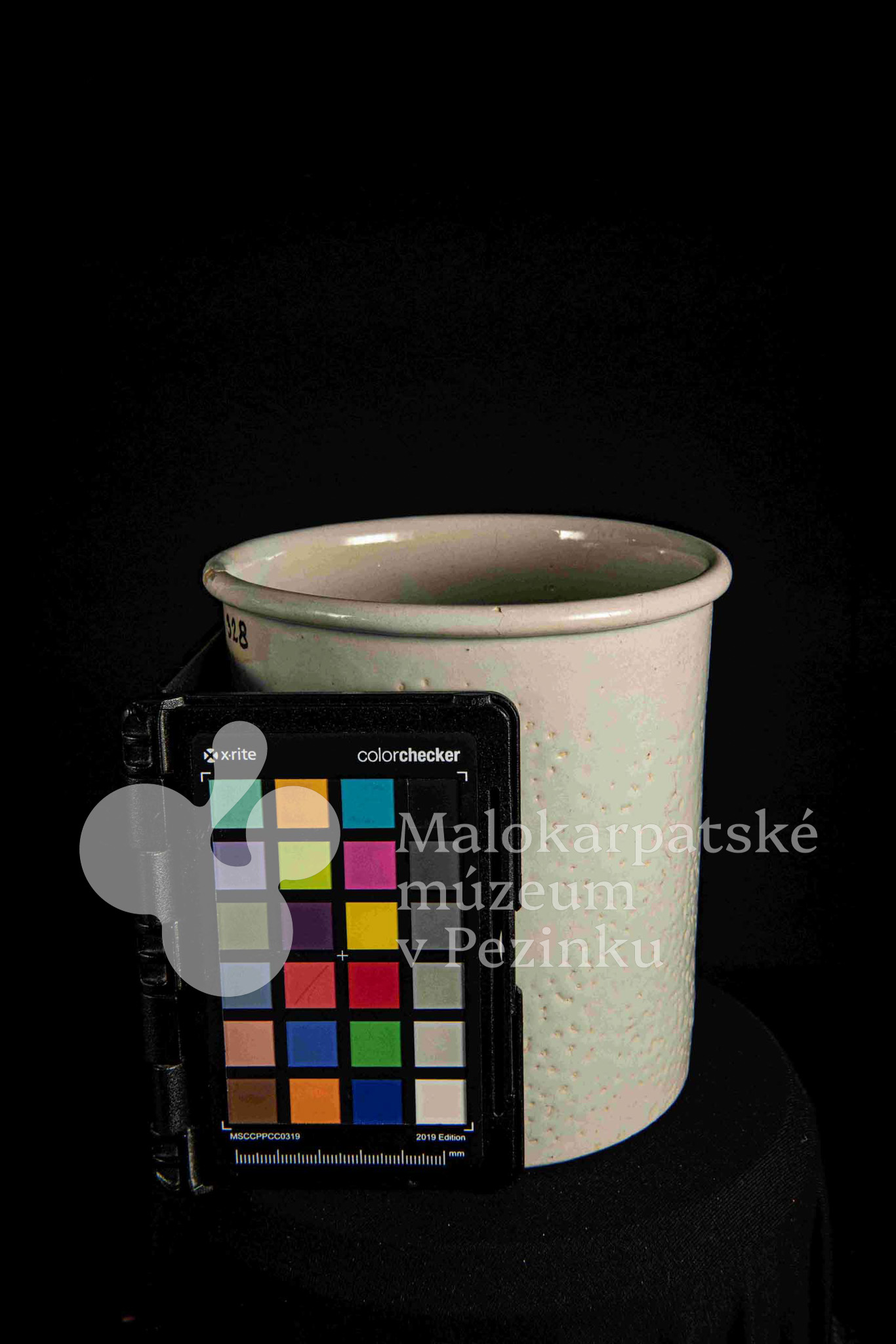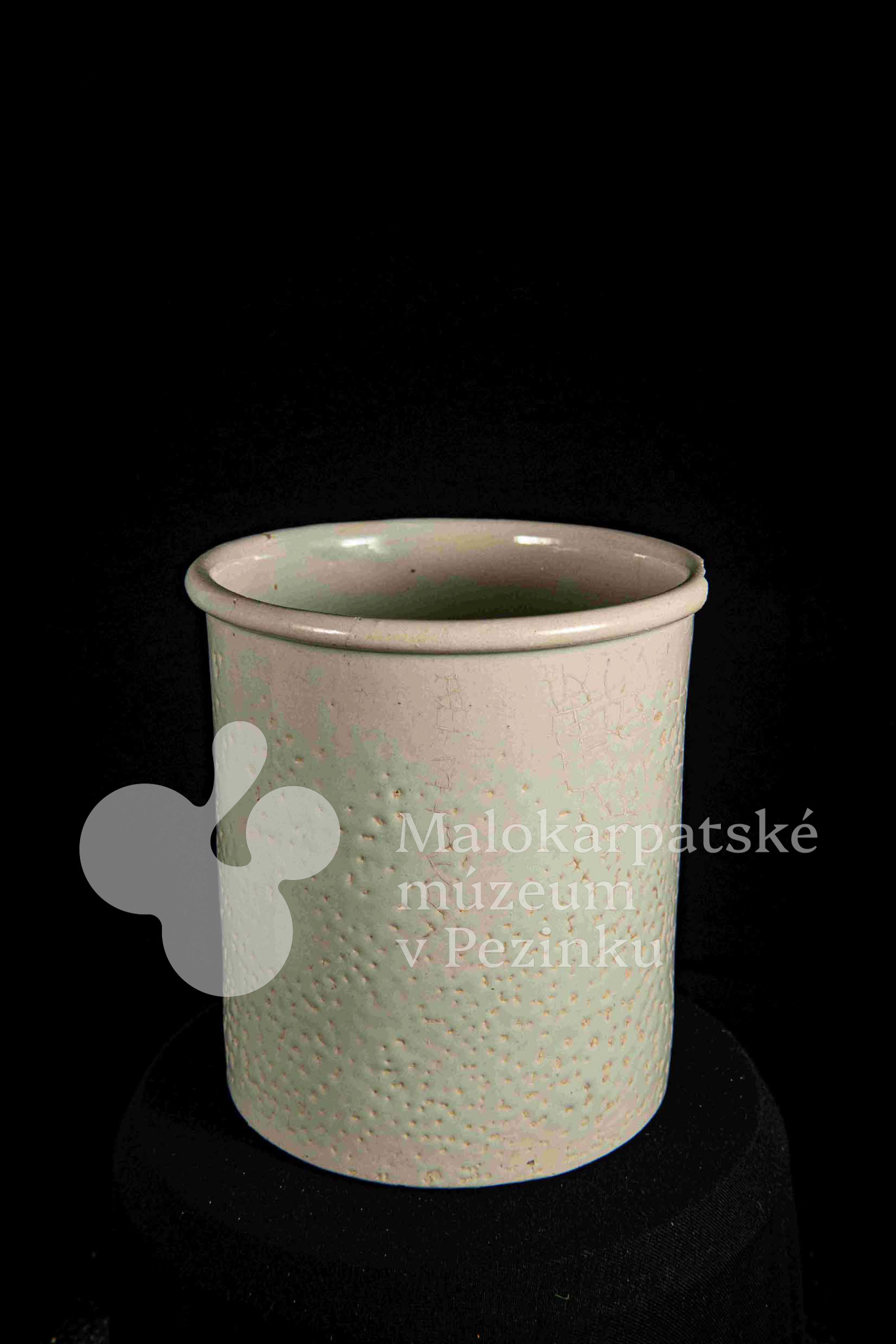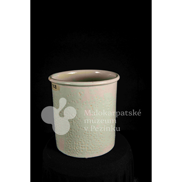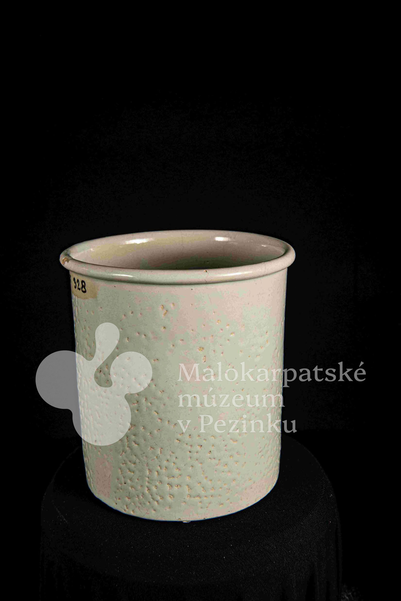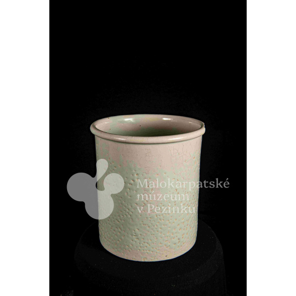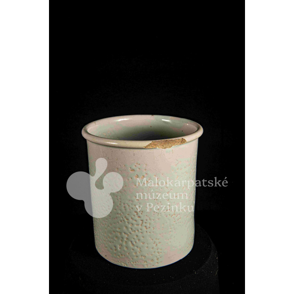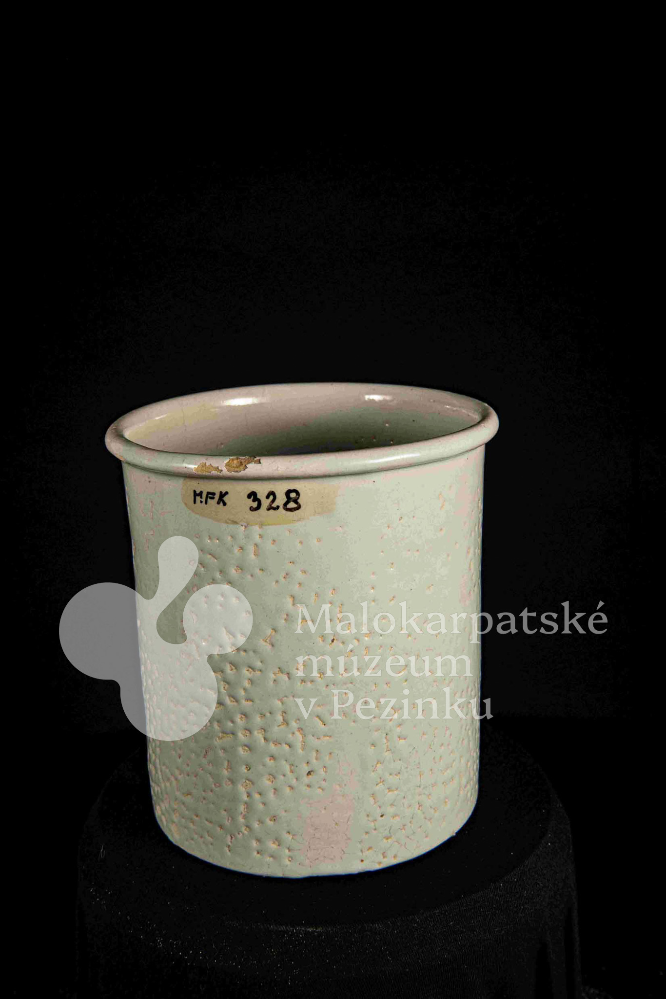 Keramická nádoba, bielo glazovaná, valcového tvaru, s odrozbitým okrajom.