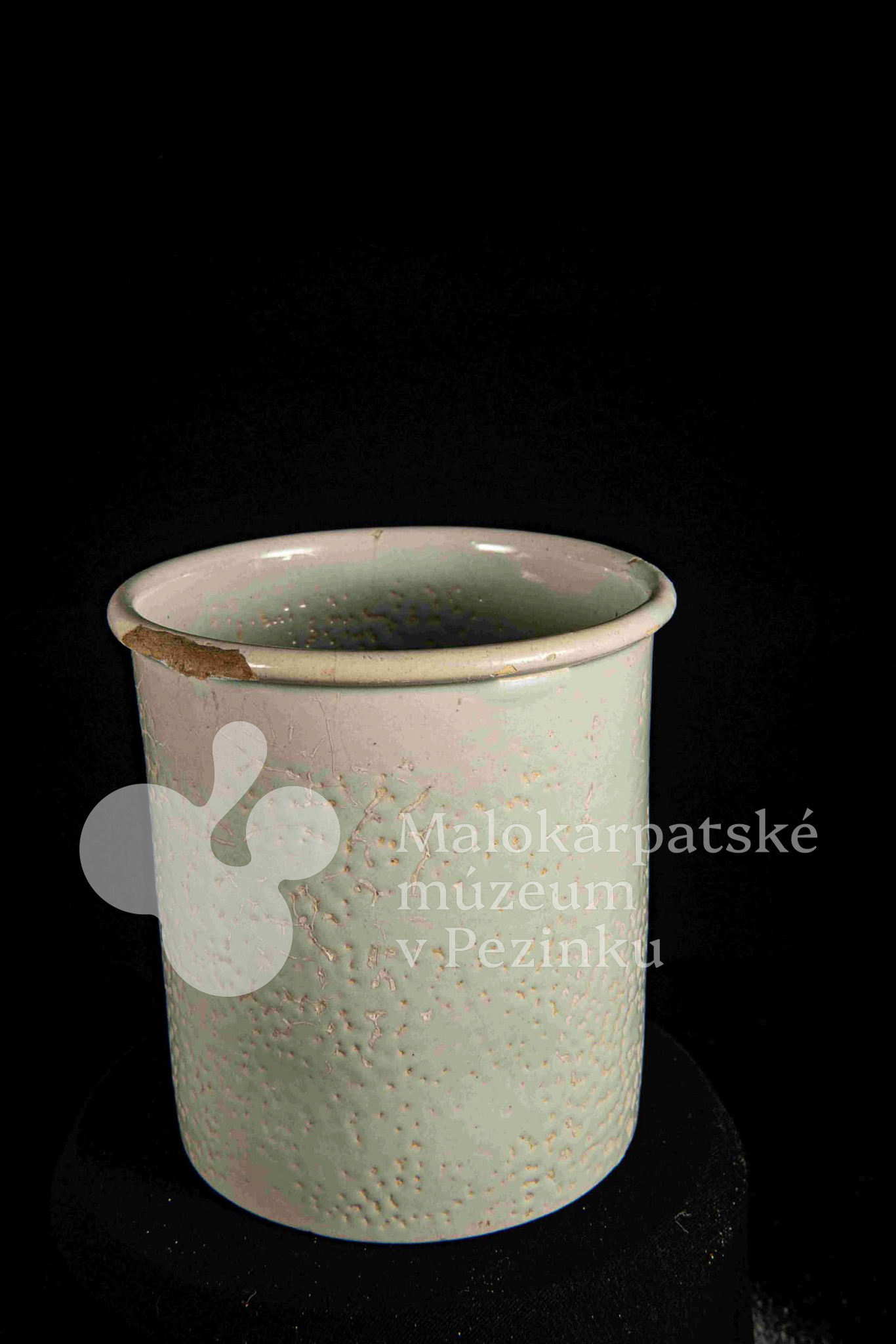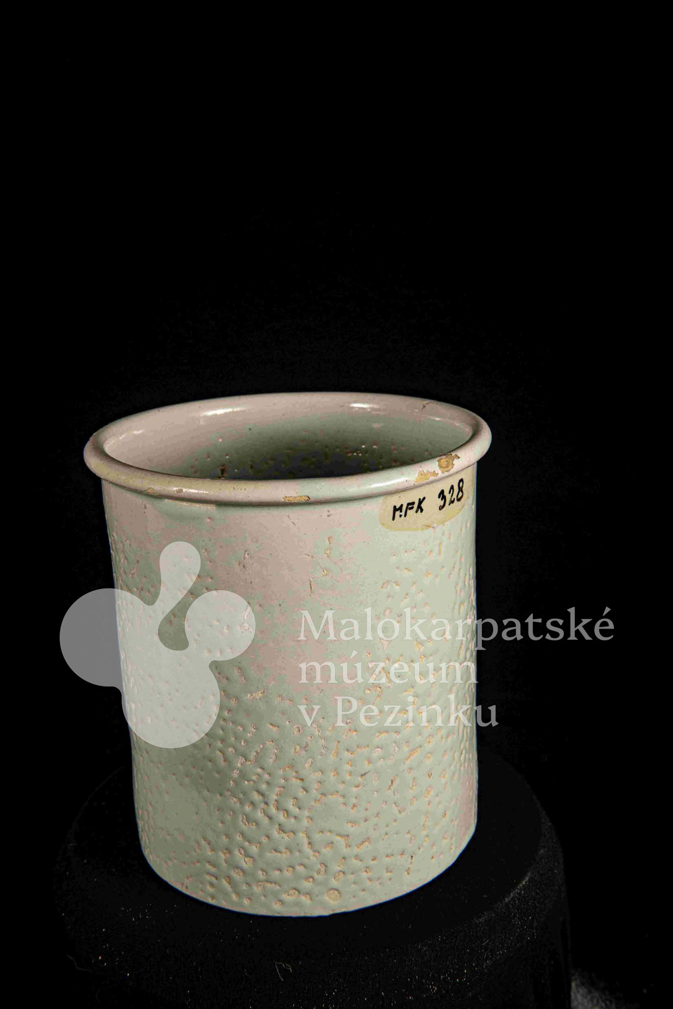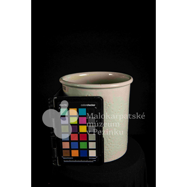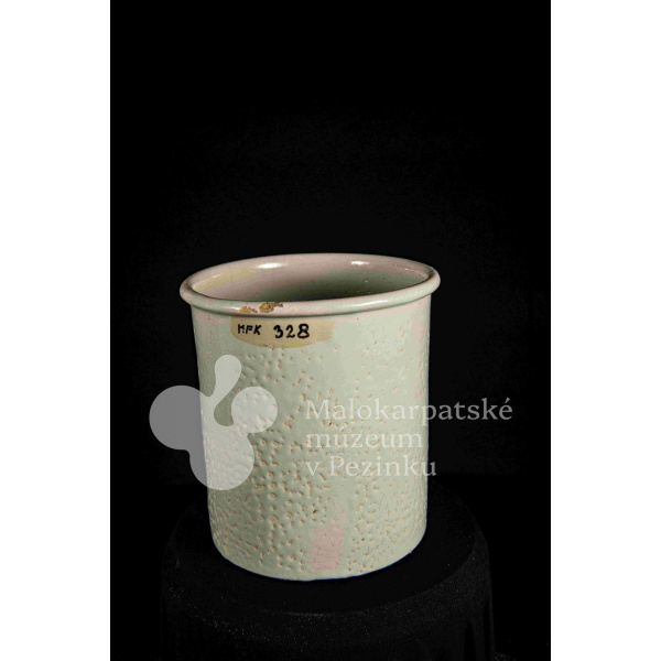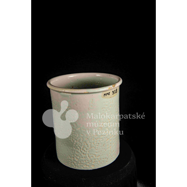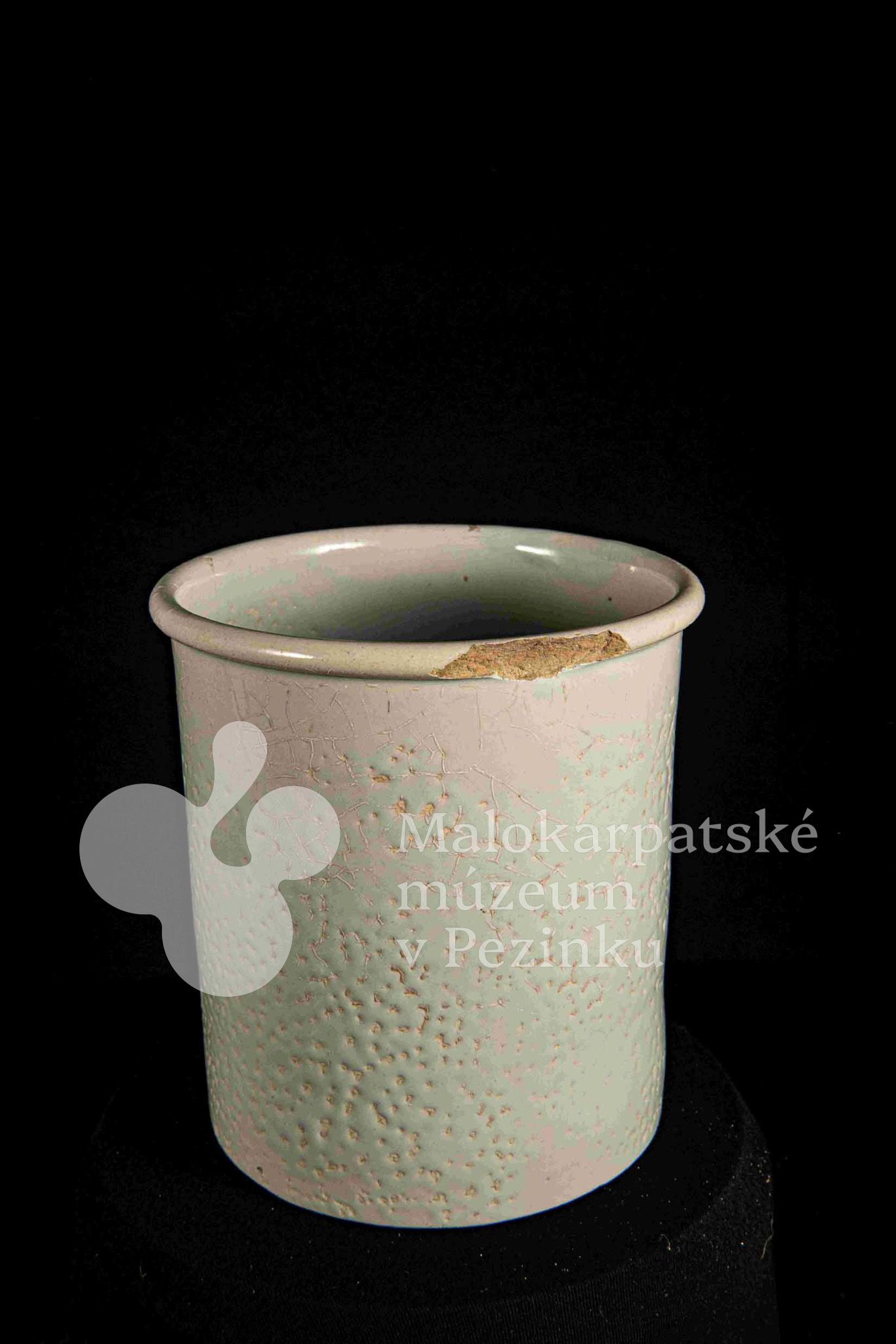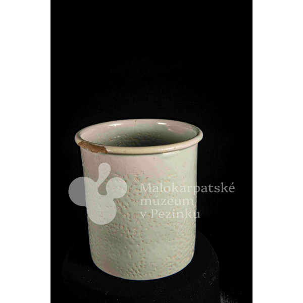 Keramická nádoba, bielo glazovaná, valcového tvaru, s odrozbitým okrajom.