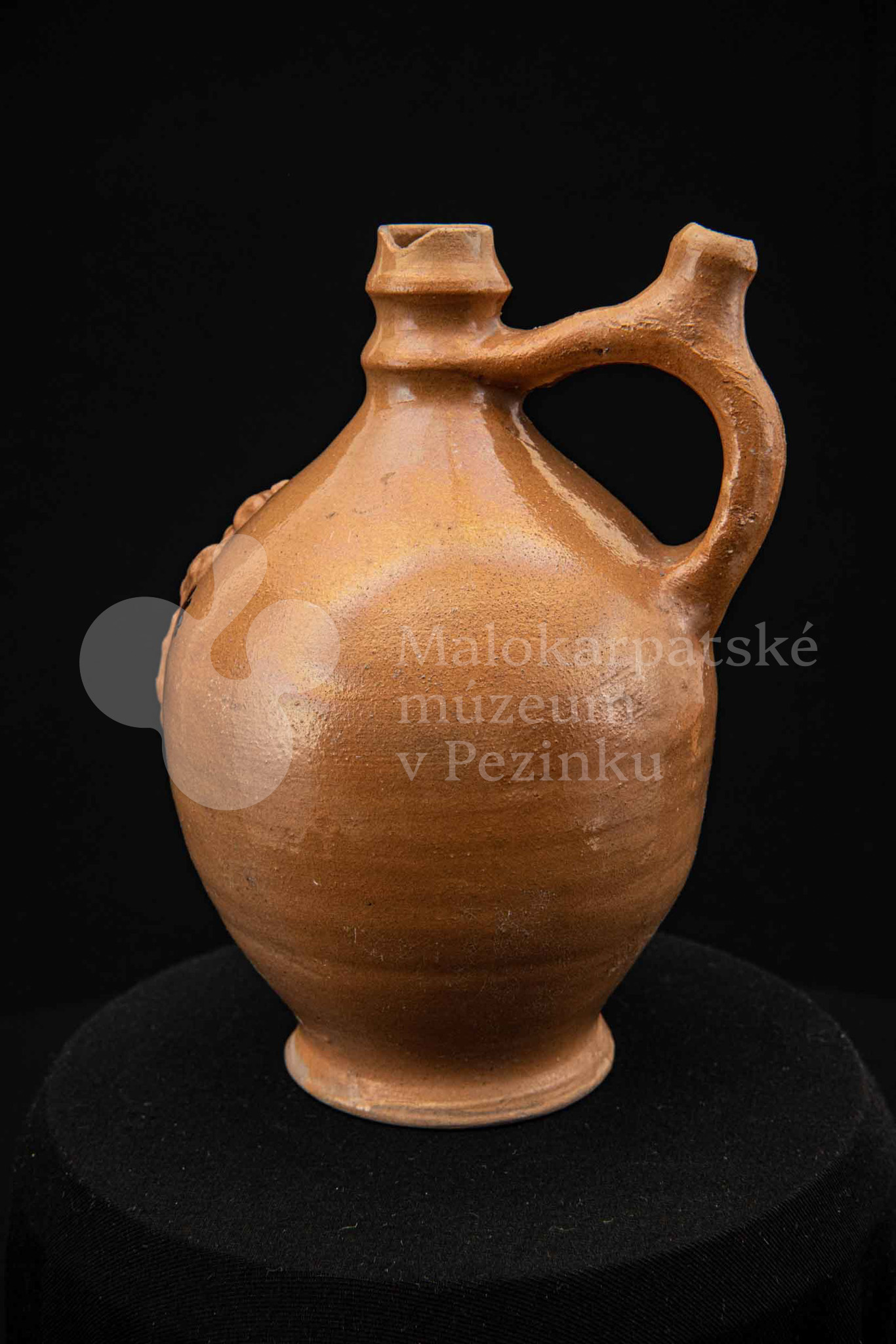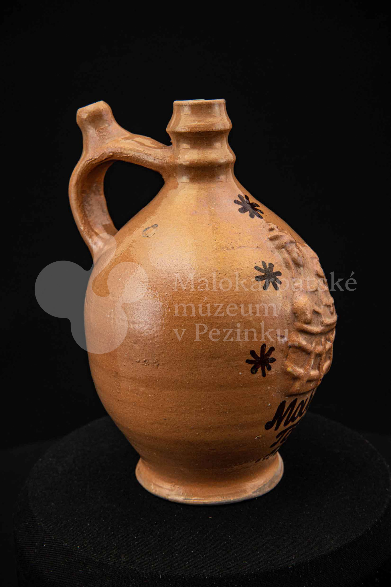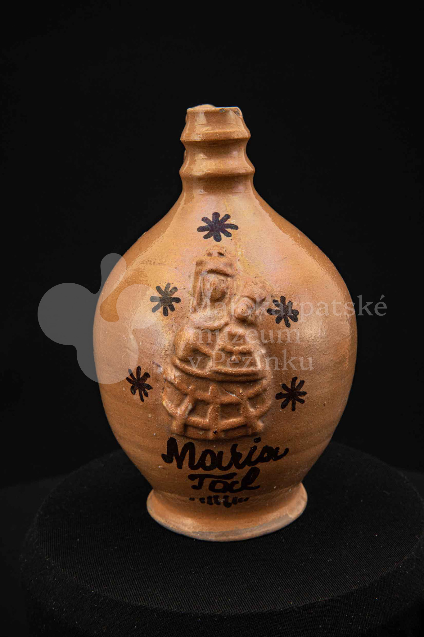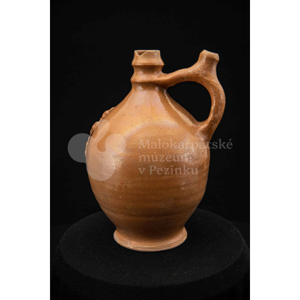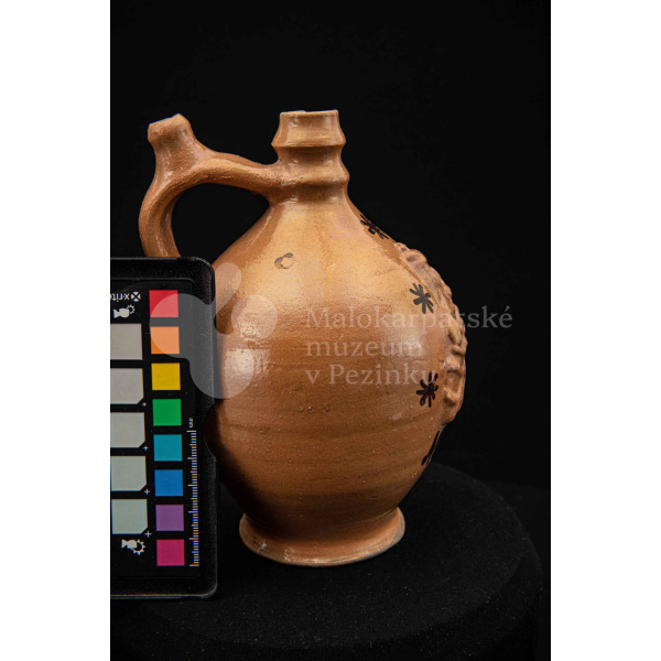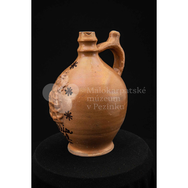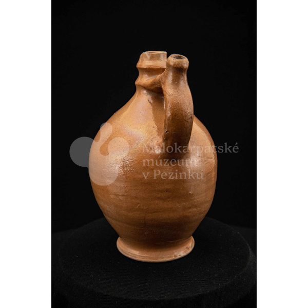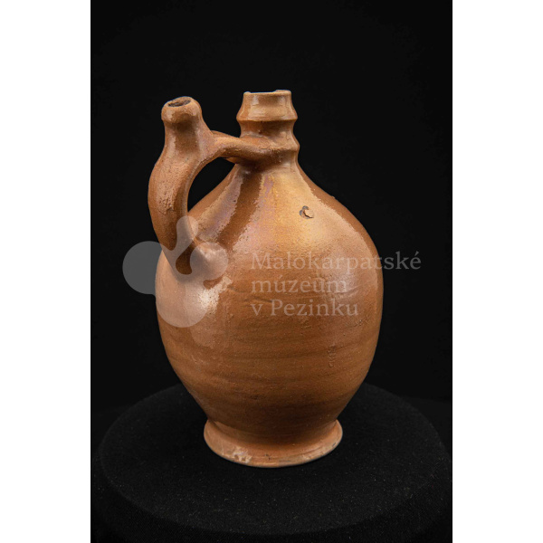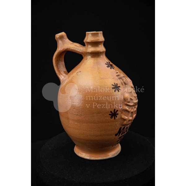 Pútnický čepáčik, poliaty hnedým glejtom, s vydutým bruškom a úzkym hrdlom. Na prednej strane plastický reliéf Mariatalskej Panny Márie, mangánový dekor a nápis „Maria Tal“. Bez značenia.