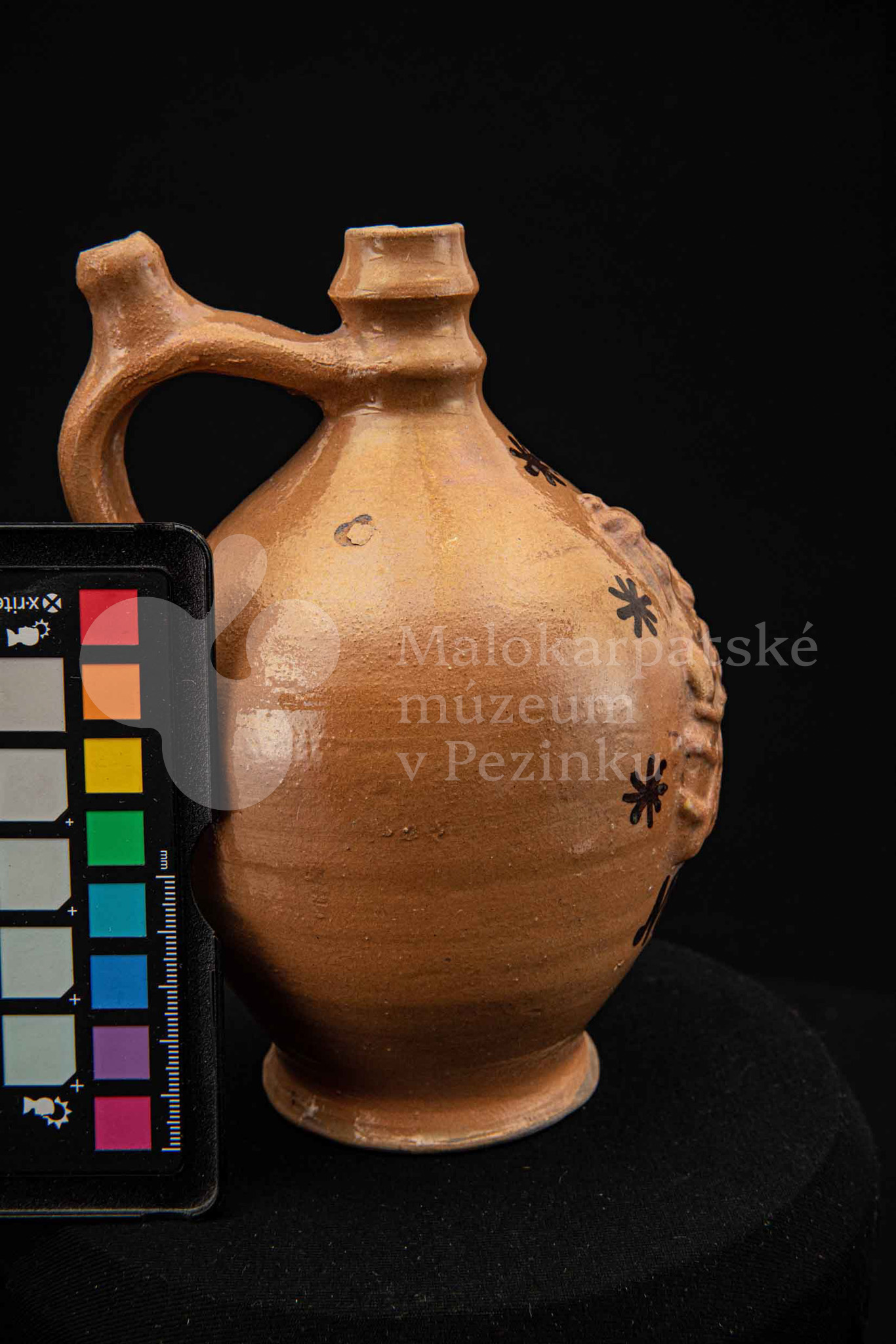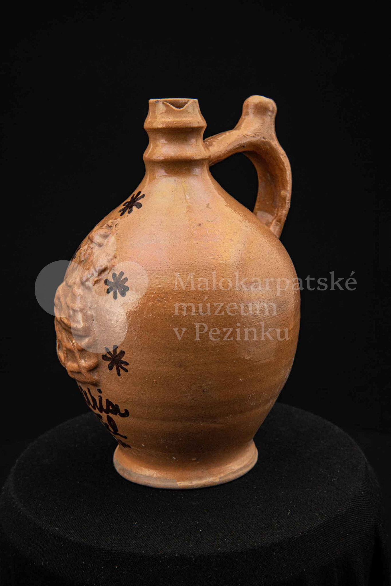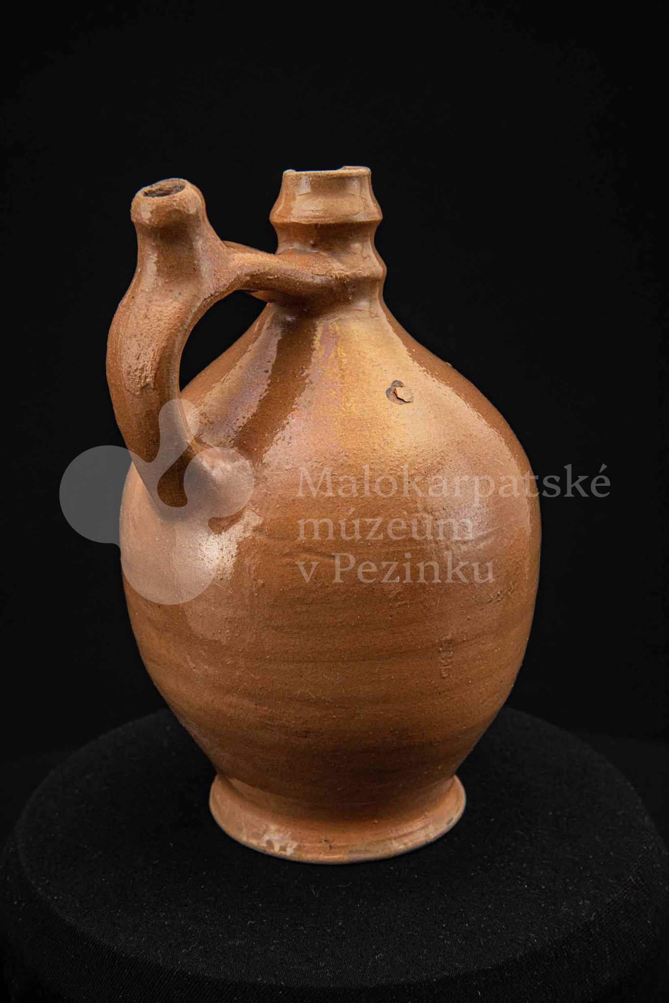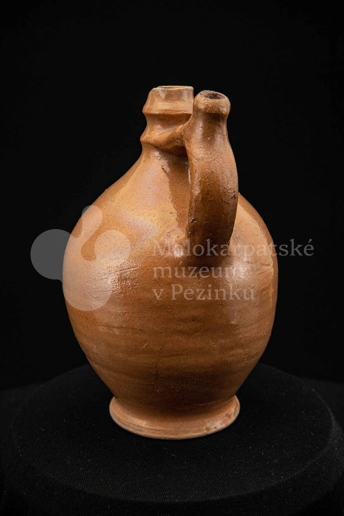 Pútnický čepáčik, poliaty hnedým glejtom, s vydutým bruškom a úzkym hrdlom. Na prednej strane plastický reliéf Mariatalskej Panny Márie, mangánový dekor a nápis „Maria Tal“. Bez značenia.
