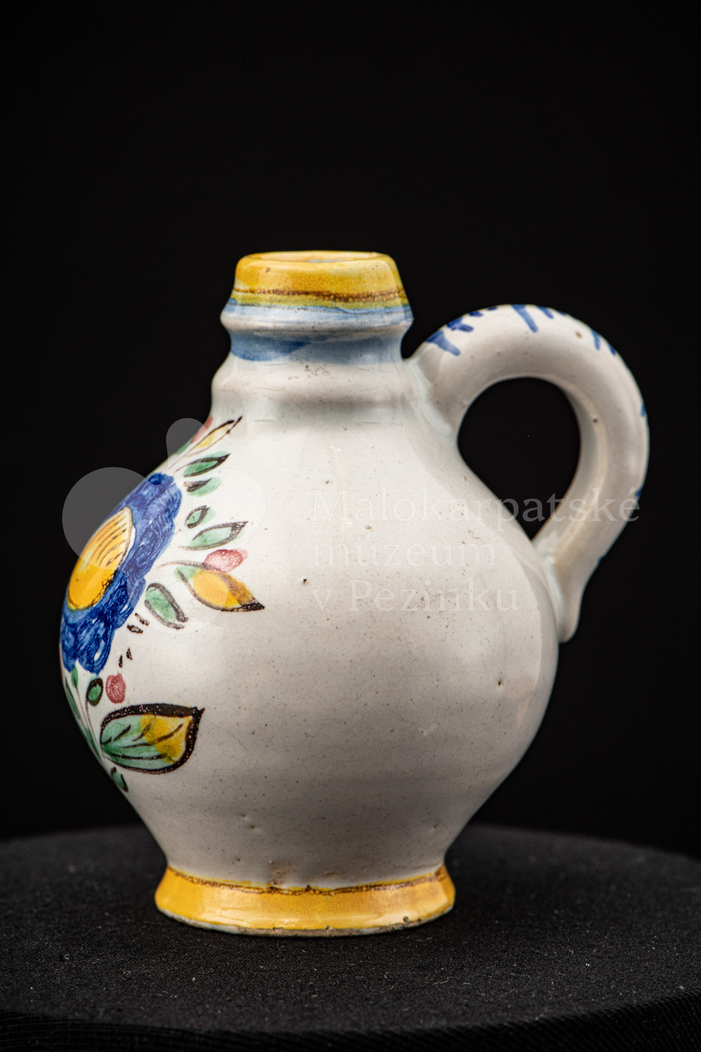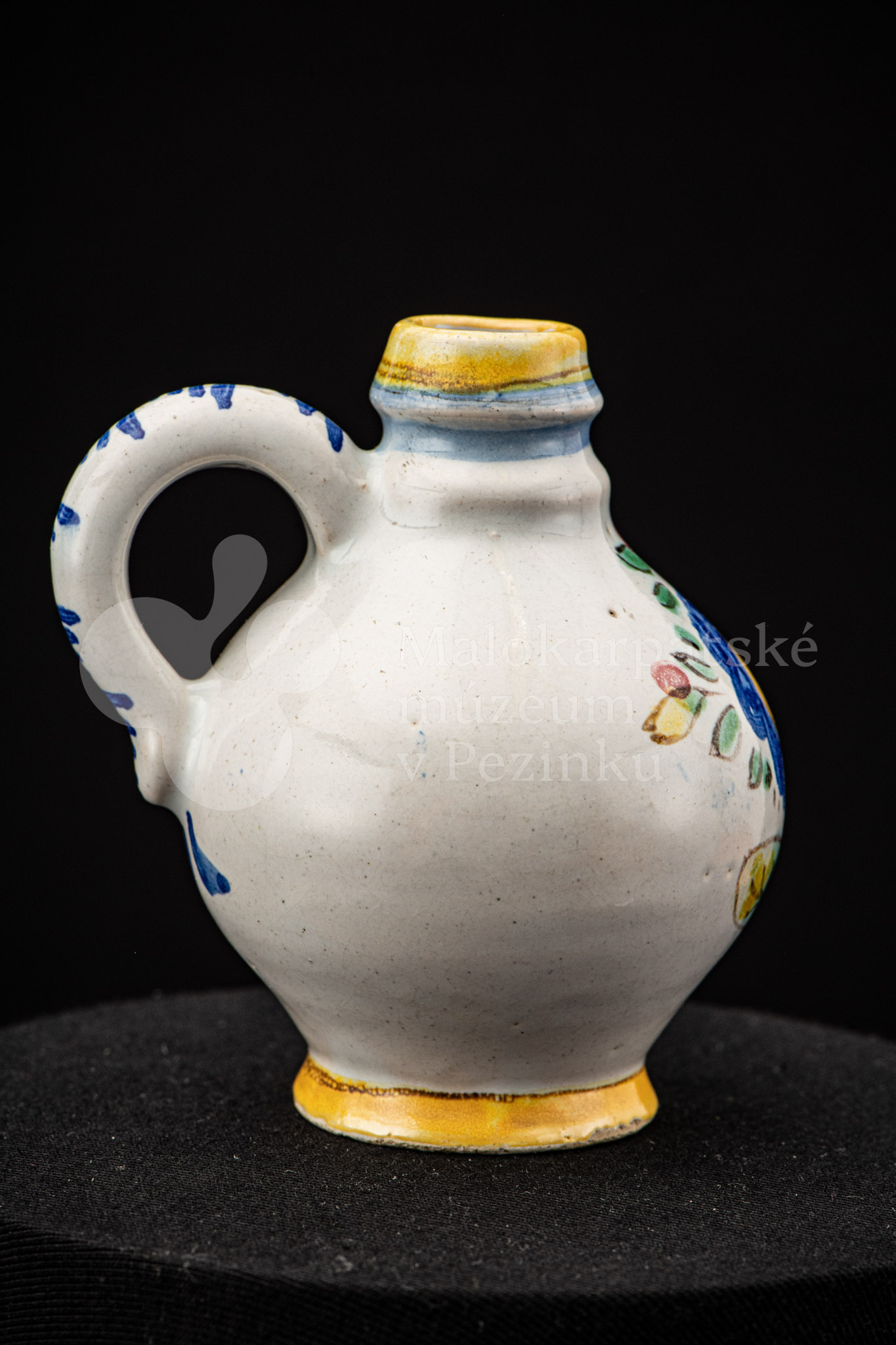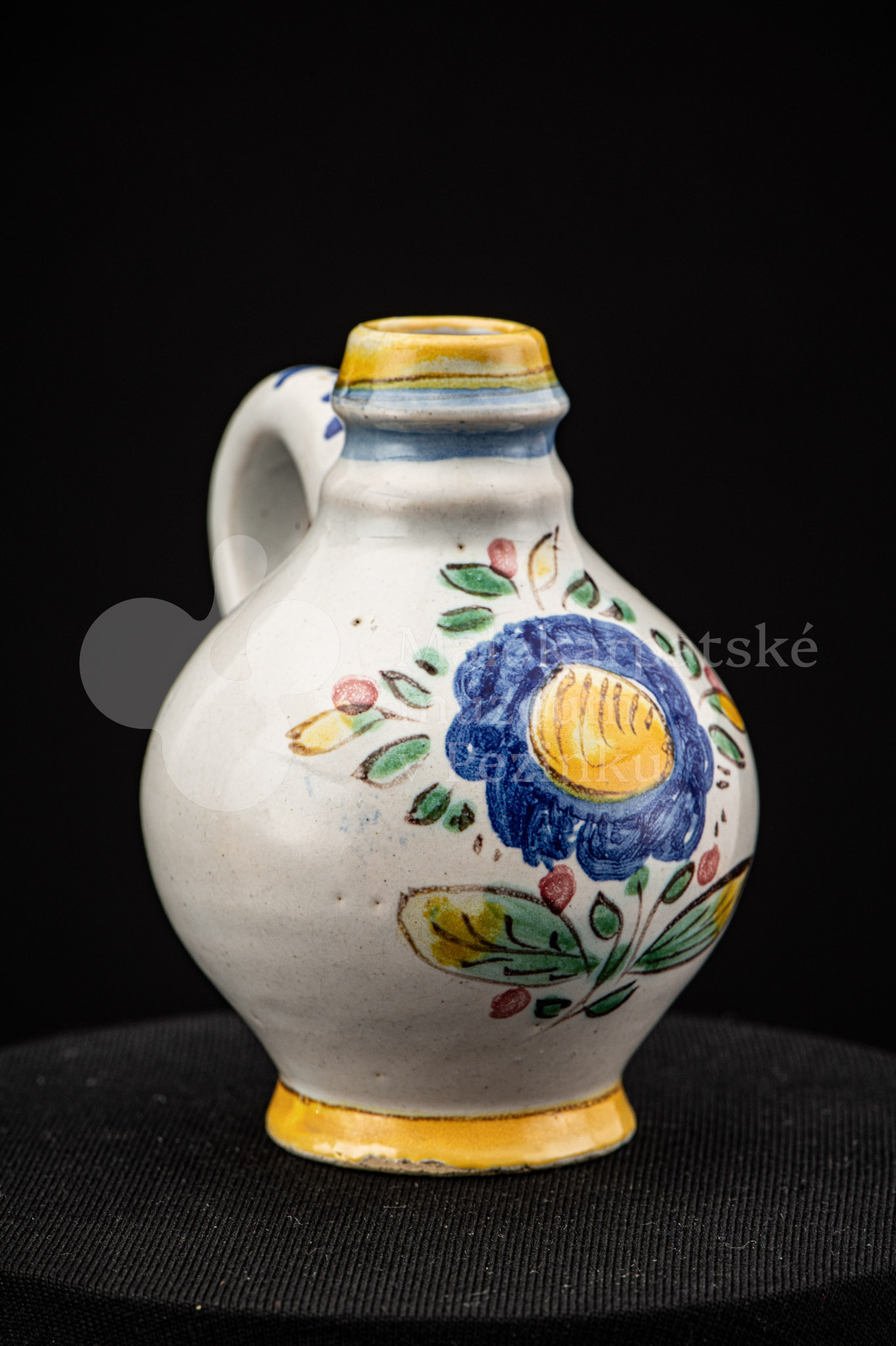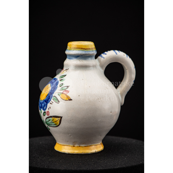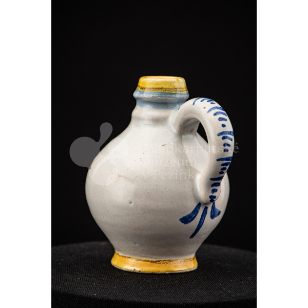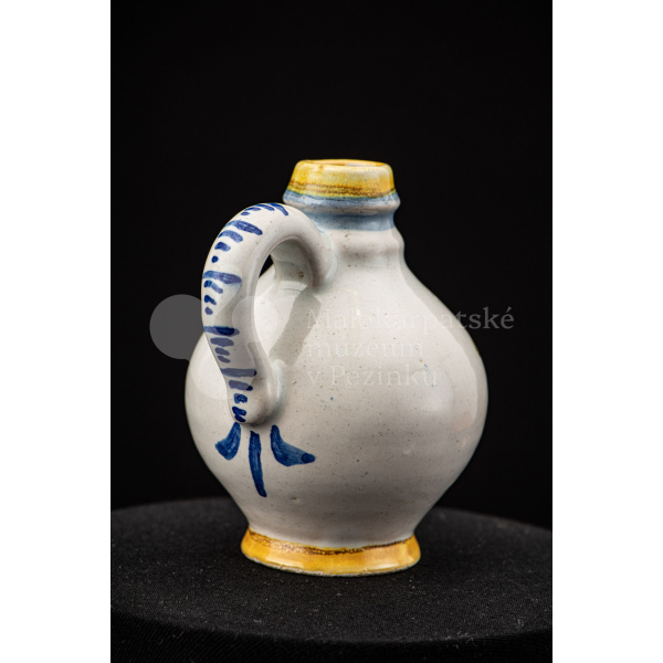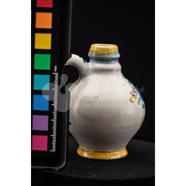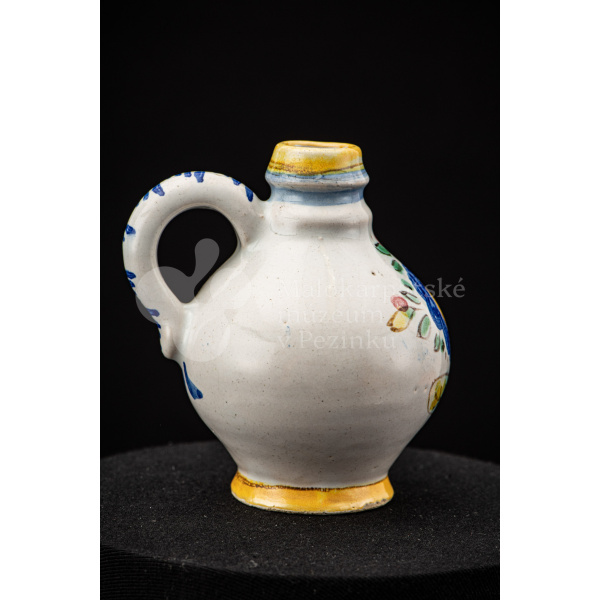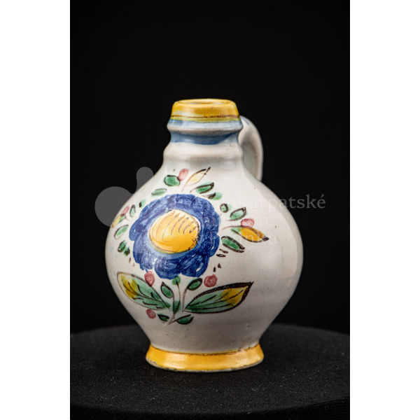Nádobka fajansová s vydutým bruškom a úzkym hrdlom. Po celej ploche bieloglazovaná. Na prednej strane je namaľovaná modrá ruža. Farebnosť je rôzna. Na dne značenie FK. ST.
