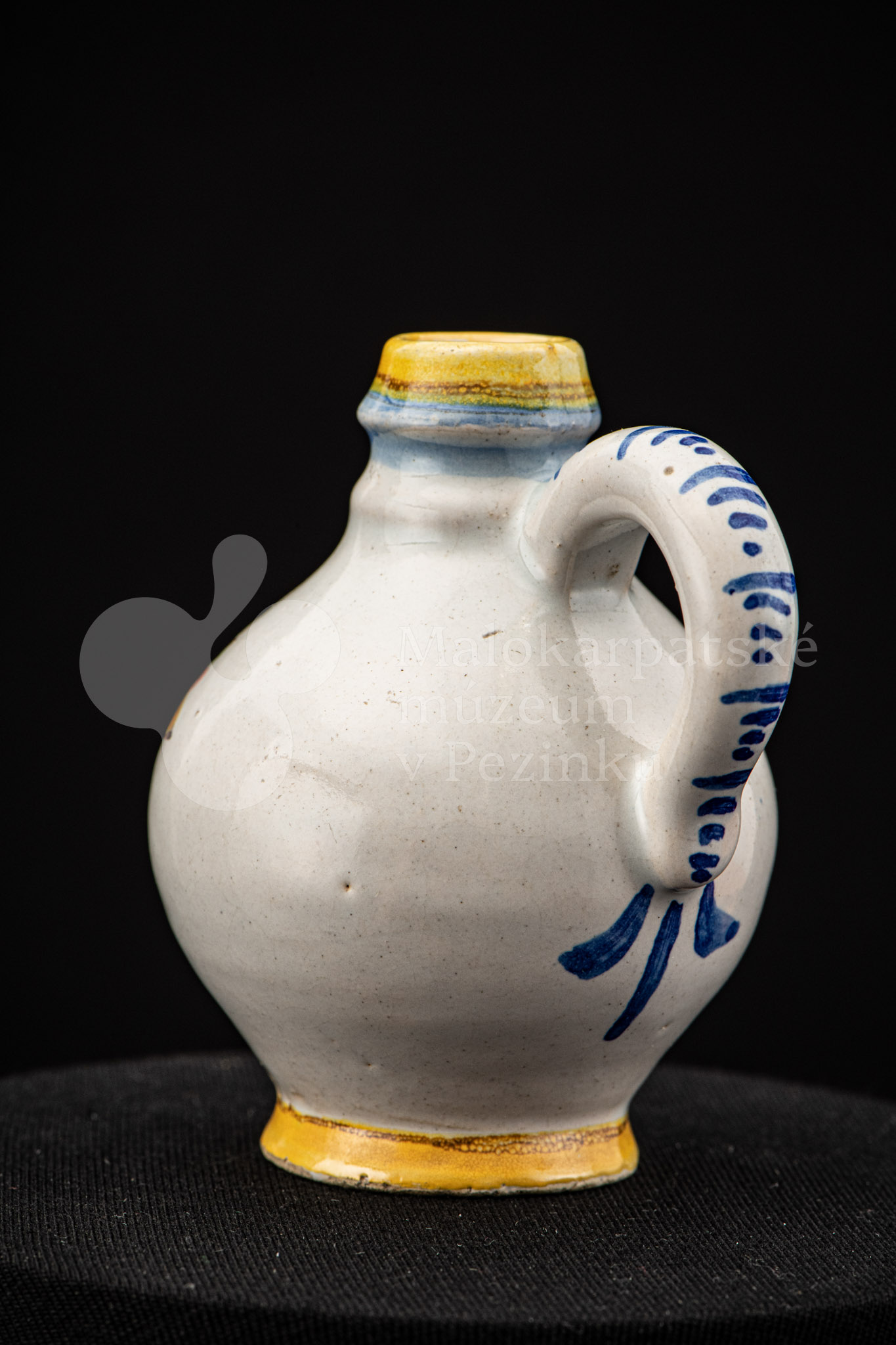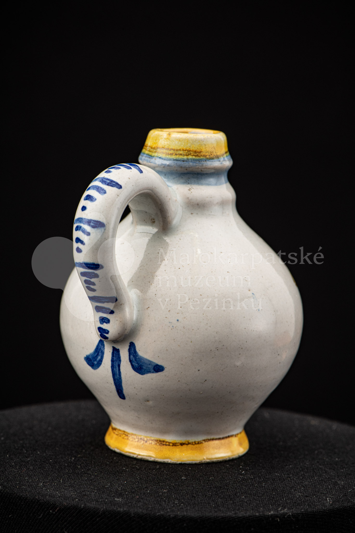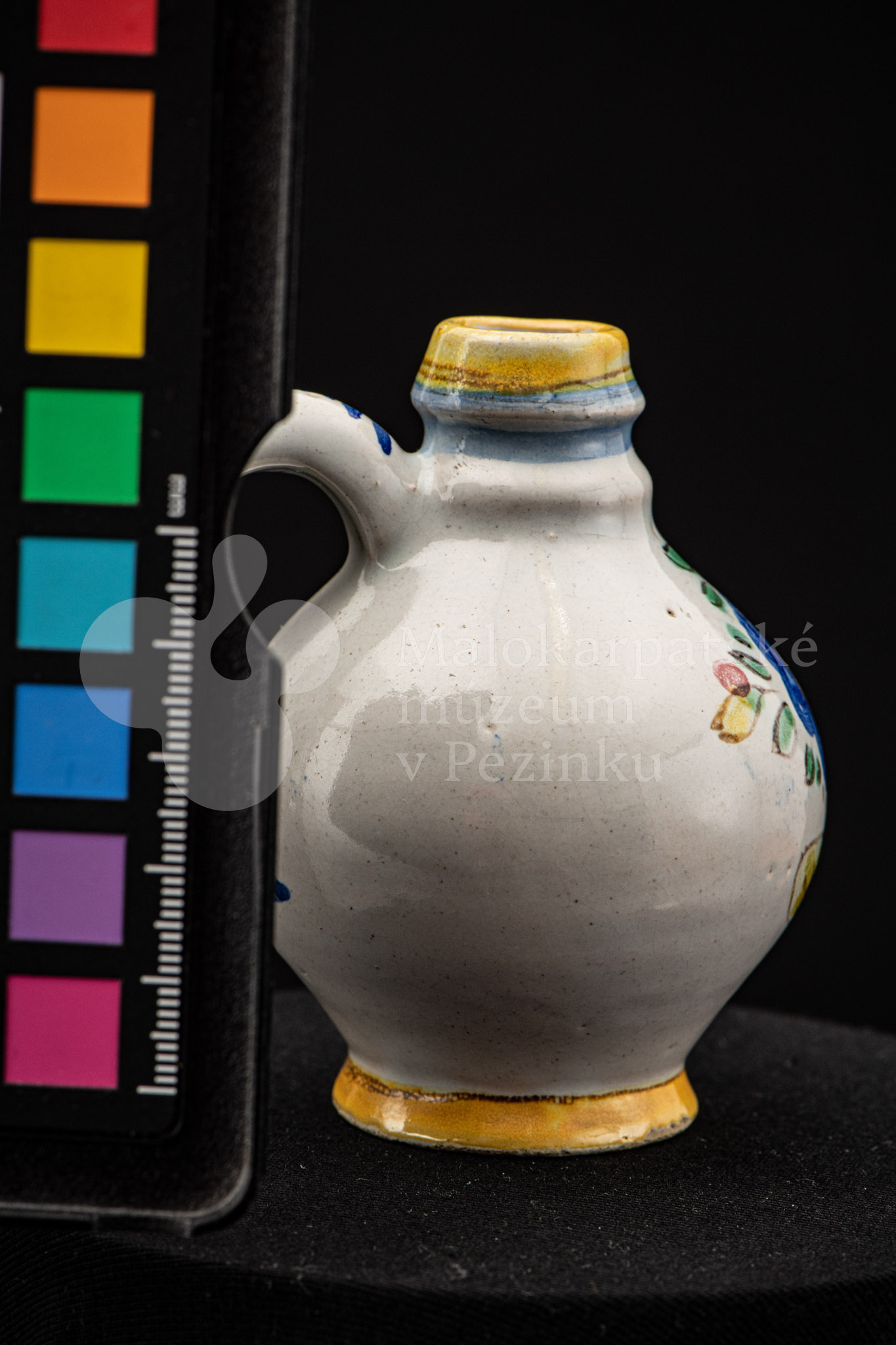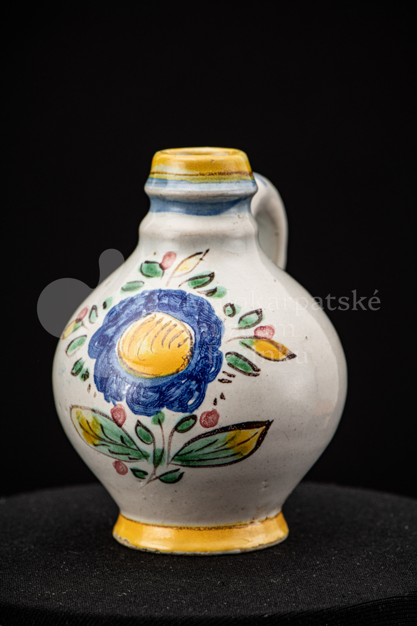 Nádobka fajansová s vydutým bruškom a úzkym hrdlom. Po celej ploche bieloglazovaná. Na prednej strane je namaľovaná modrá ruža. Farebnosť je rôzna. Na dne značenie FK. ST.