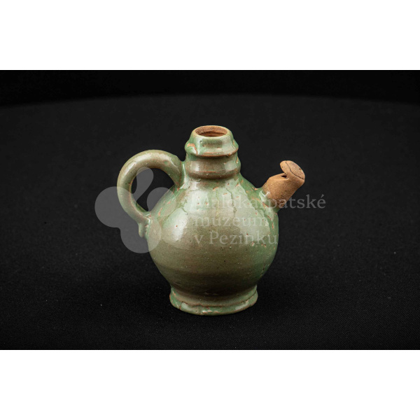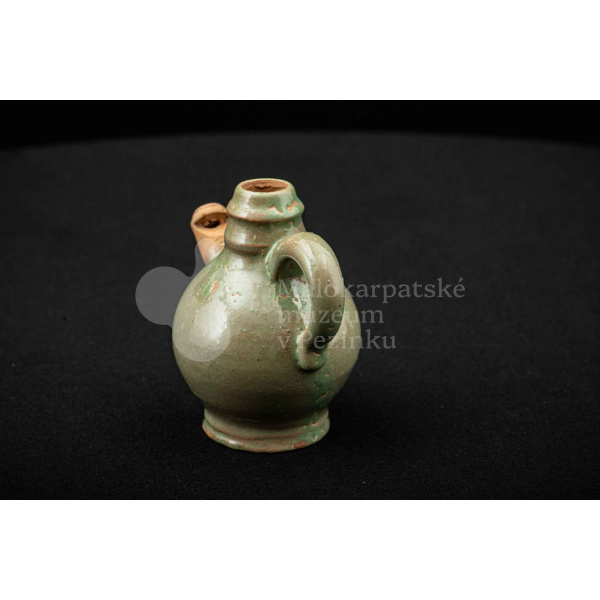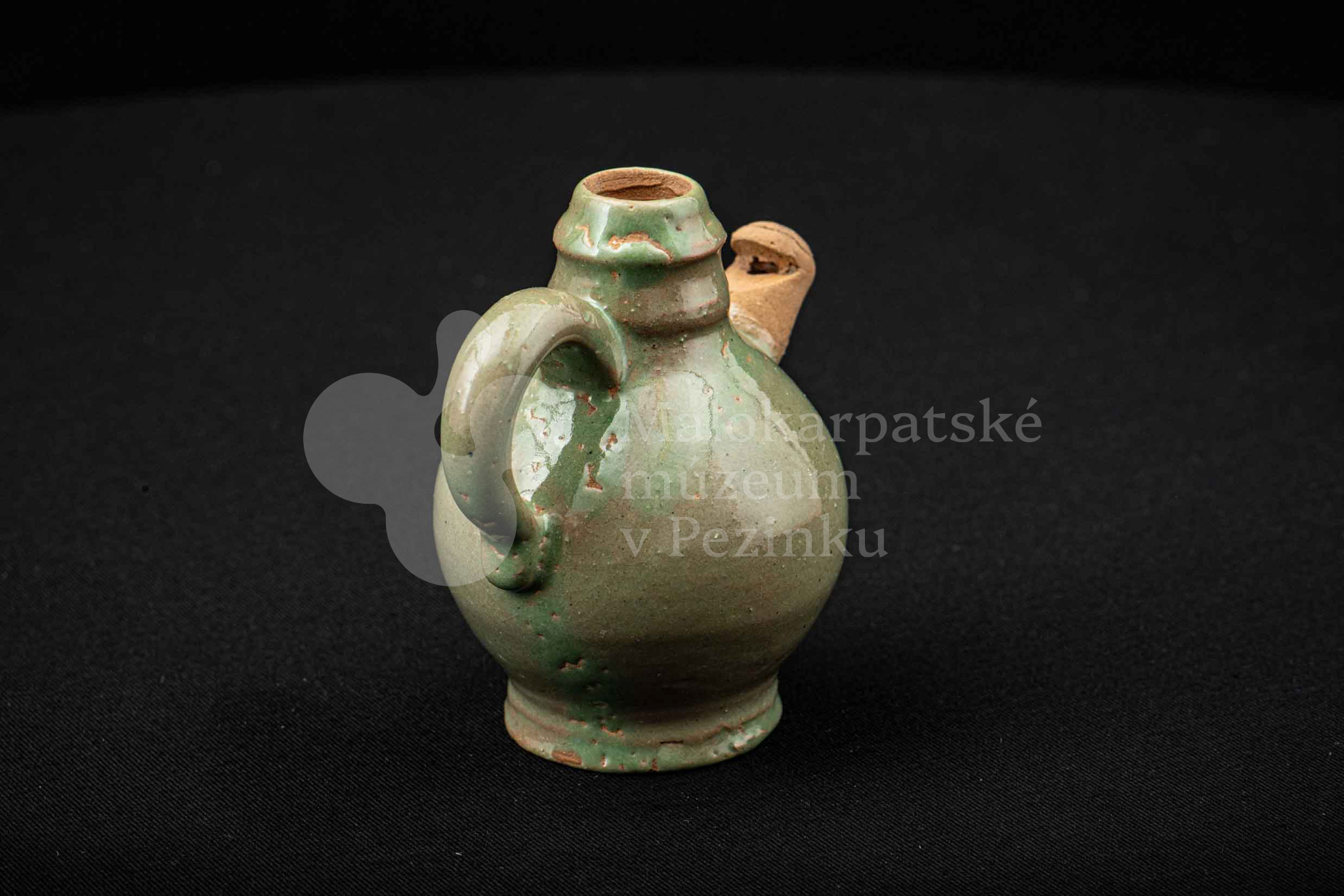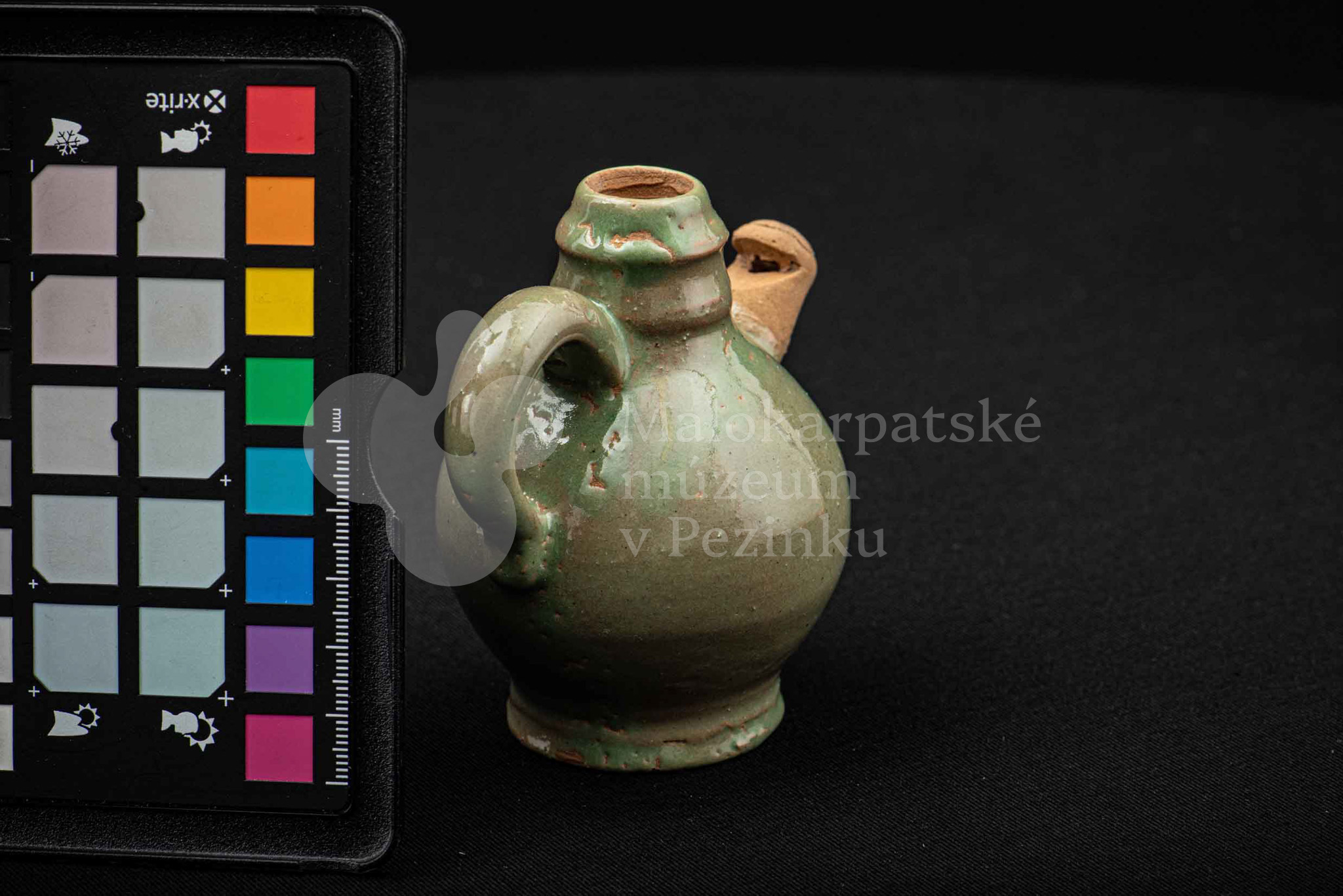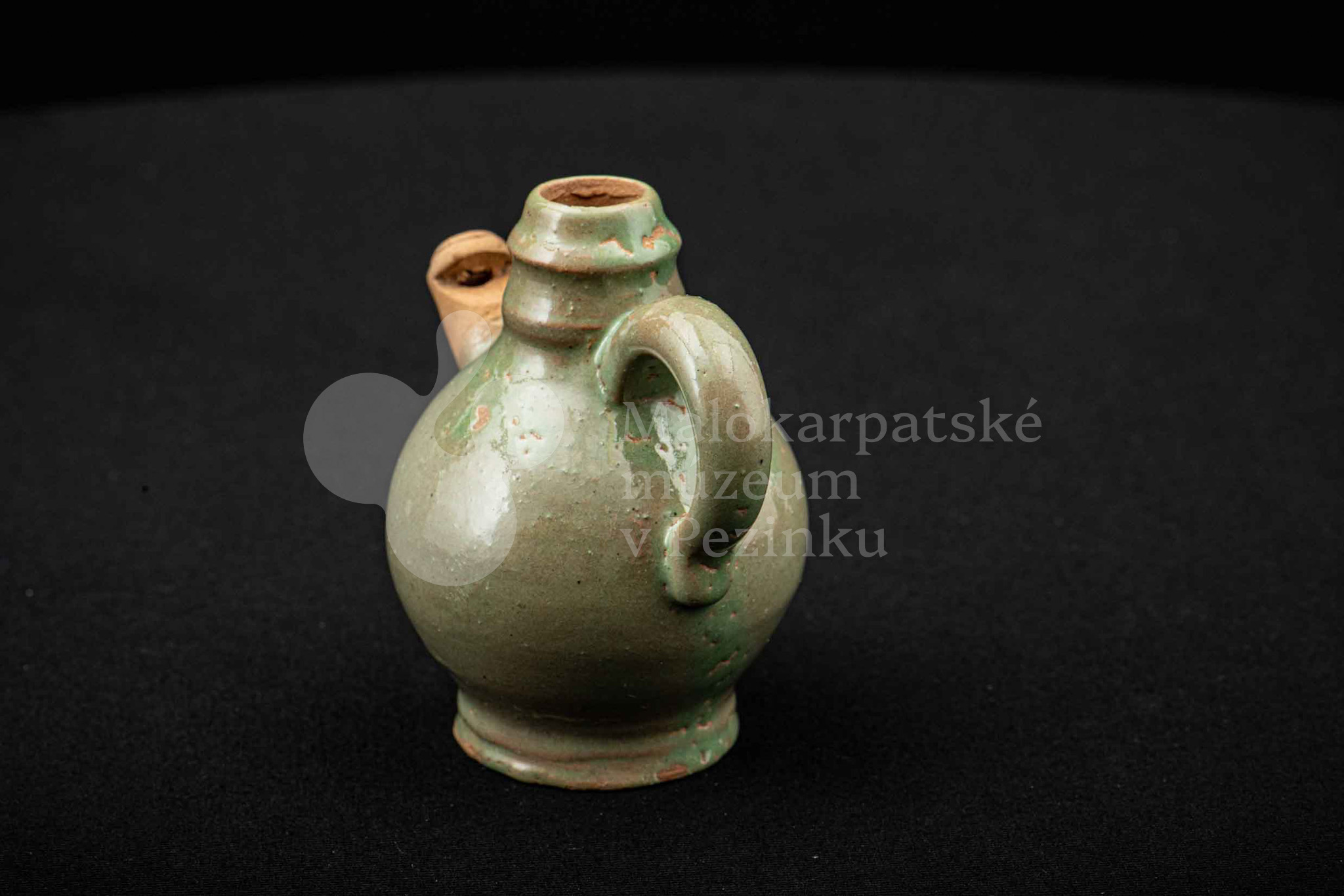 Čepáčik zelený. Spolu tri kusy zelených čepáčikov. Majú vyduté brušká a úzke hrdielka. Na prednej strane píšťalky z pálenej hliny neglazované. Bez značenia.