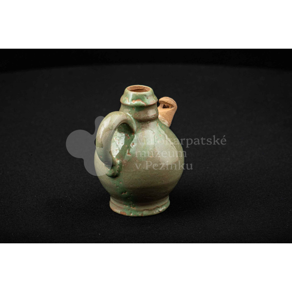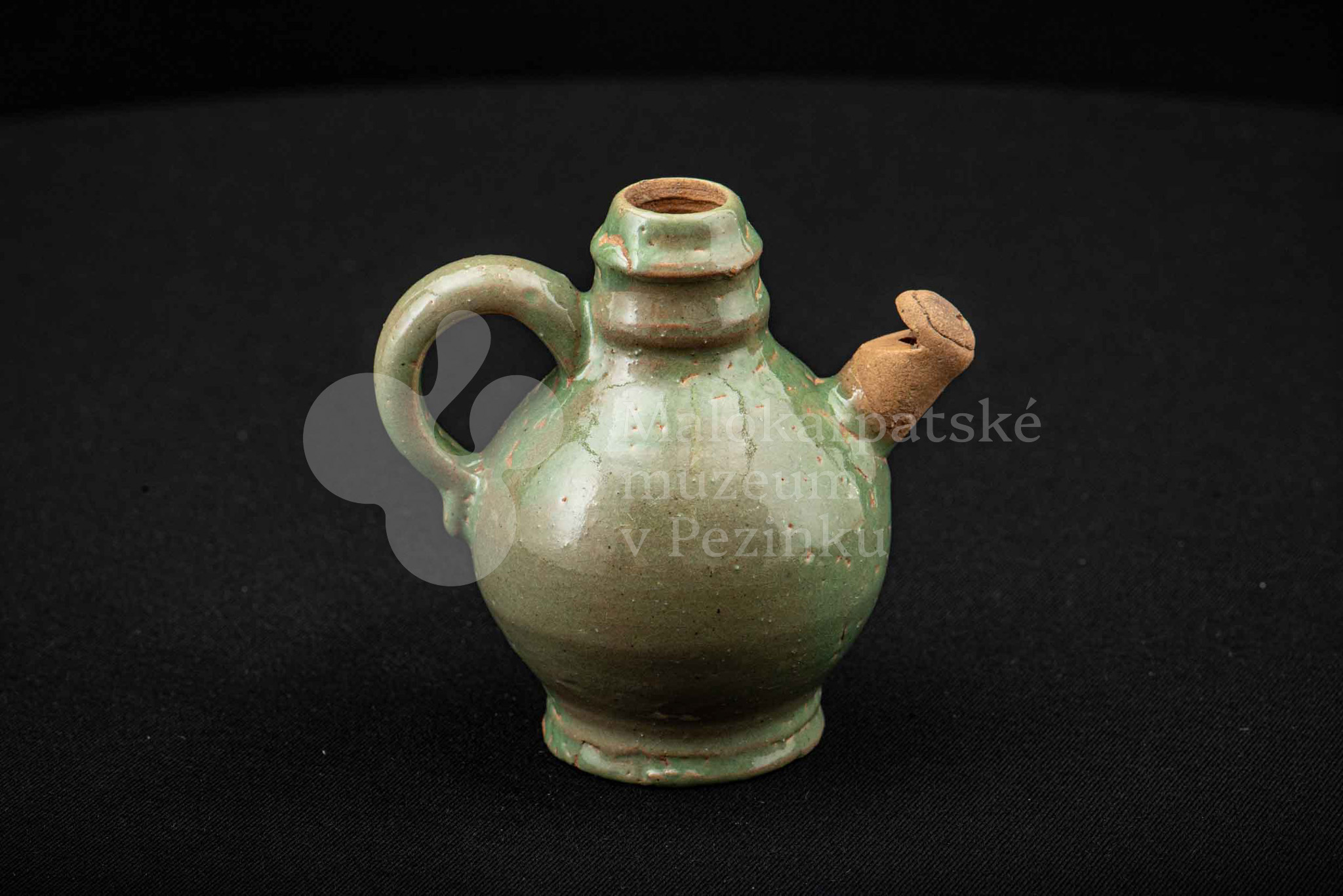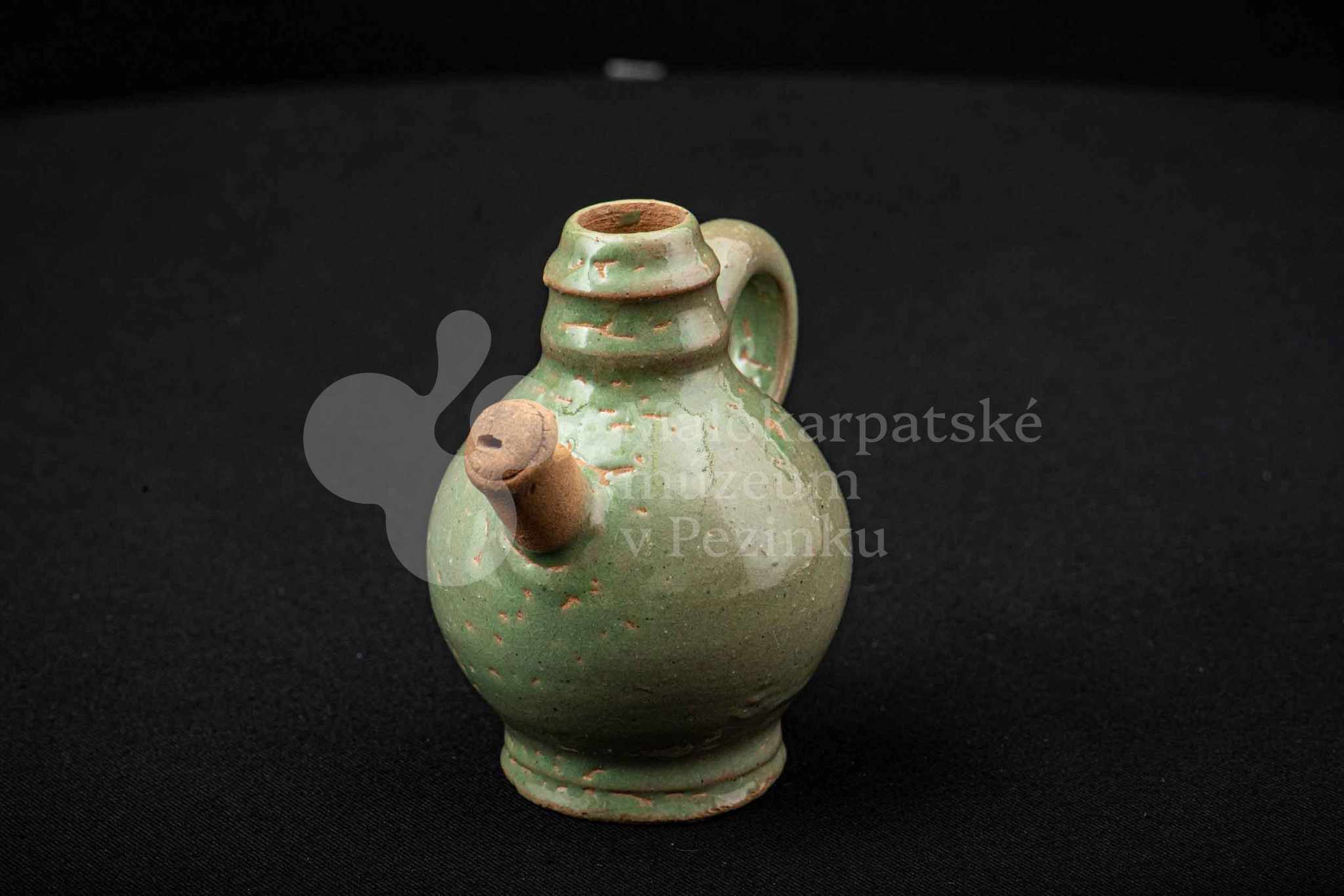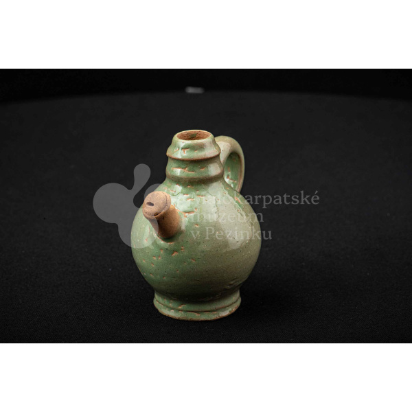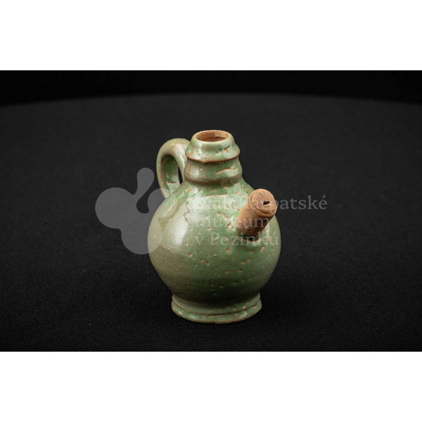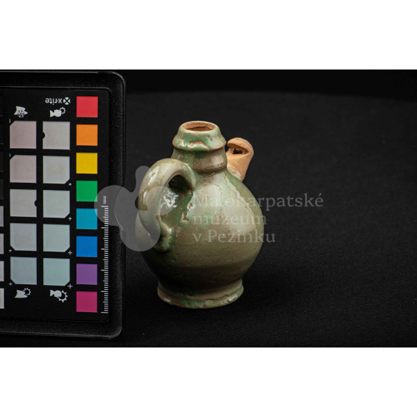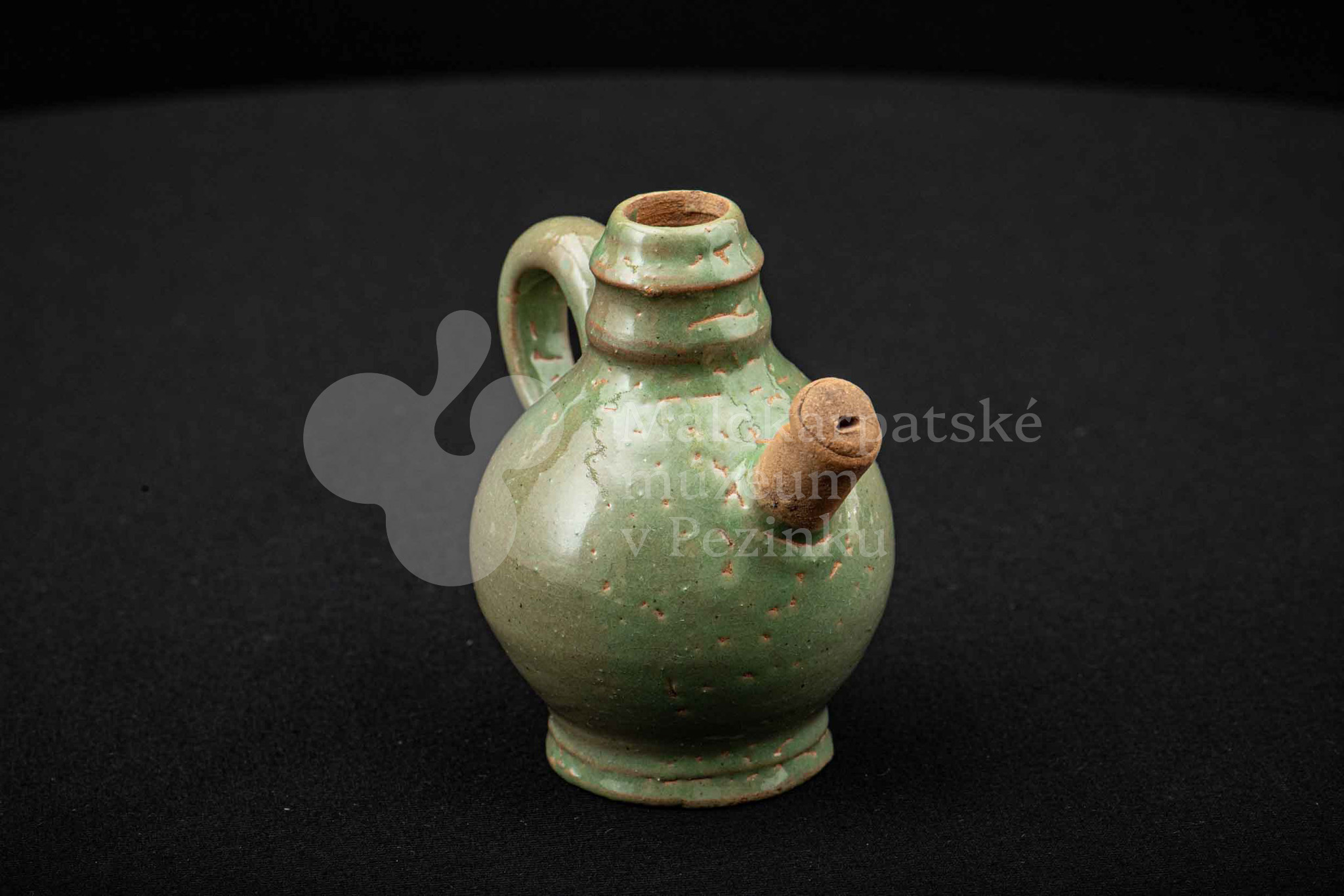 Čepáčik zelený. Spolu tri kusy zelených čepáčikov. Majú vyduté brušká a úzke hrdielka. Na prednej strane píšťalky z pálenej hliny neglazované. Bez značenia.