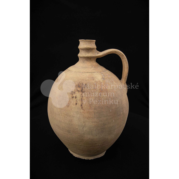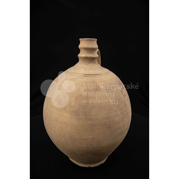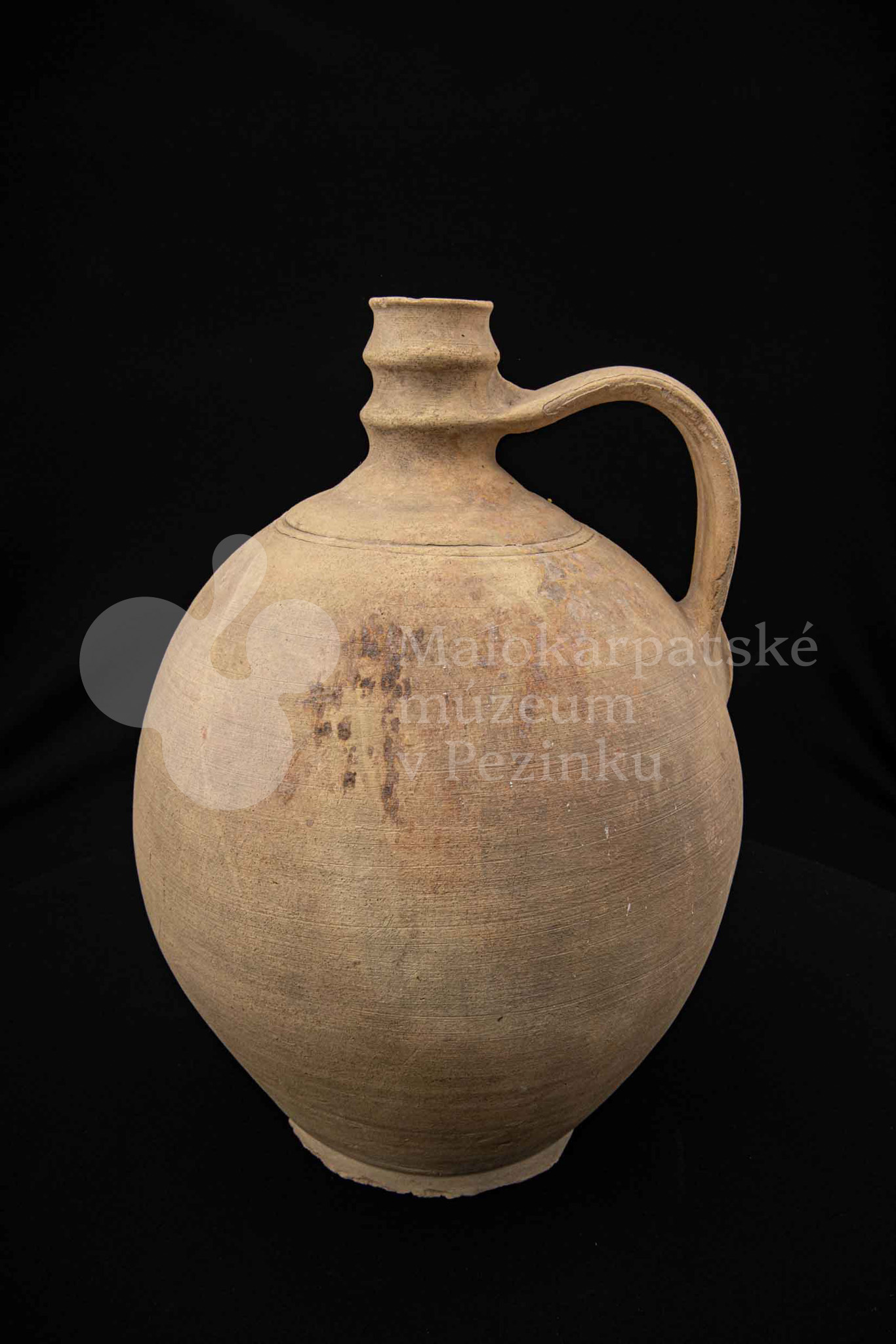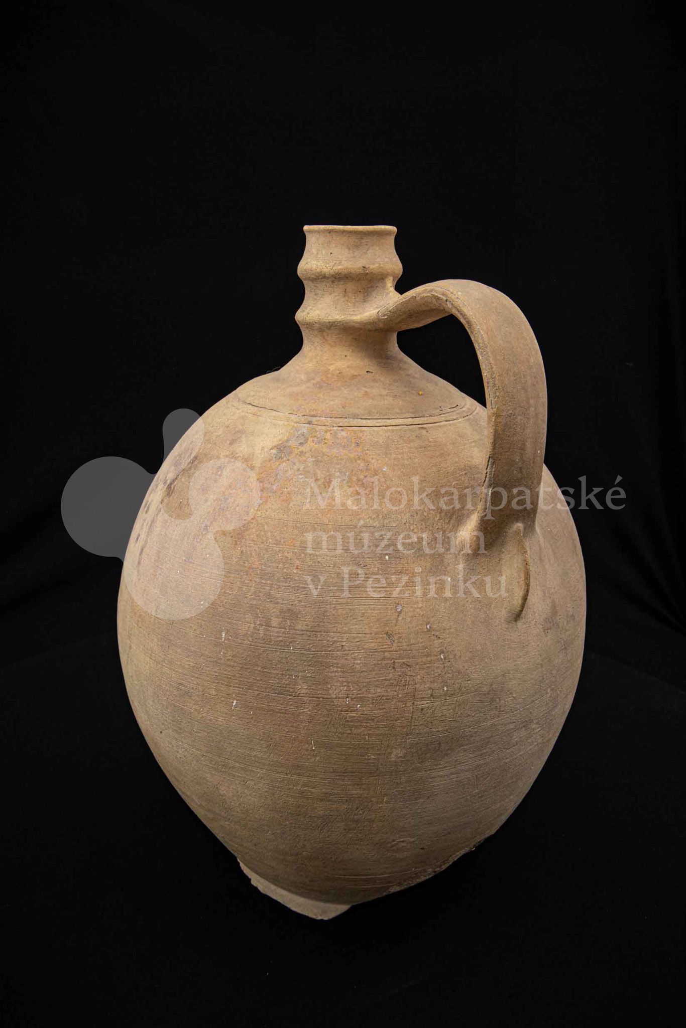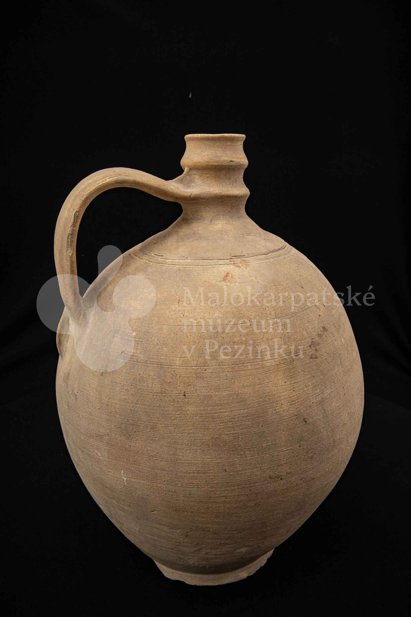 Čepák veľký neglazovaný, len raz pálený, s jedným uchom. Brucho má silno vyduté, hrdlo zúžené. Silno poškodený. Bez značenia.