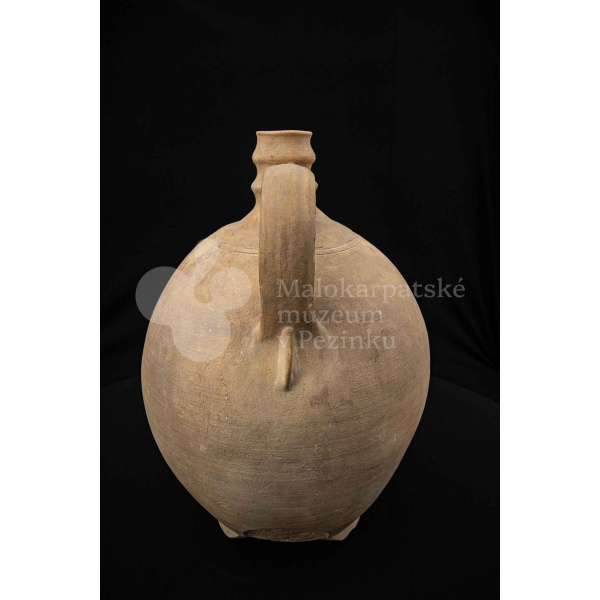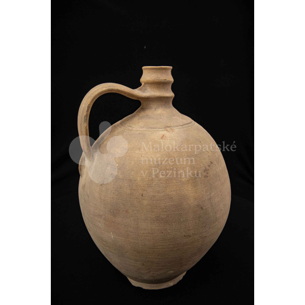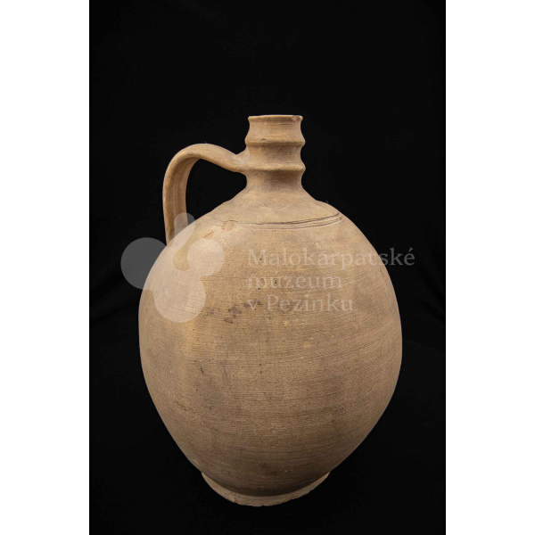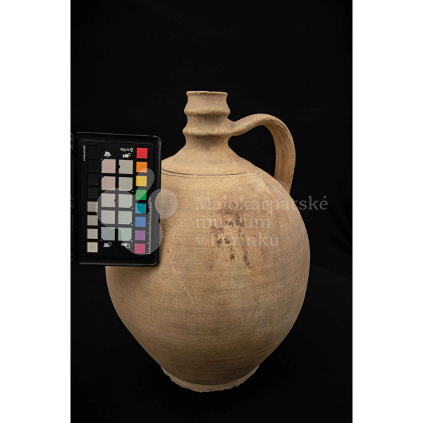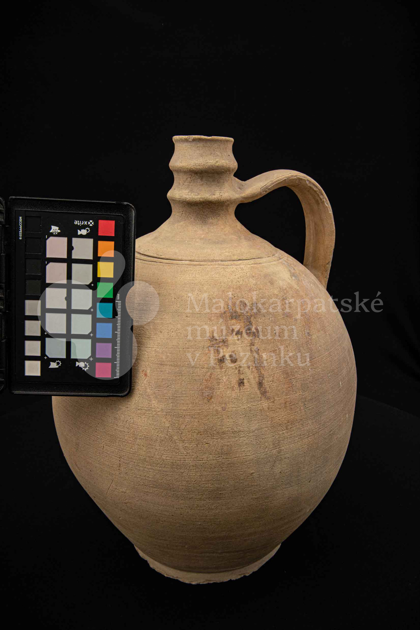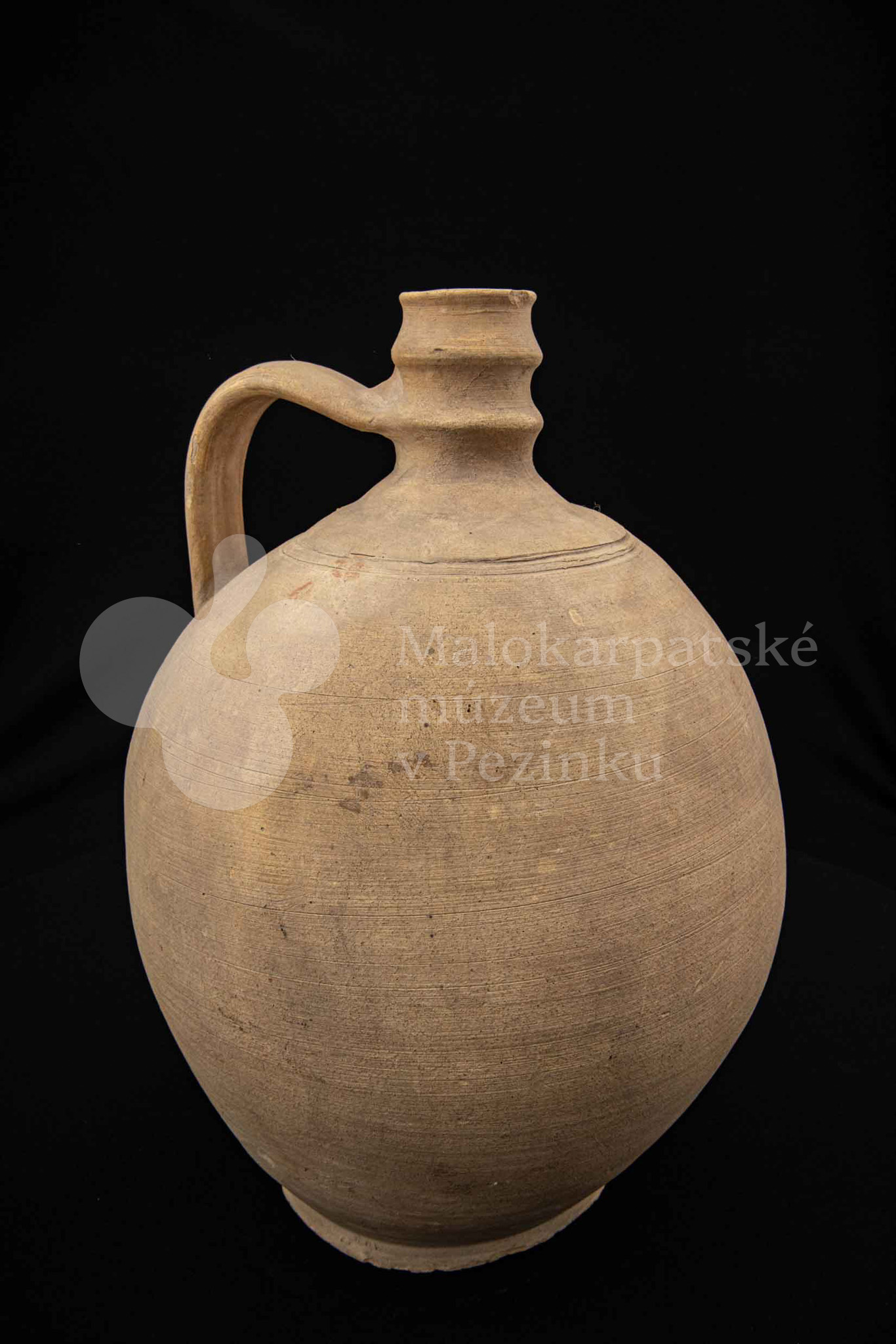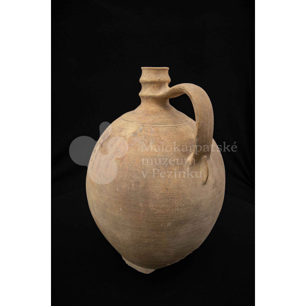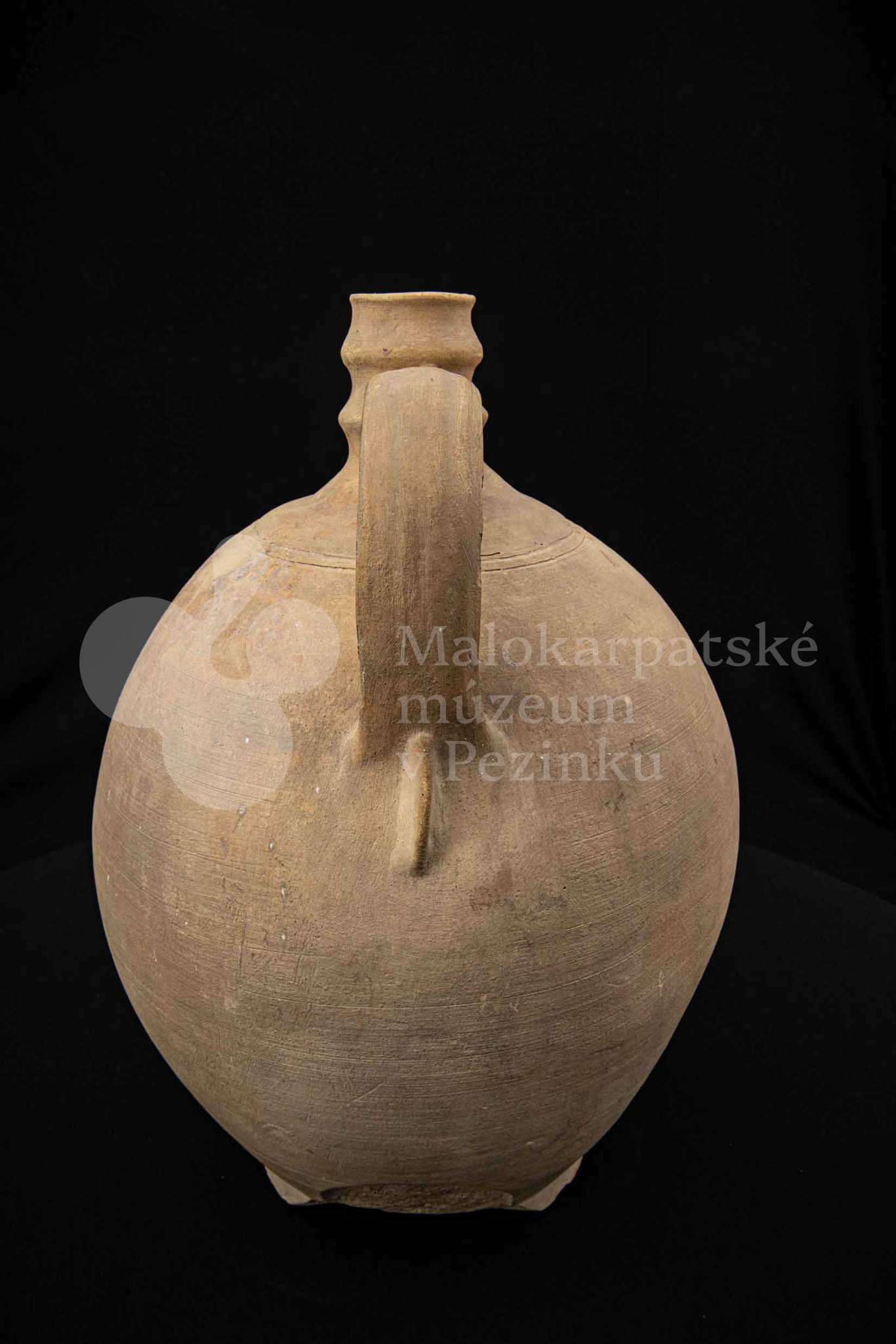 Čepák veľký neglazovaný, len raz pálený, s jedným uchom. Brucho má silno vyduté, hrdlo zúžené. Silno poškodený. Bez značenia.