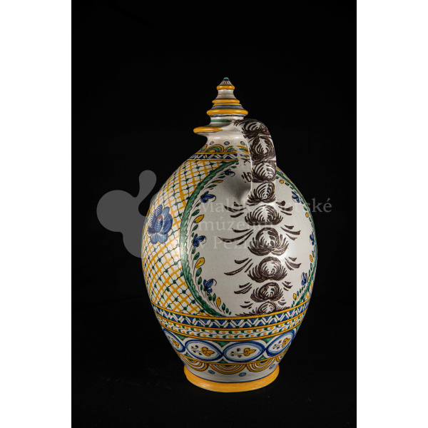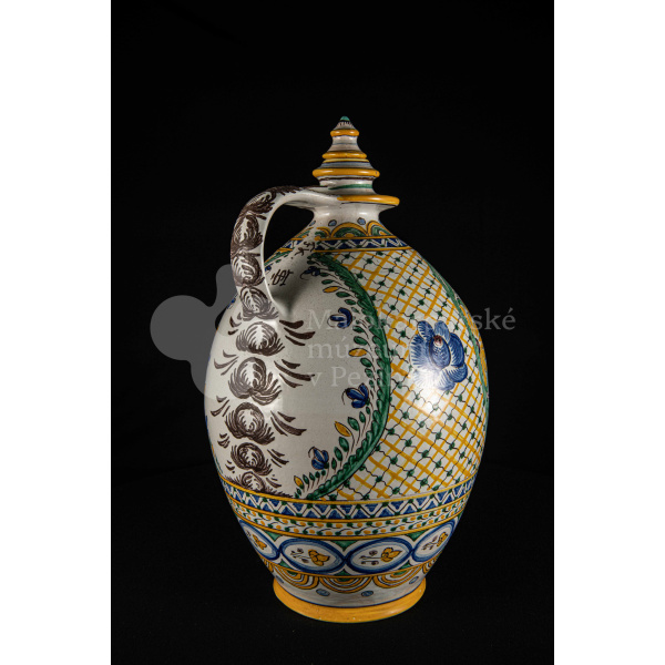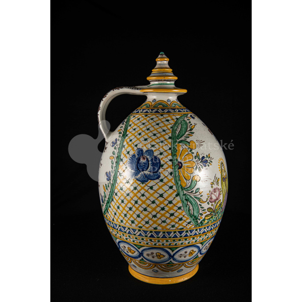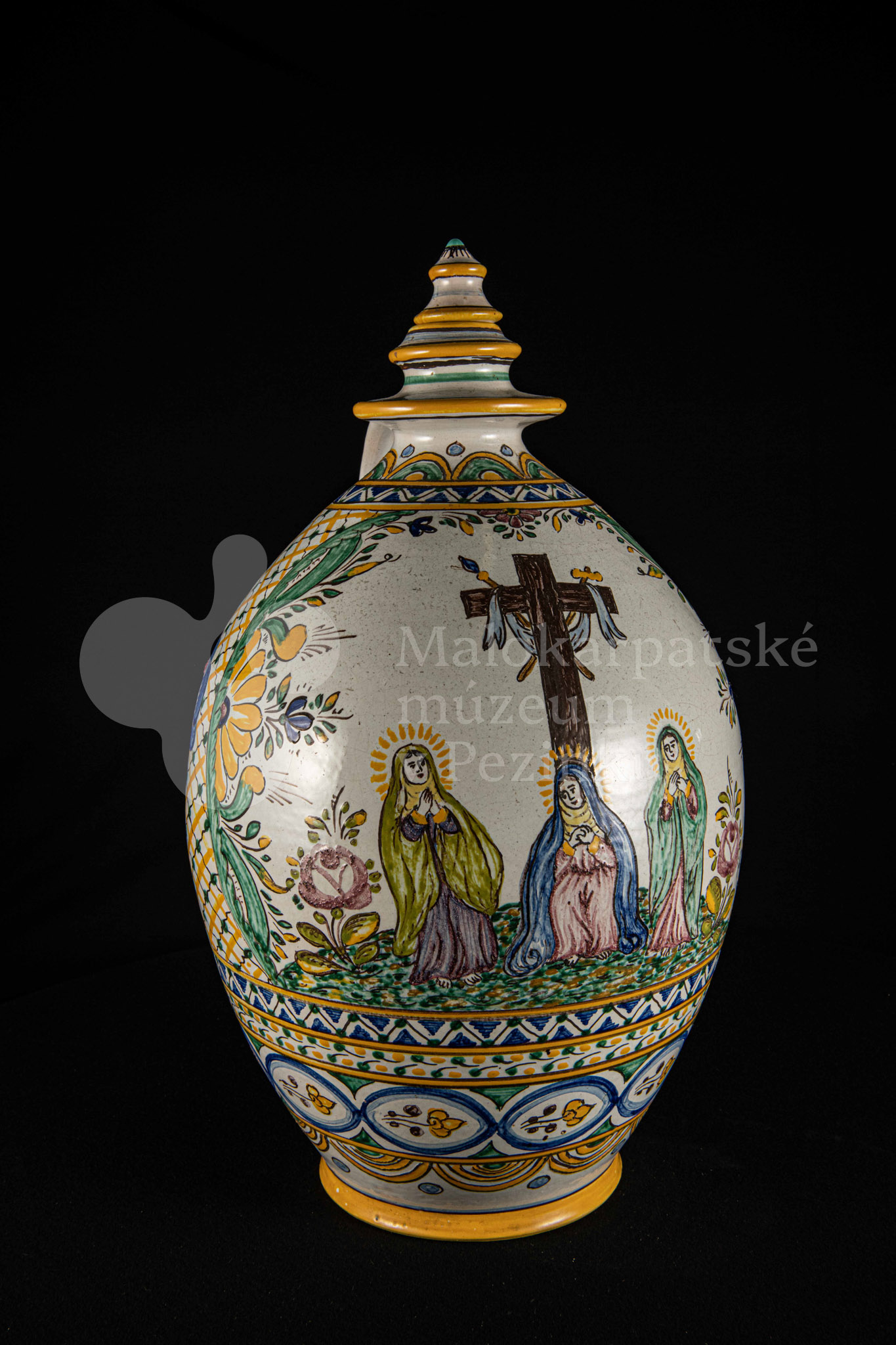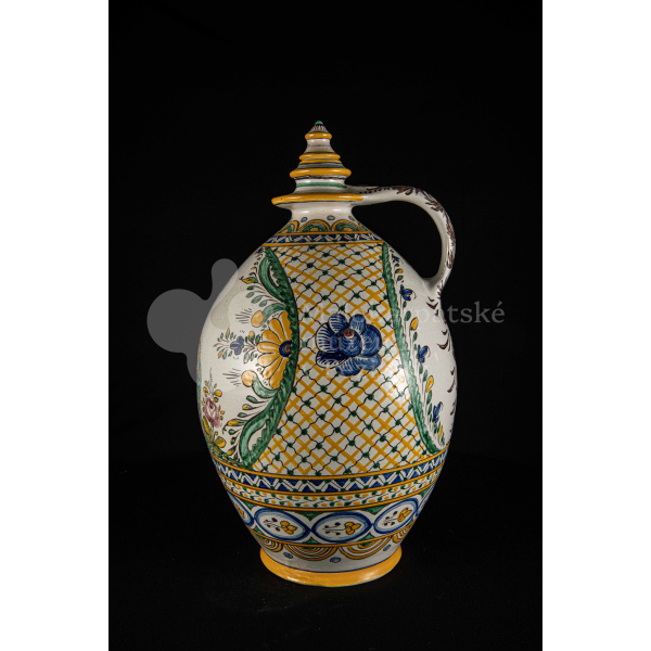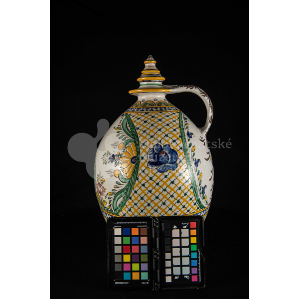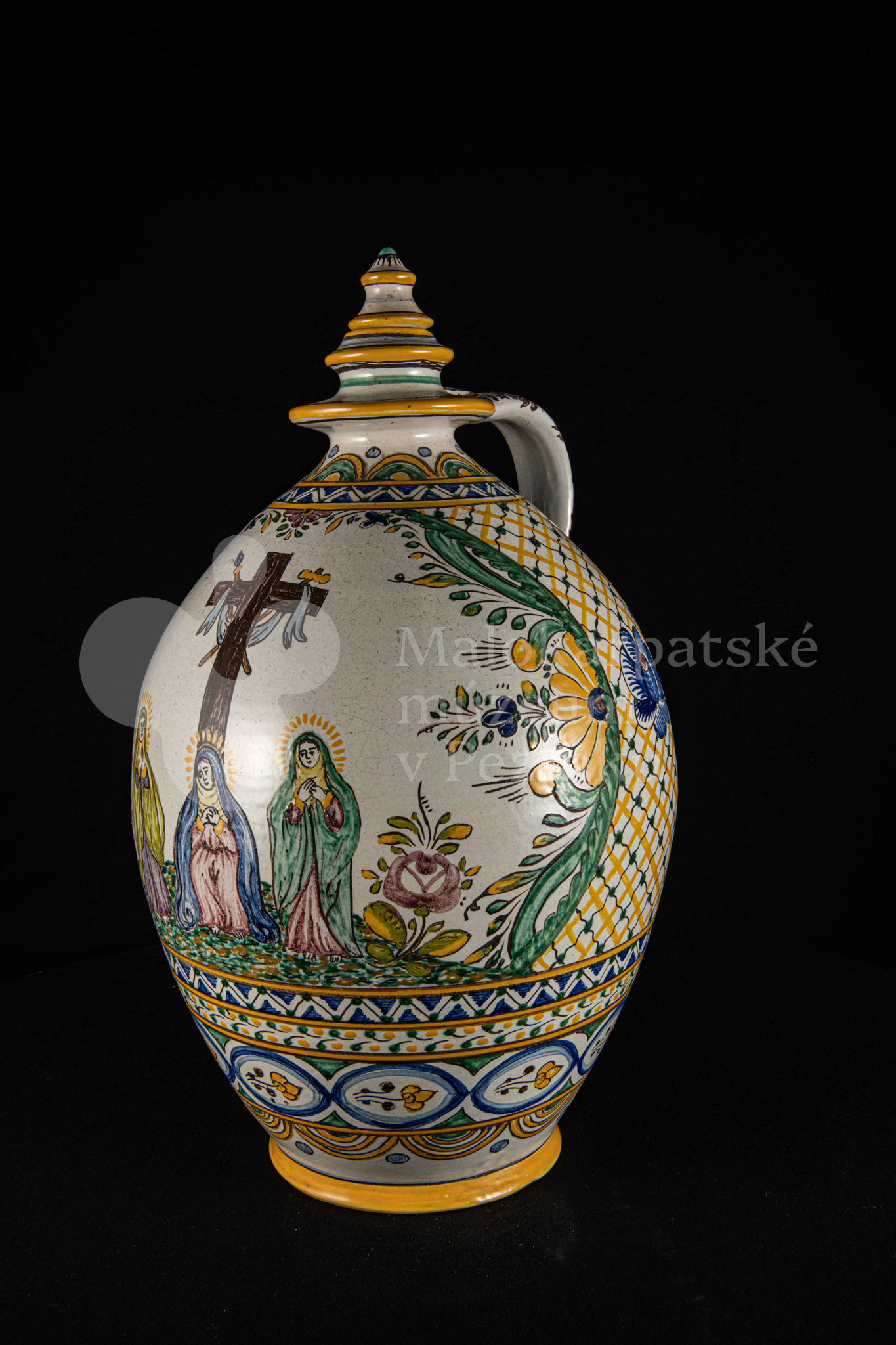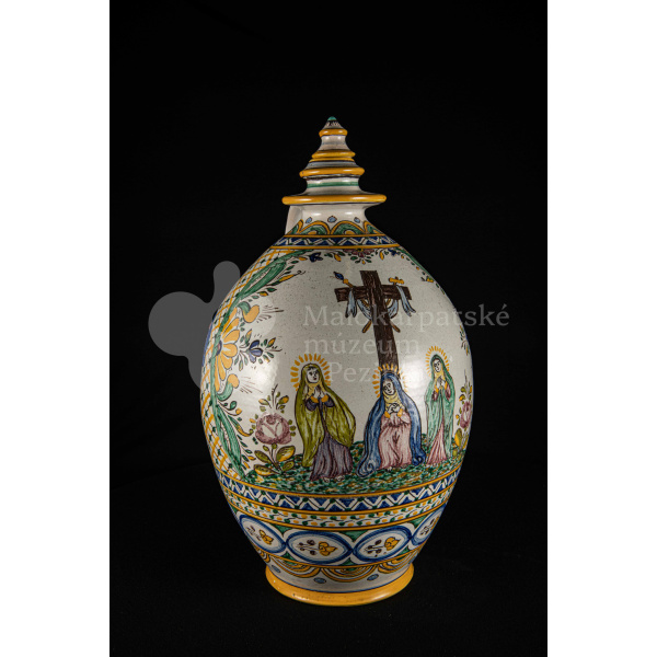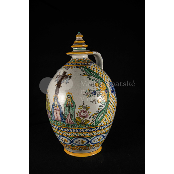 Črpák fajansový, vysokožiarový dekor s motívom kalvárie. Kríž bez korpusu a pri ňom tri ženy. Farebnosť rôzna. Pod uchom je značenie FK.ST.