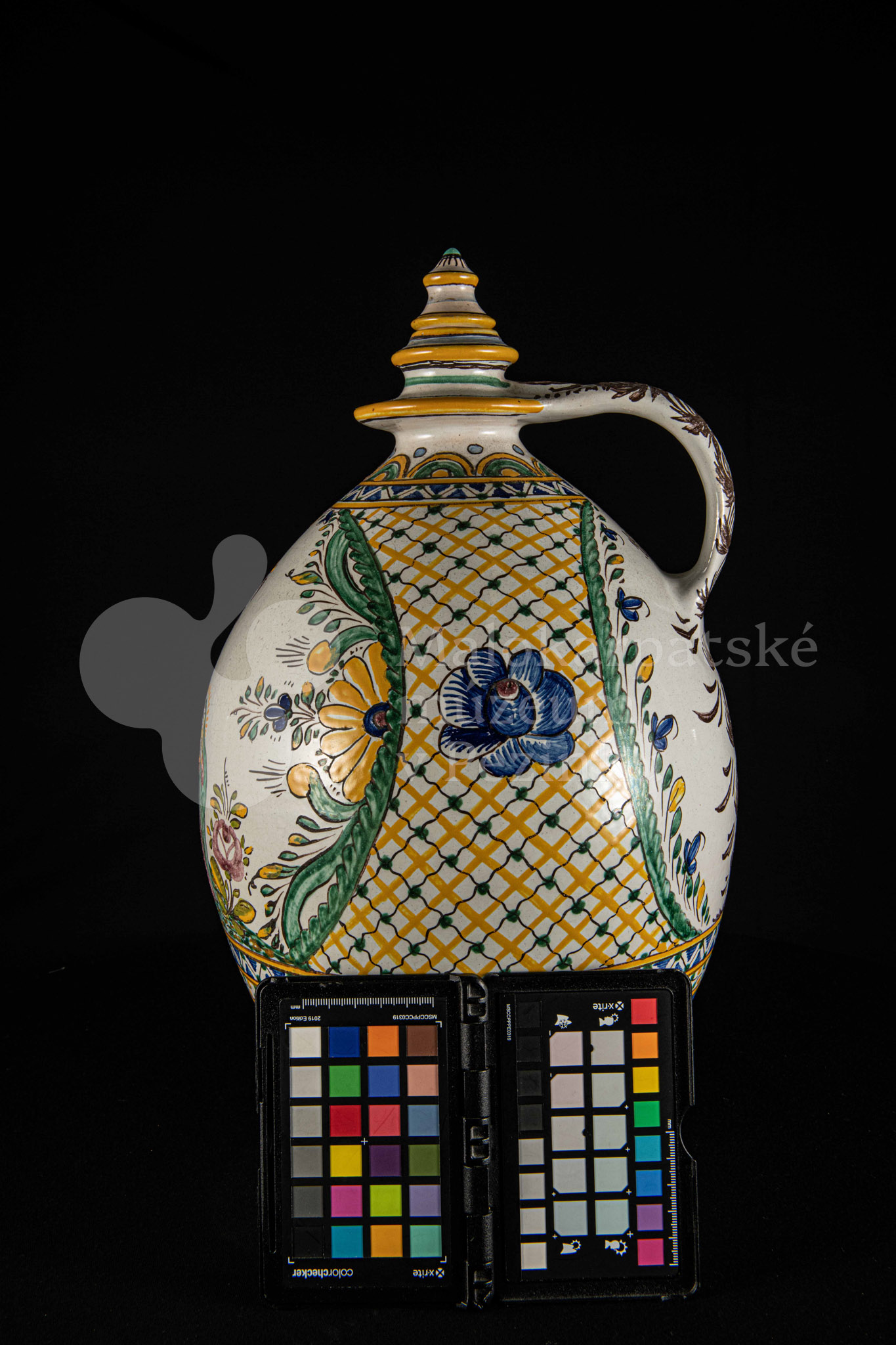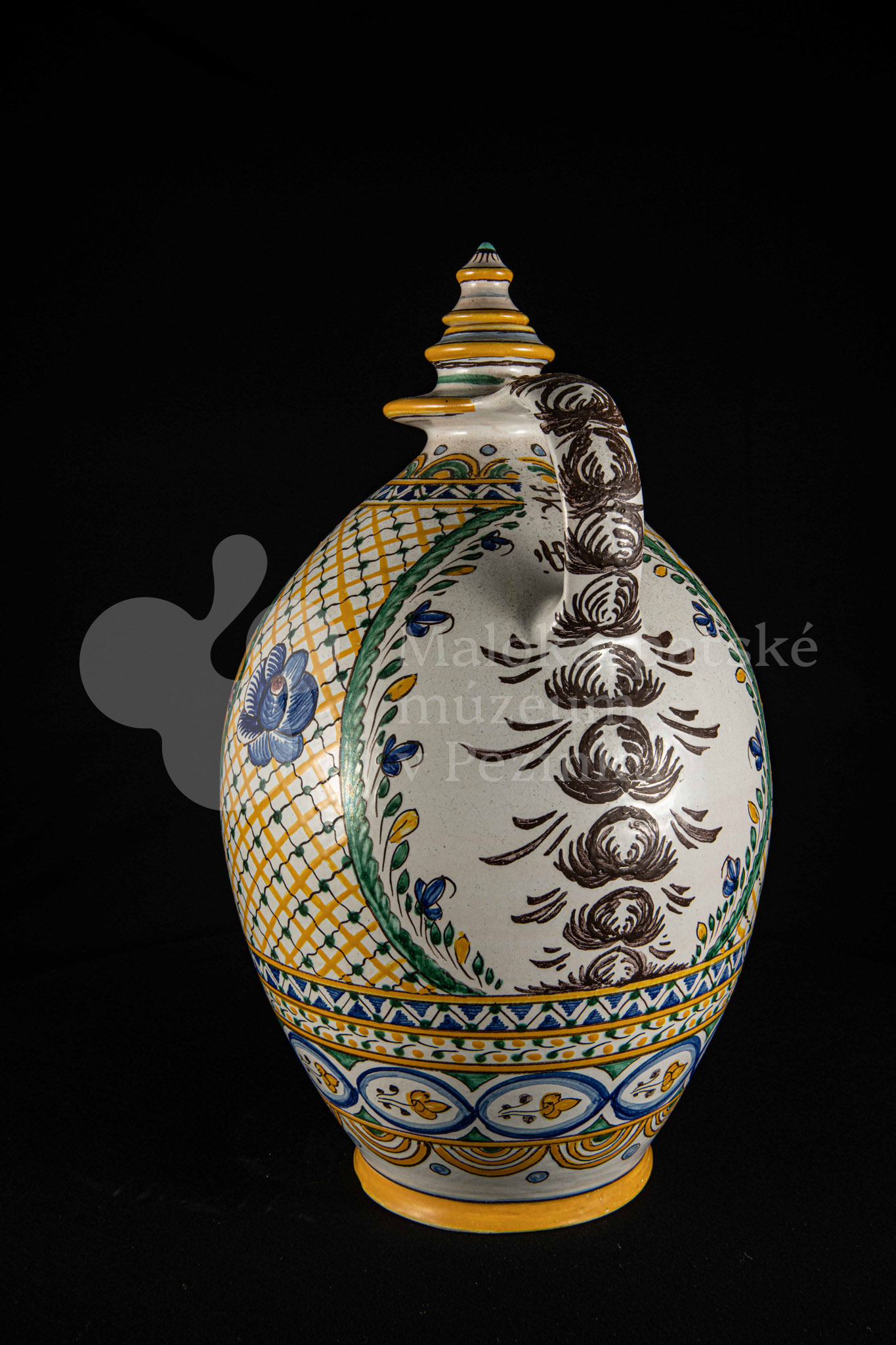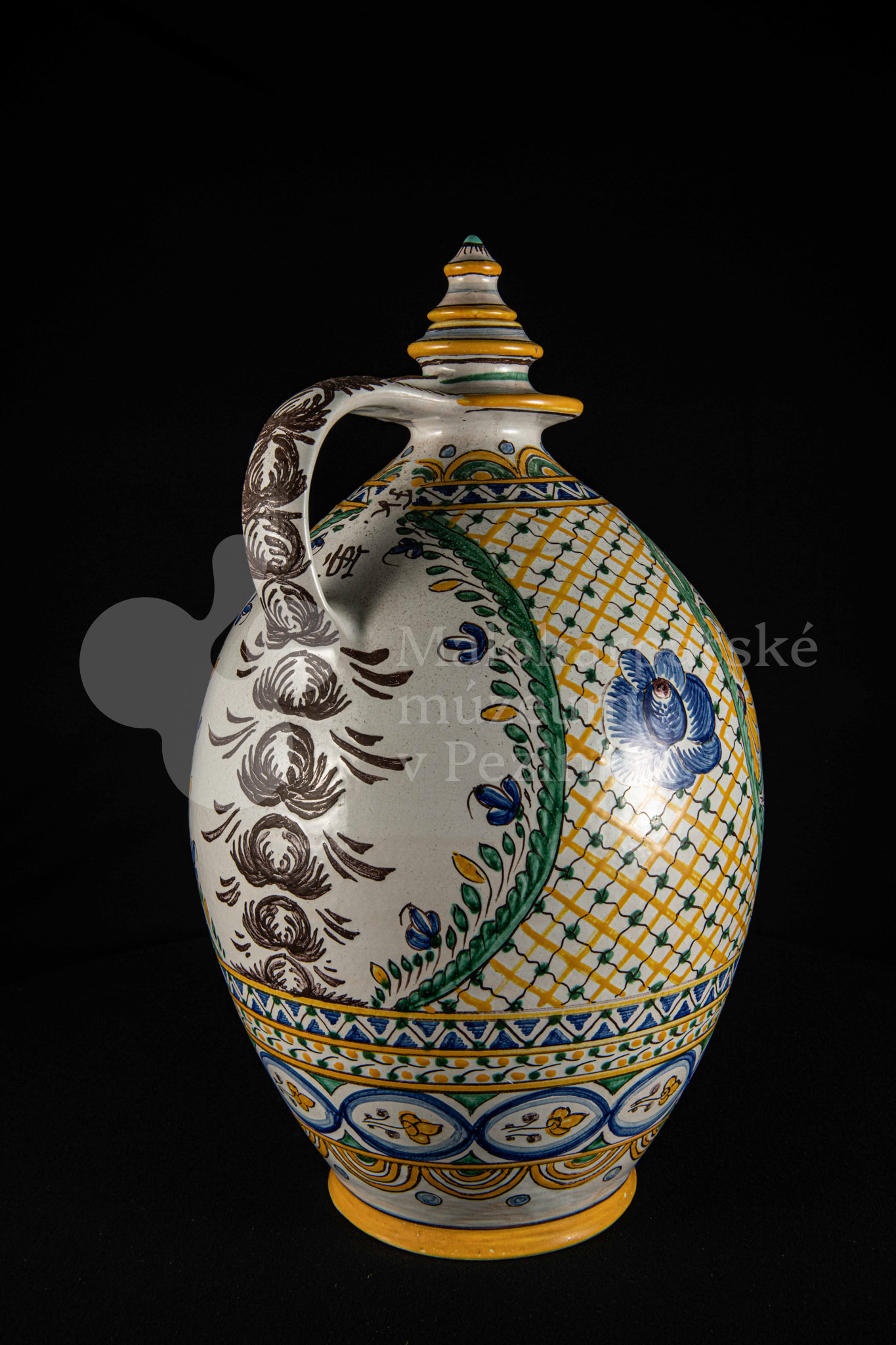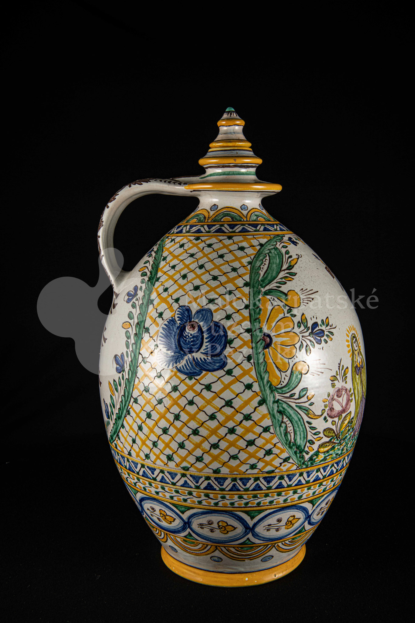 Črpák fajansový, vysokožiarový dekor s motívom kalvárie. Kríž bez korpusu a pri ňom tri ženy. Farebnosť rôzna. Pod uchom je značenie FK.ST.
