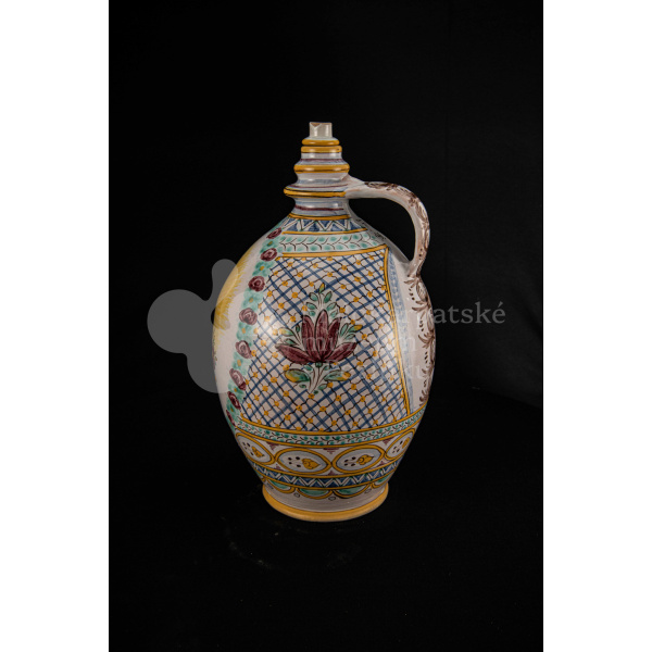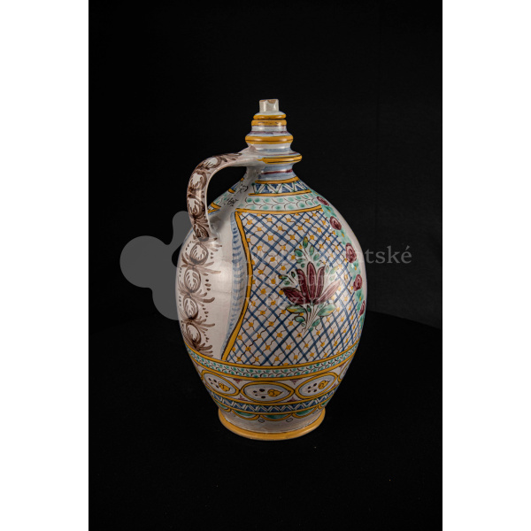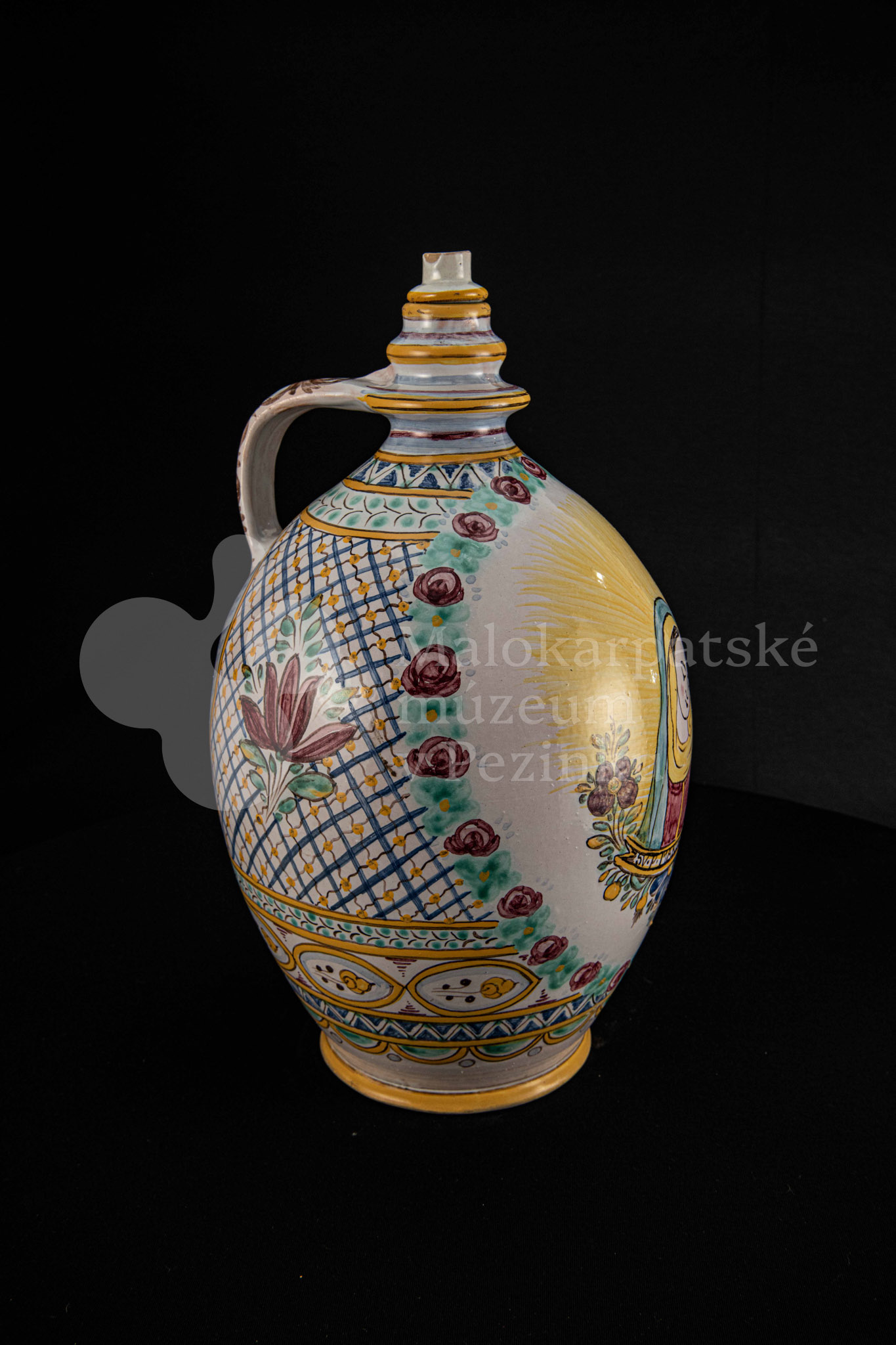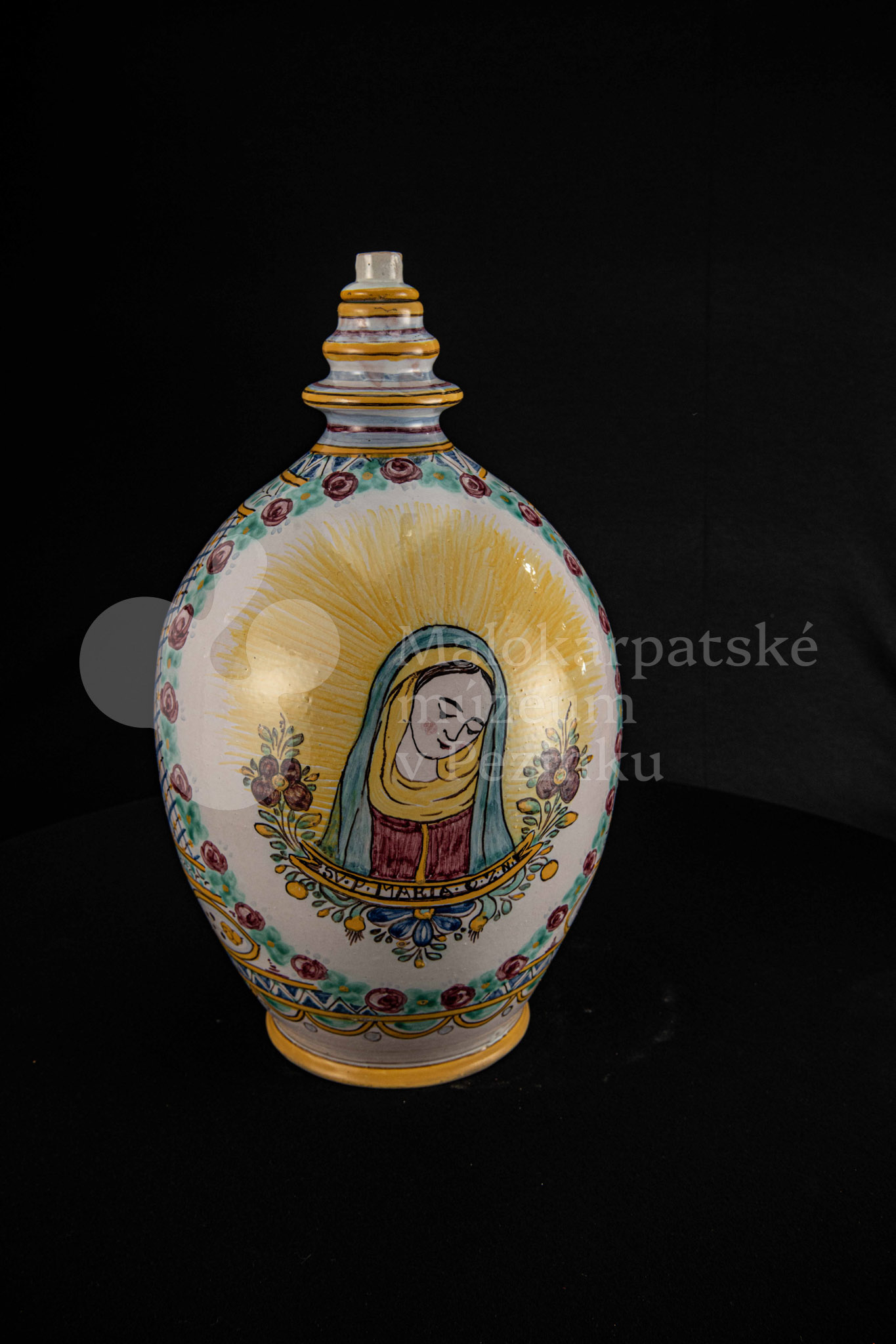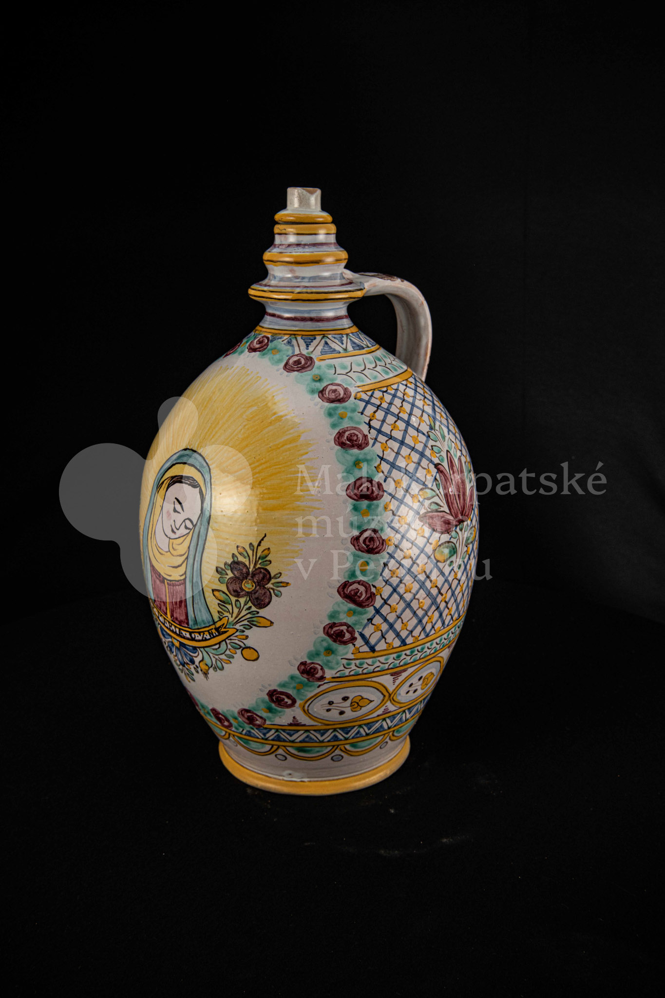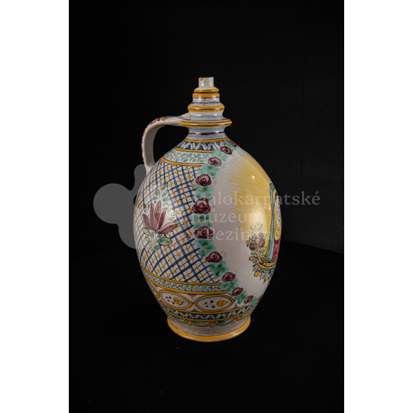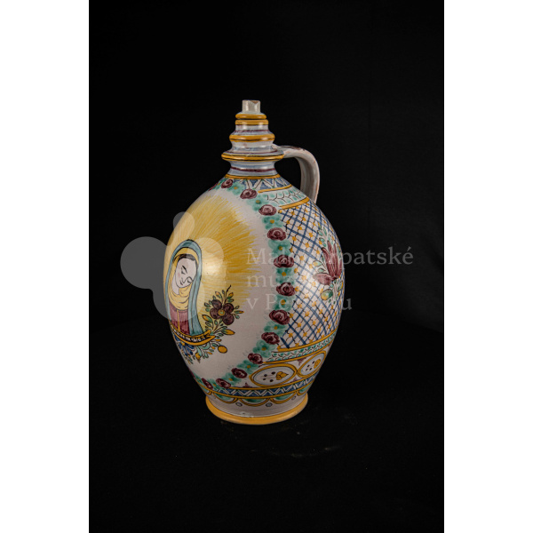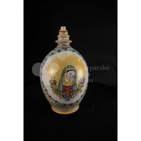 Črpák fajansový, v strede Putzovská Panna Mária s veľkou žltou žiarou a nápisom. Okolo nej veniec z červených ružičiek a zelených lístkov. Po celej ploche bieloglazovaný s vysokožiarovým dekorom rôznych pestrých farieb. Pod uchom značenie FK.ST.