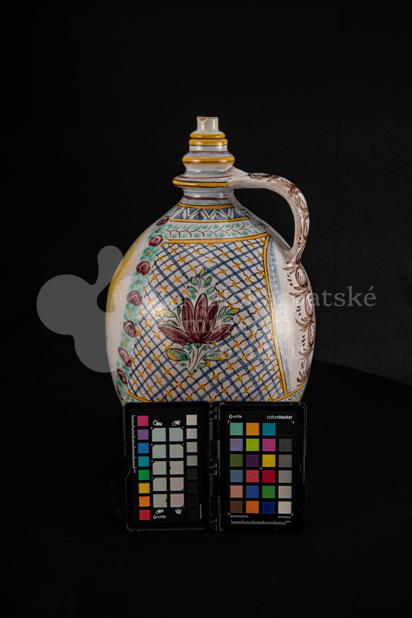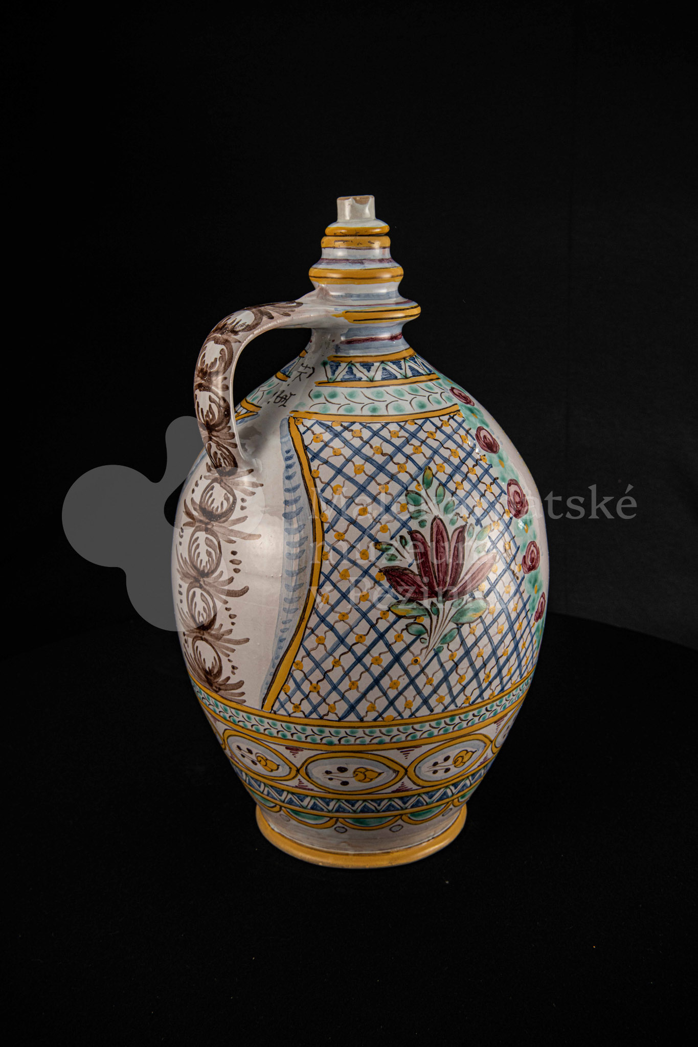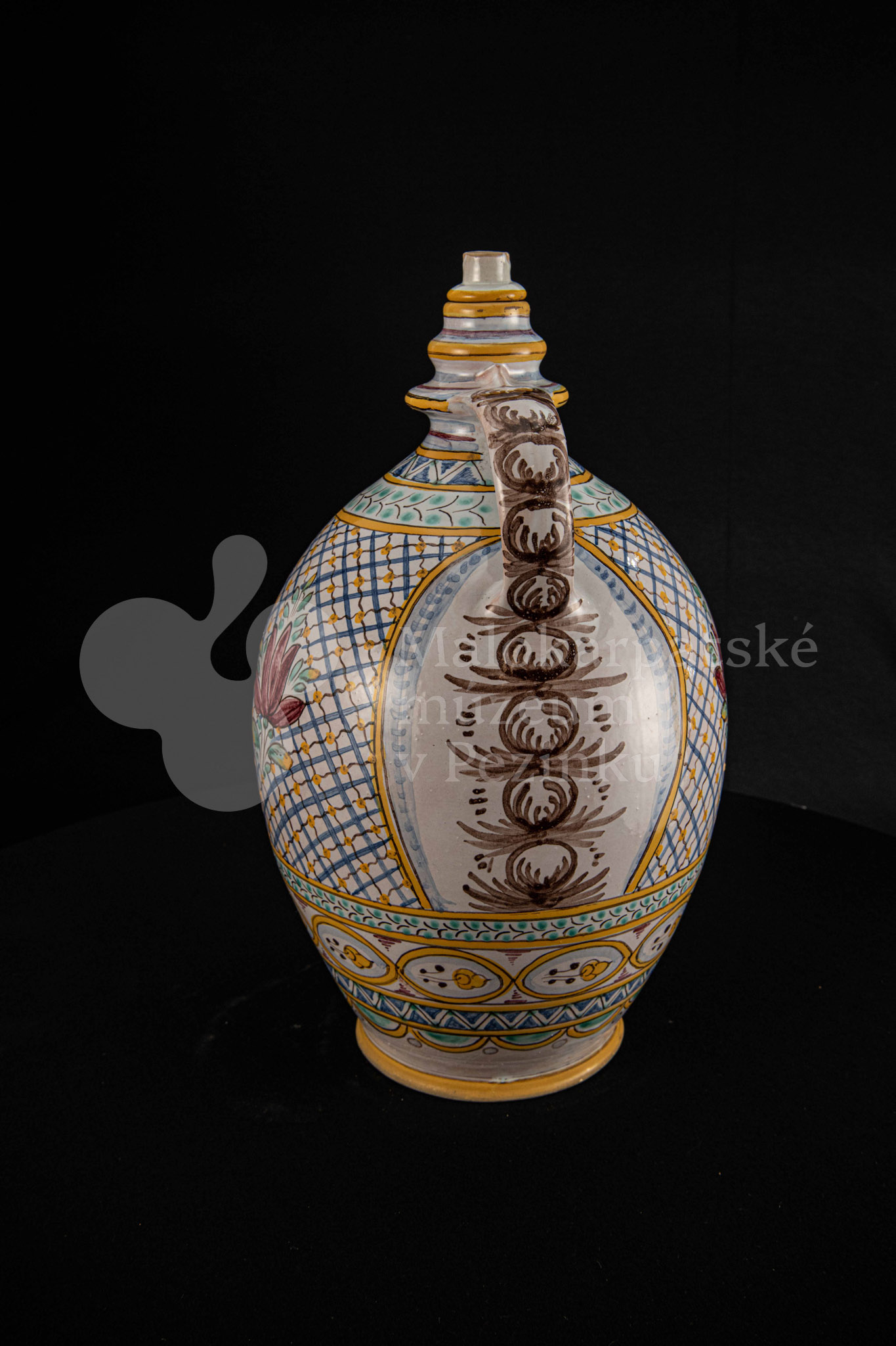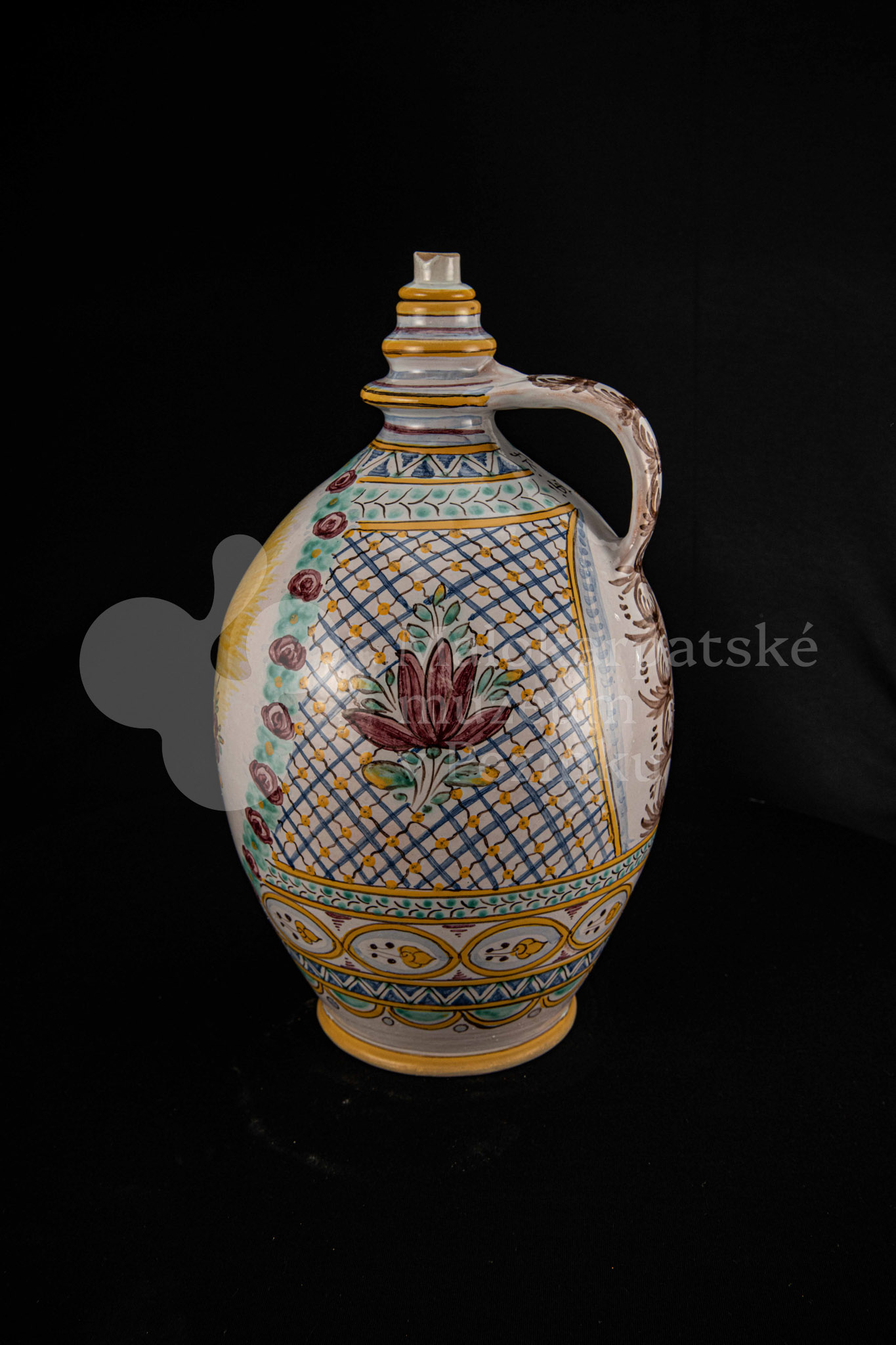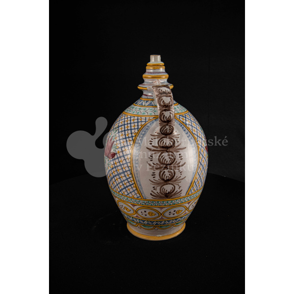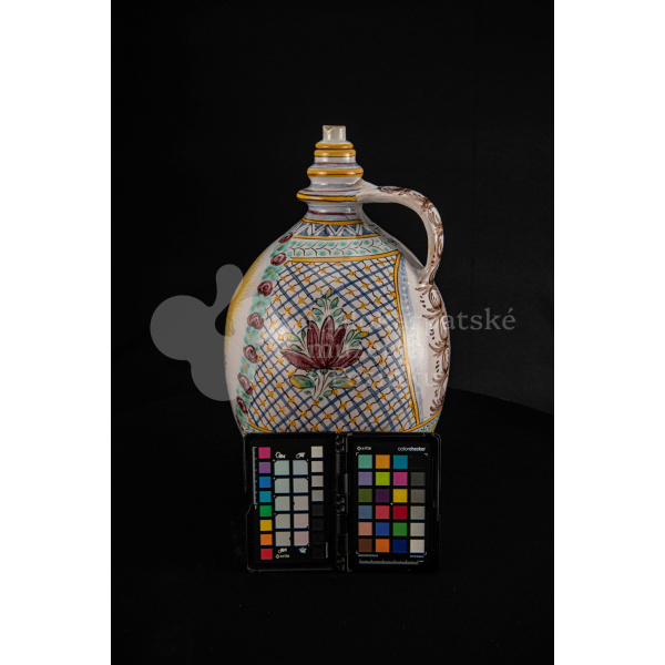 Črpák fajansový, v strede Putzovská Panna Mária s veľkou žltou žiarou a nápisom. Okolo nej veniec z červených ružičiek a zelených lístkov. Po celej ploche bieloglazovaný s vysokožiarovým dekorom rôznych pestrých farieb. Pod uchom značenie FK.ST.
