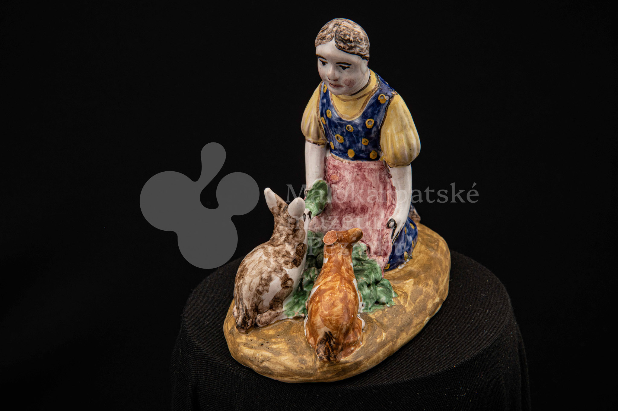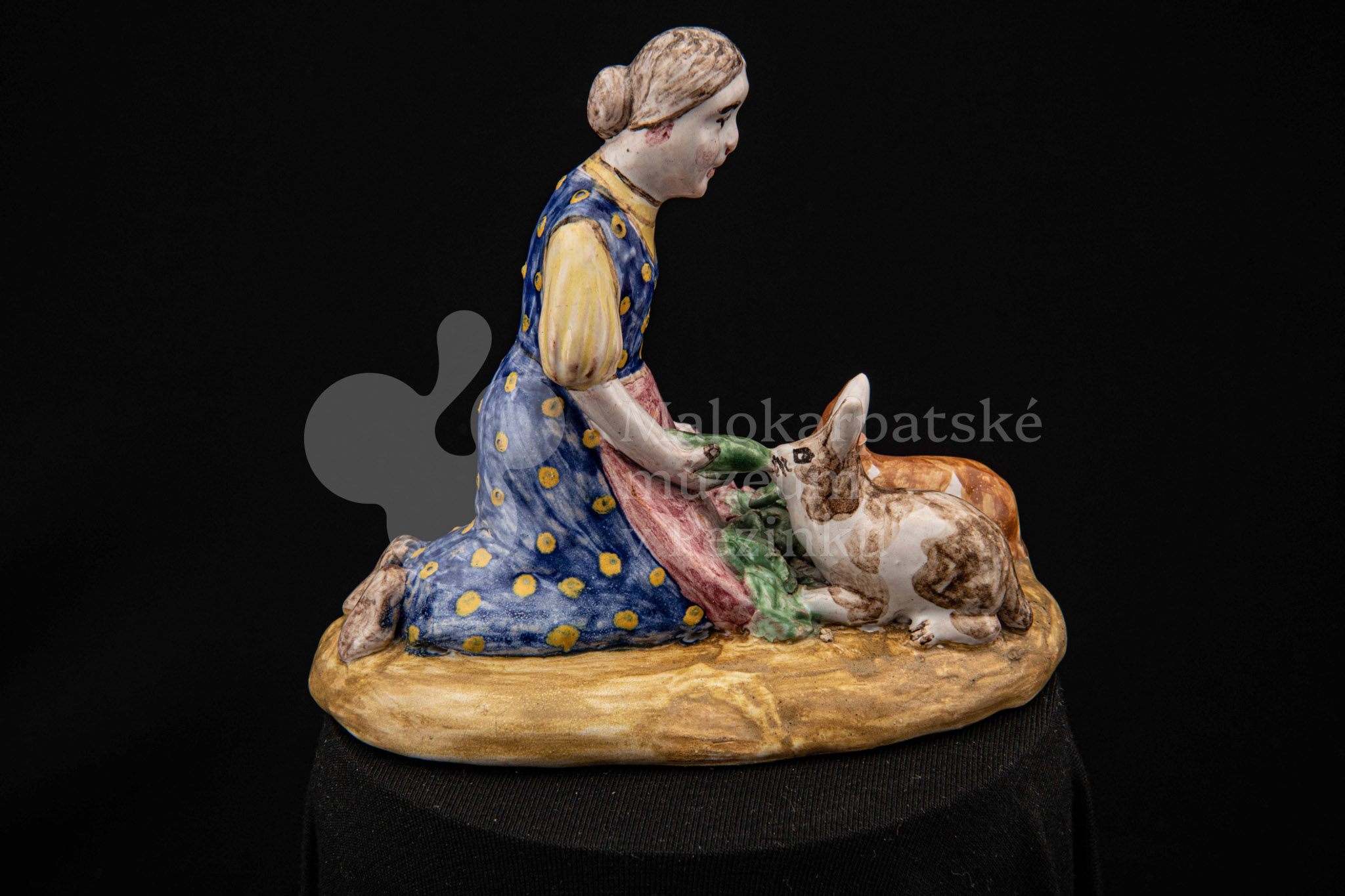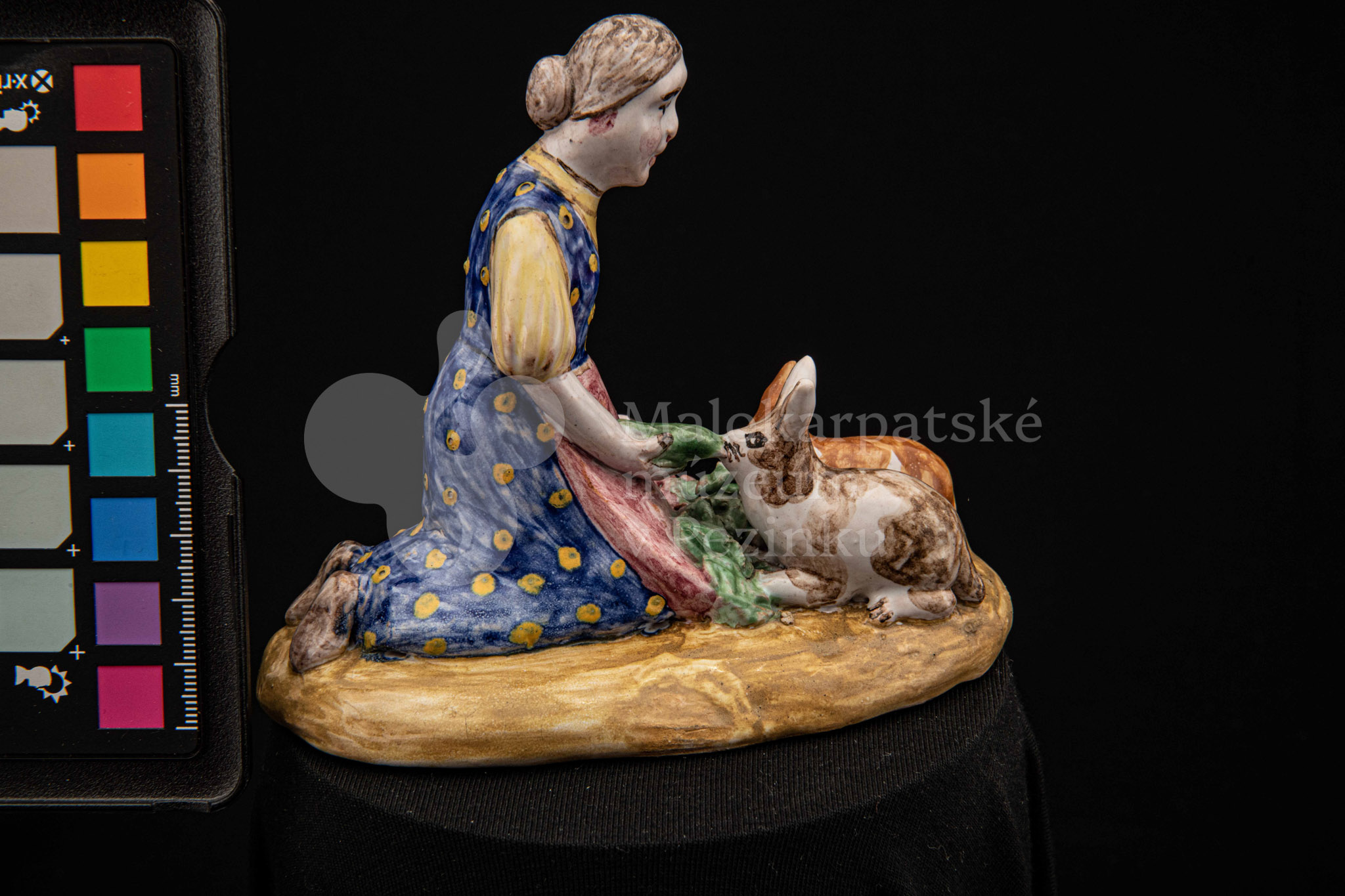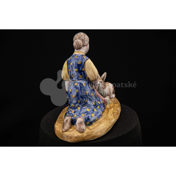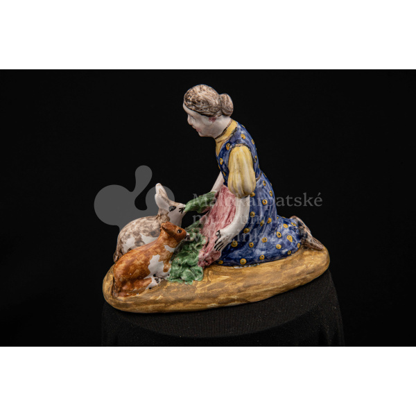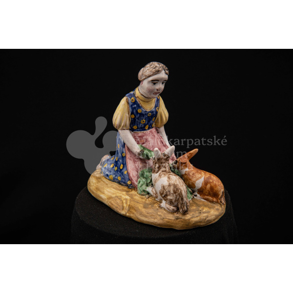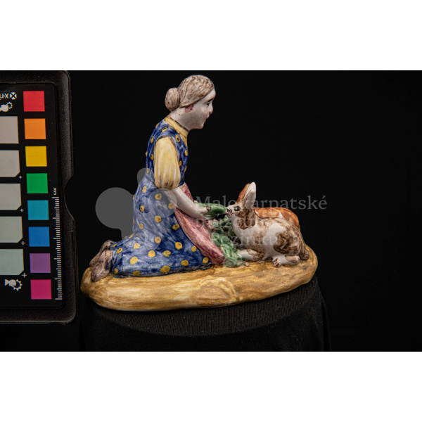 Plastika fajansová Dievča so zajacmi, na oválnom hnedom podstavci kľačí dievča, prostovlasé, s uzlom vlasov vzadu. Z červenej zástery kŕmi zelenými listami dvoch zajacov, mangánovobieleho a ryšavobieleho. Blúzu má bledožltú, sukňu sýtomodrú so žltým dekorom. Značenie M.K. – autorka pravdepodobne Magda Kostková