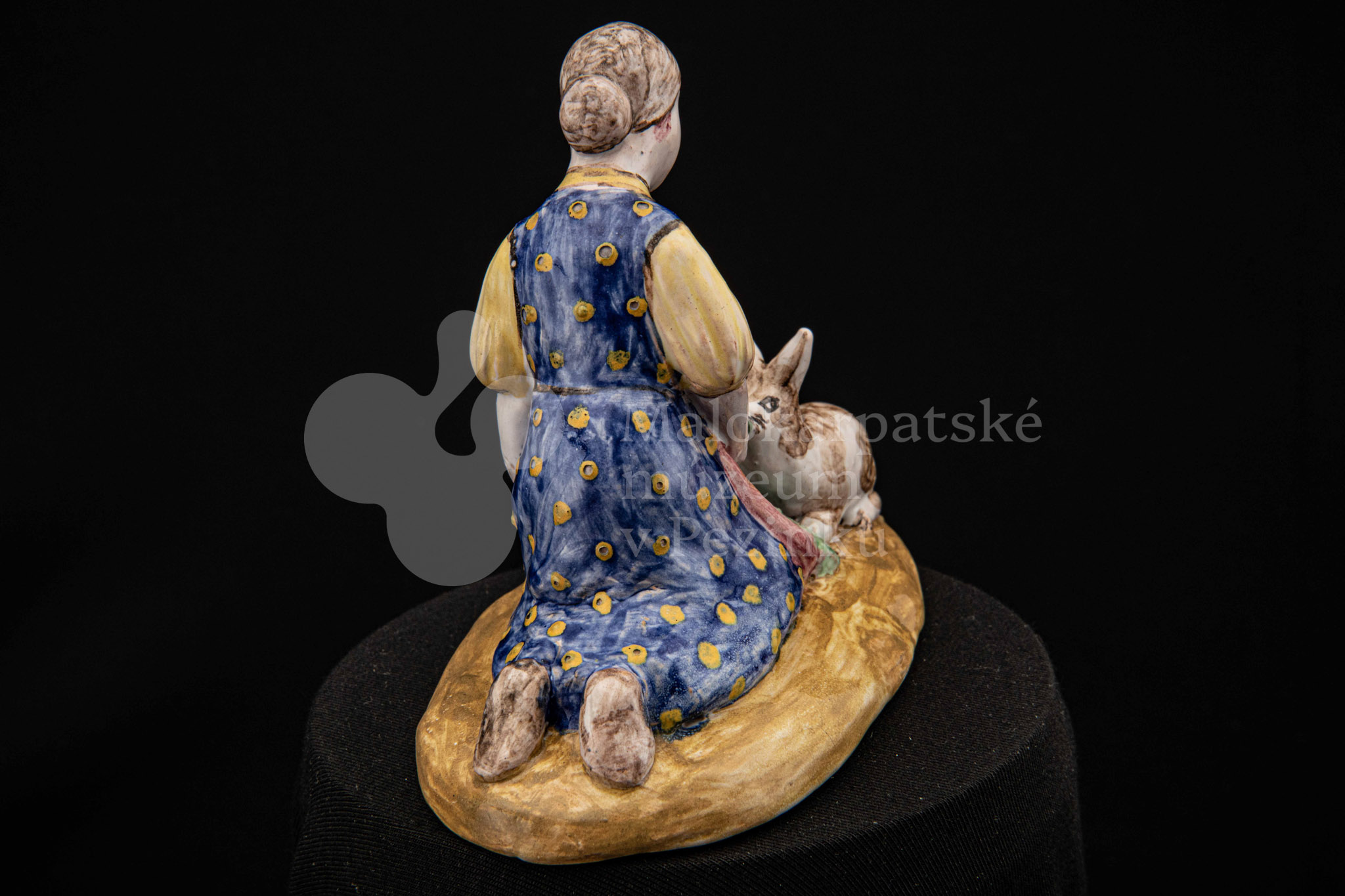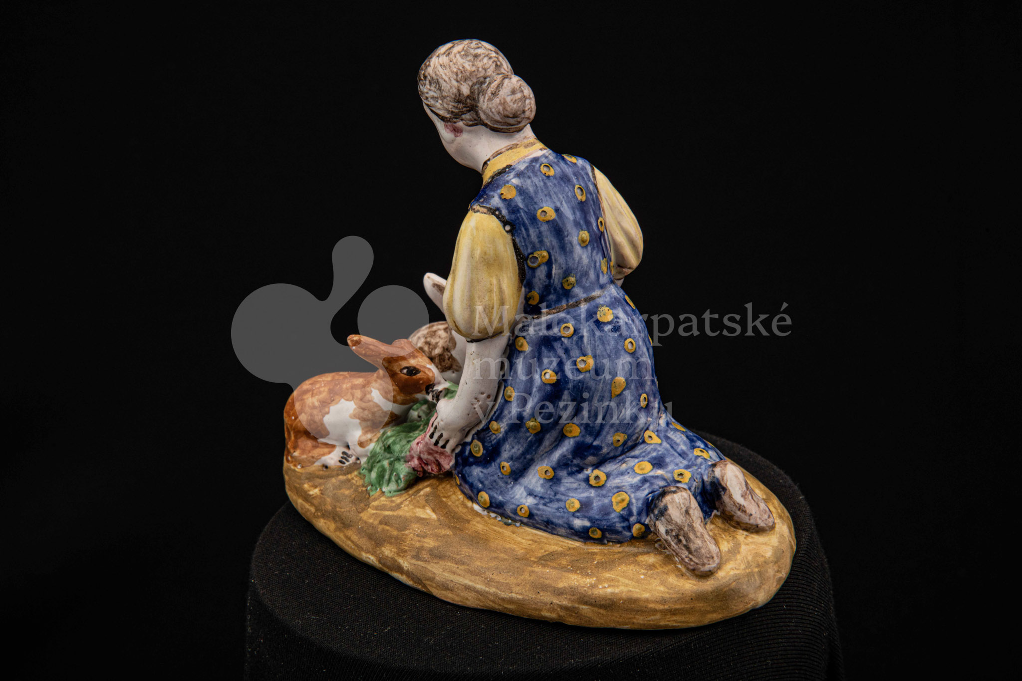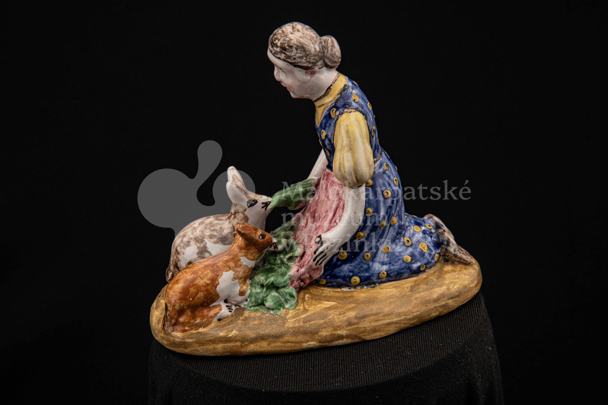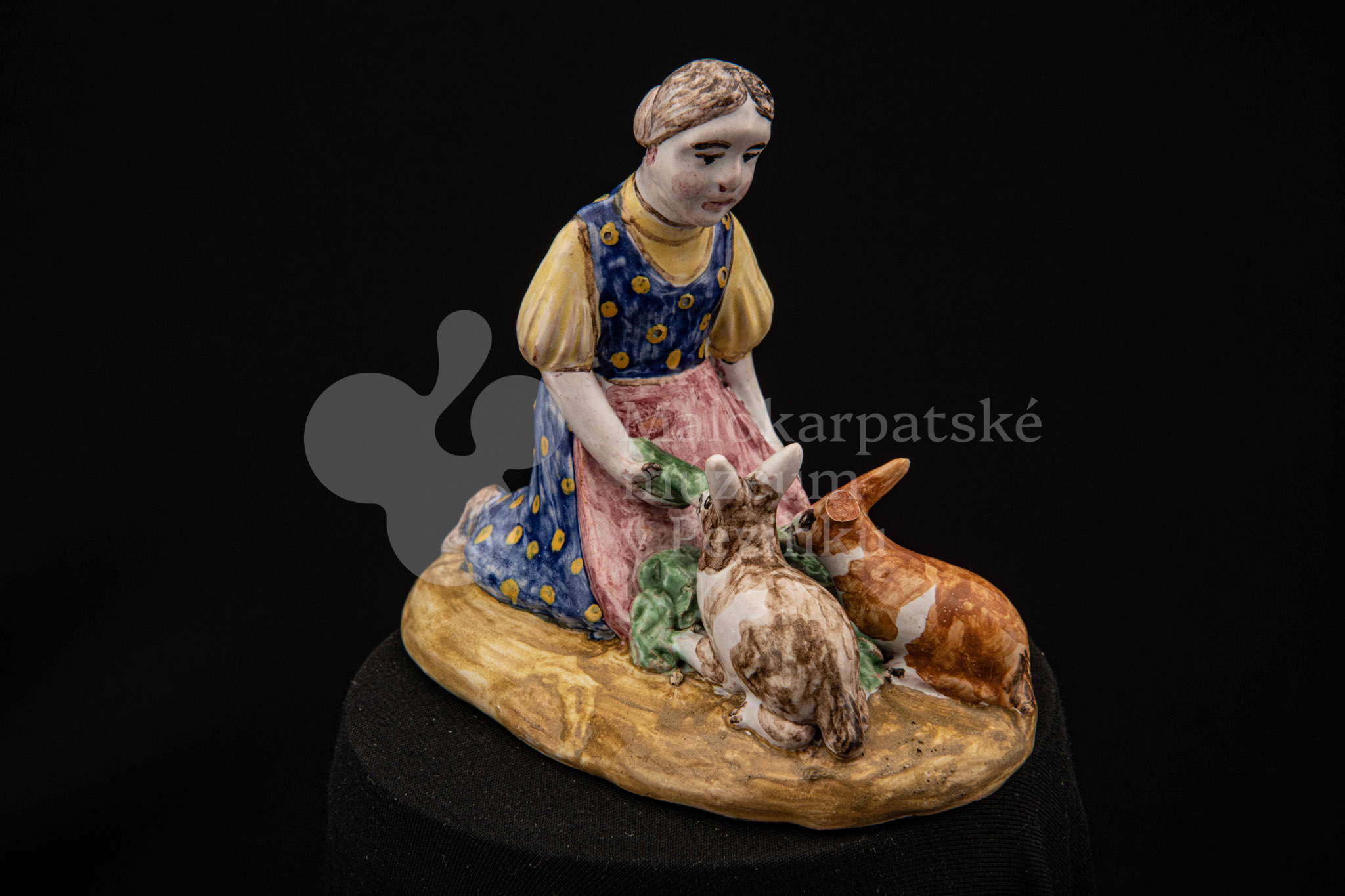 Plastika fajansová Dievča so zajacmi, na oválnom hnedom podstavci kľačí dievča, prostovlasé, s uzlom vlasov vzadu. Z červenej zástery kŕmi zelenými listami dvoch zajacov, mangánovobieleho a ryšavobieleho. Blúzu má bledožltú, sukňu sýtomodrú so žltým dekorom. Značenie M.K. – autorka pravdepodobne Magda Kostková