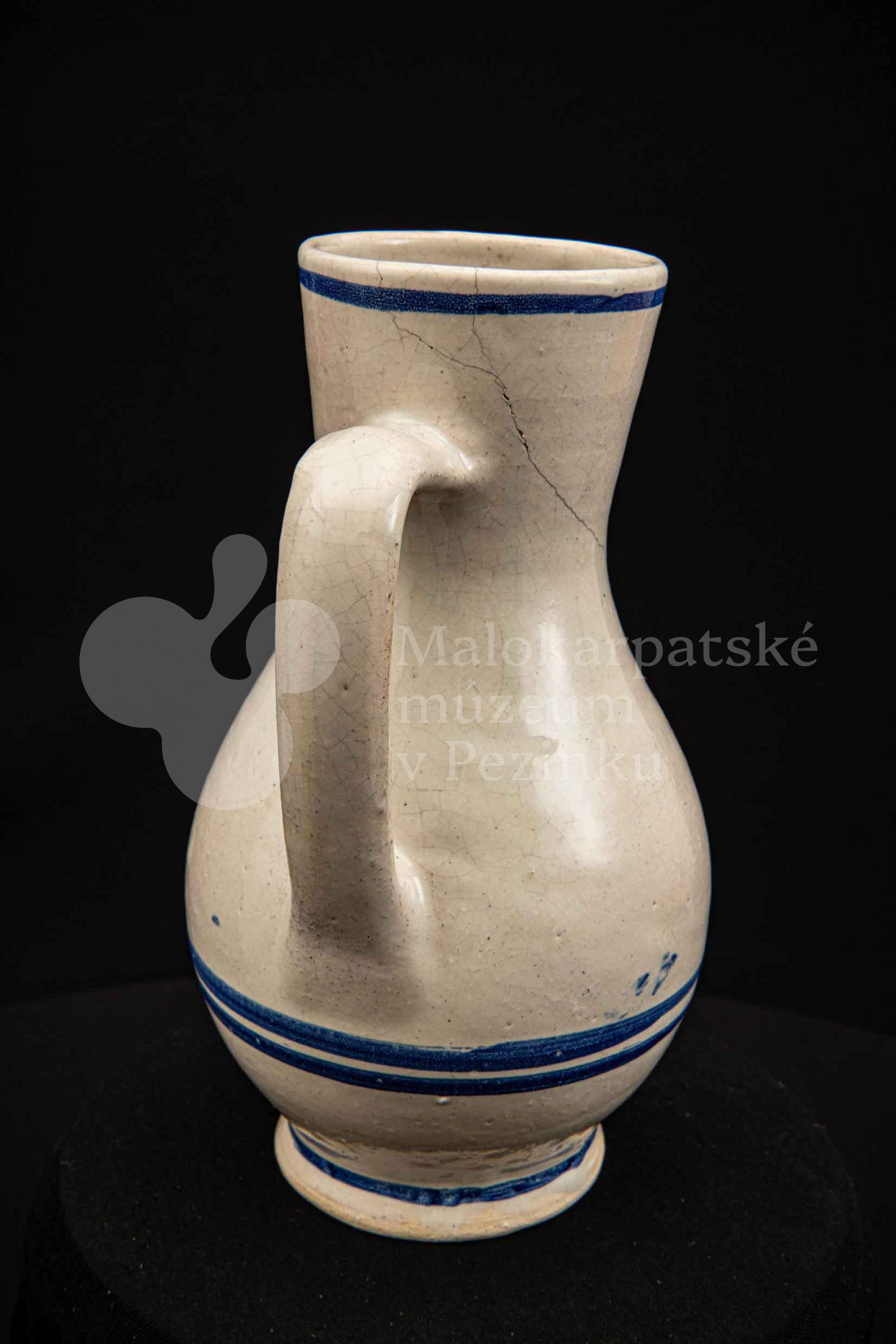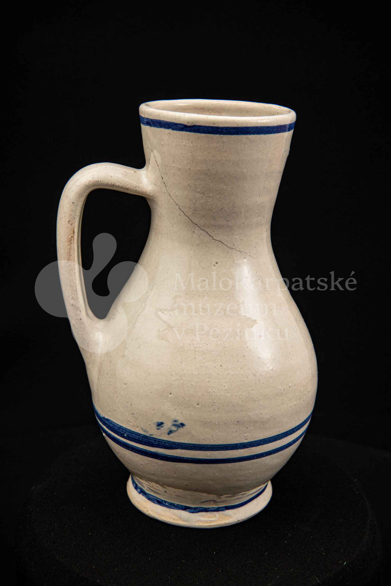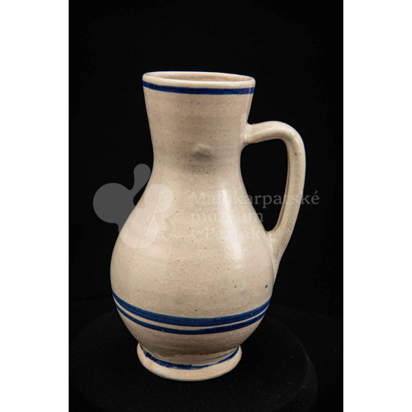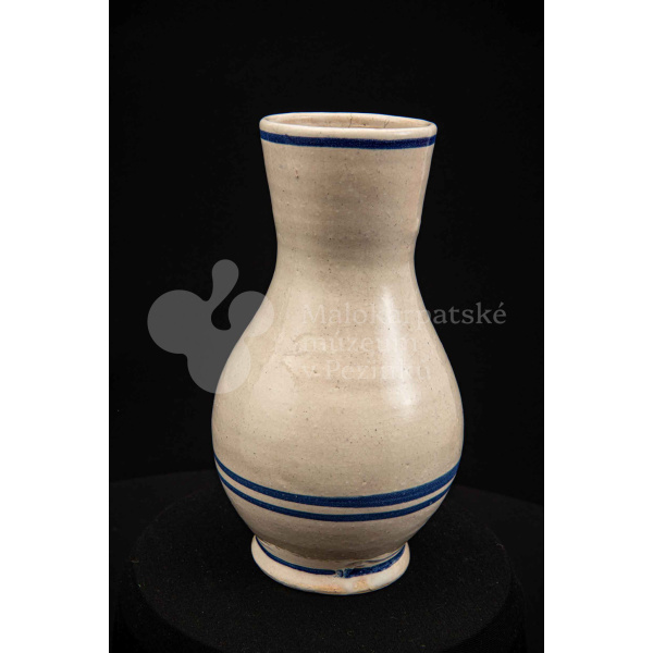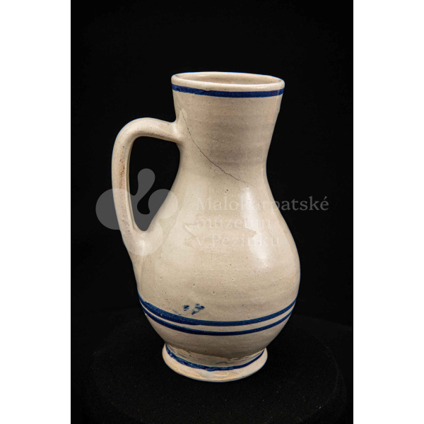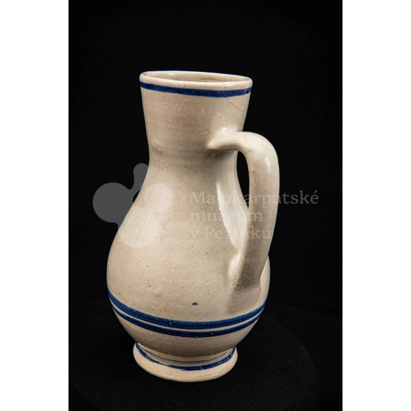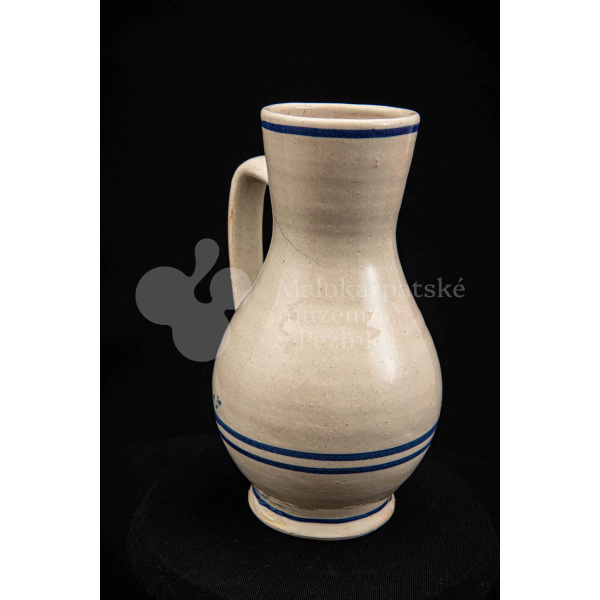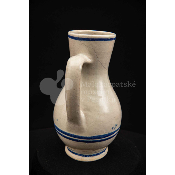 Džbán fajansový, po celej ploche bieloglazovaný s modrými pruhmi. Glazúra je na viacerých miestach poškodená. Pochádza z 18. storočia.