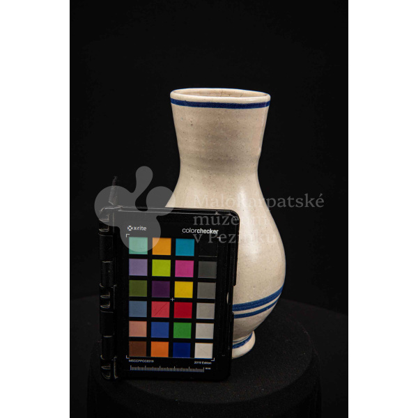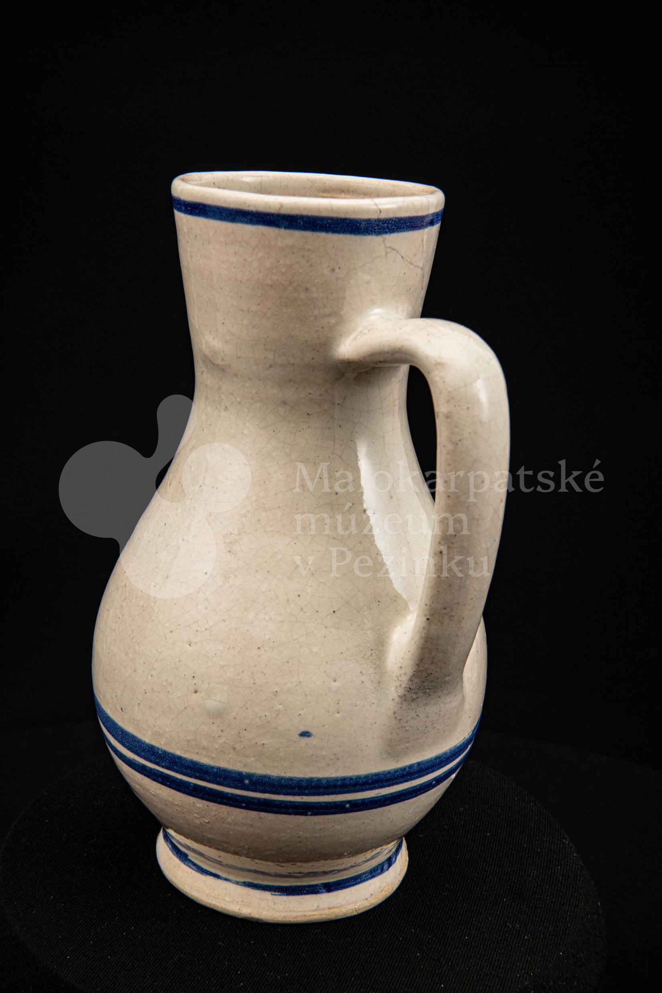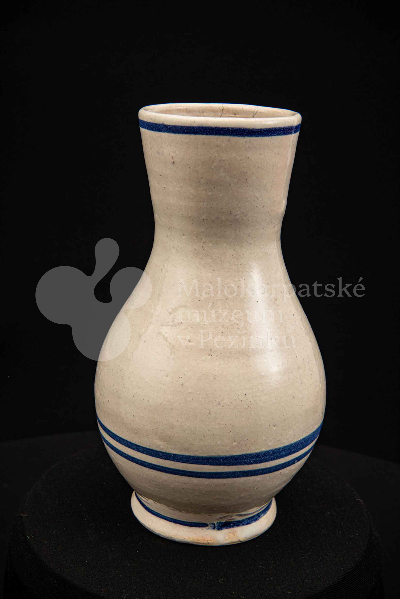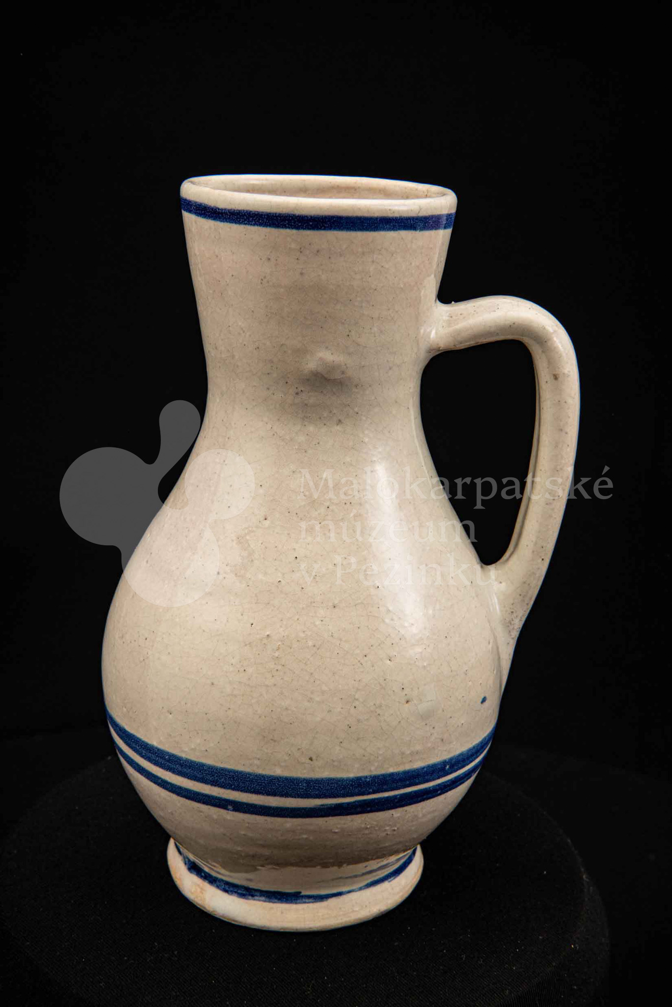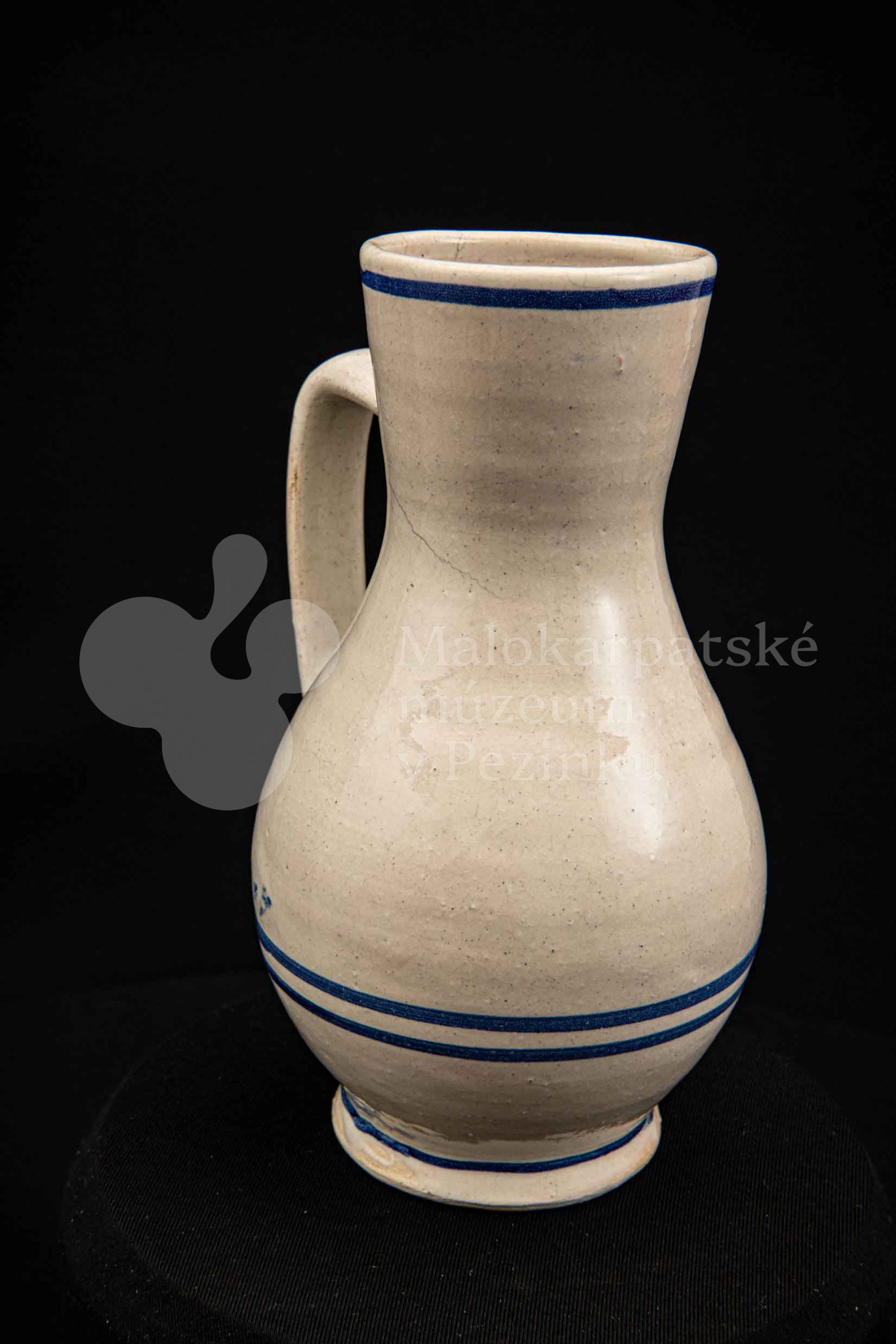 Džbán fajansový, po celej ploche bieloglazovaný s modrými pruhmi. Glazúra je na viacerých miestach poškodená. Pochádza z 18. storočia.