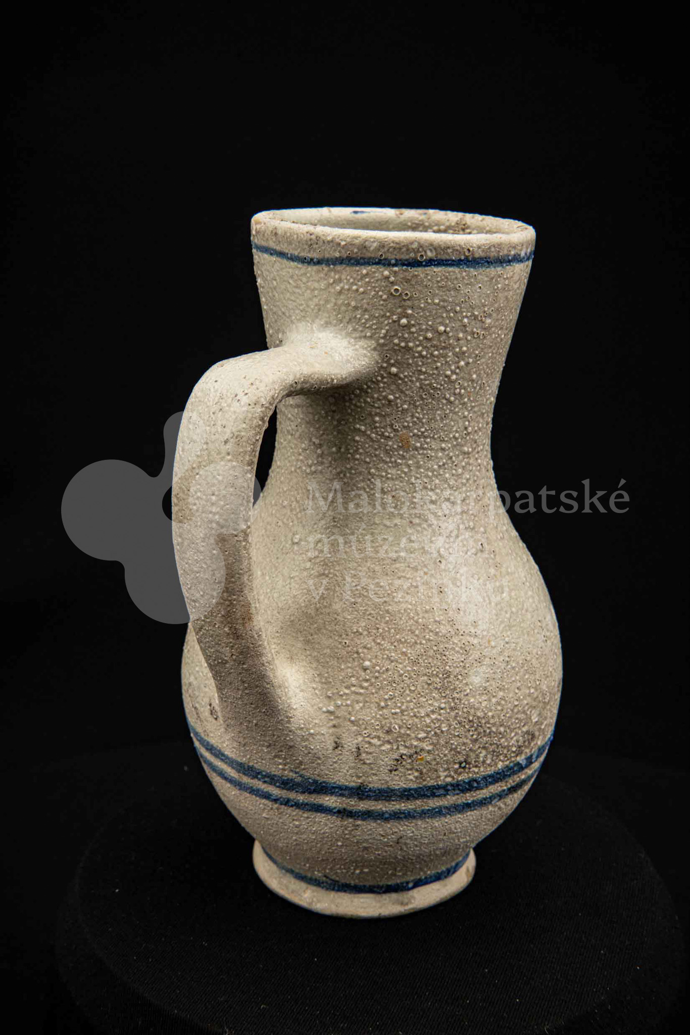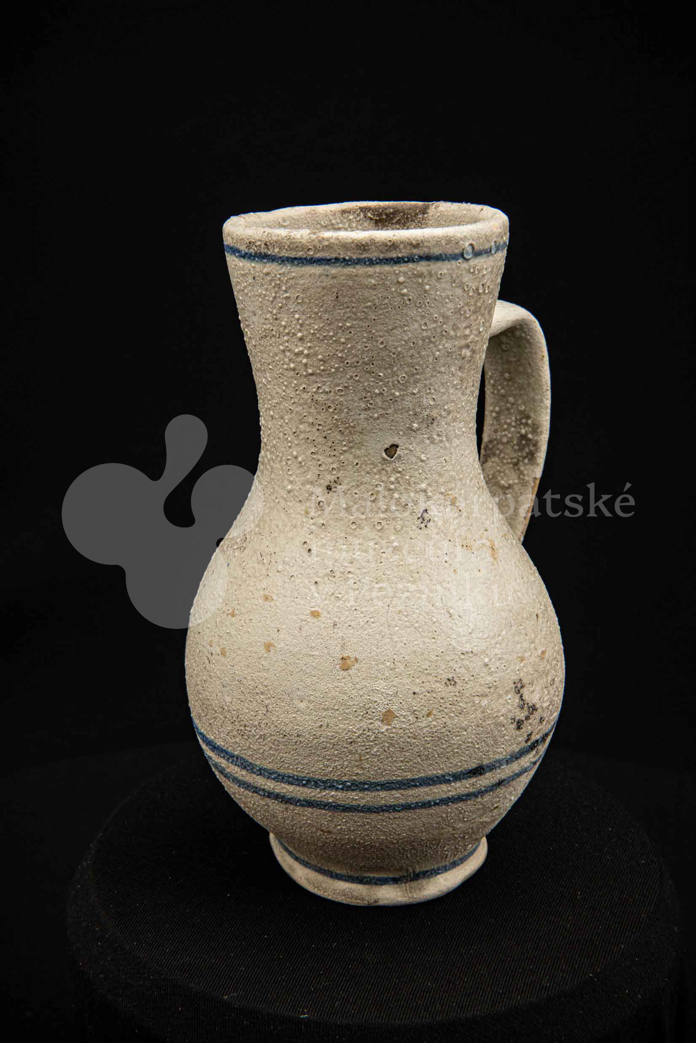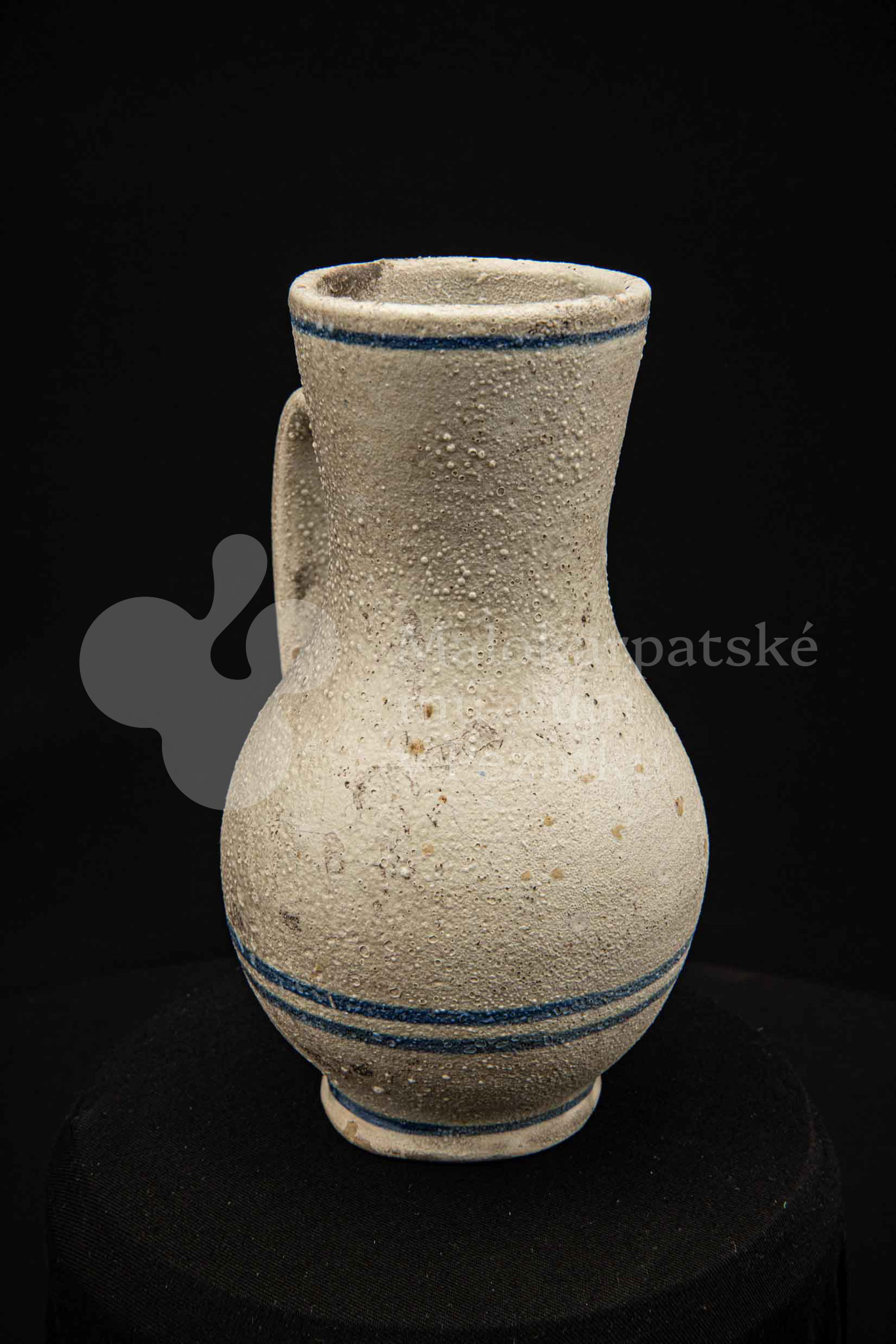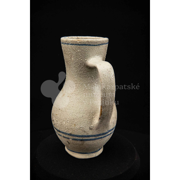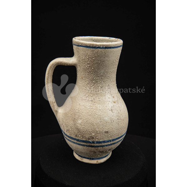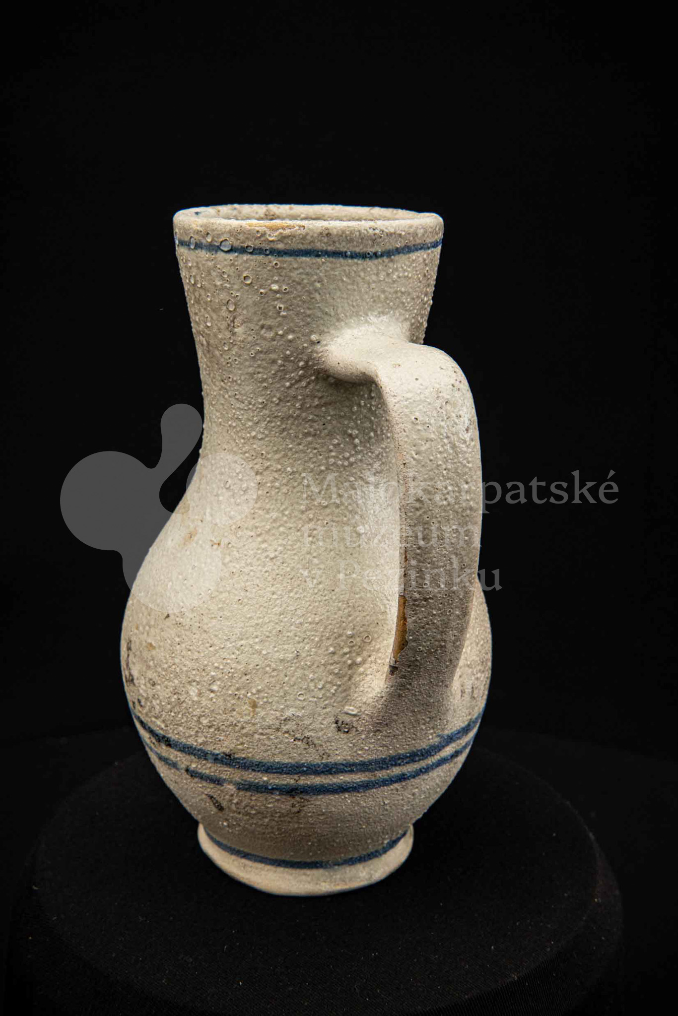 Džbán fajansový, po celej ploche bieloglazovaný s modrými pruhmi. Glazúra je na viacerých miestach poškodená. Pochádza z 18. storočia.