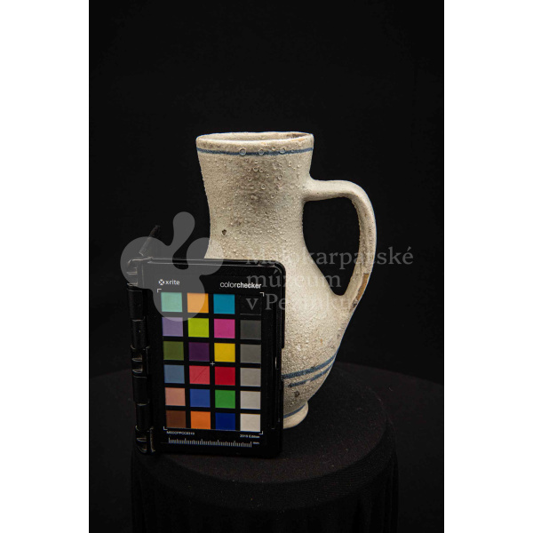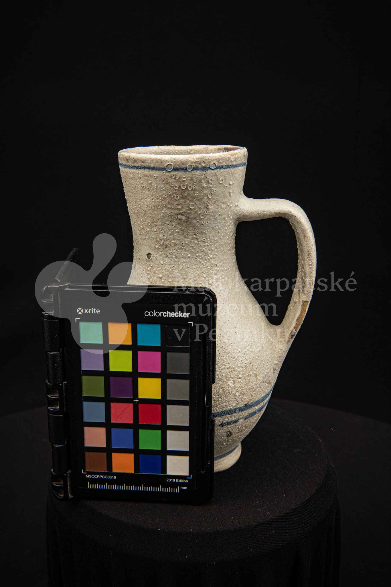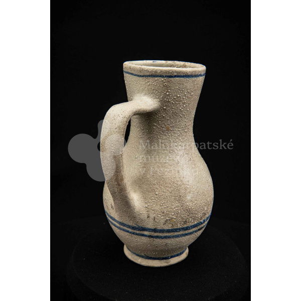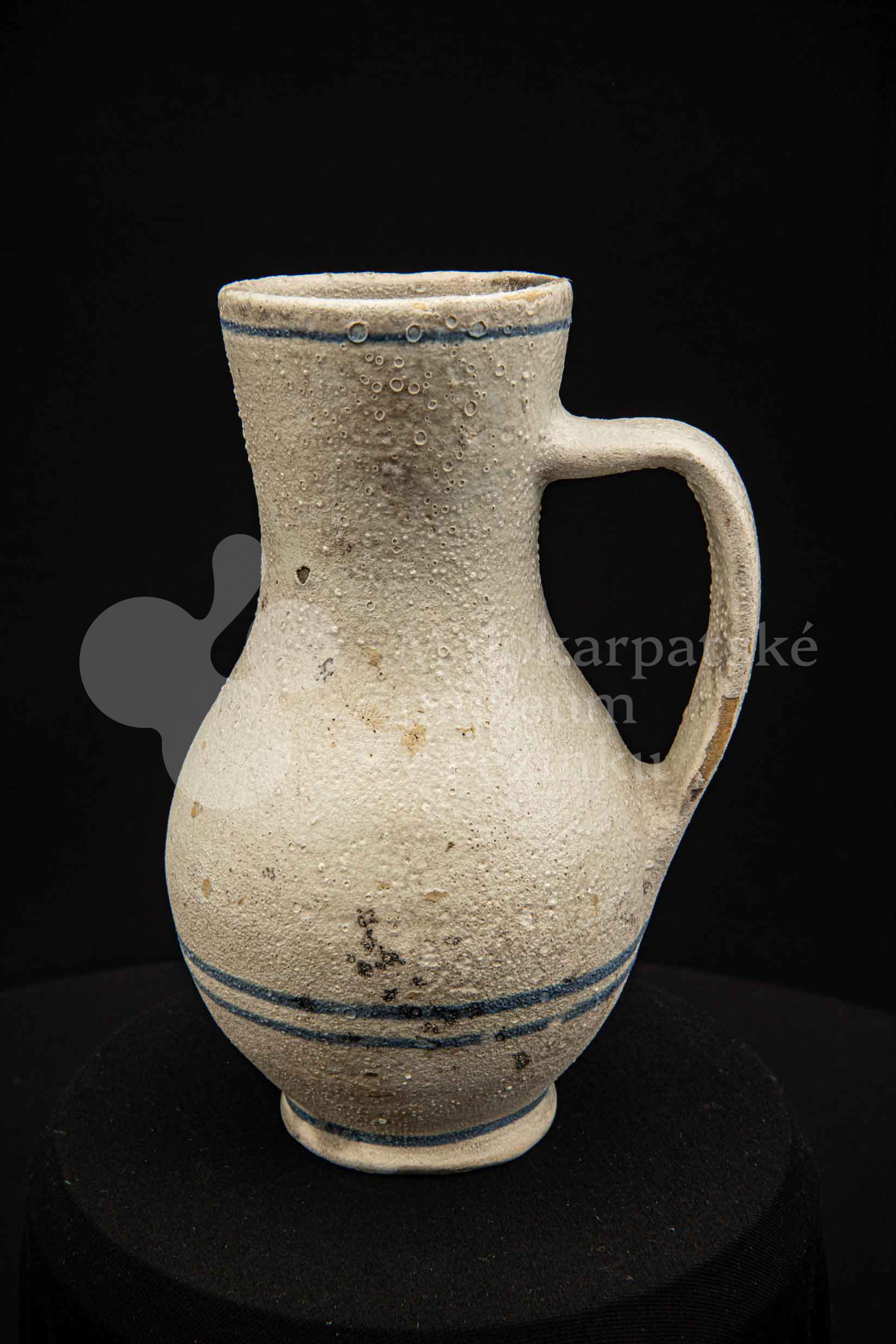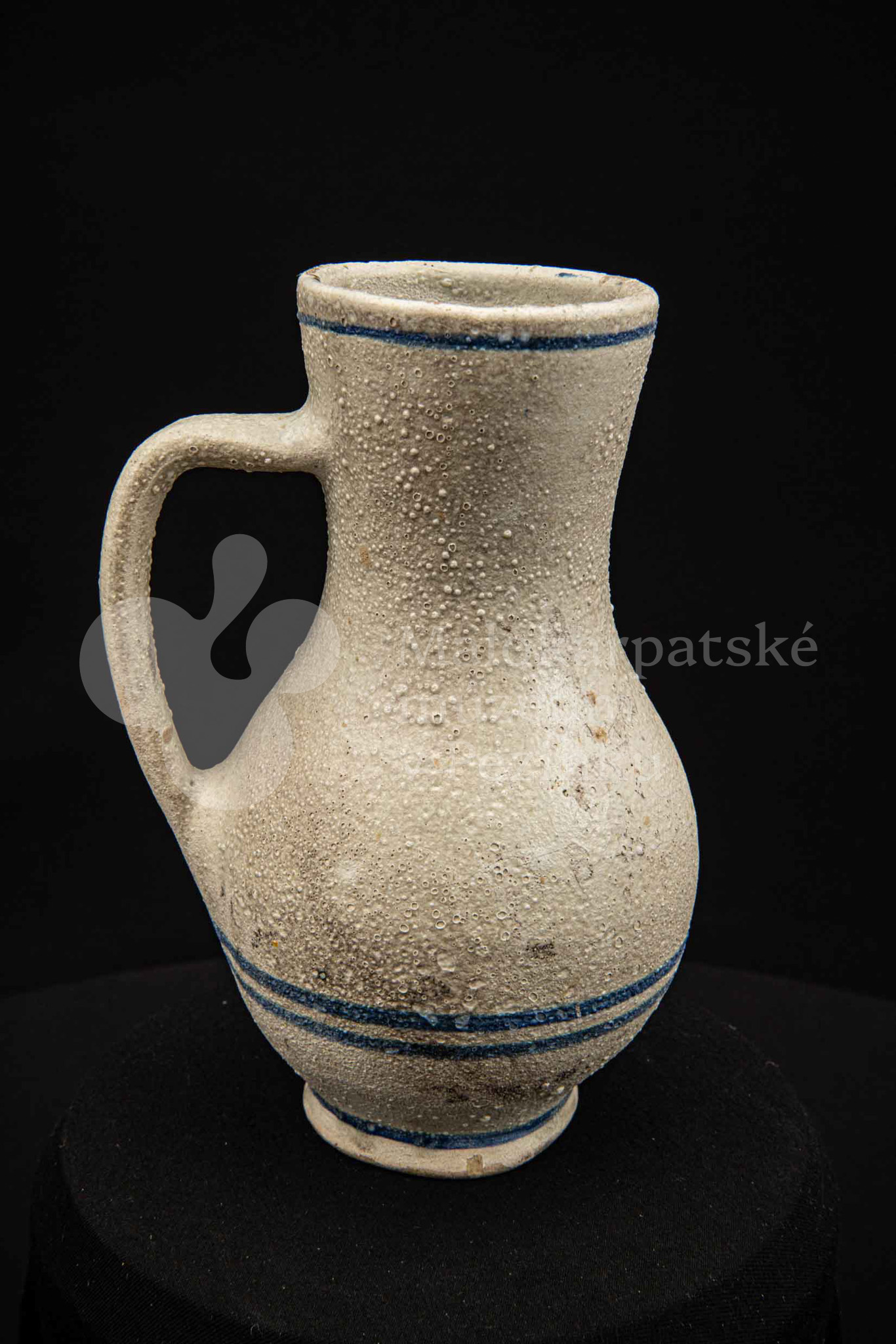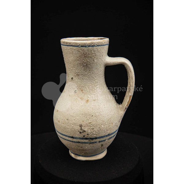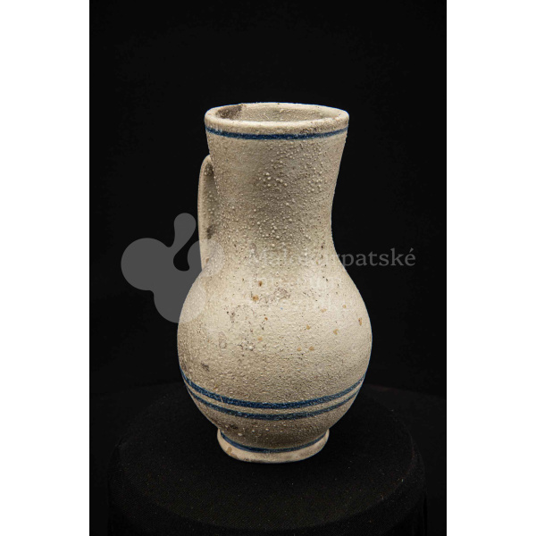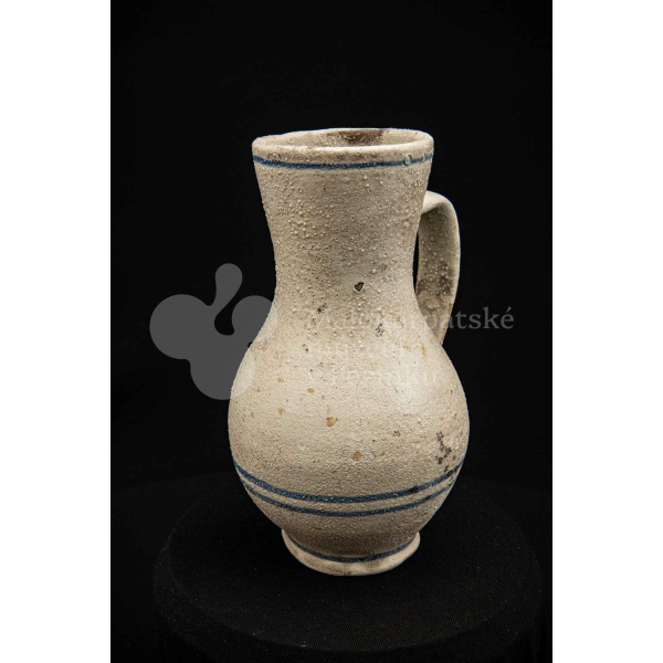Džbán fajansový, po celej ploche bieloglazovaný s modrými pruhmi. Glazúra je na viacerých miestach poškodená. Pochádza z 18. storočia.