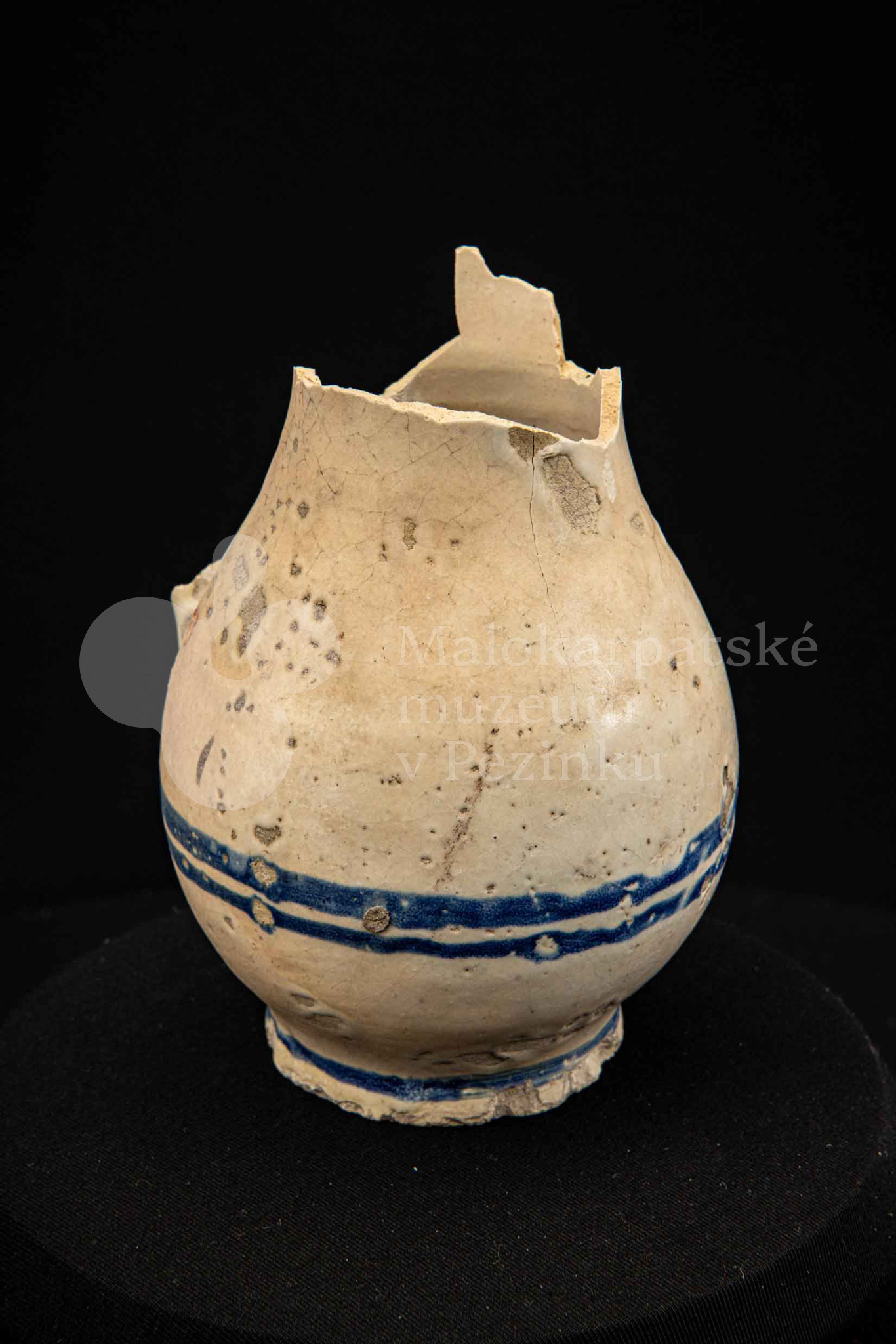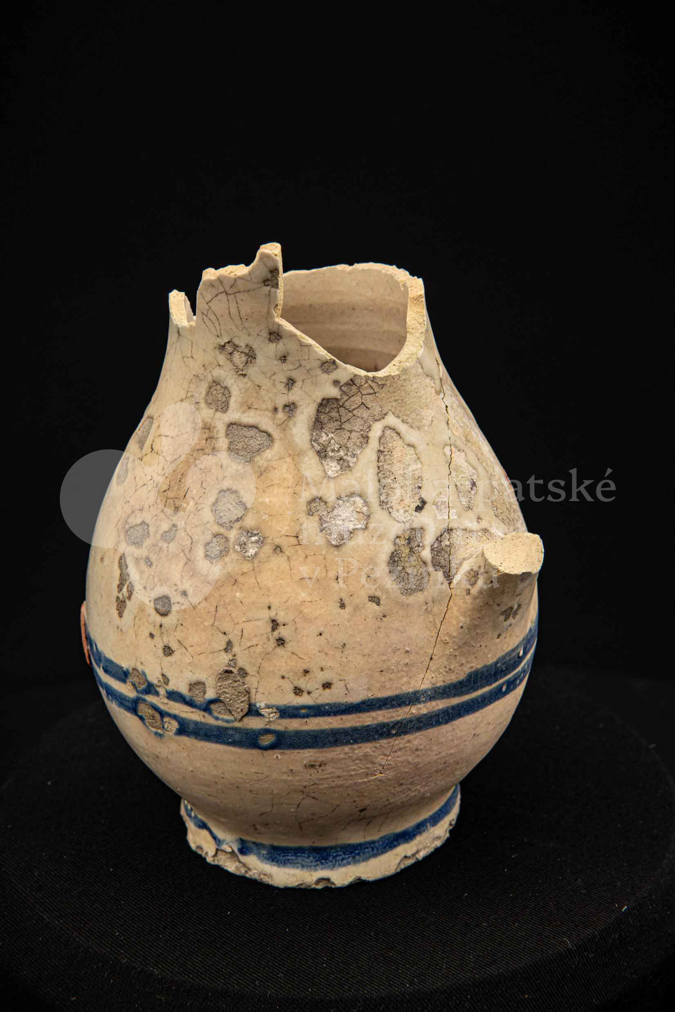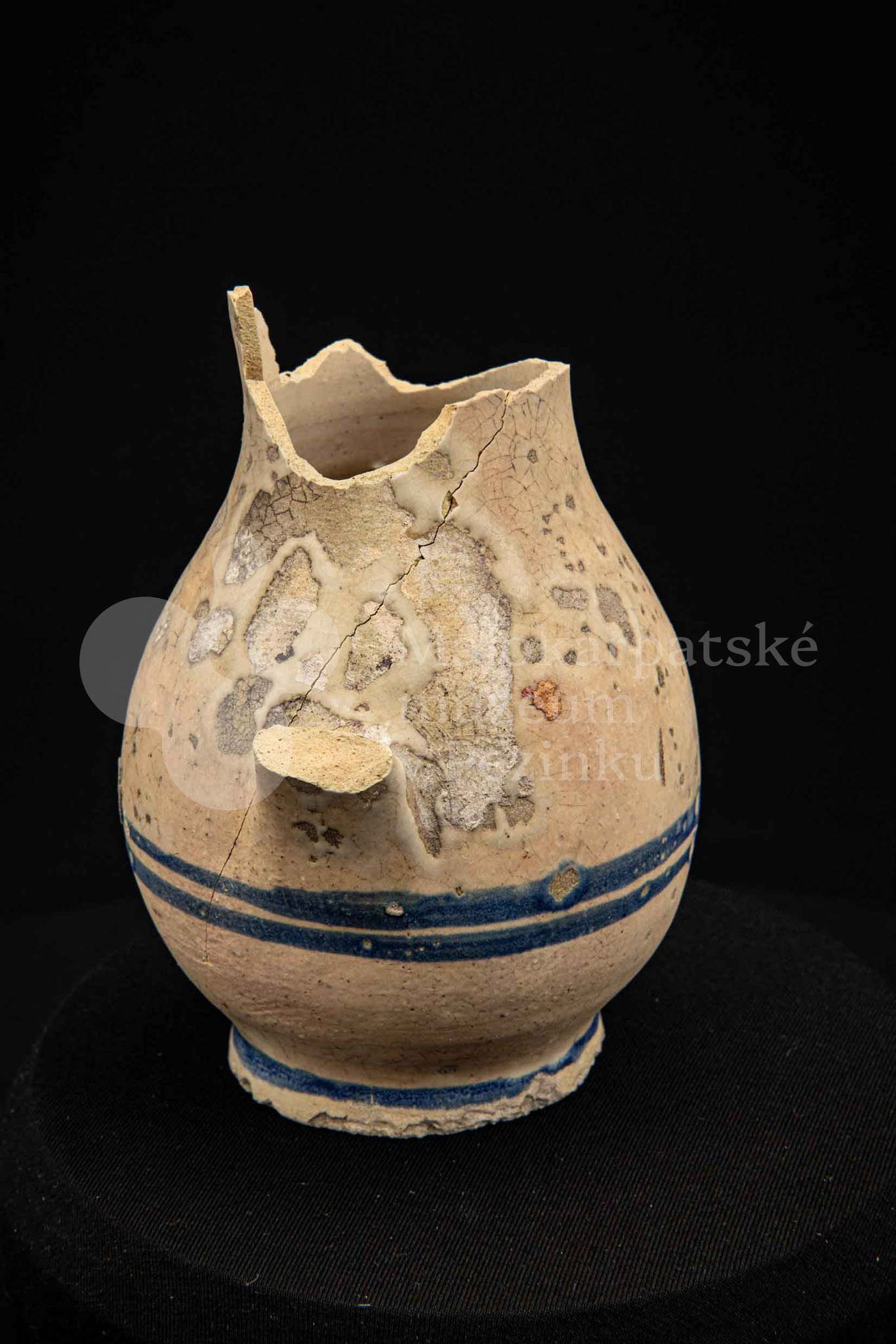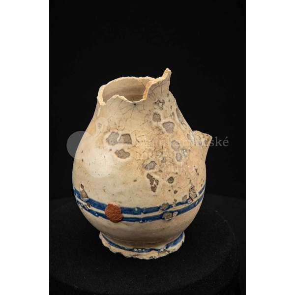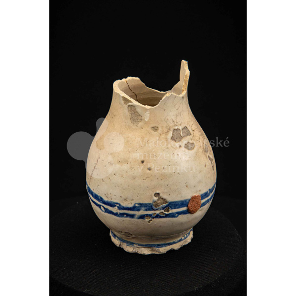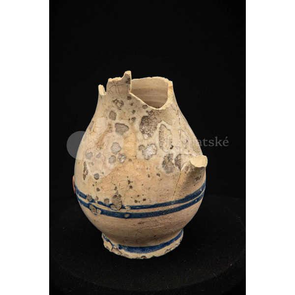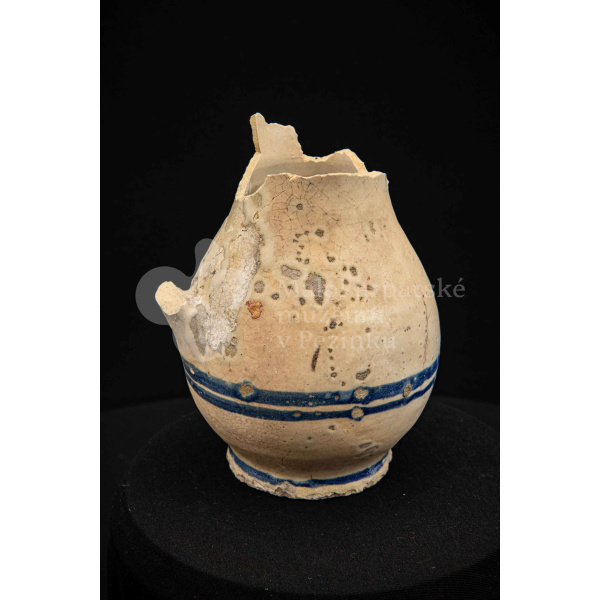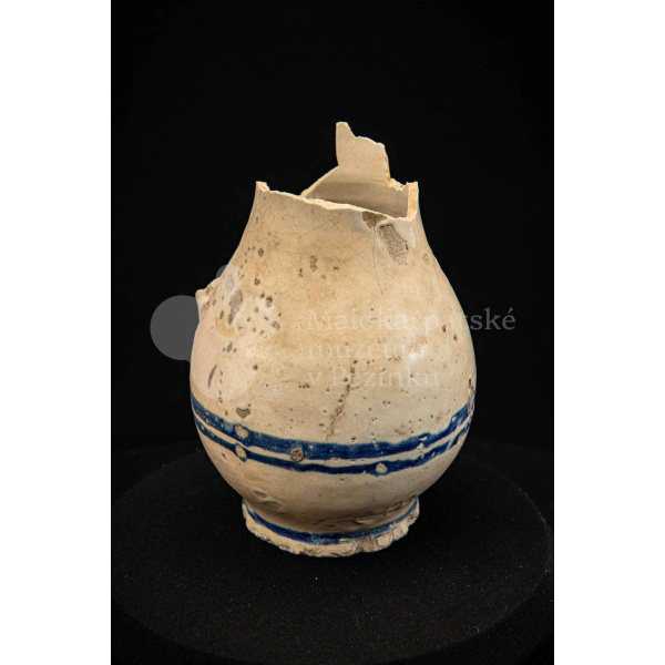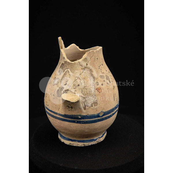Džbán fajansový, po celej ploche bieloglazovaný s modrými pruhmi. Glazúra je na viacerých miestach poškodená. Pochádza z 18. storočia.