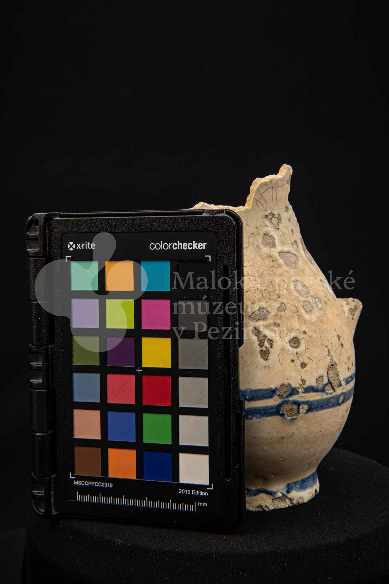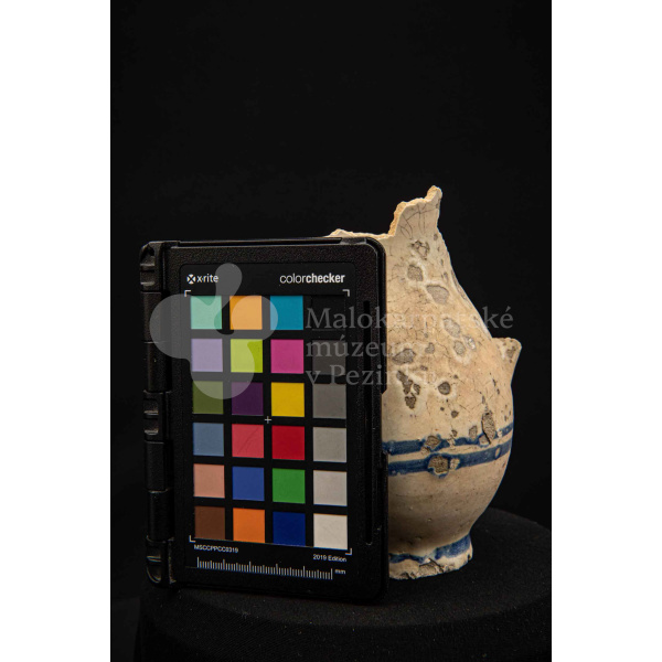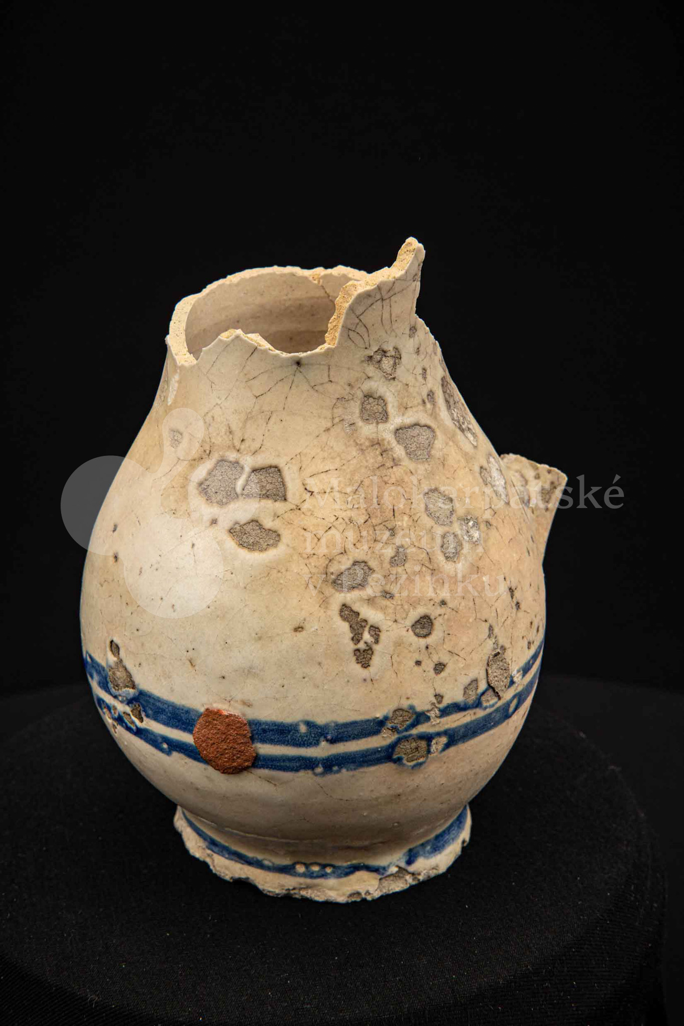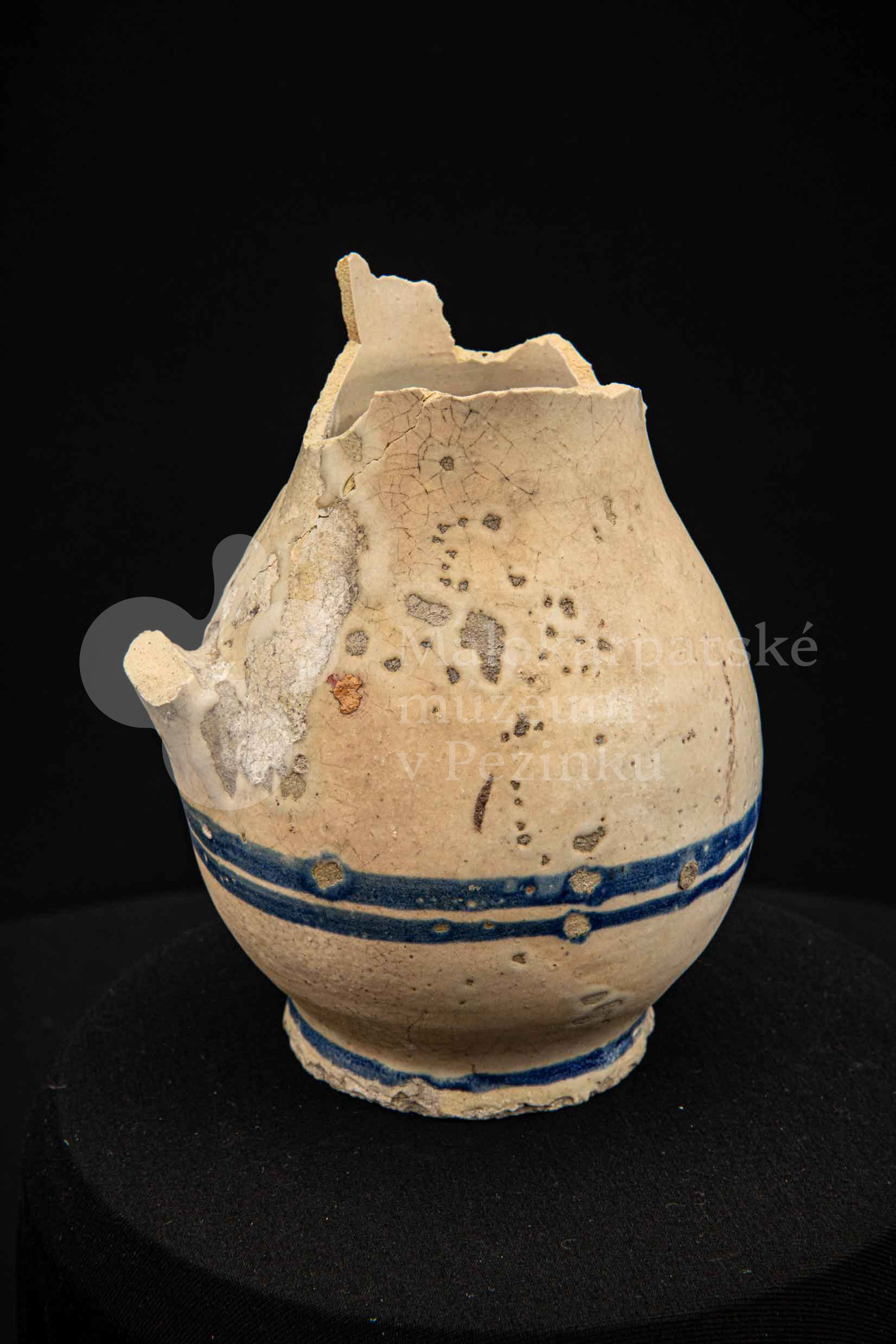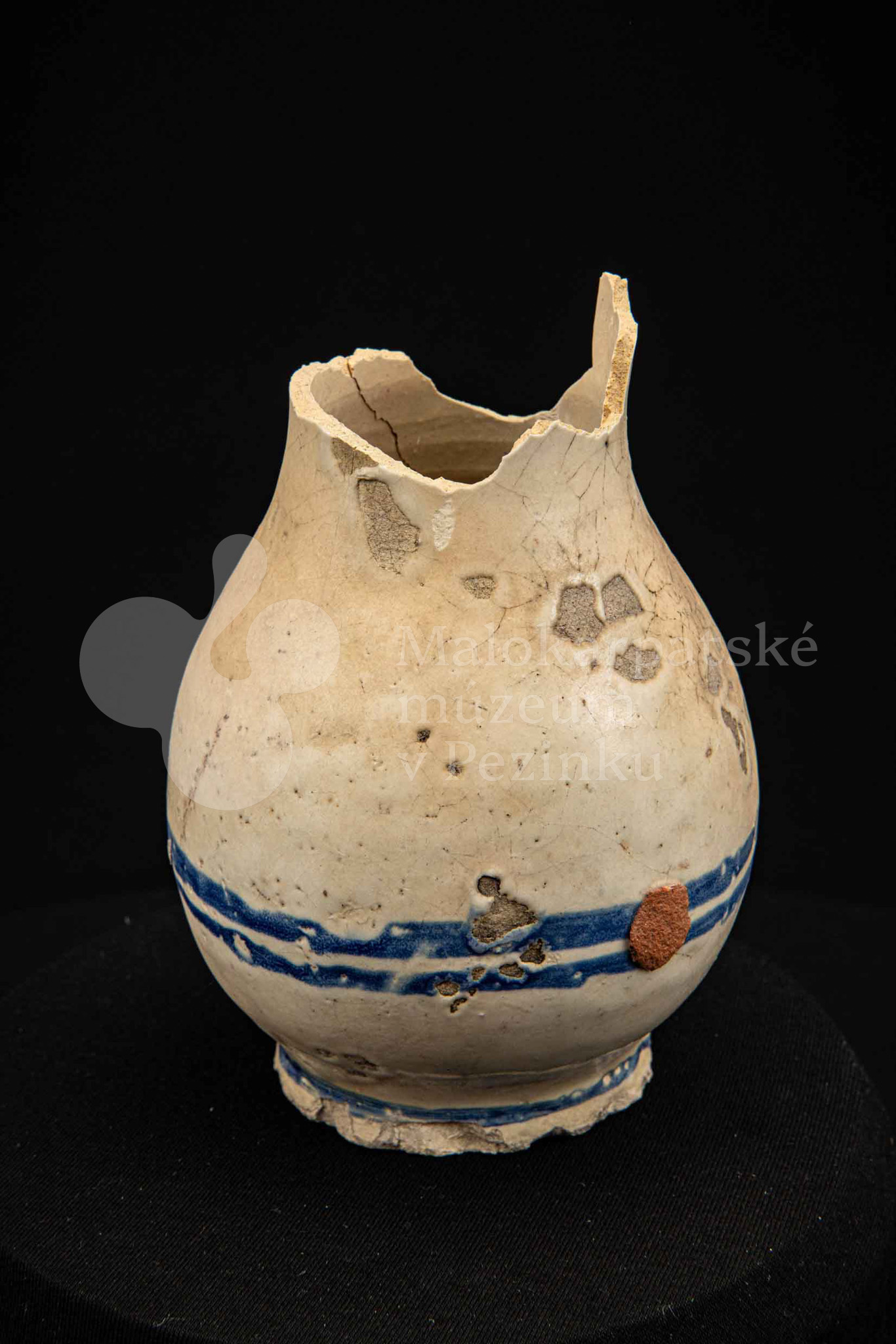 Džbán fajansový, po celej ploche bieloglazovaný s modrými pruhmi. Glazúra je na viacerých miestach poškodená. Pochádza z 18. storočia.