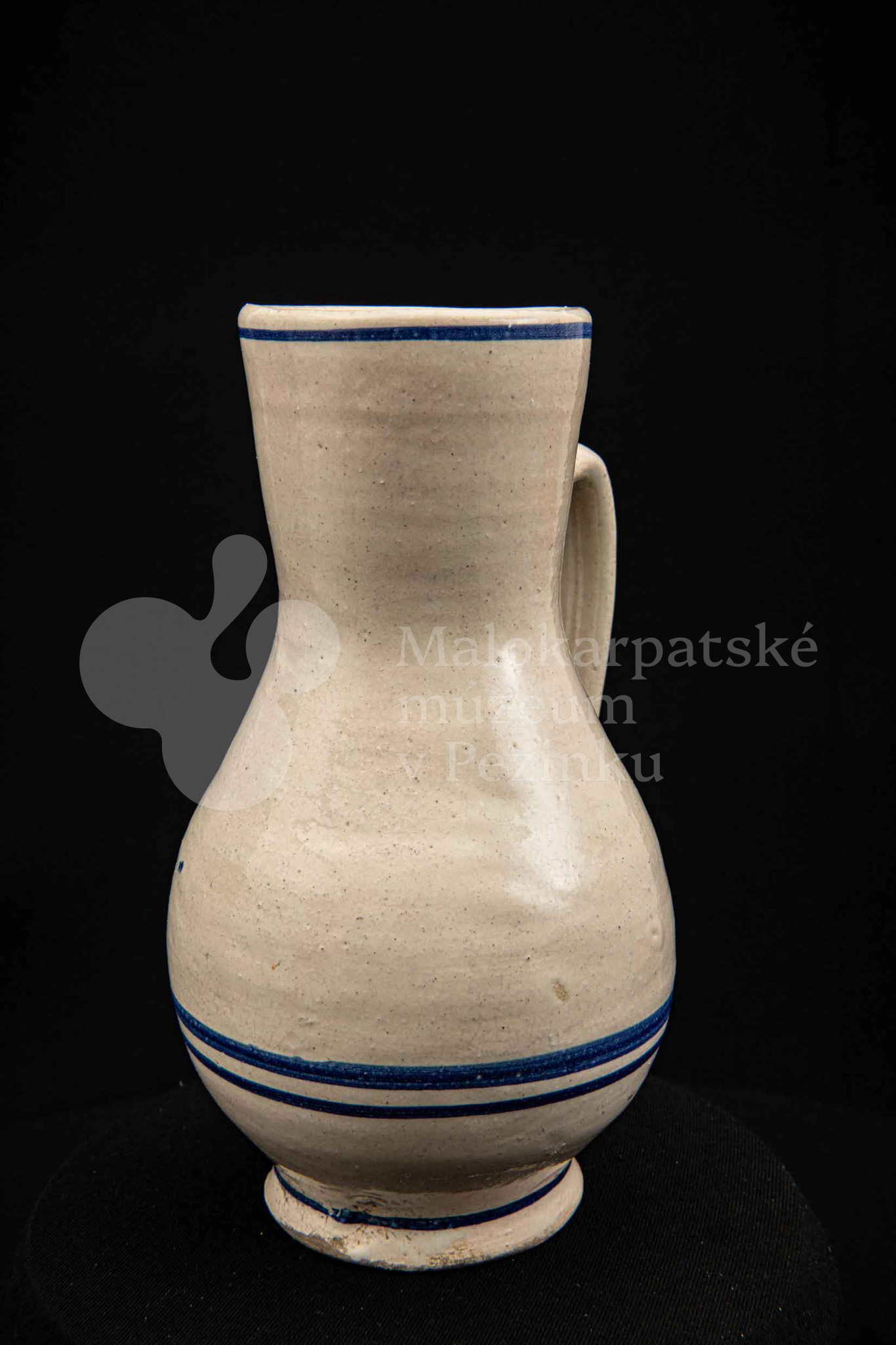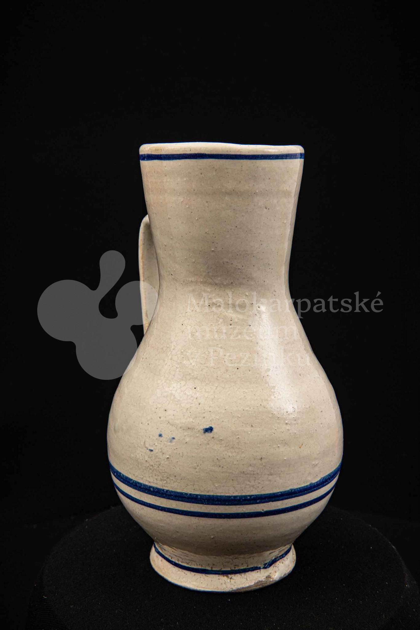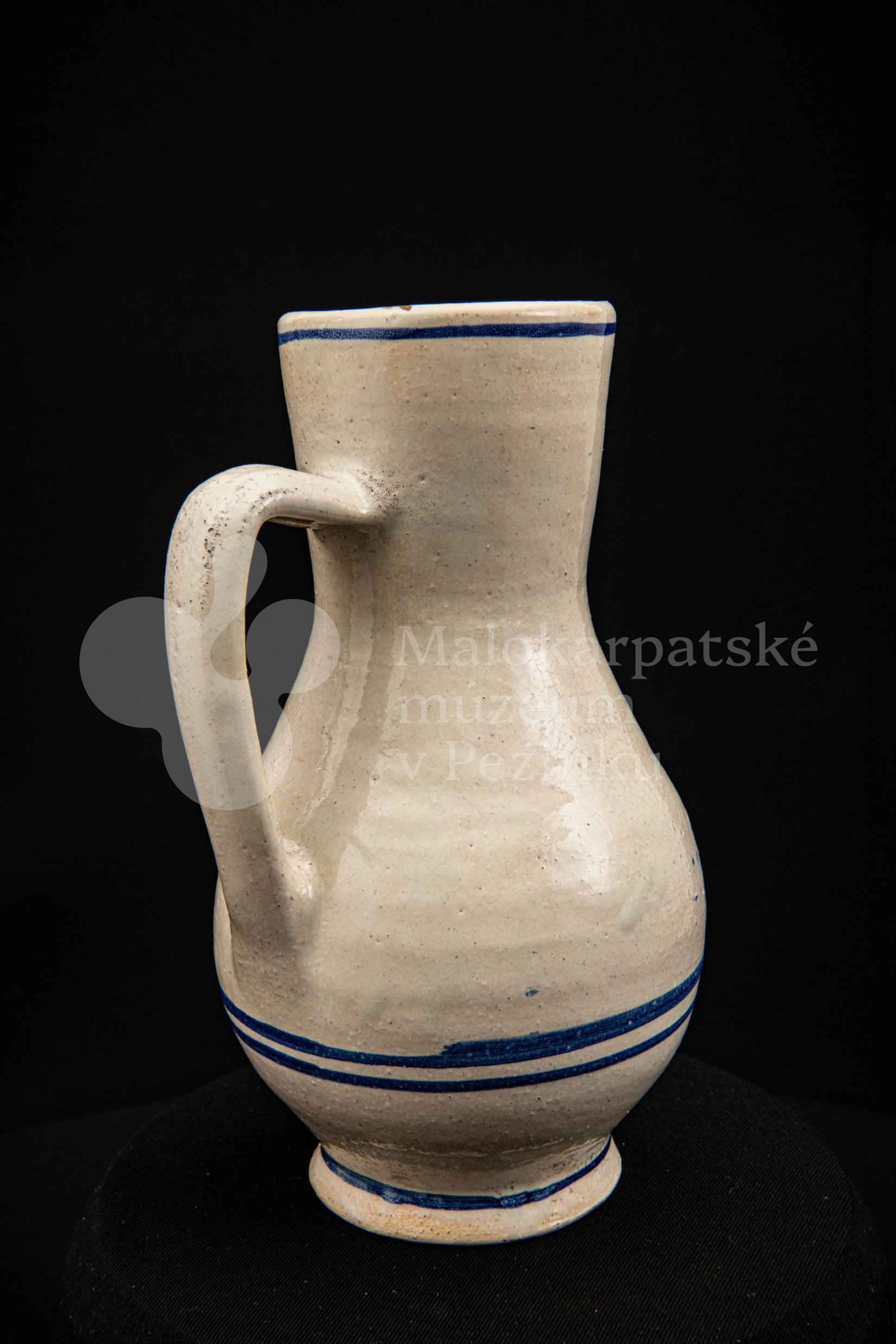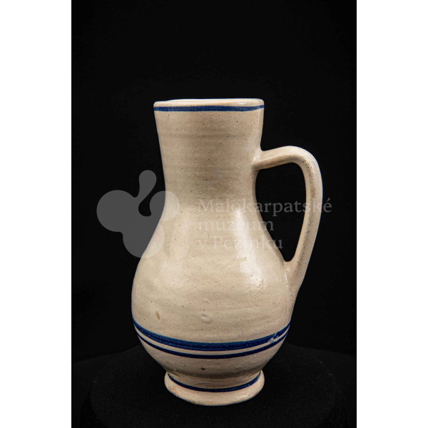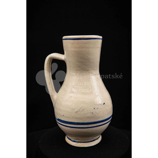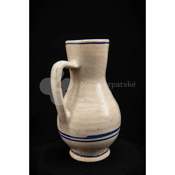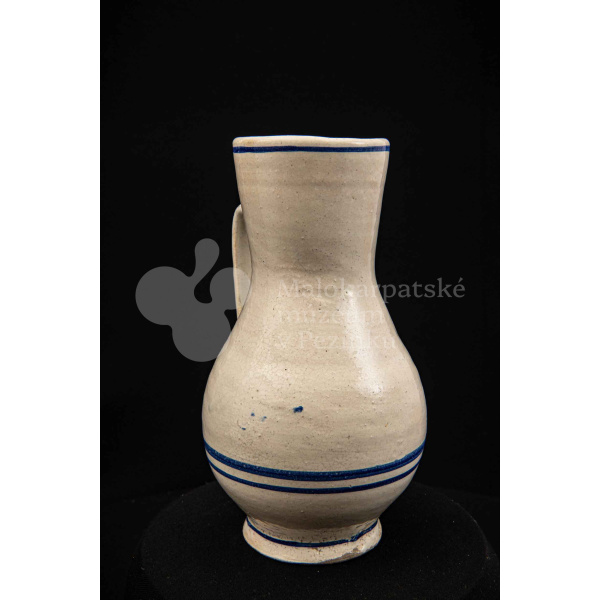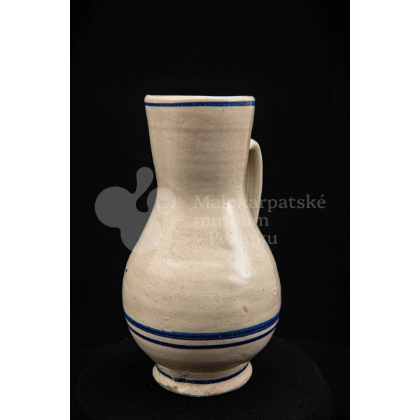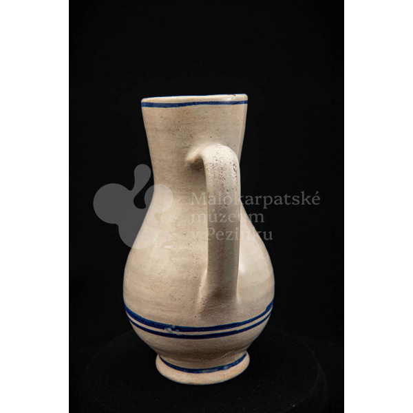 Džbán fajansový, po celej ploche bieloglazovaný s modrými pruhmi. Glazúra je na viacerých miestach poškodená. Pochádza z 18. storočia.