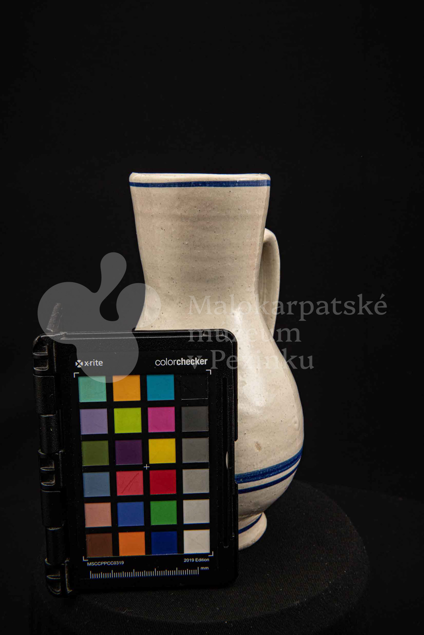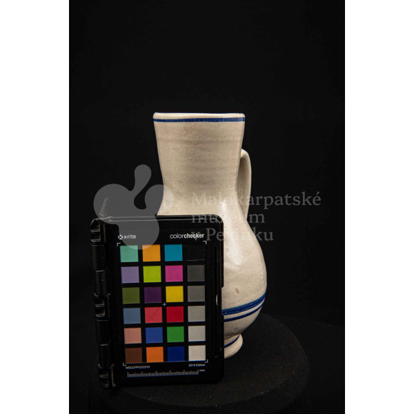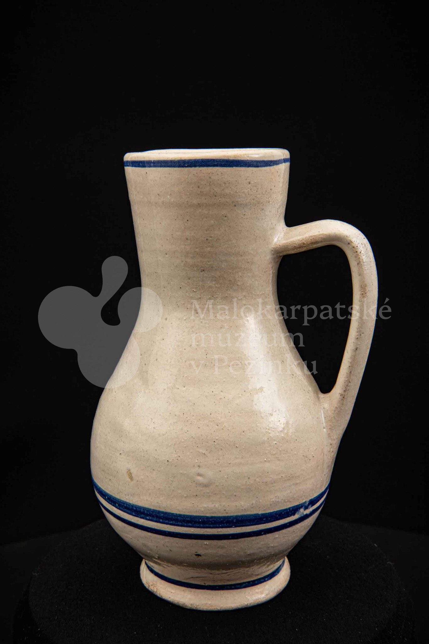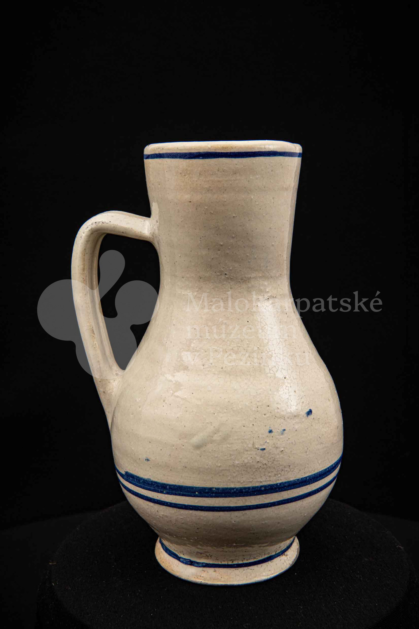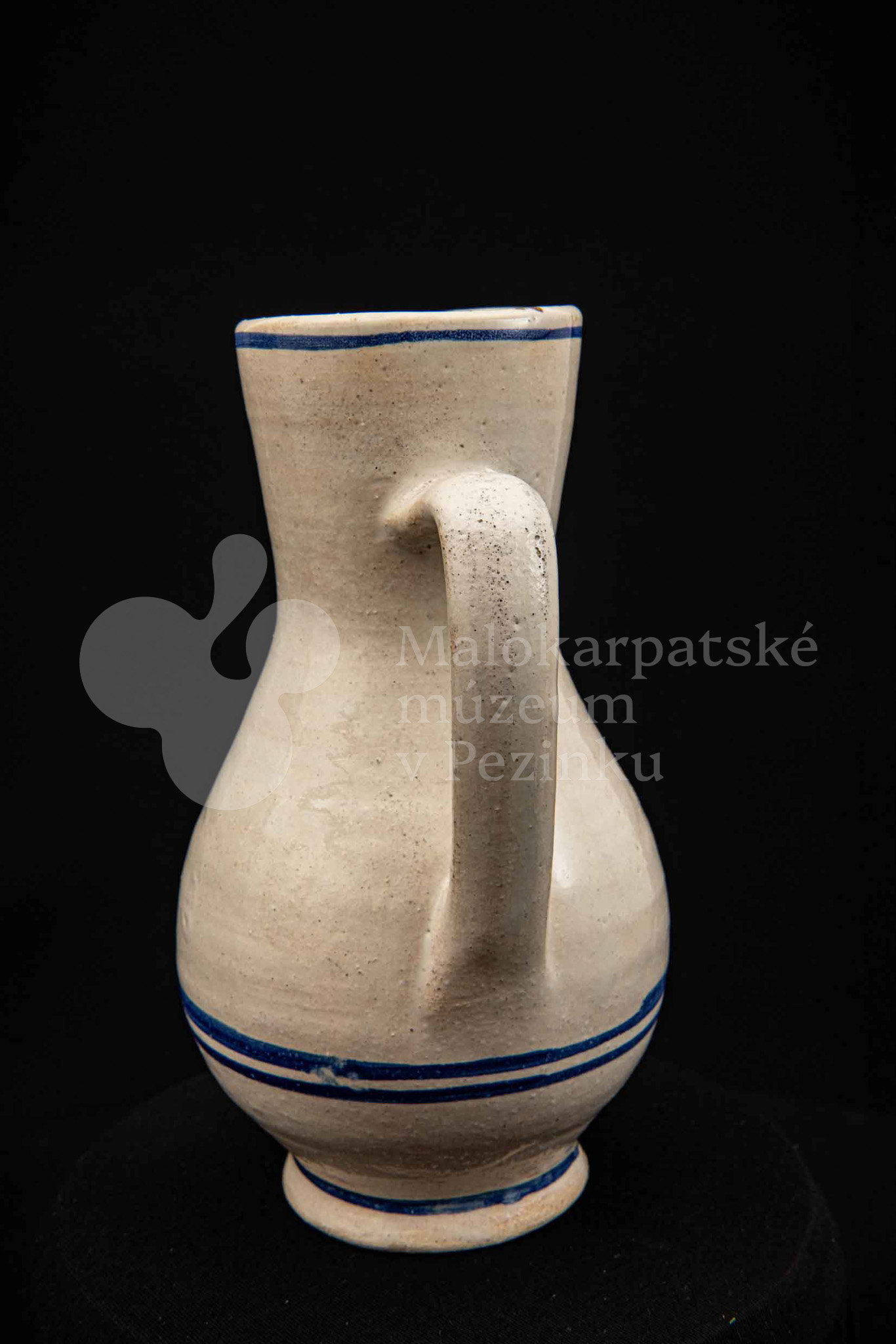 Džbán fajansový, po celej ploche bieloglazovaný s modrými pruhmi. Glazúra je na viacerých miestach poškodená. Pochádza z 18. storočia.