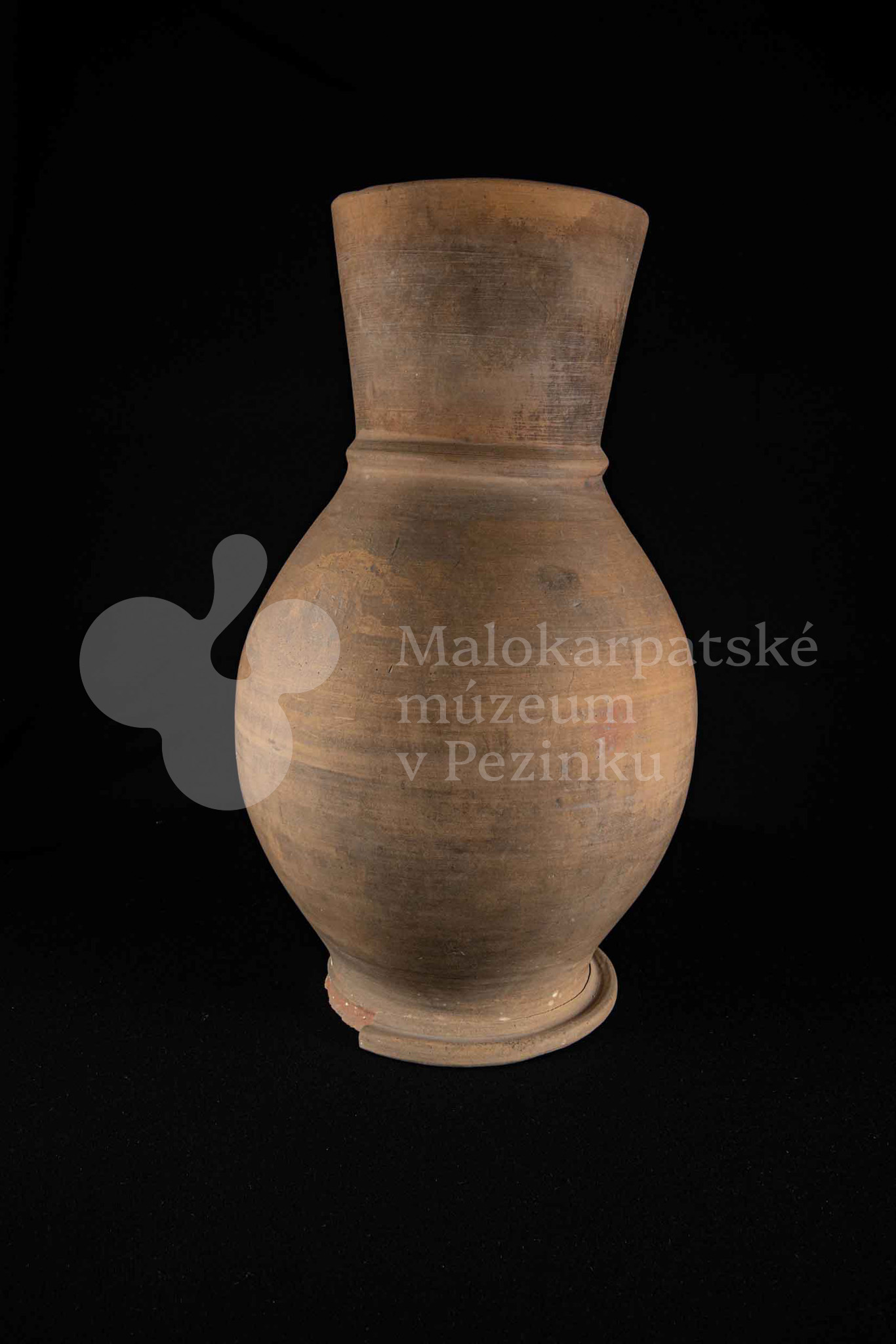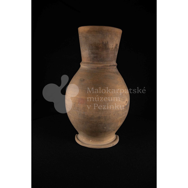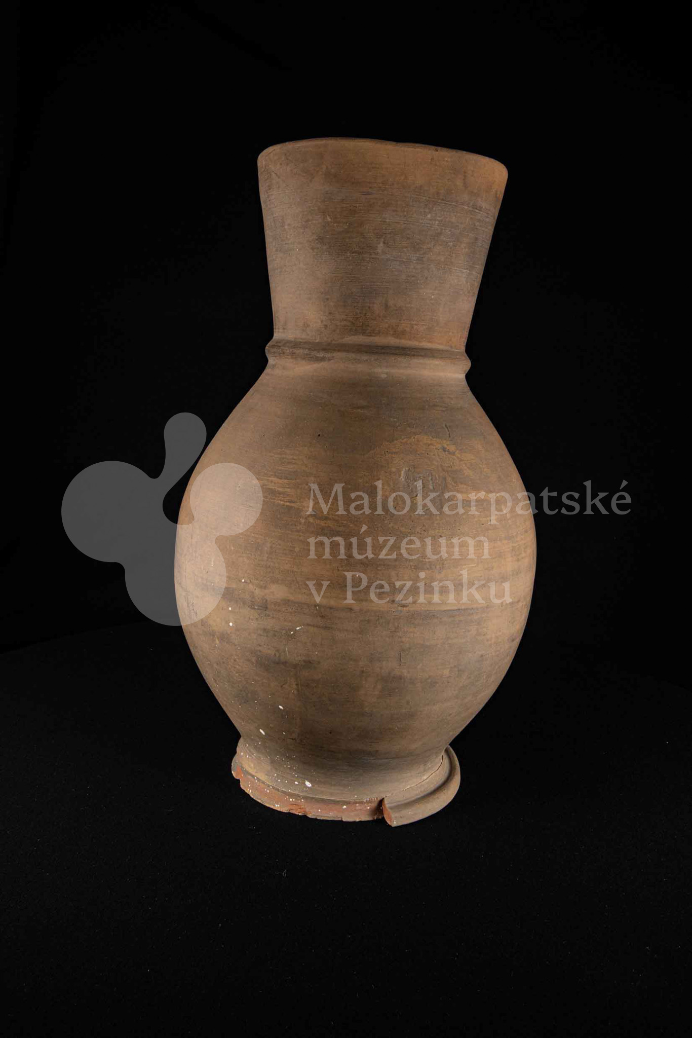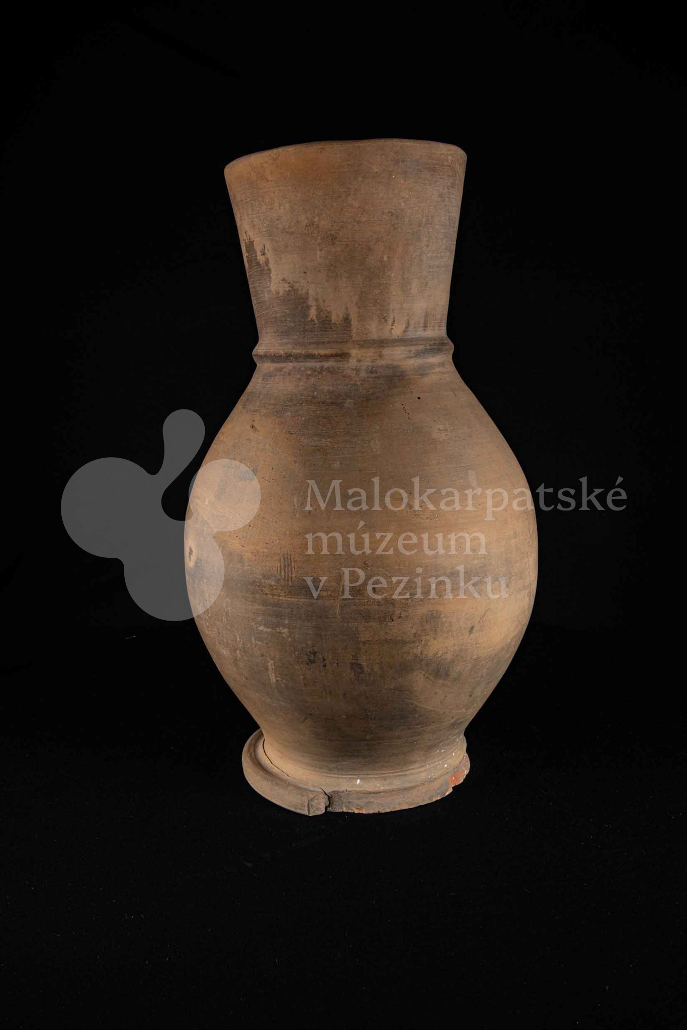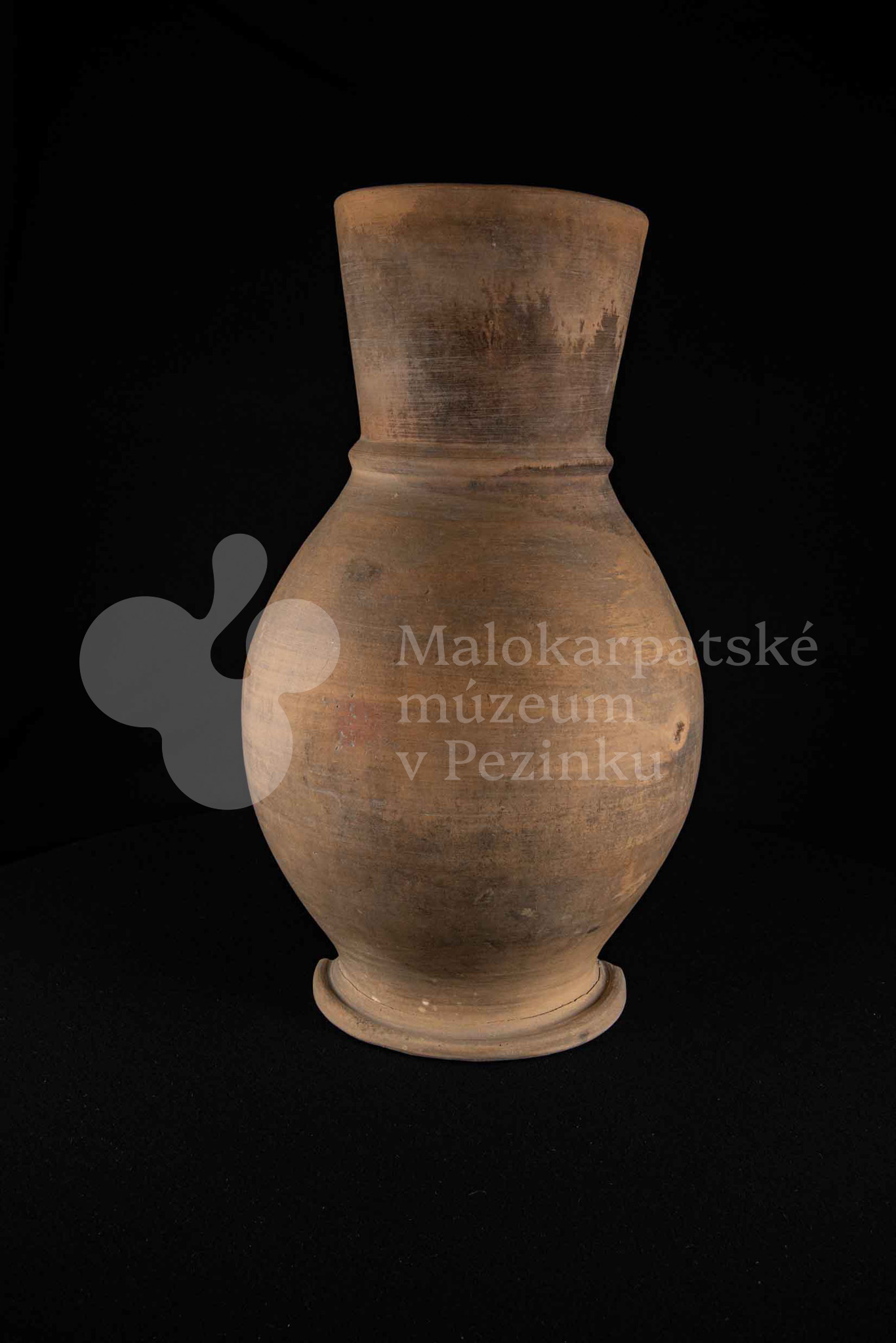 Džbán veľký neglazovaný, len raz pálený, s rovným okrajom bez ucha. Ne hrdle má plastický vrúbok. Na dne veľmi silno poškodený. Bez značenia.