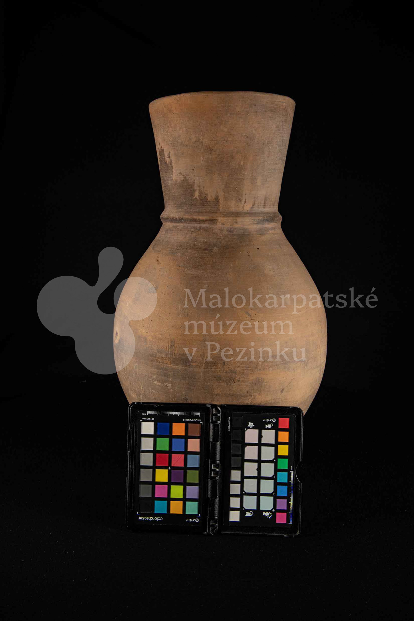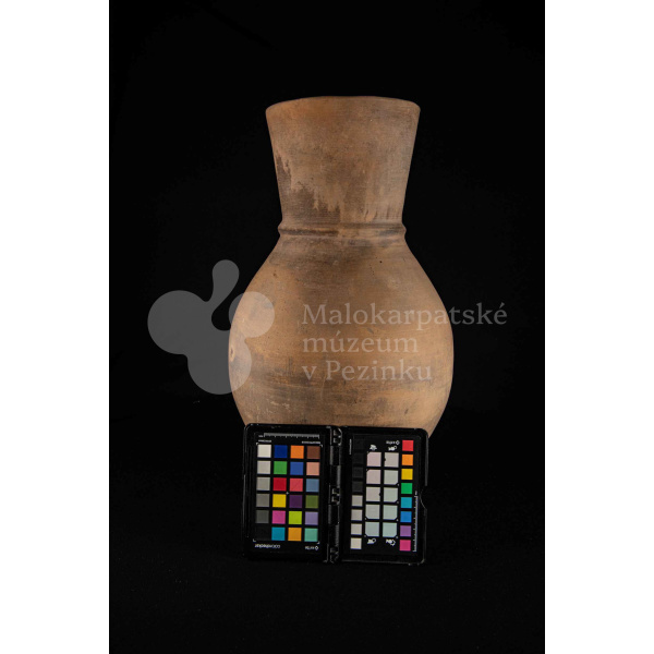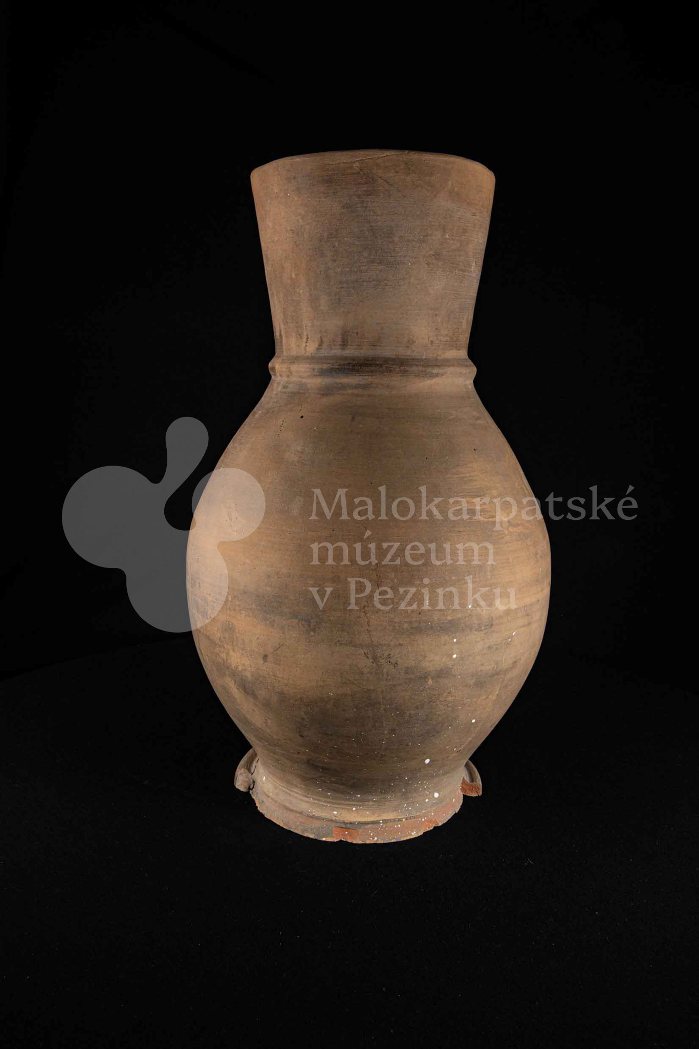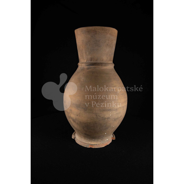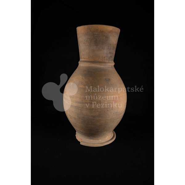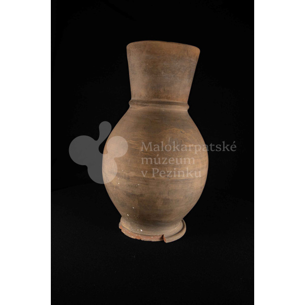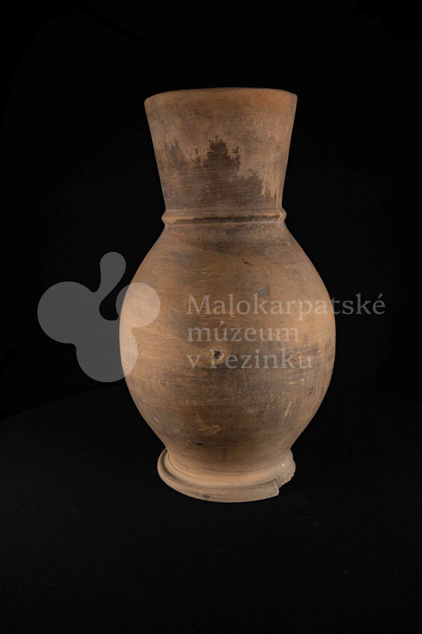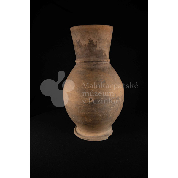 Džbán veľký neglazovaný, len raz pálený, s rovným okrajom bez ucha. Ne hrdle má plastický vrúbok. Na dne veľmi silno poškodený. Bez značenia.