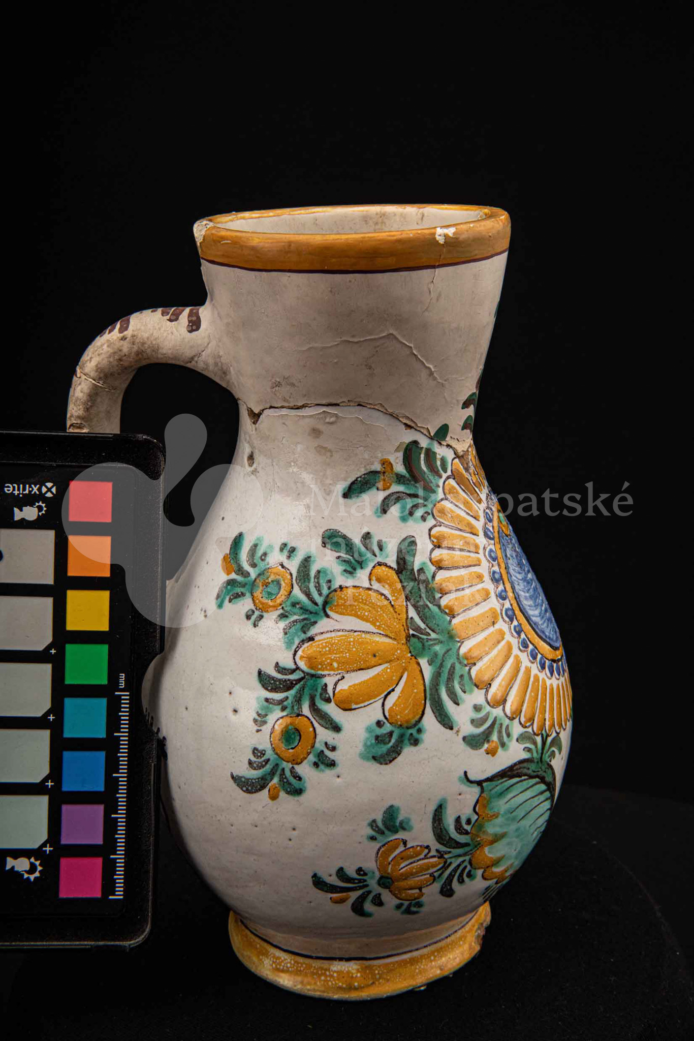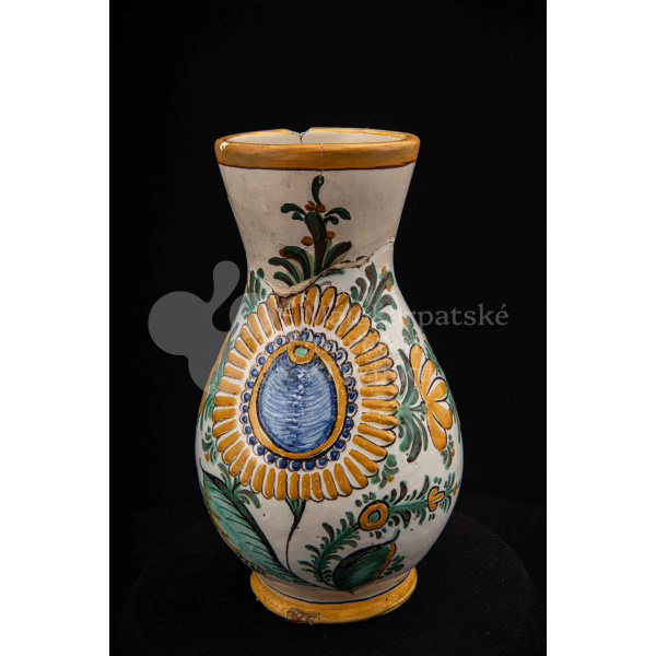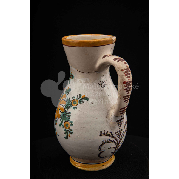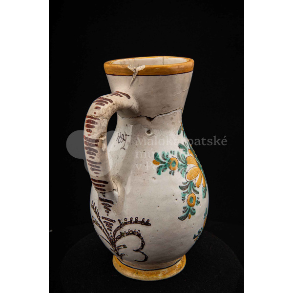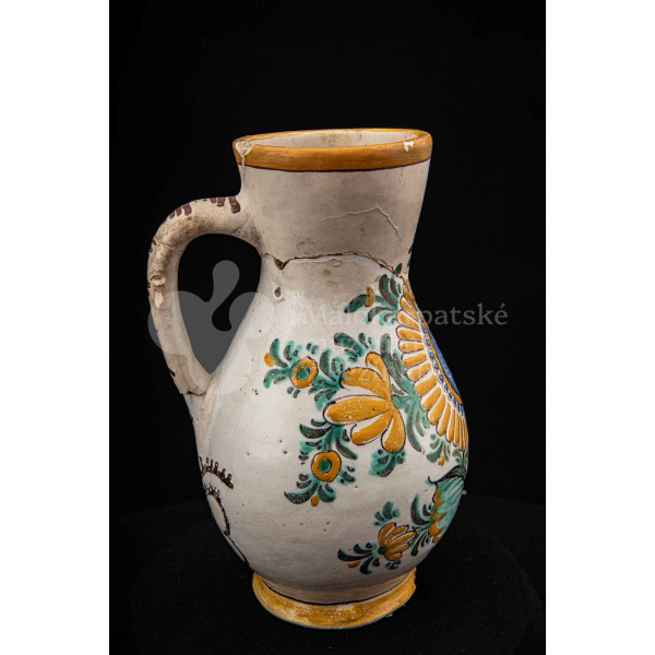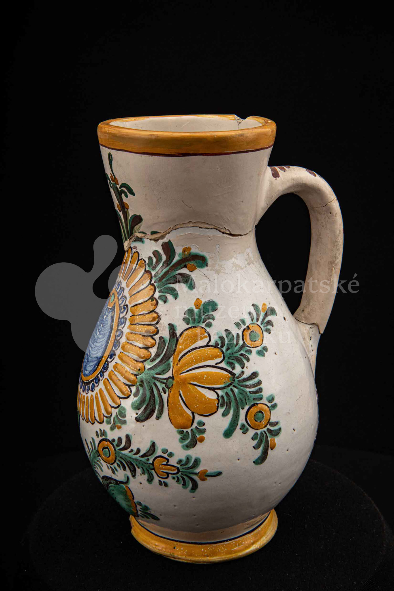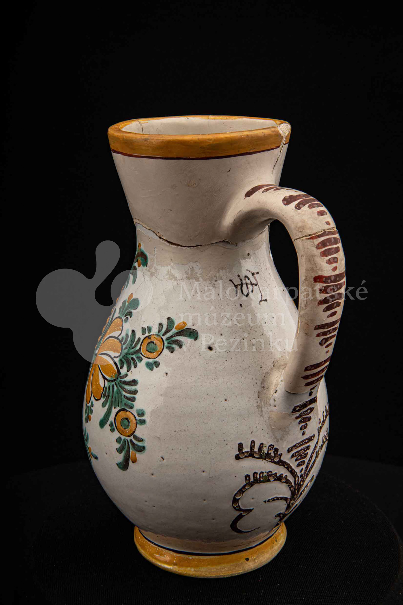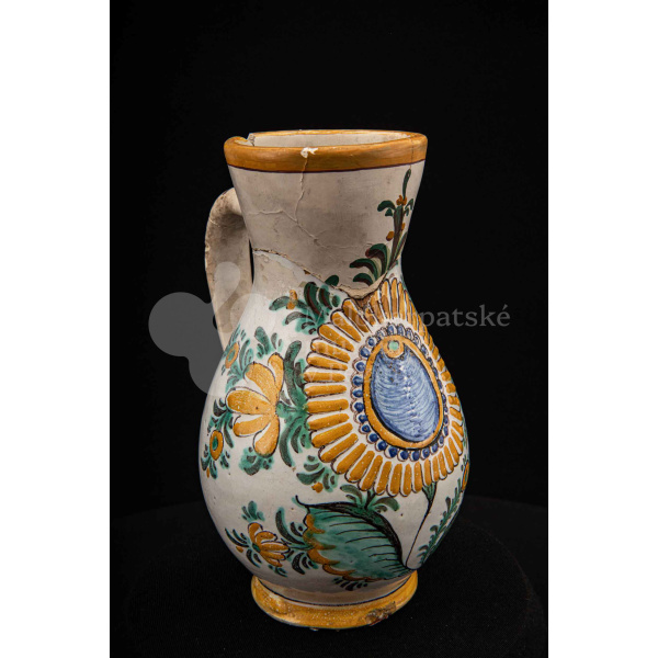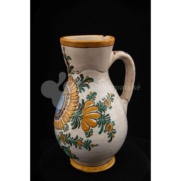 Džbánok fajansový po celej ploche bielo glazovaný, zdobený v strede žlto-modrou kvetinou so zelenými lístkami. Silno poškodený. Pod uchom značený ST.