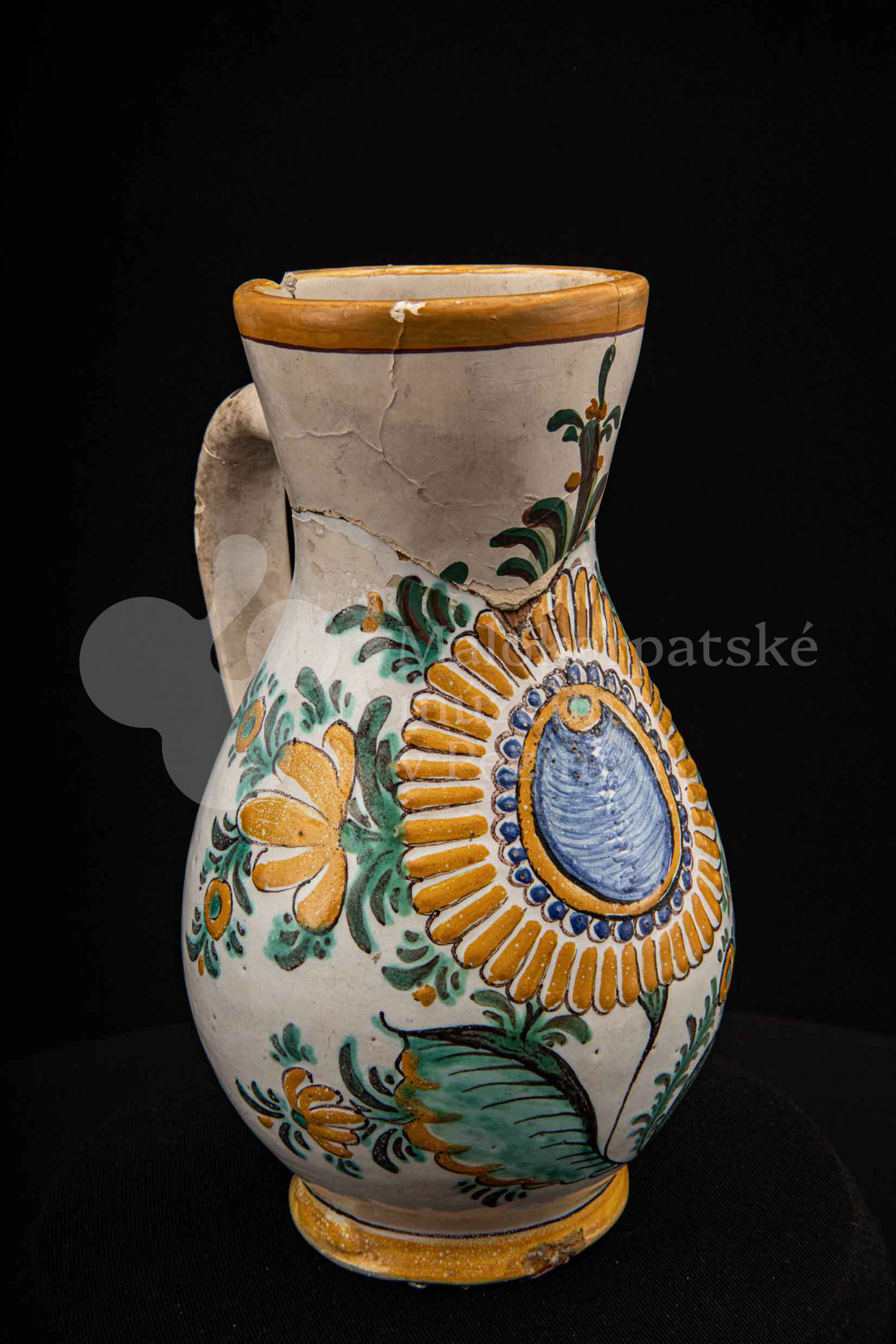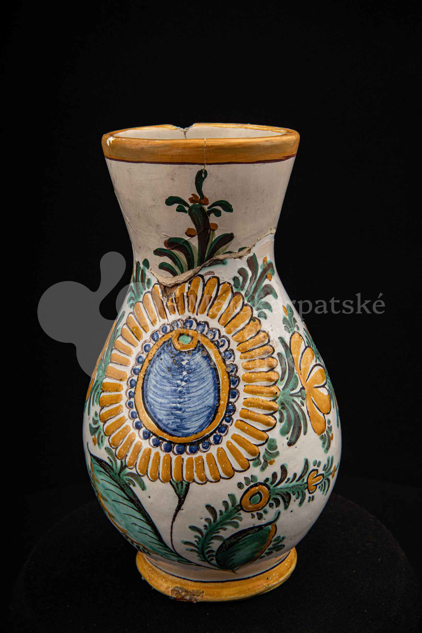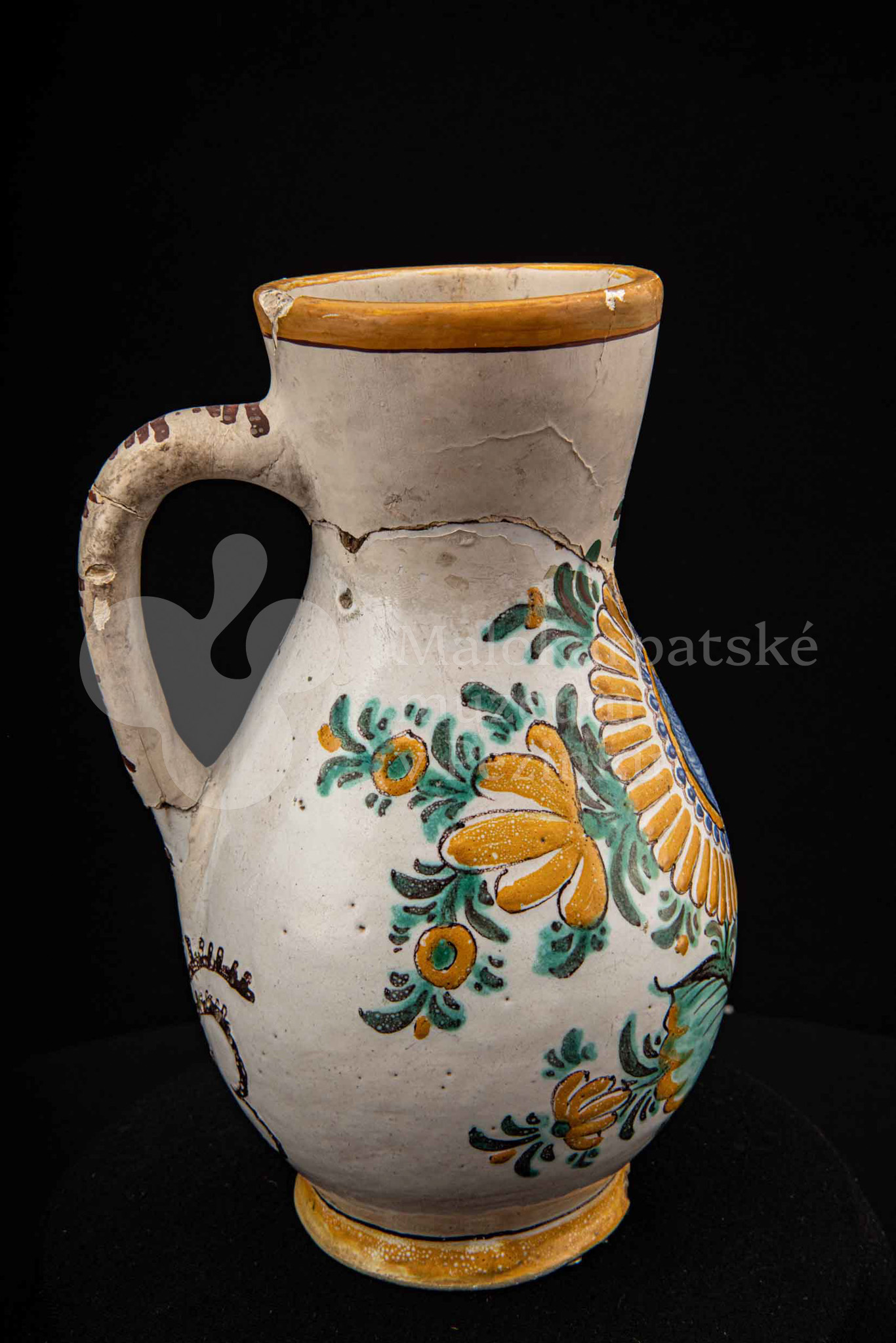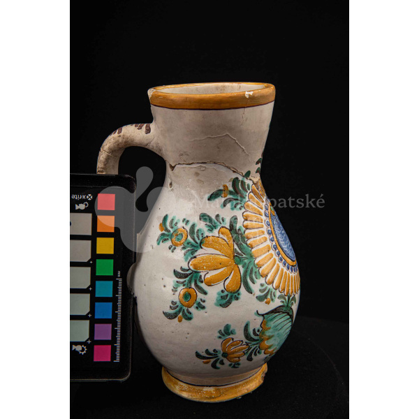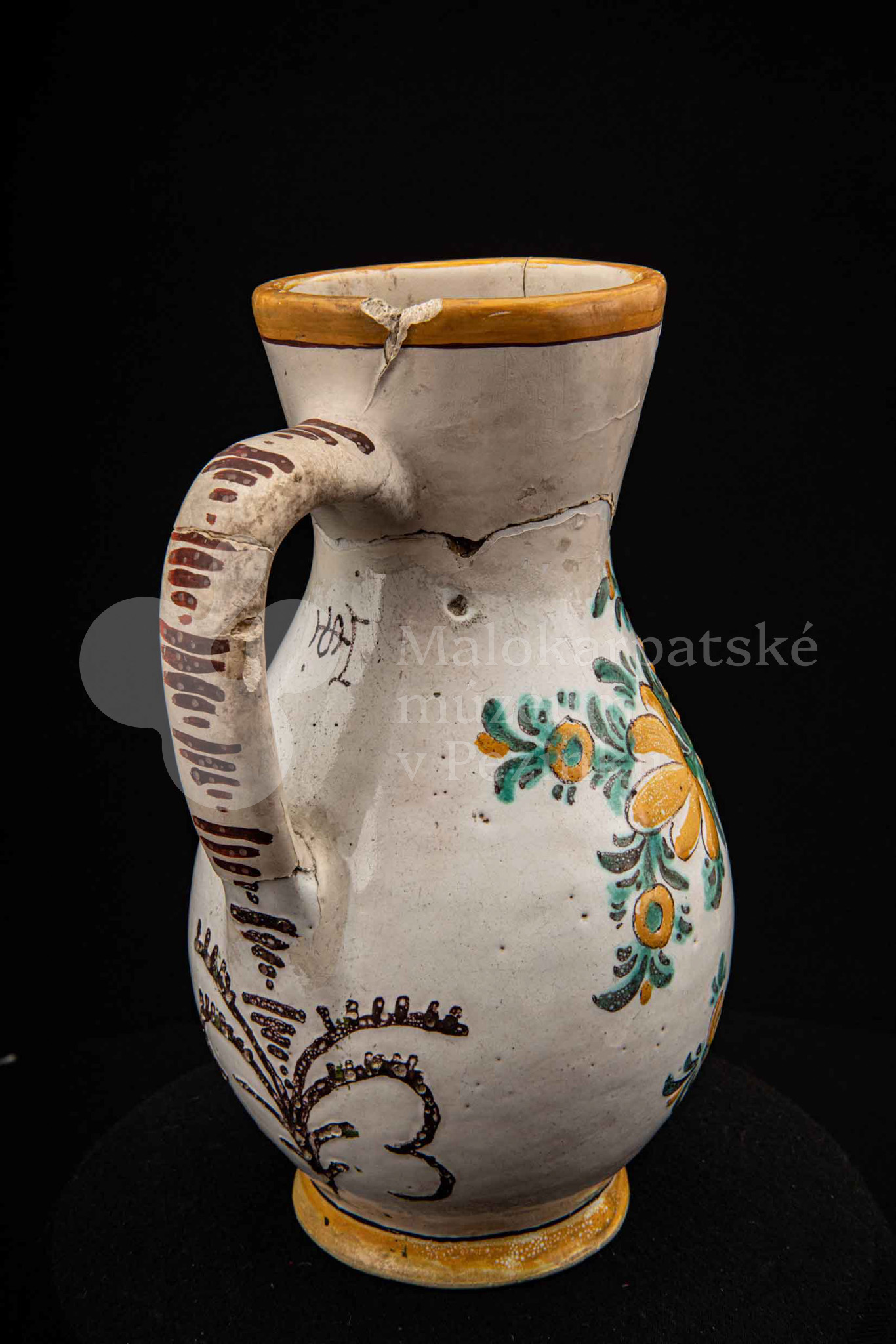Džbánok fajansový po celej ploche bielo glazovaný, zdobený v strede žlto-modrou kvetinou so zelenými lístkami. Silno poškodený. Pod uchom značený ST.