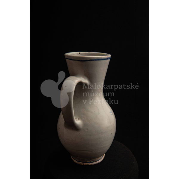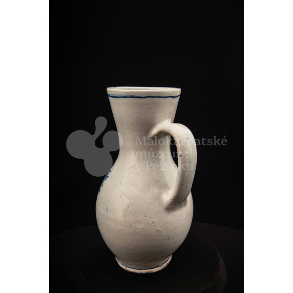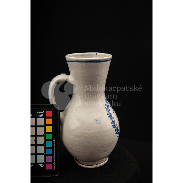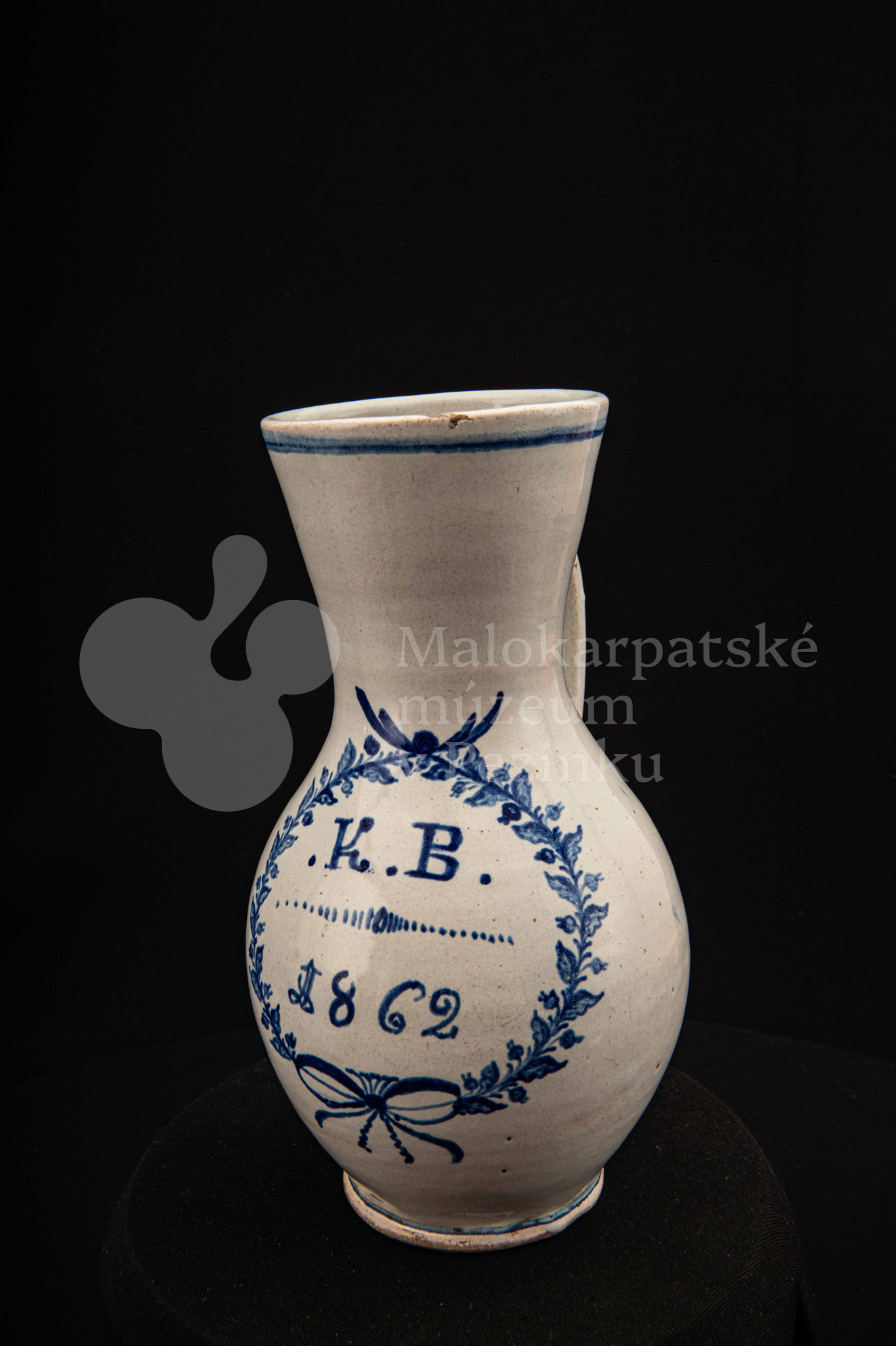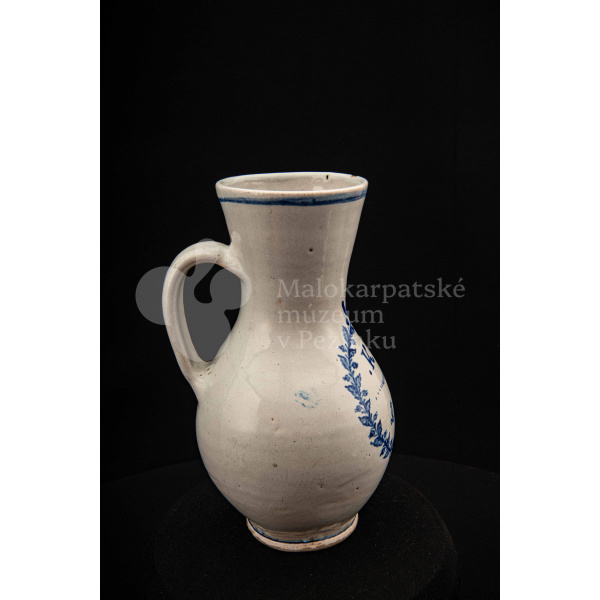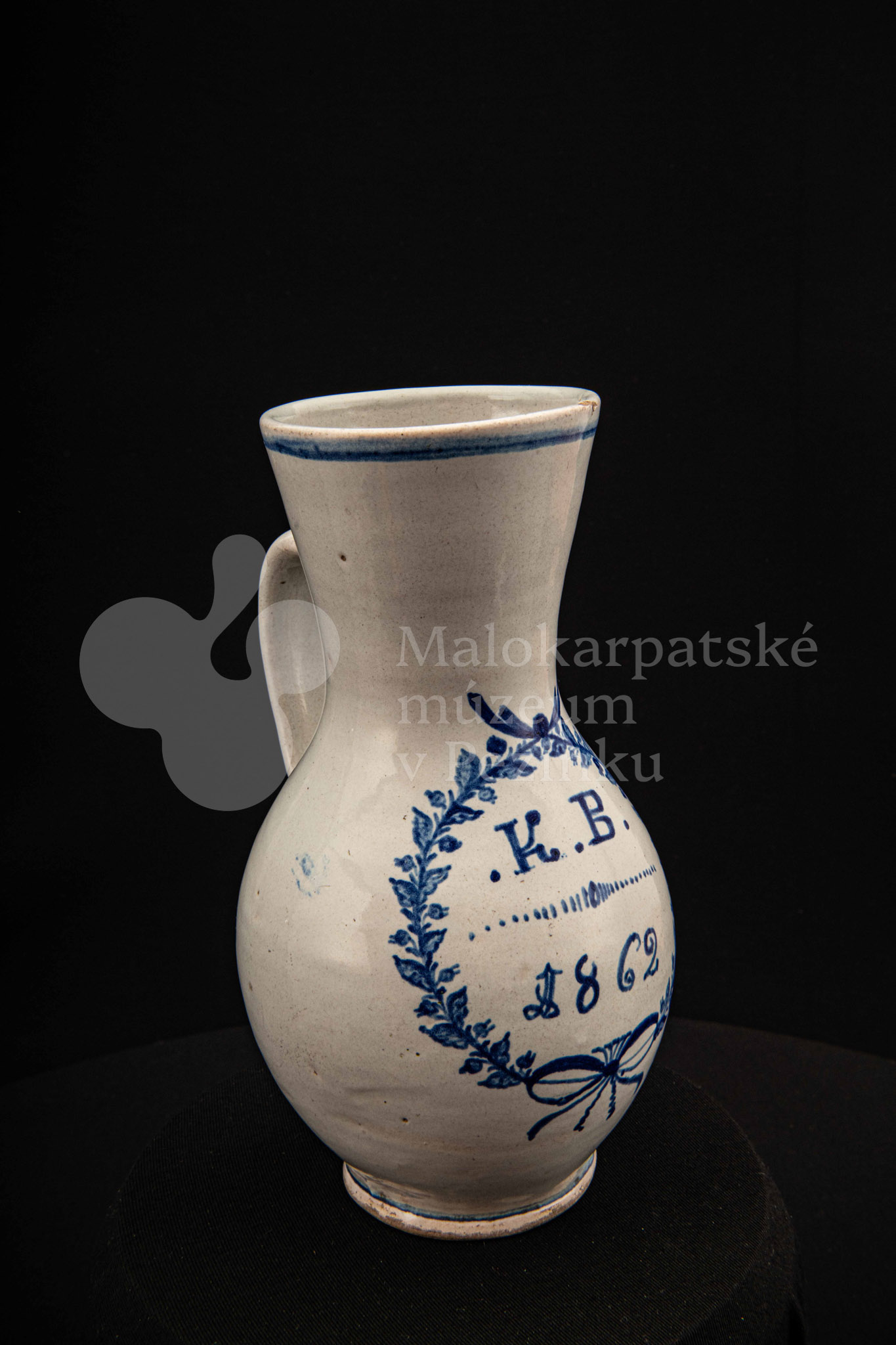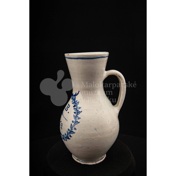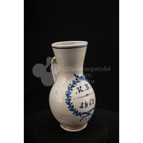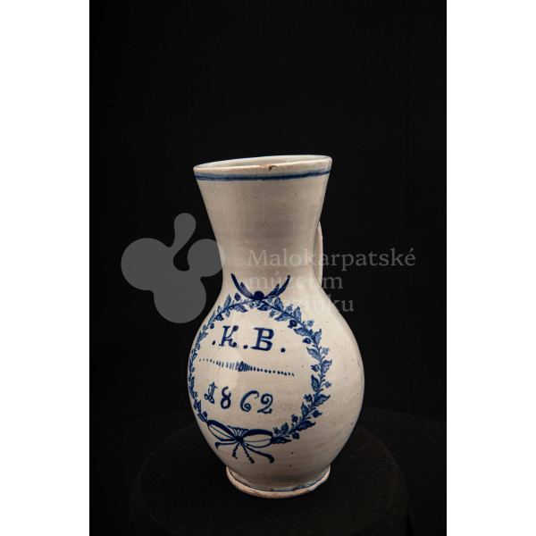 Džbánok fajansový – po celej ploche bielo glazovaný, s modrým dekorom. Na prednej strane vo venci nápis .K.B. 1862.