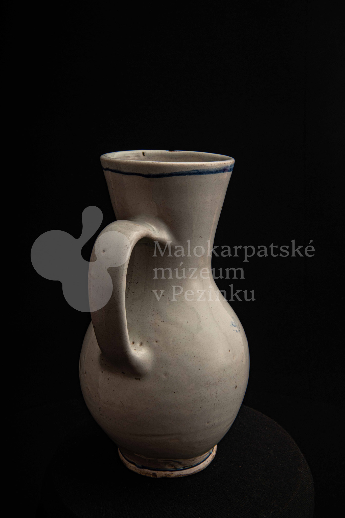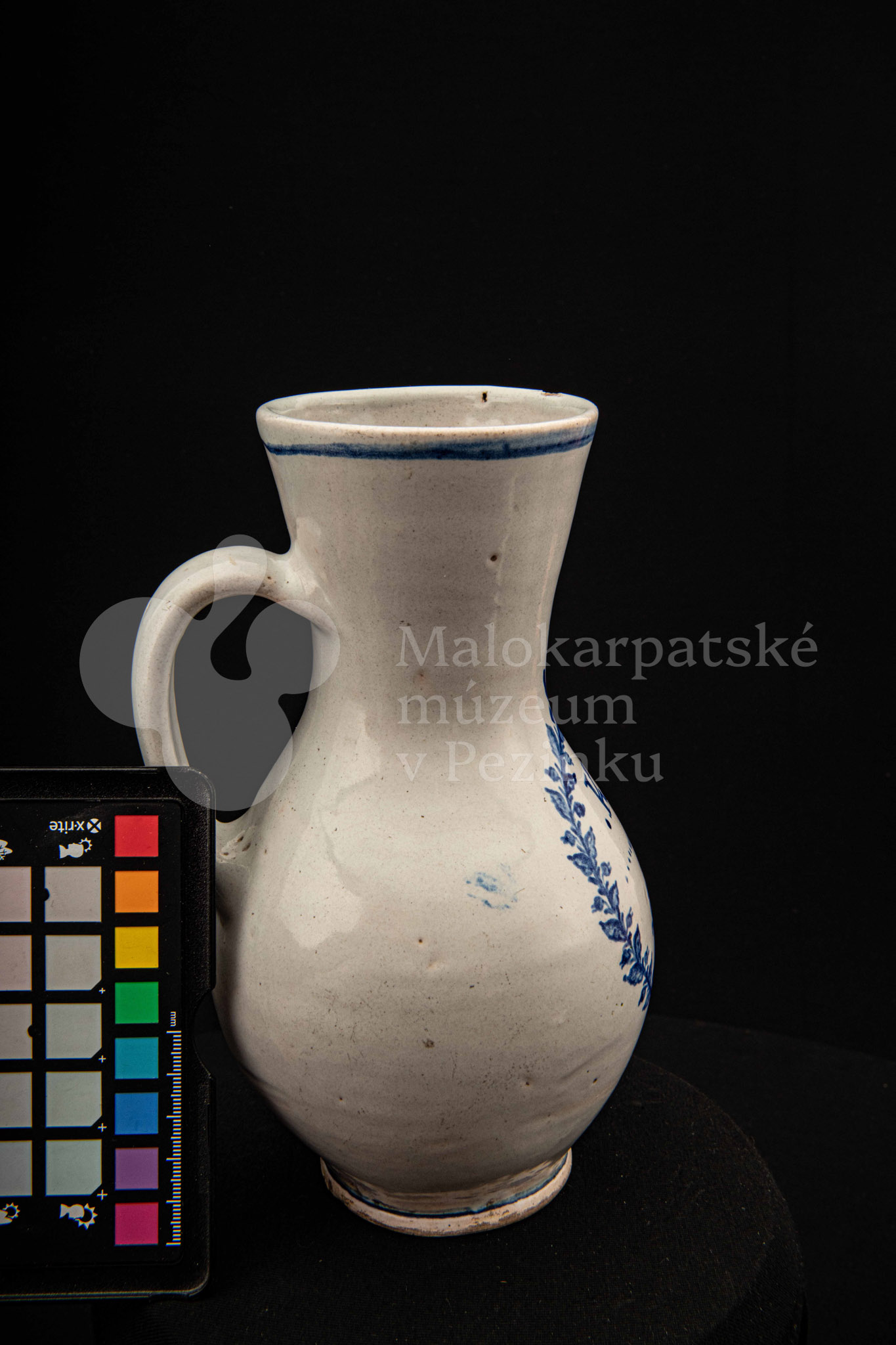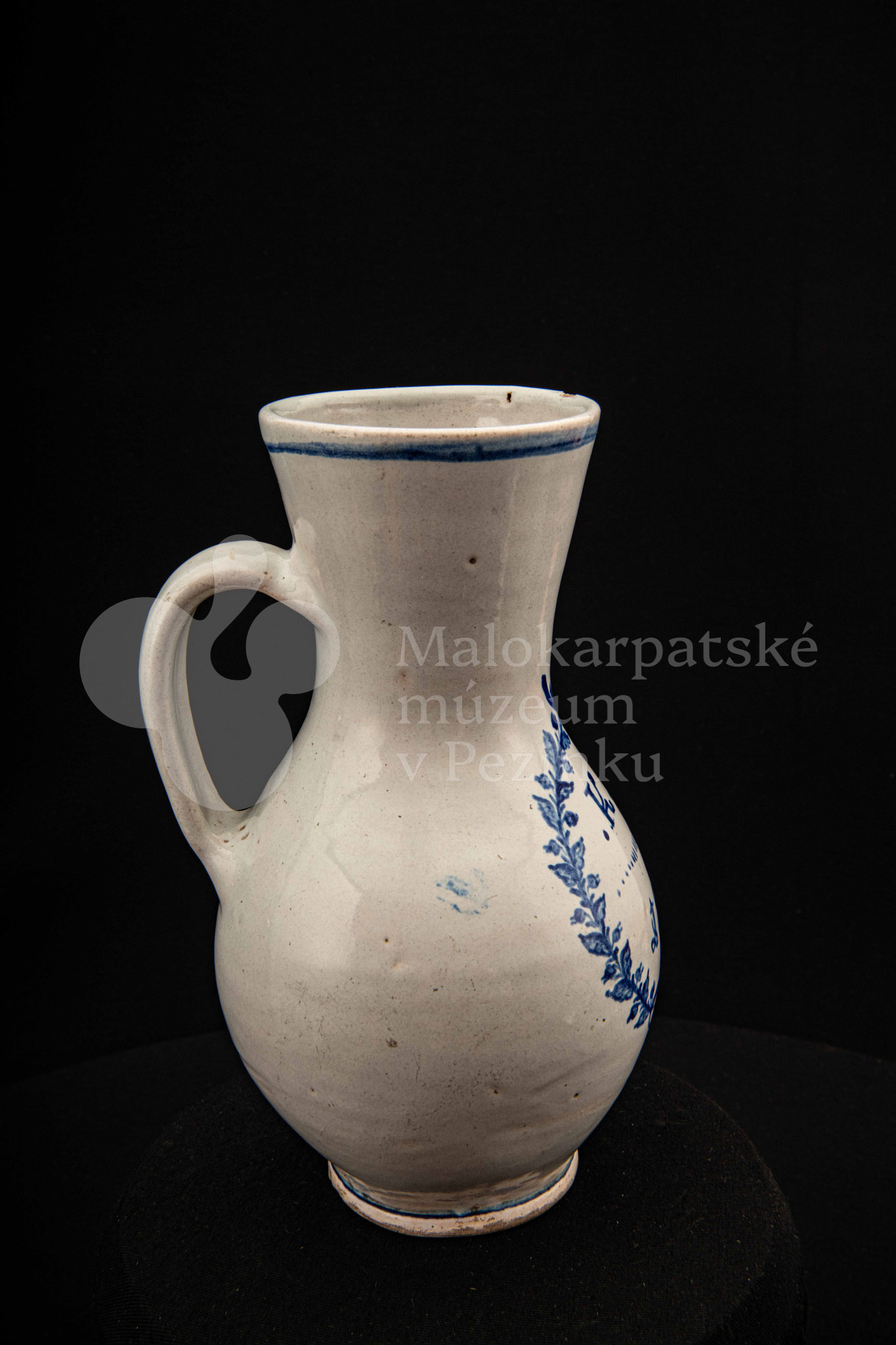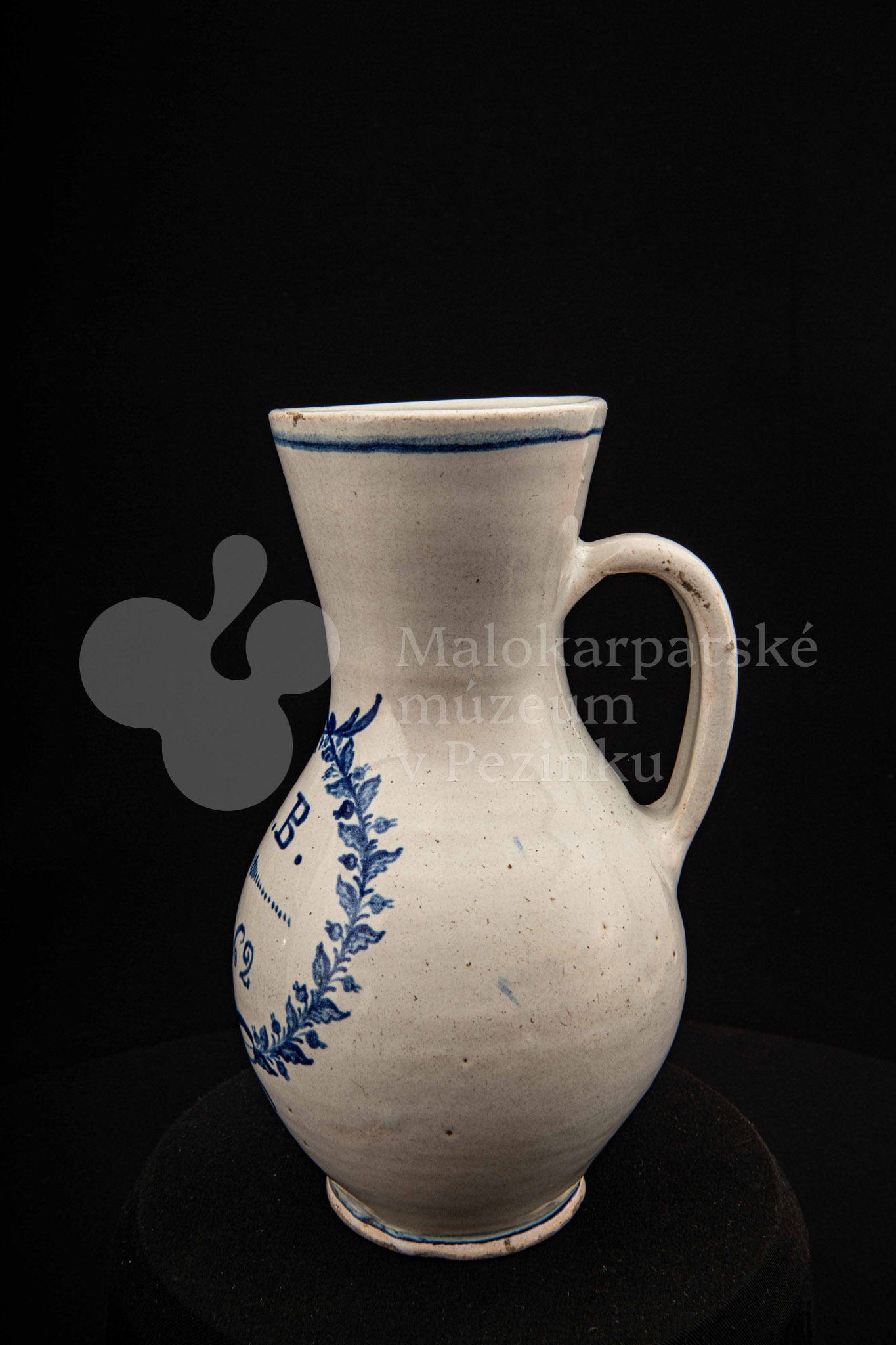Džbánok fajansový – po celej ploche bielo glazovaný, s modrým dekorom. Na prednej strane vo venci nápis .K.B. 1862.