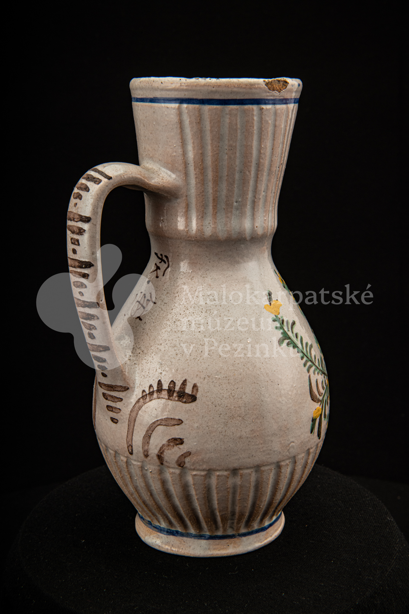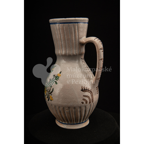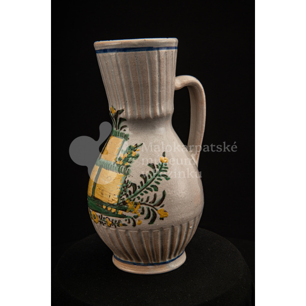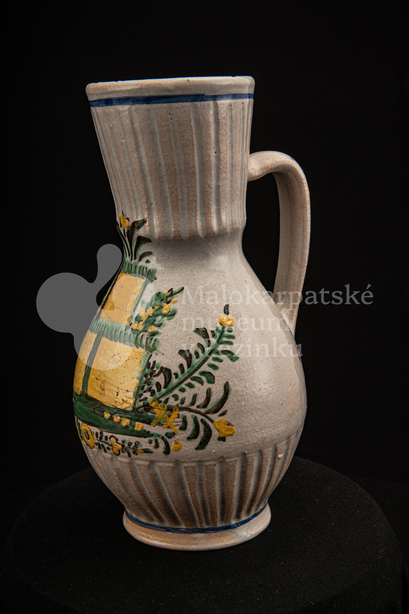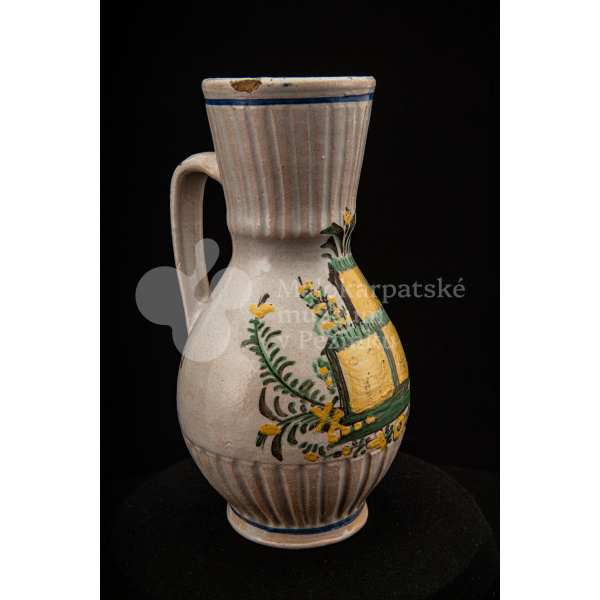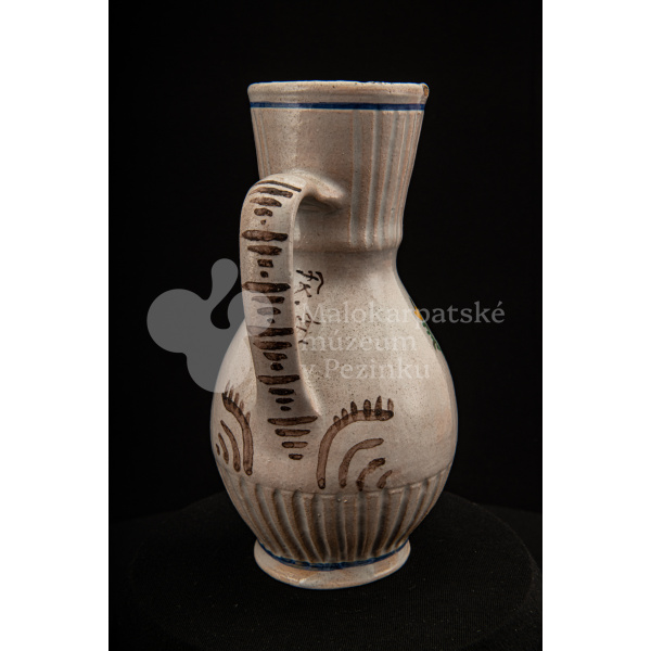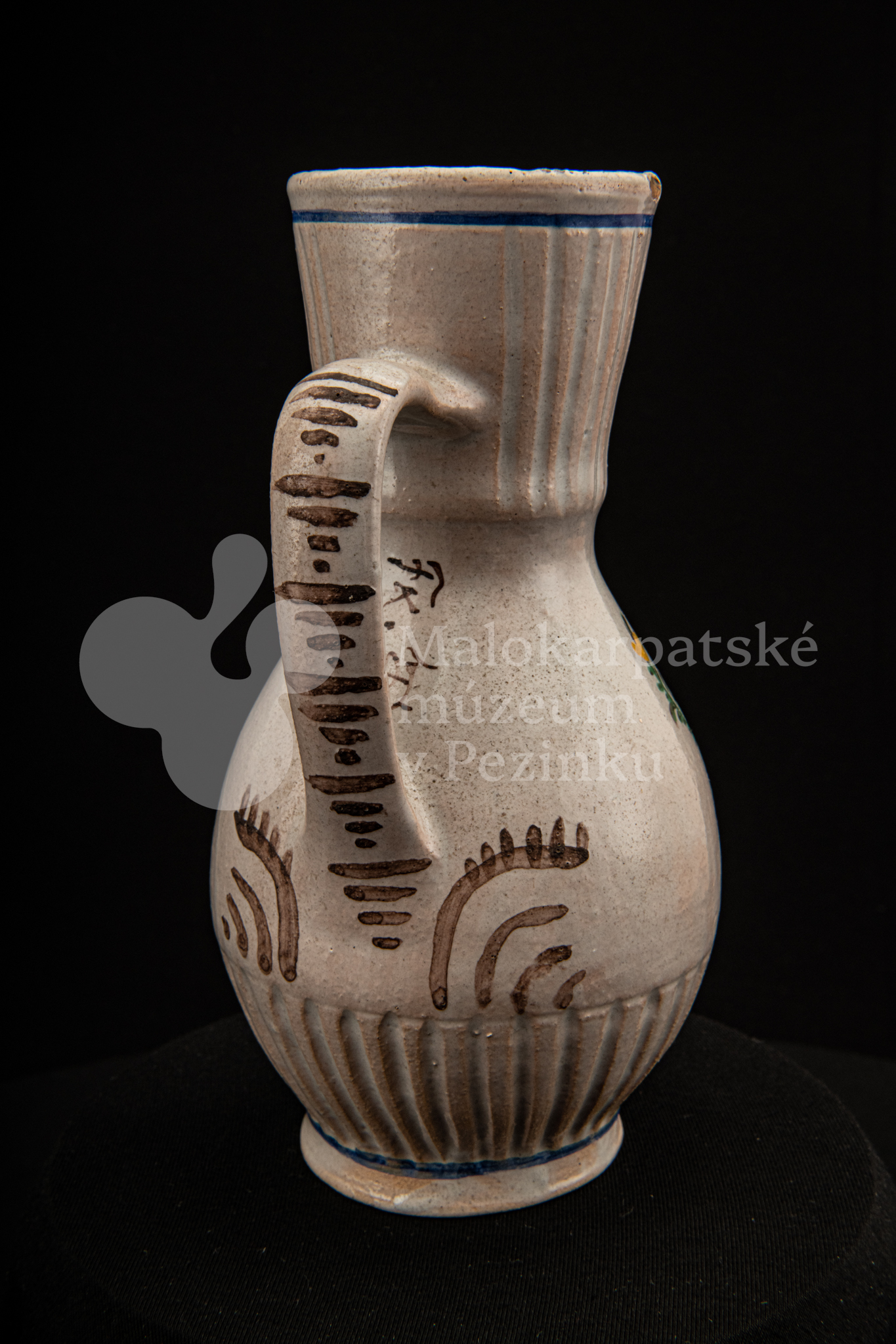 Džbánok fajansový. Po celej ploche bieloglazovaný, s modrými pruhmi. V strede namaľovaný motív architektúry v žltej a zelenej farbe. Na vrchnej časti plastický dekor zdobený „pajglovaním“. Pod uchom značenie FK.ST.