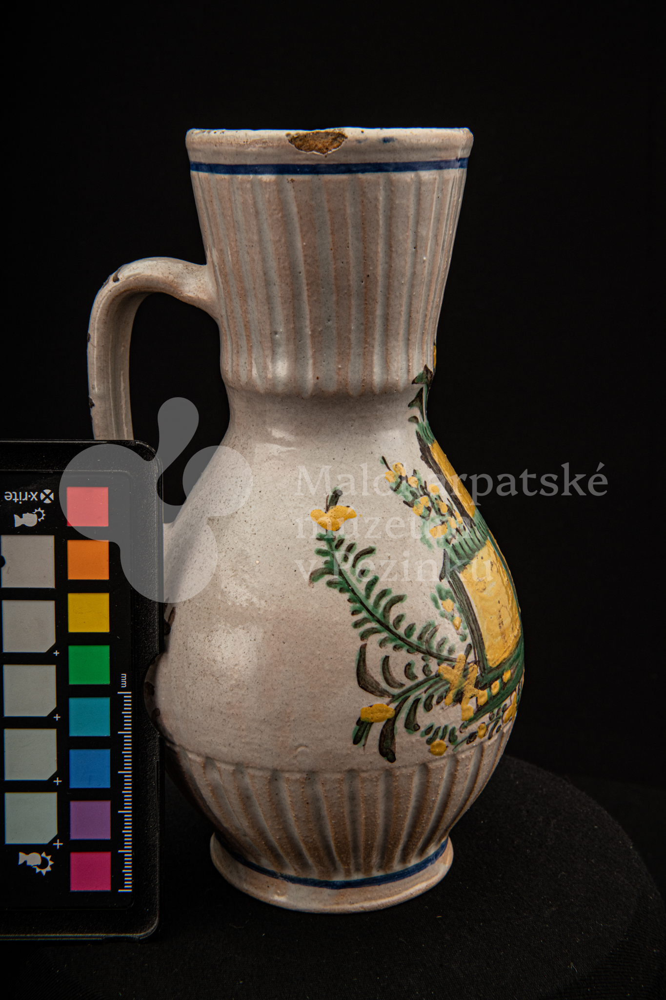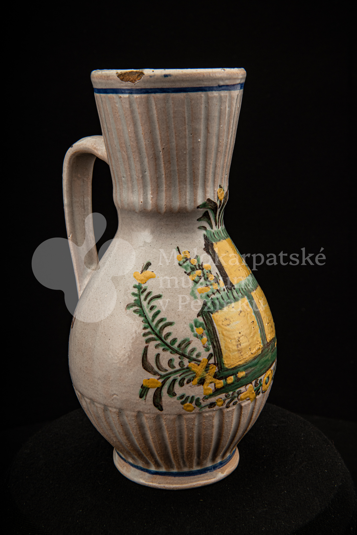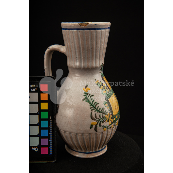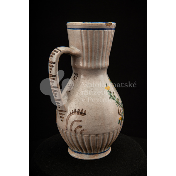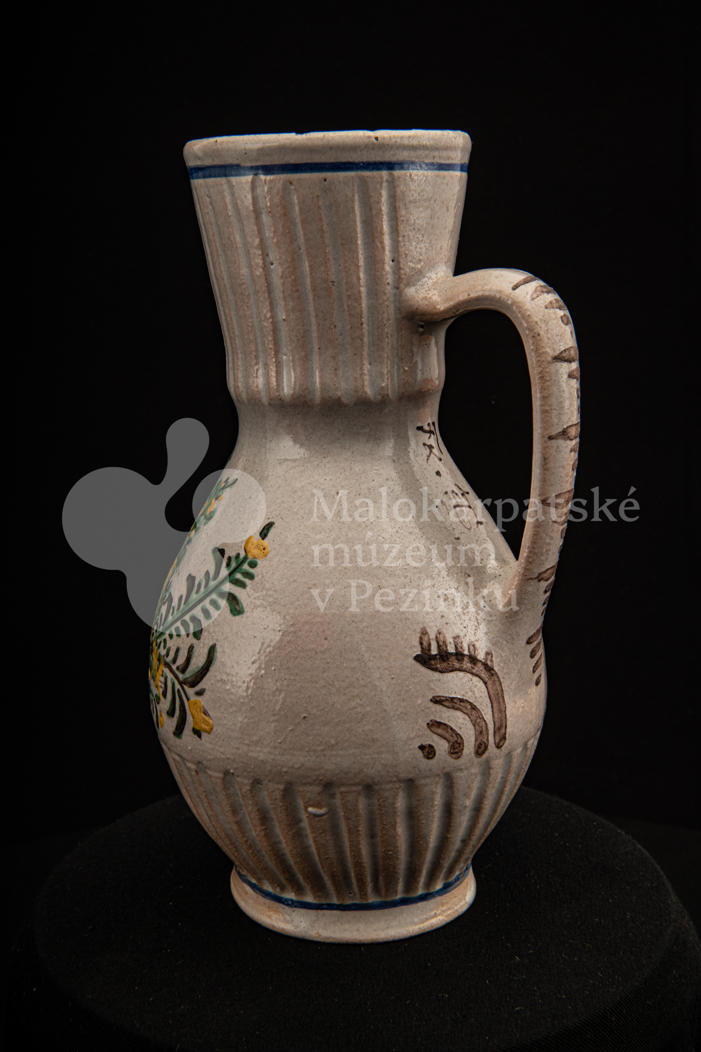 Džbánok fajansový. Po celej ploche bieloglazovaný, s modrými pruhmi. V strede namaľovaný motív architektúry v žltej a zelenej farbe. Na vrchnej časti plastický dekor zdobený „pajglovaním“. Pod uchom značenie FK.ST.