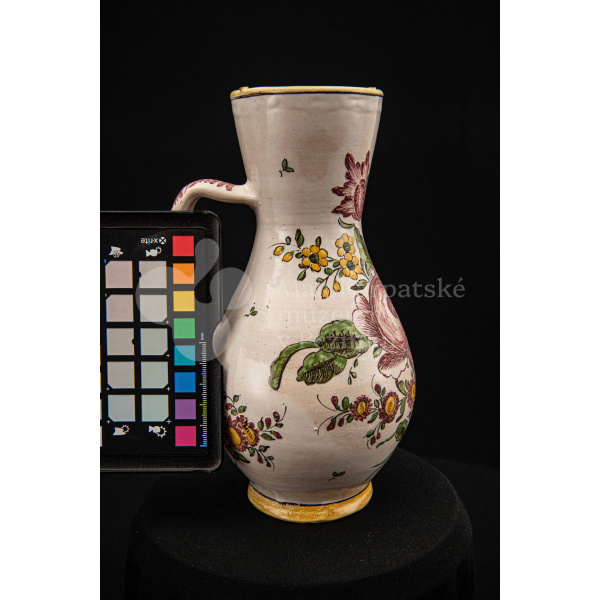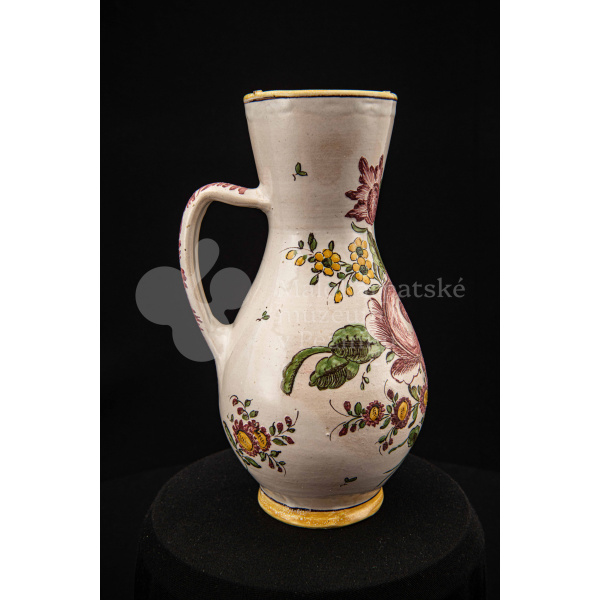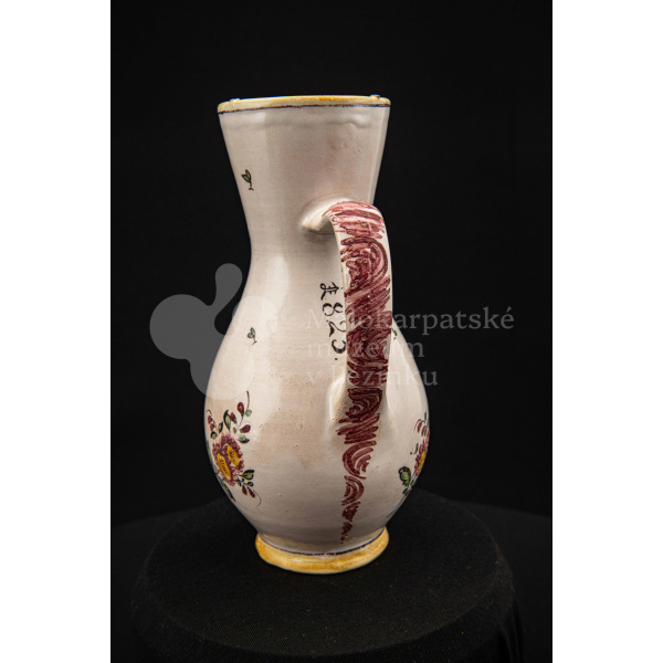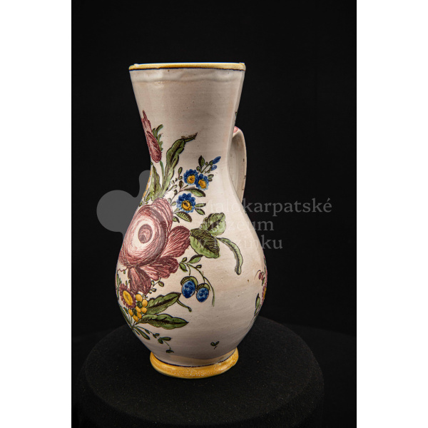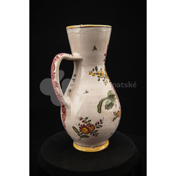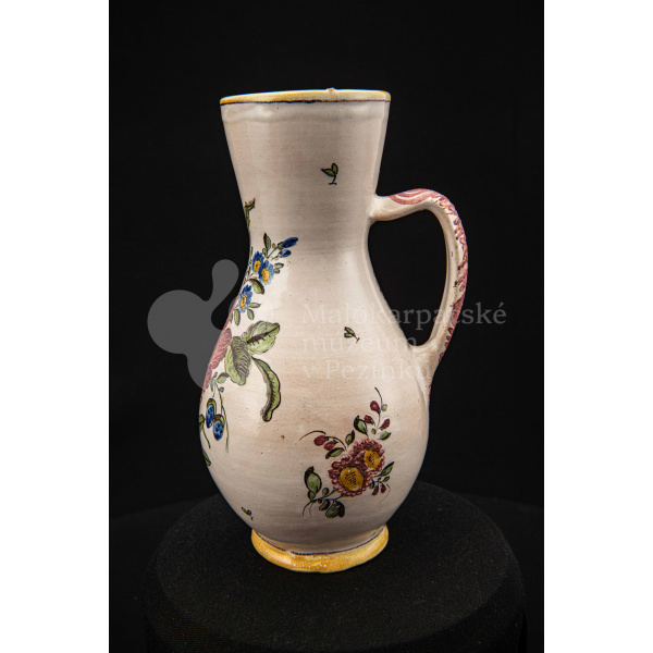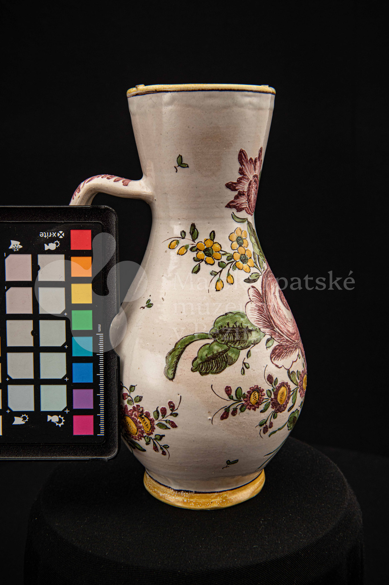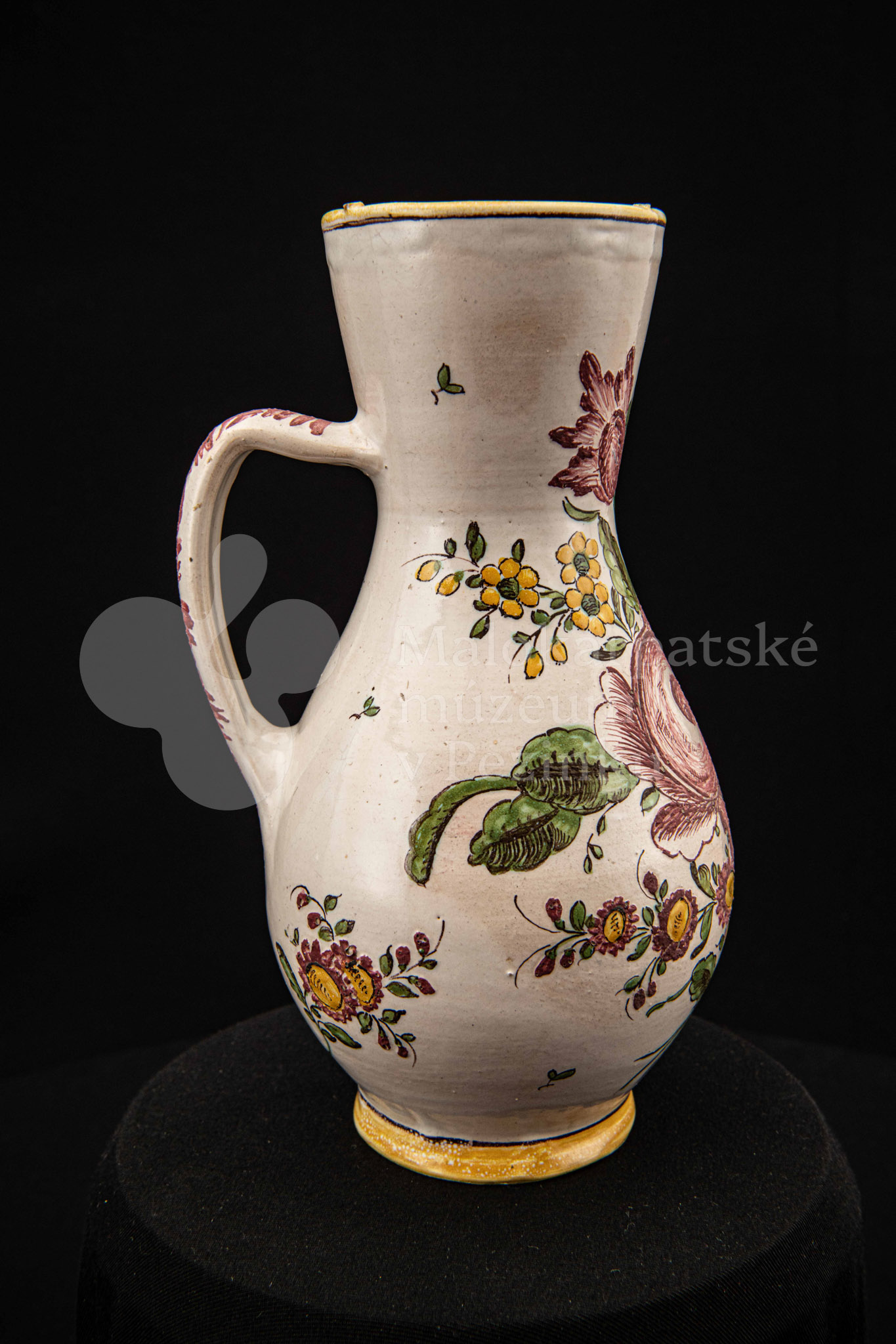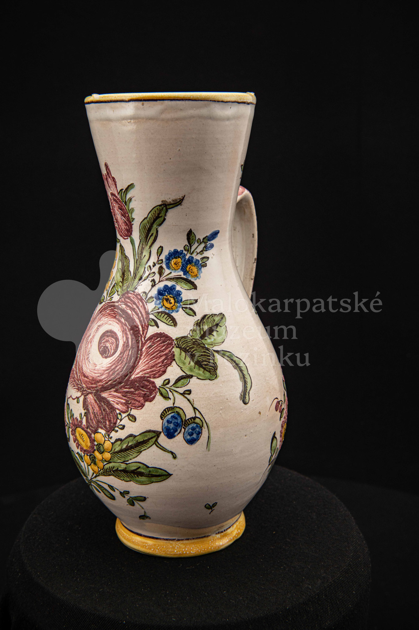 Džbánok fajansový zvaný „holba“. Po celej ploche bieloglazovaný, vysokožiarový dekor s motívom červených kvetov (ruže). Farebnosť je rôzna s prevahou červenej. Pod uchom nápis 1825. Na dne značenie ST.