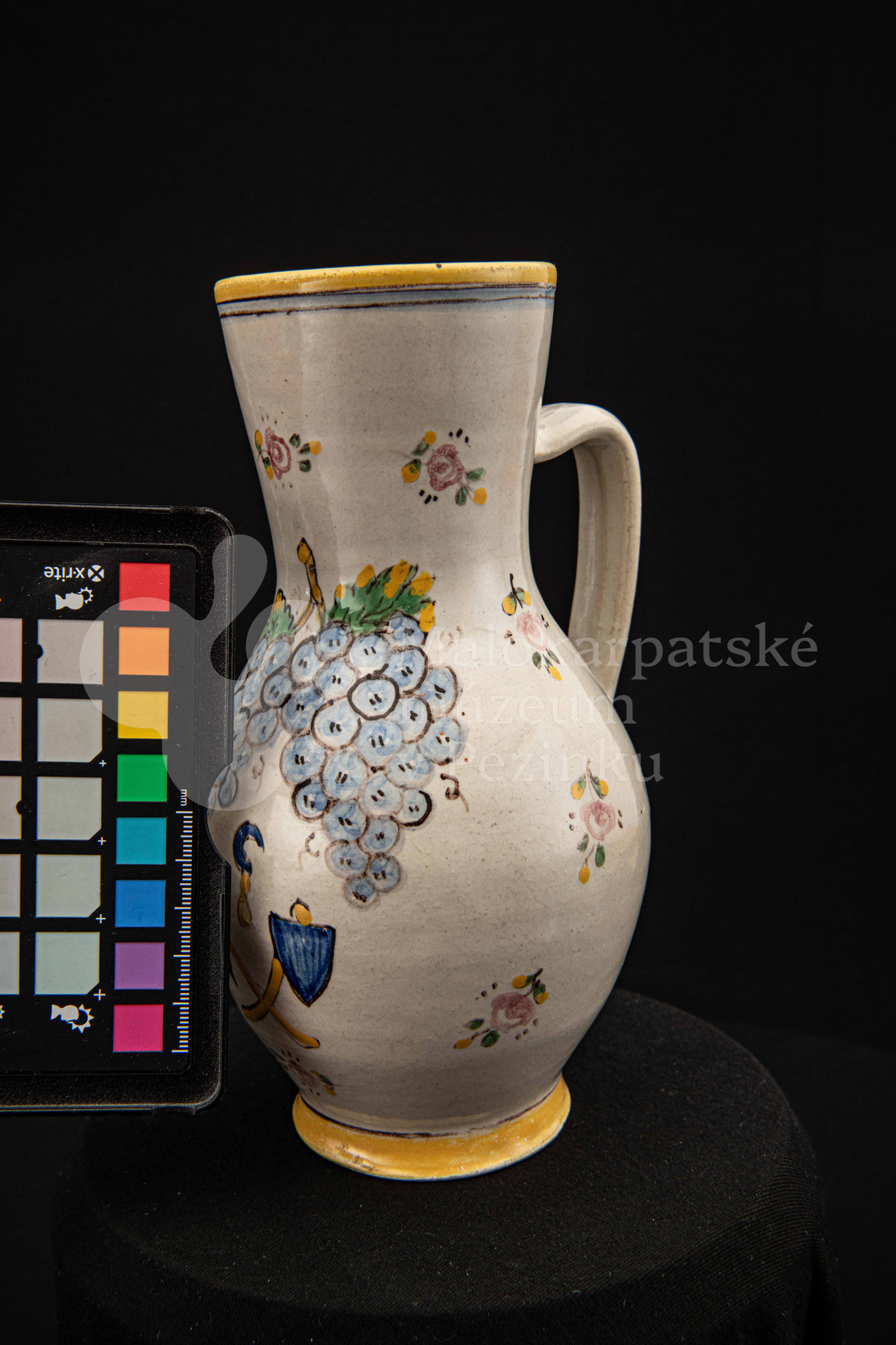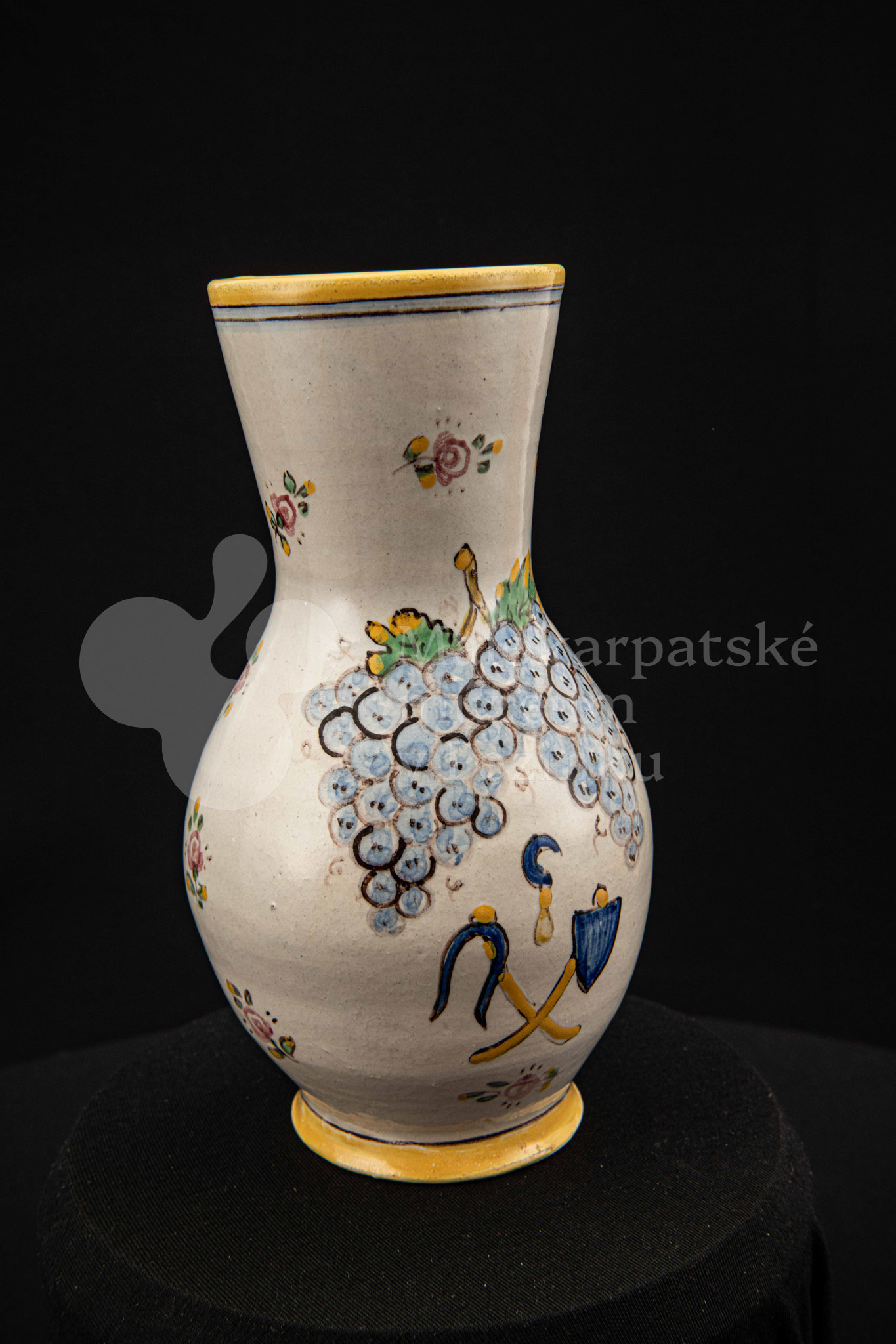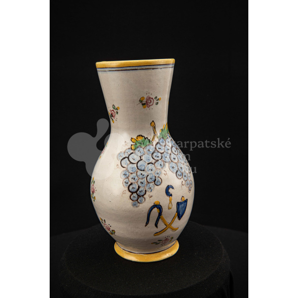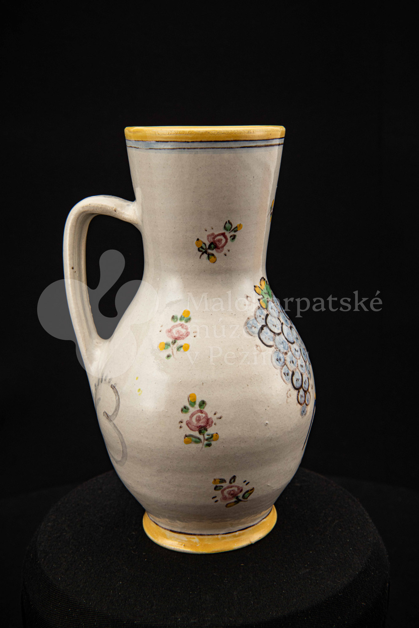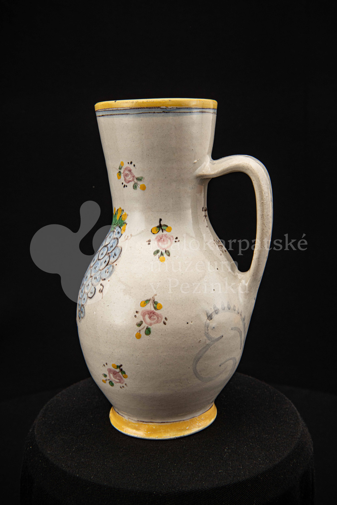 Džbánok fajansový zvaný holba. Po celej ploche bieloglazovaný, vysokožiarový dekor s motívom hrozna a vinohradníckeho náradia. Pod uchom značenie FK.ST.