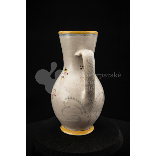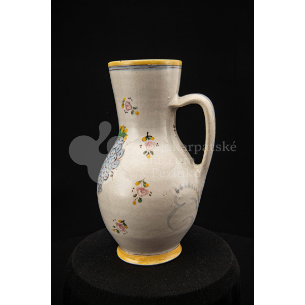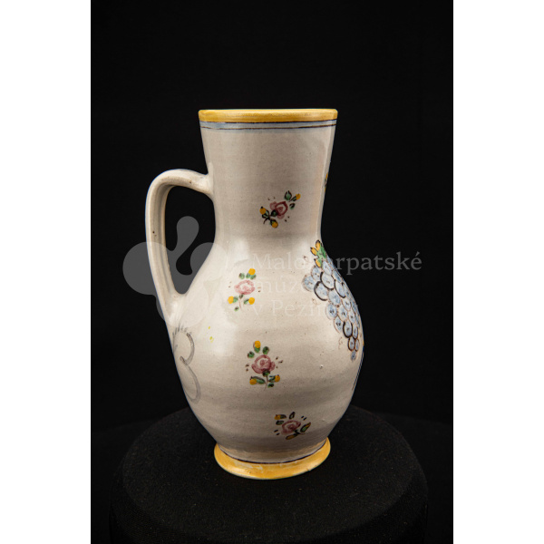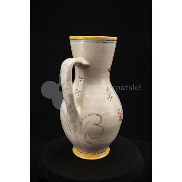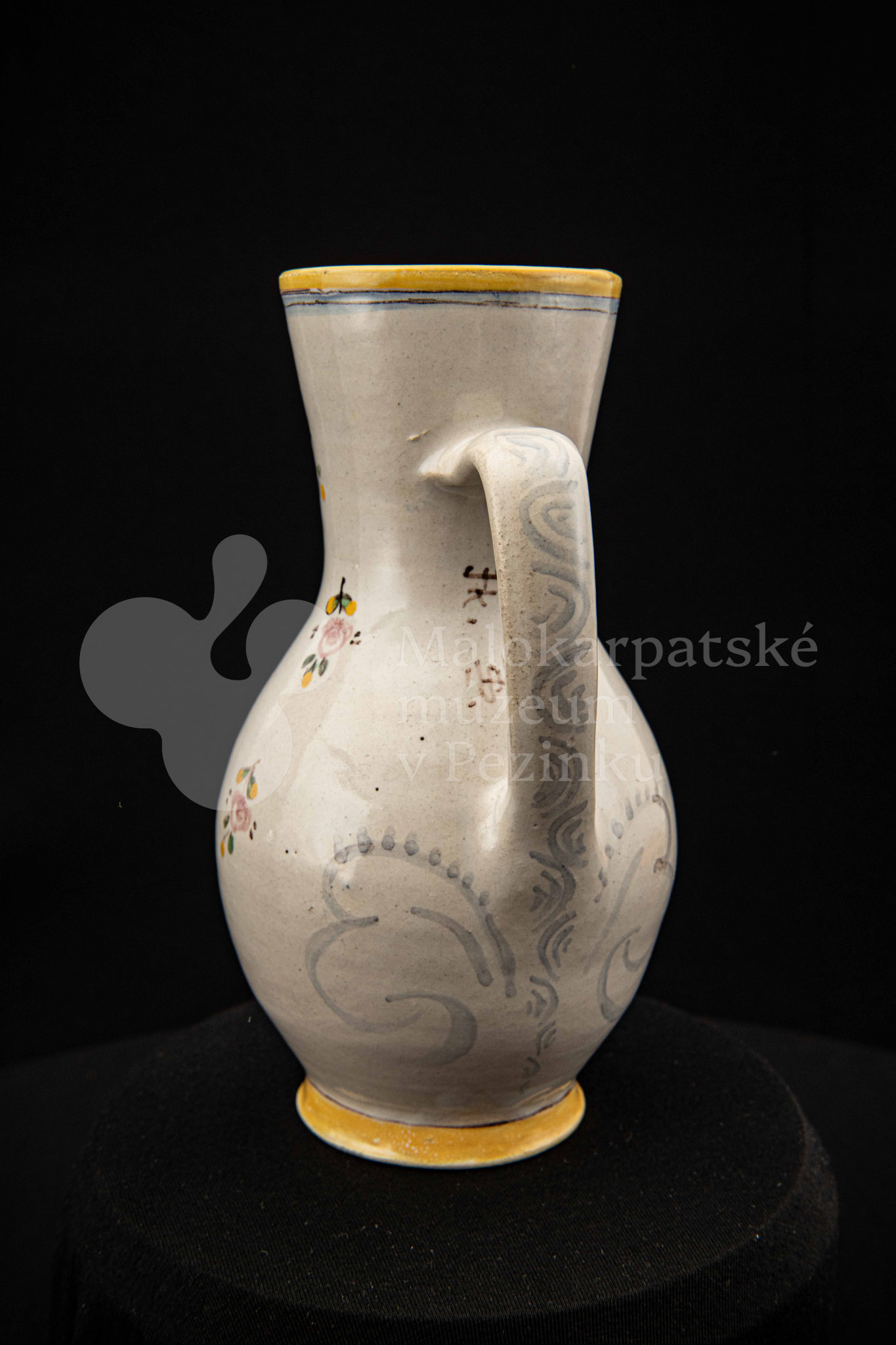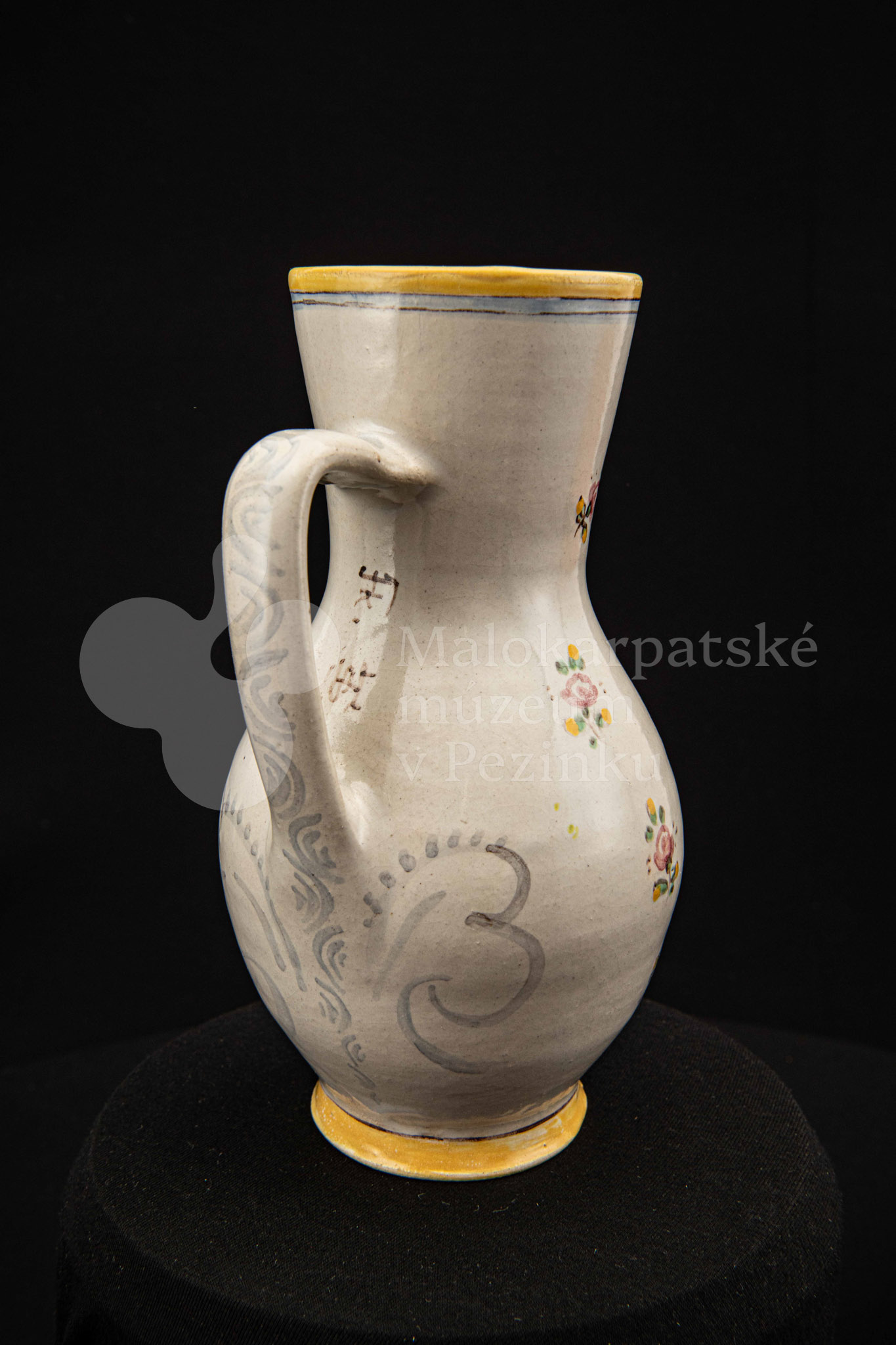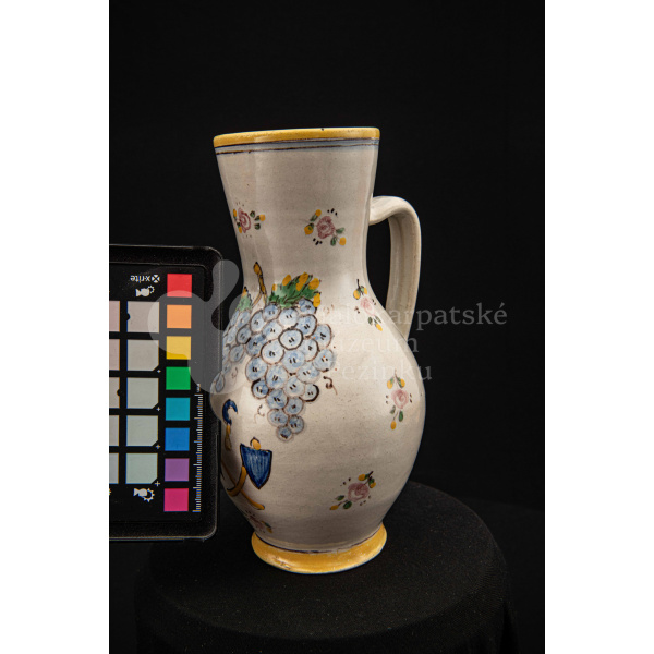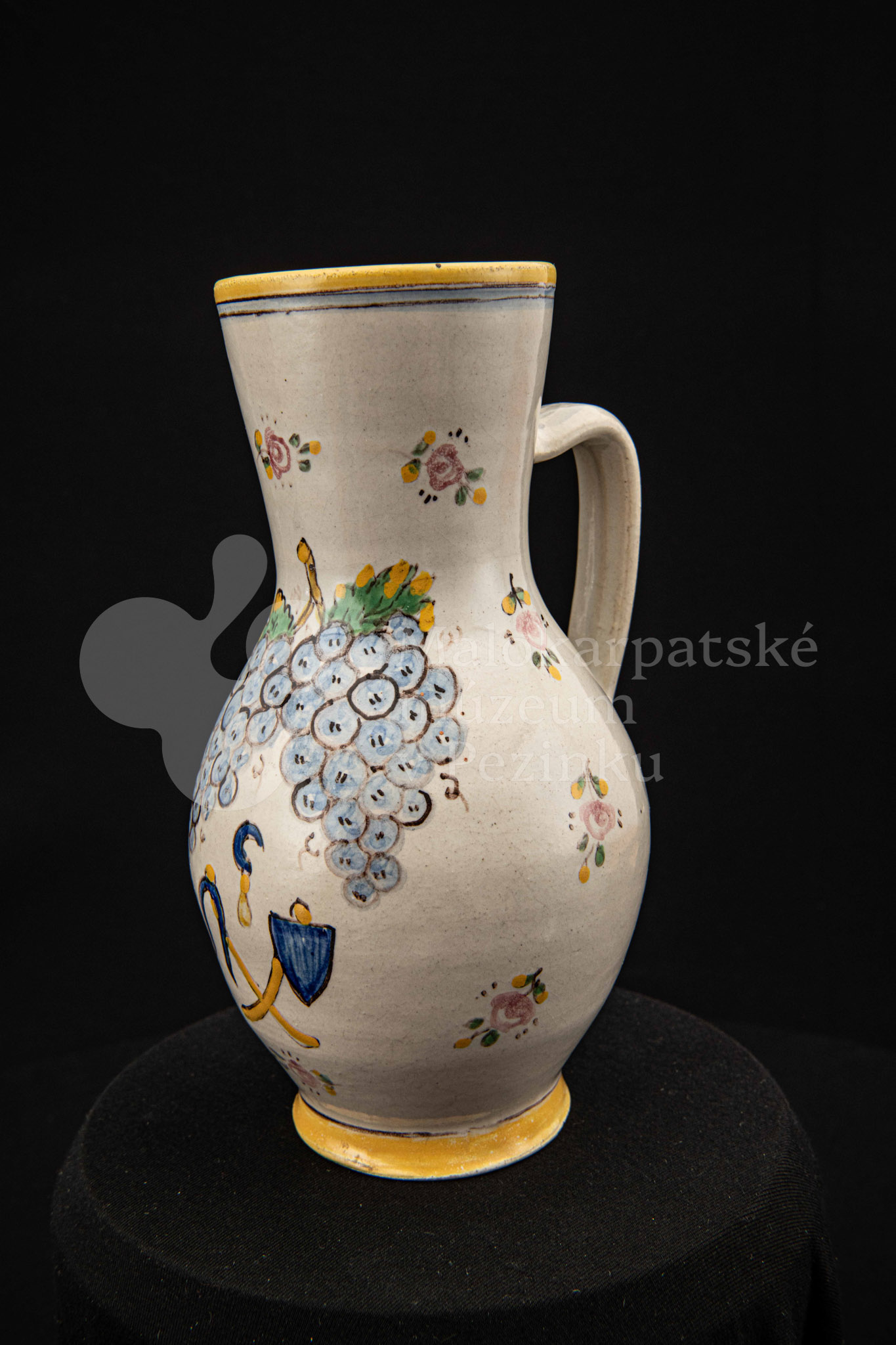 Džbánok fajansový zvaný holba. Po celej ploche bieloglazovaný, vysokožiarový dekor s motívom hrozna a vinohradníckeho náradia. Pod uchom značenie FK.ST.