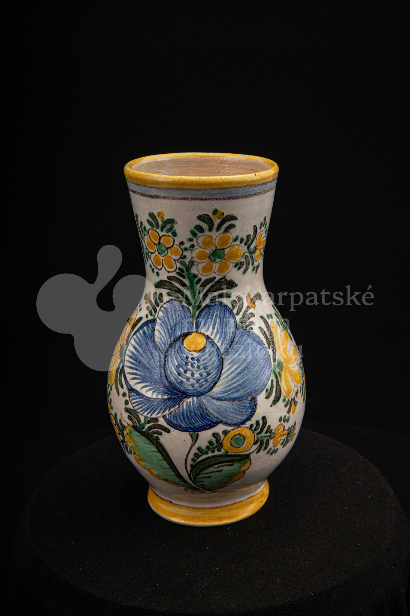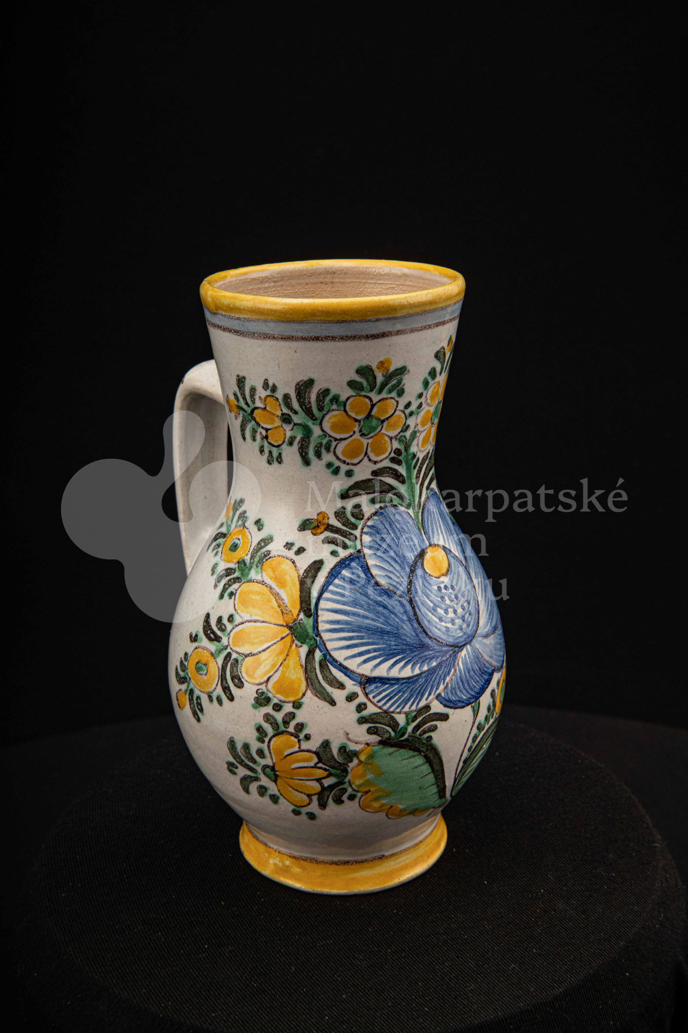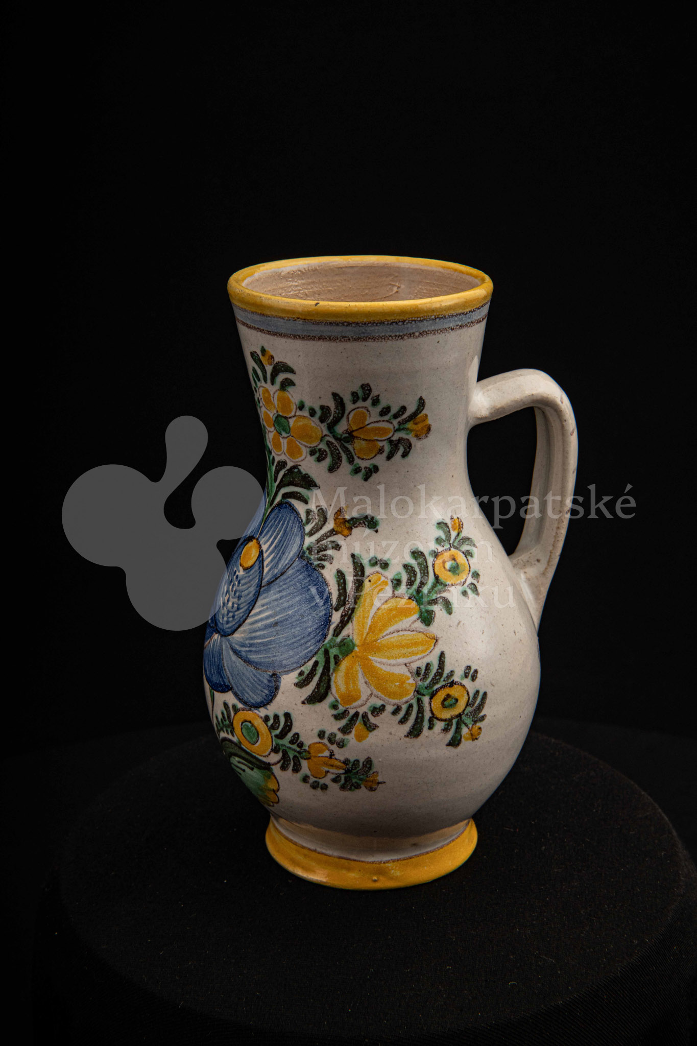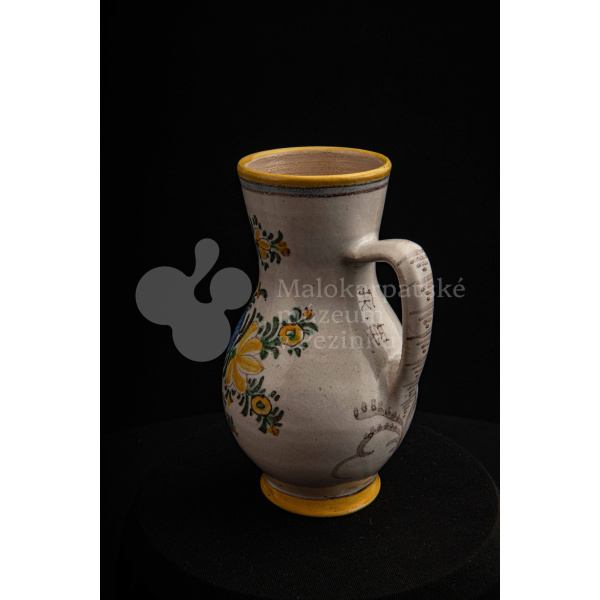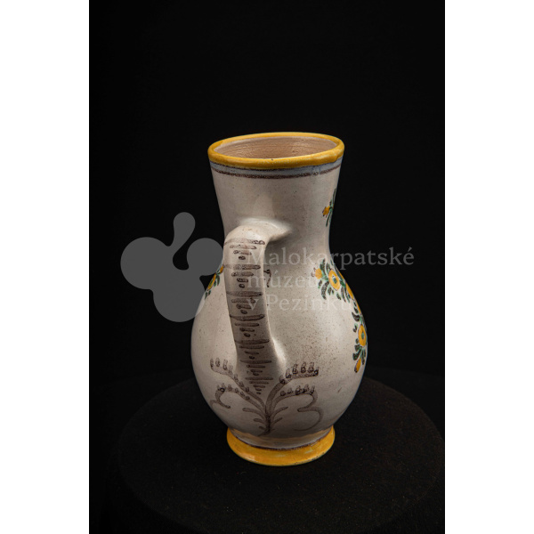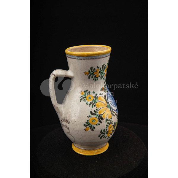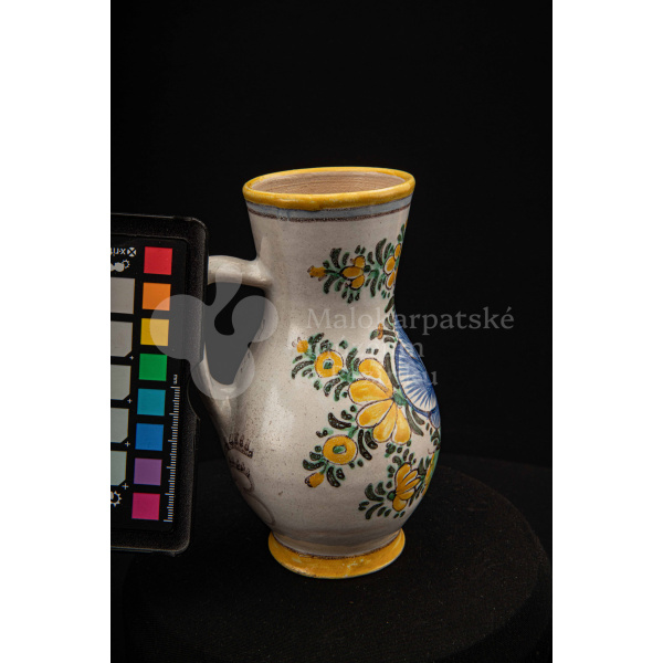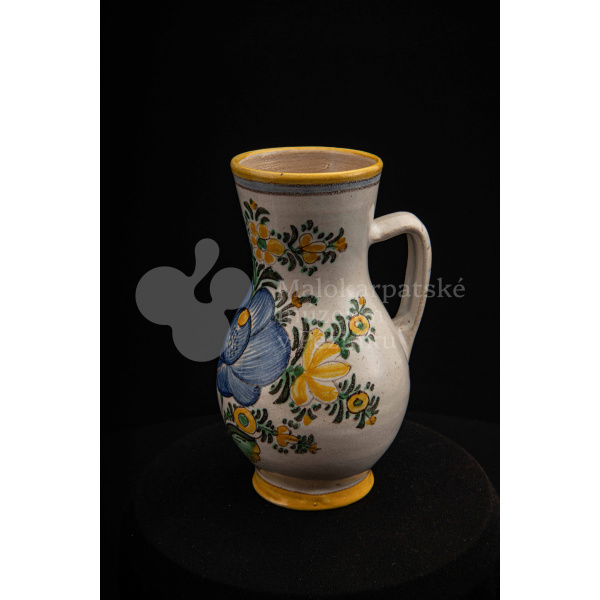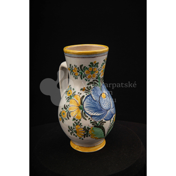 Džbánok fajansový zvaný „žajdlík“. Po celej ploche bieloglazovaný, vysokožiarový rôznofarebný dekor s motívom modrej ruže. Pod uchom značenie FK.ST.