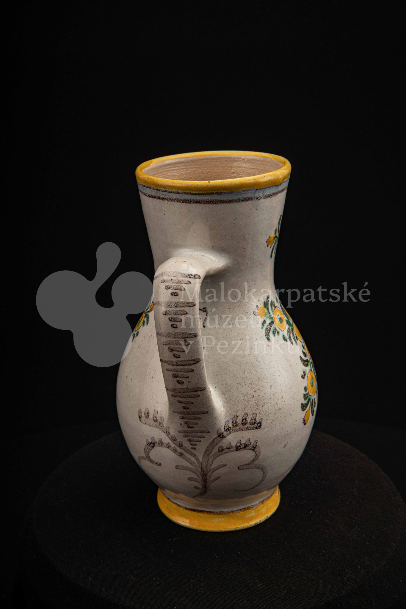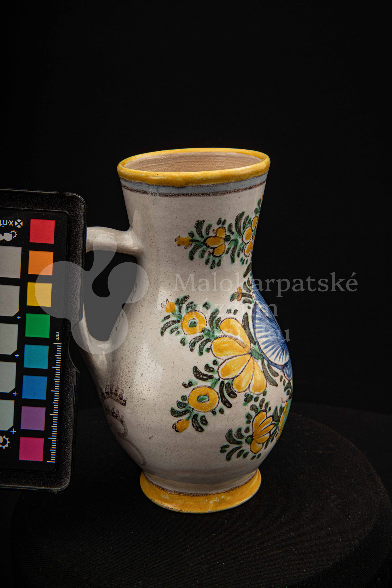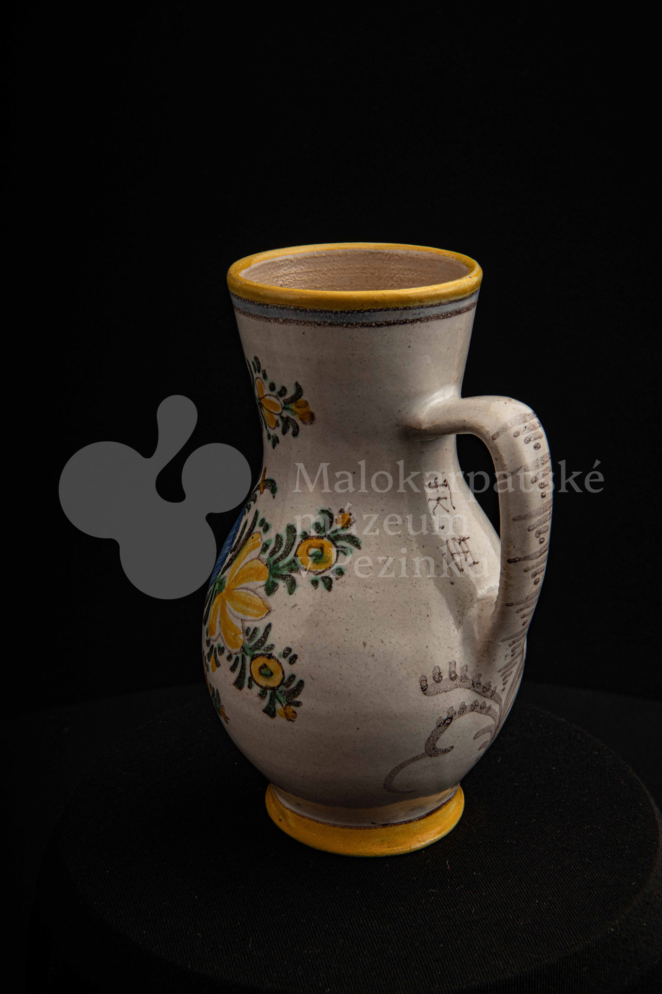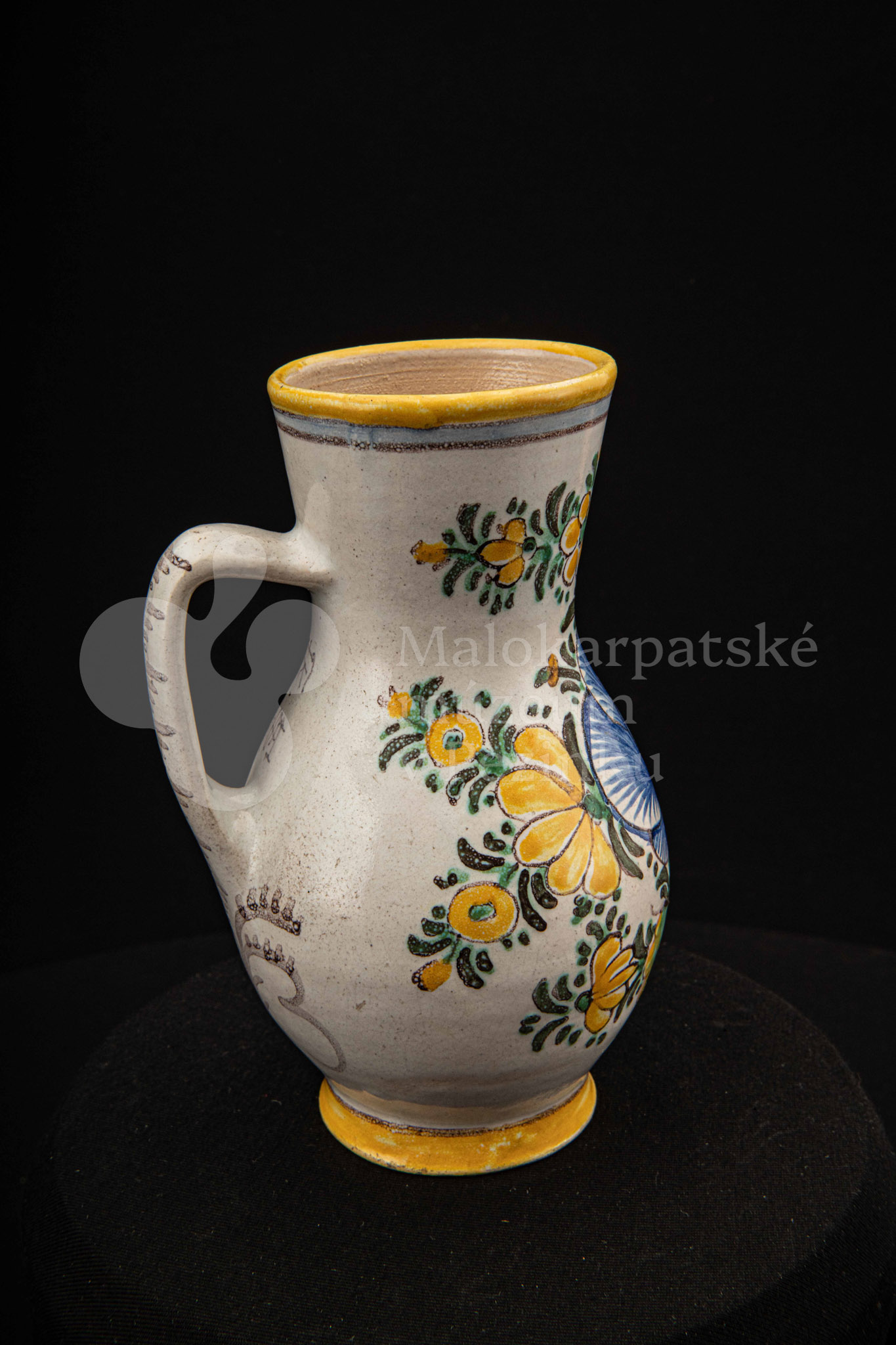 Džbánok fajansový zvaný „žajdlík“. Po celej ploche bieloglazovaný, vysokožiarový rôznofarebný dekor s motívom modrej ruže. Pod uchom značenie FK.ST.