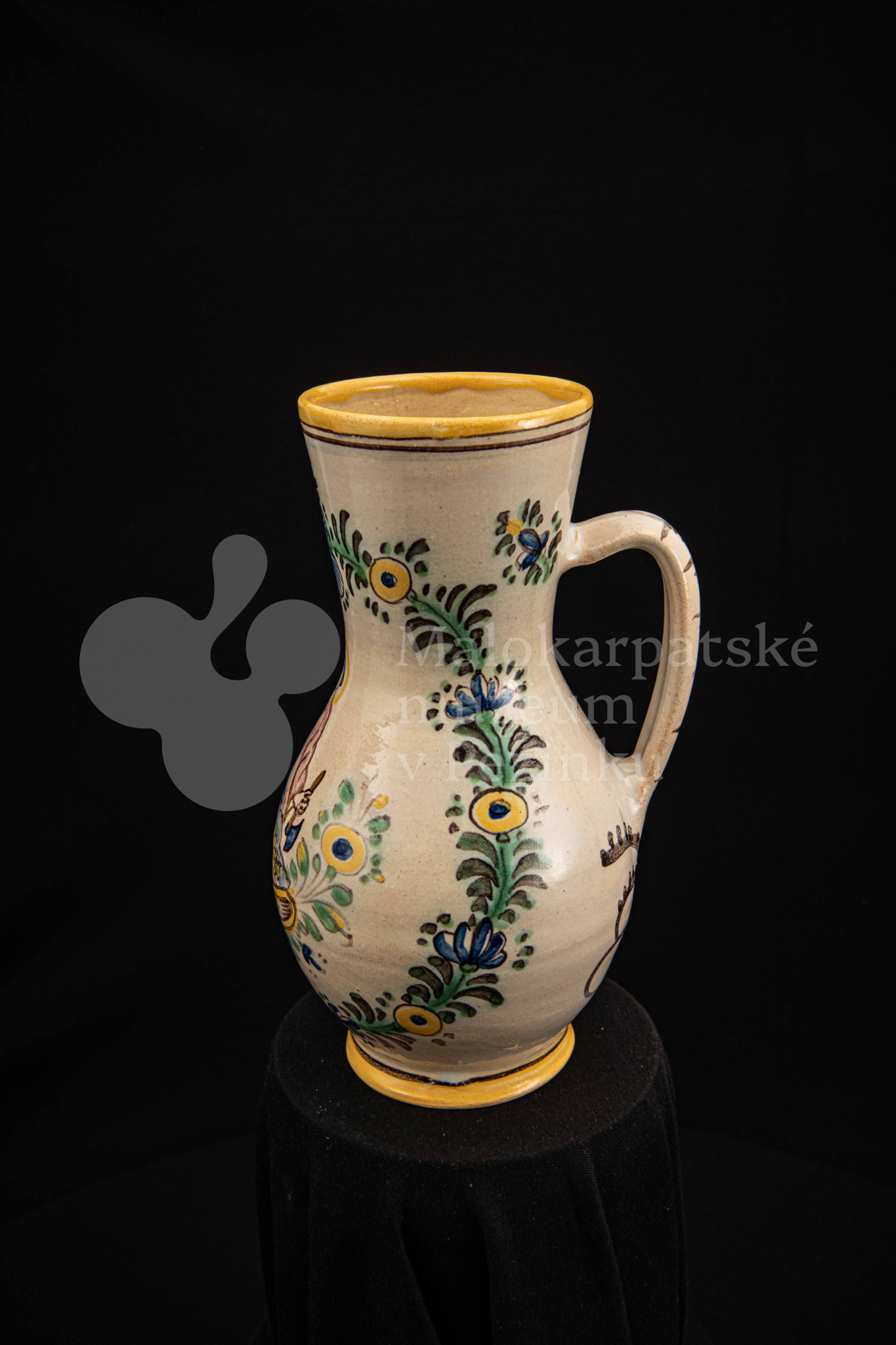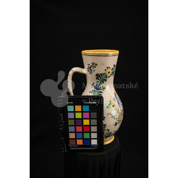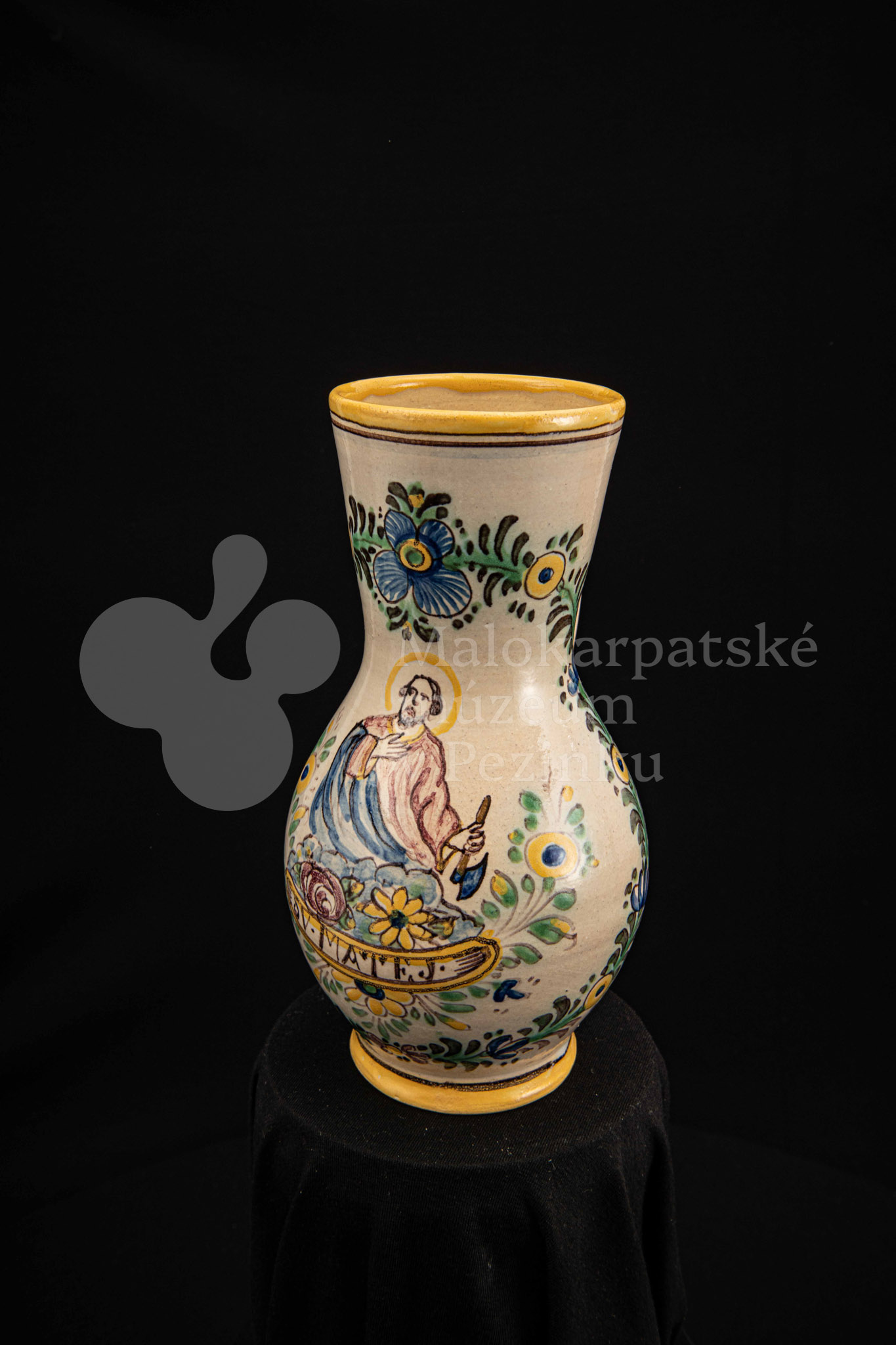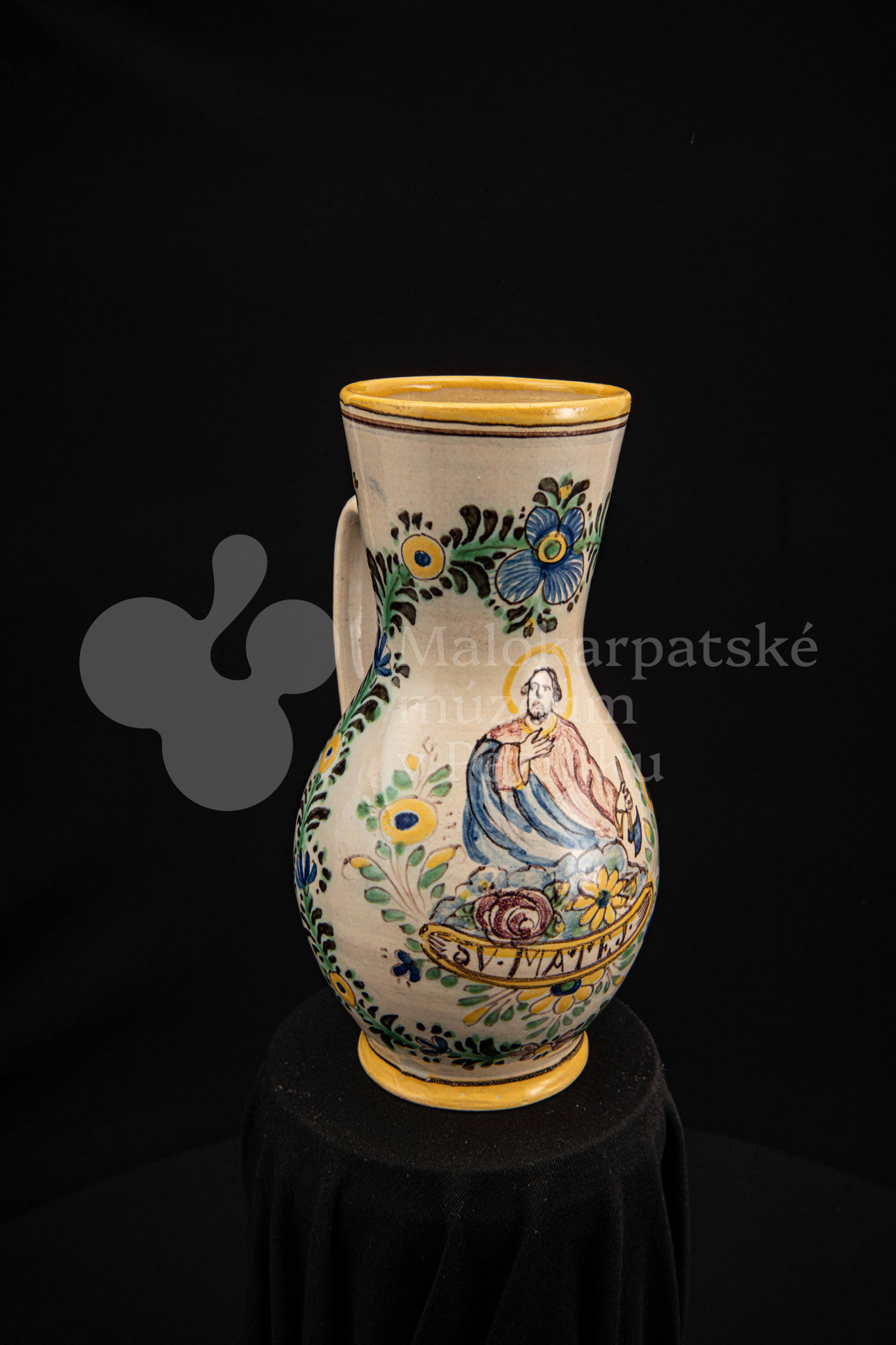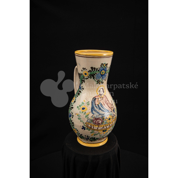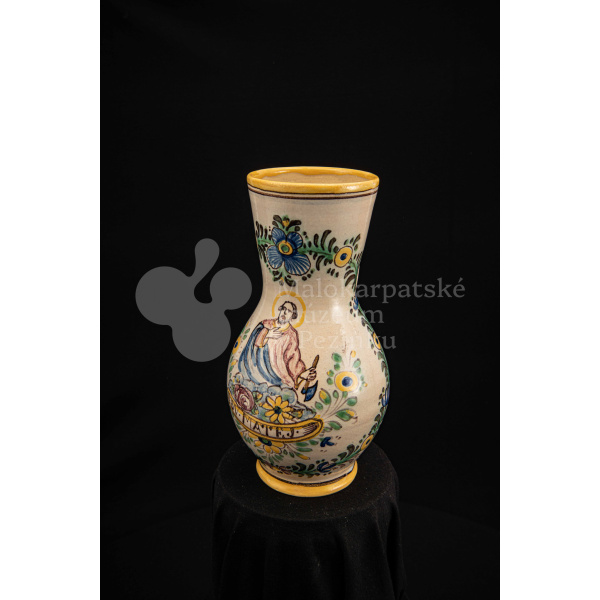 Džbánok fajansový – v strede stojaca postava apoštola držiaceho v pravej ruke sekeru. Pod ním nápis „SV.MATEJ“, okolo neho kvetinový veniec. Bielo glazovaný, rôznofarebný vysokožiarový dekor. Pod uchom značenie FK.ST.