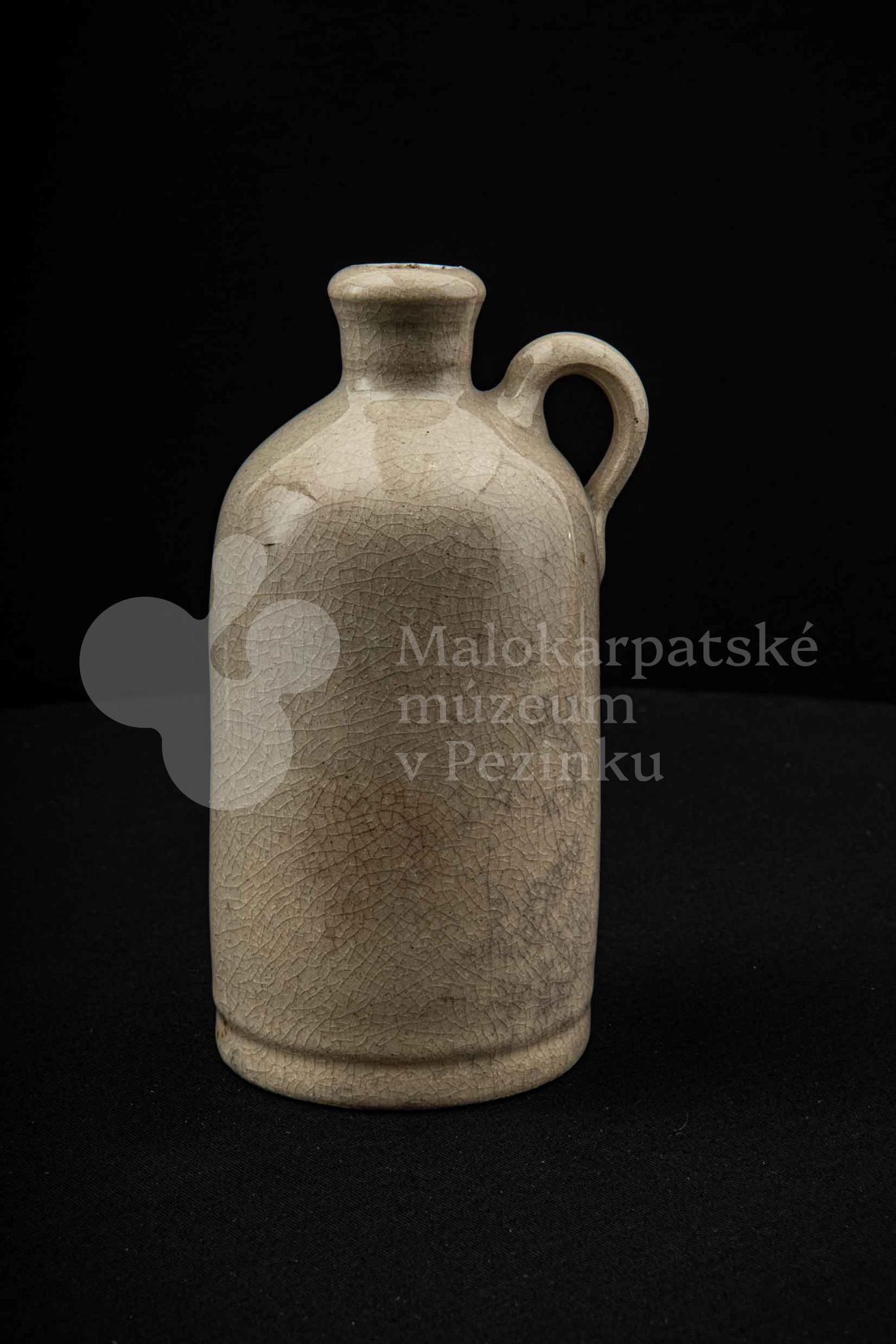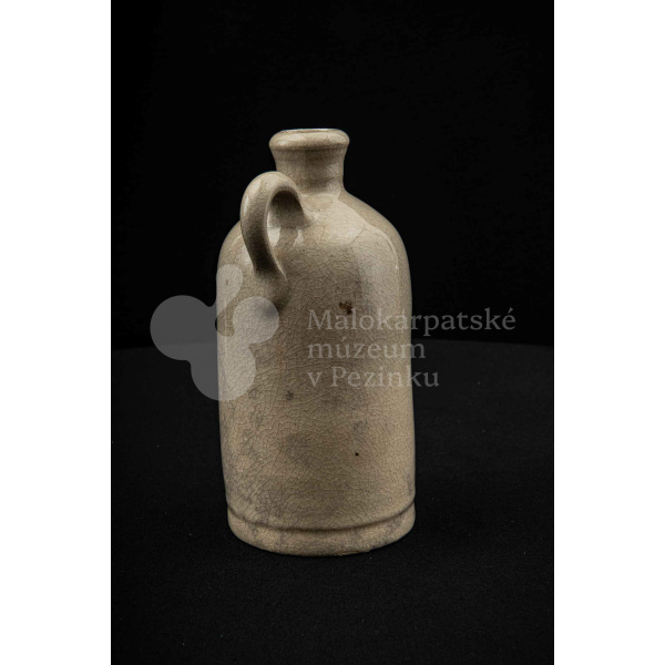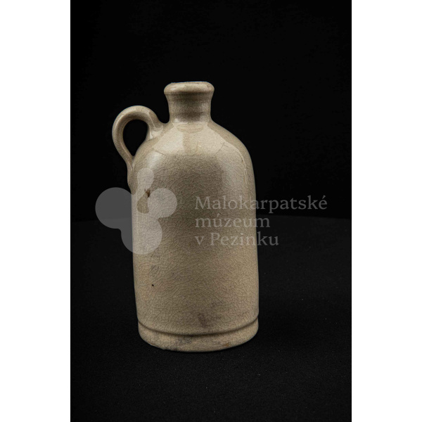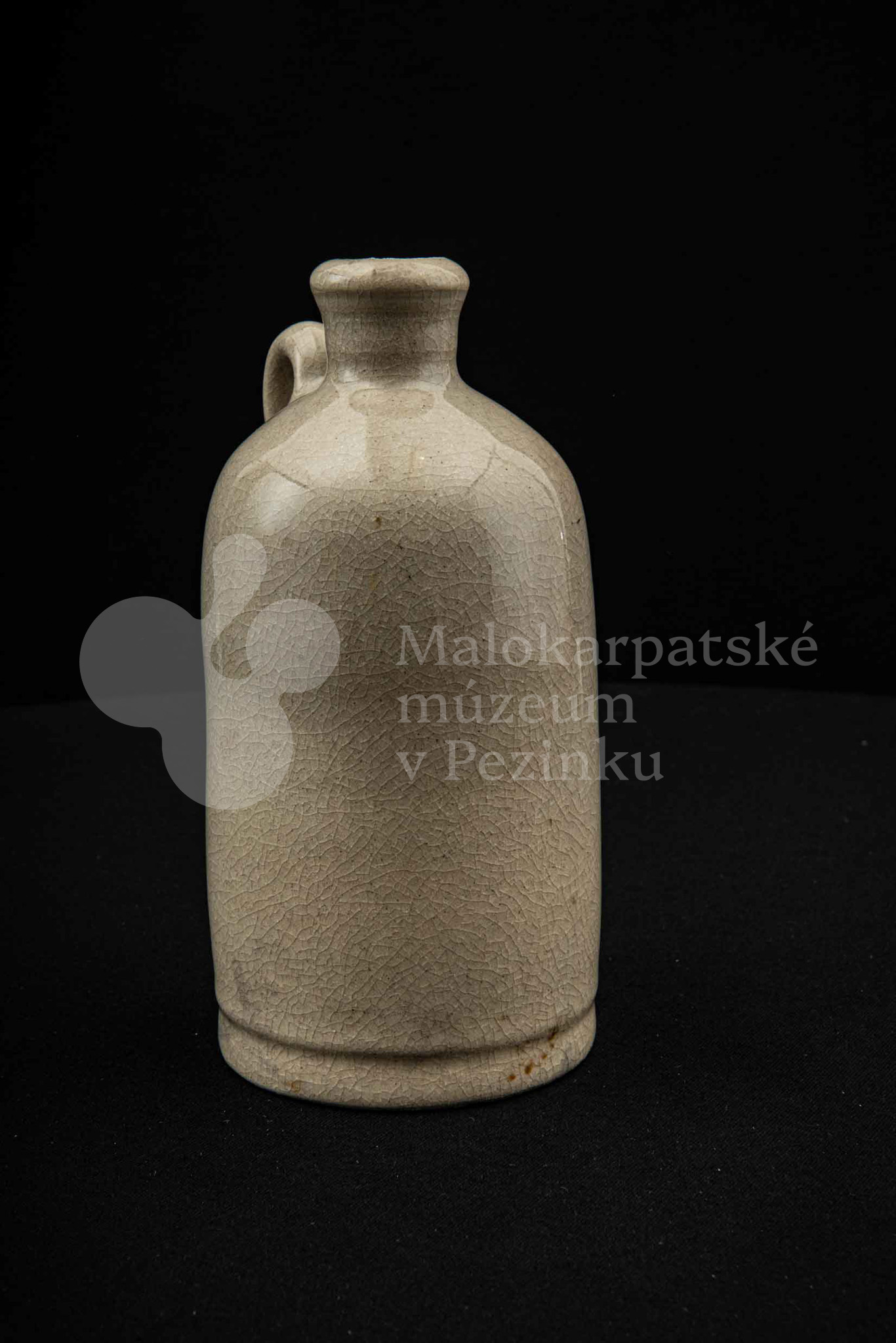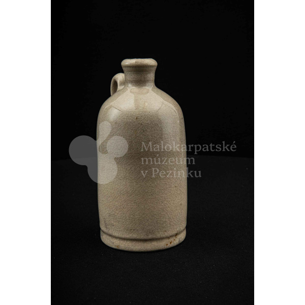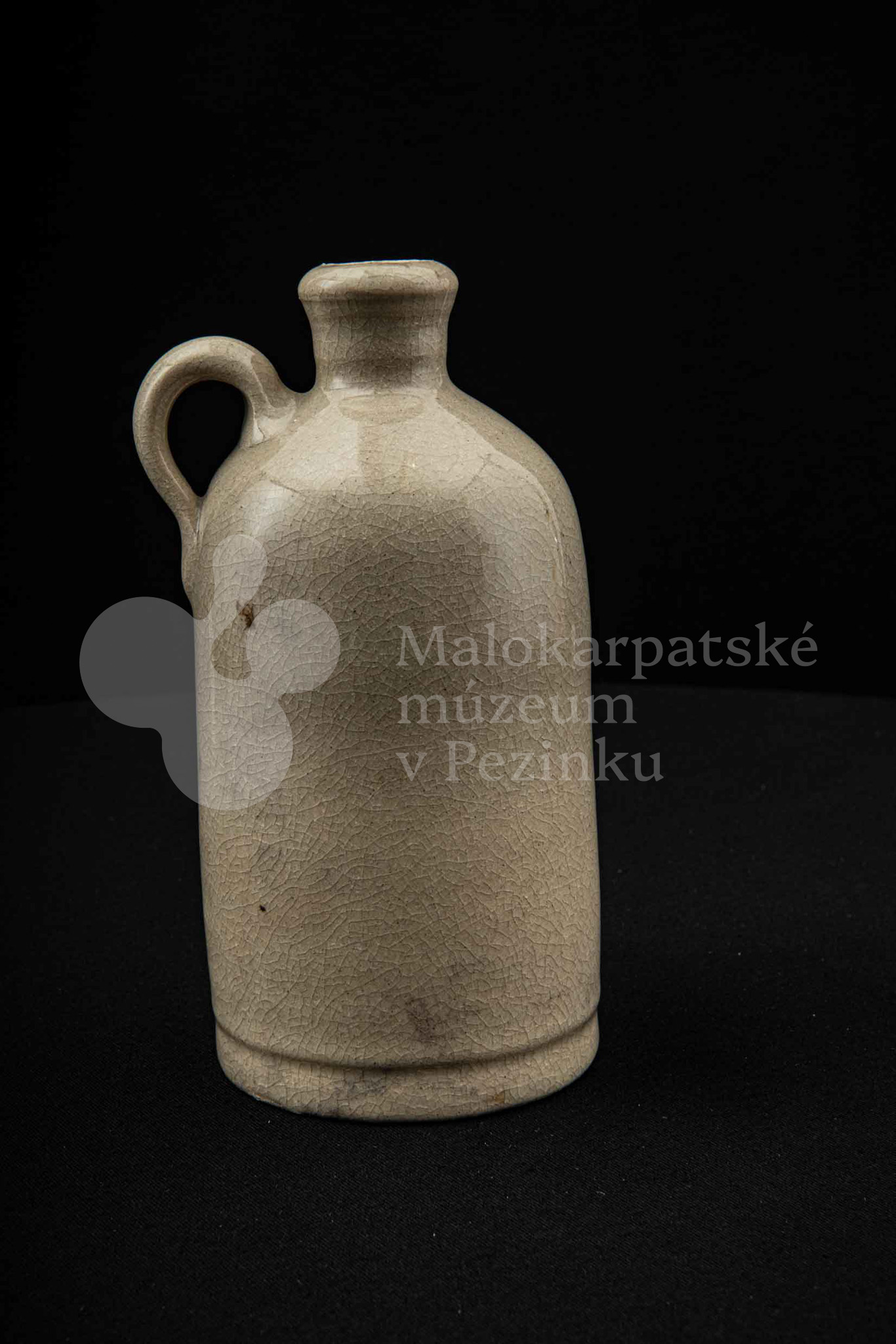 Keramická nádoba valcového tvaru rovného s jedným uchom a úzkym hrdlom. Dolu zdobená plastickým vrúbkom. Po celej ploche bieloglazovaná. Bez značenia. Pochádza z 18. storočia.