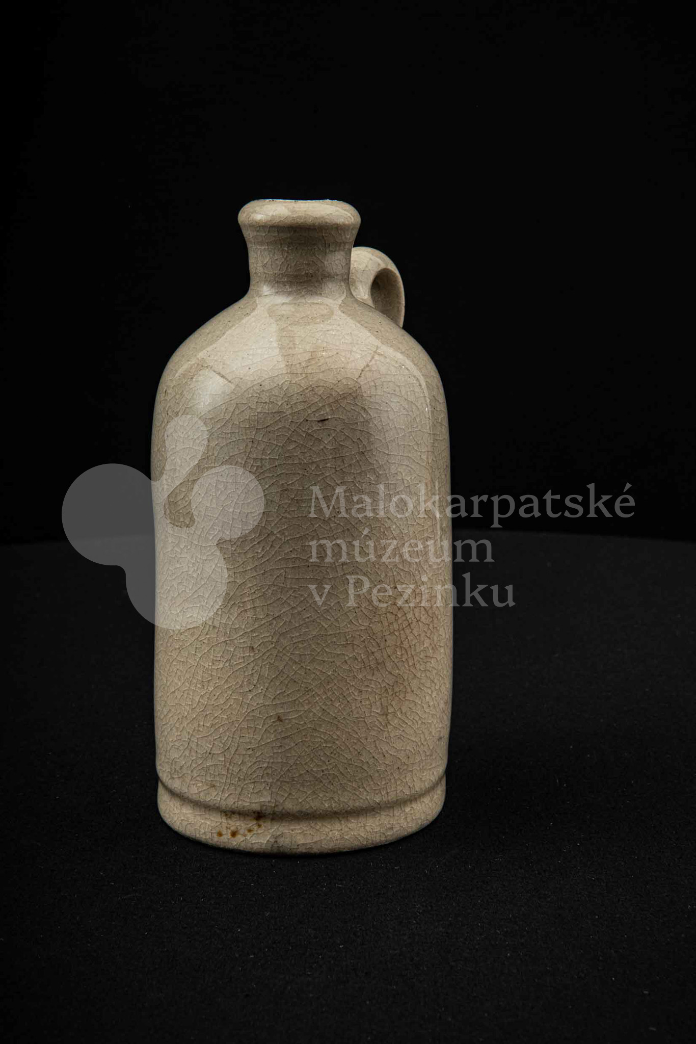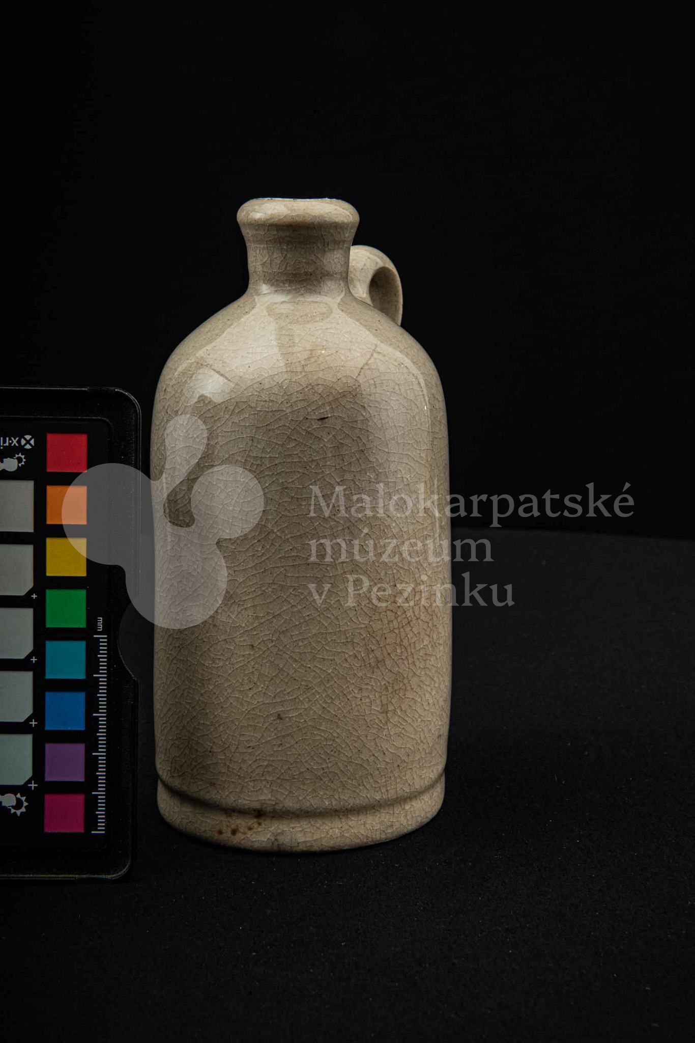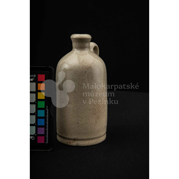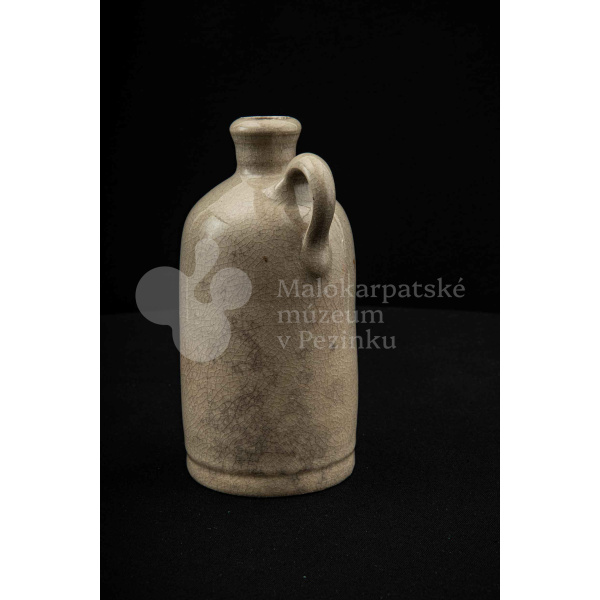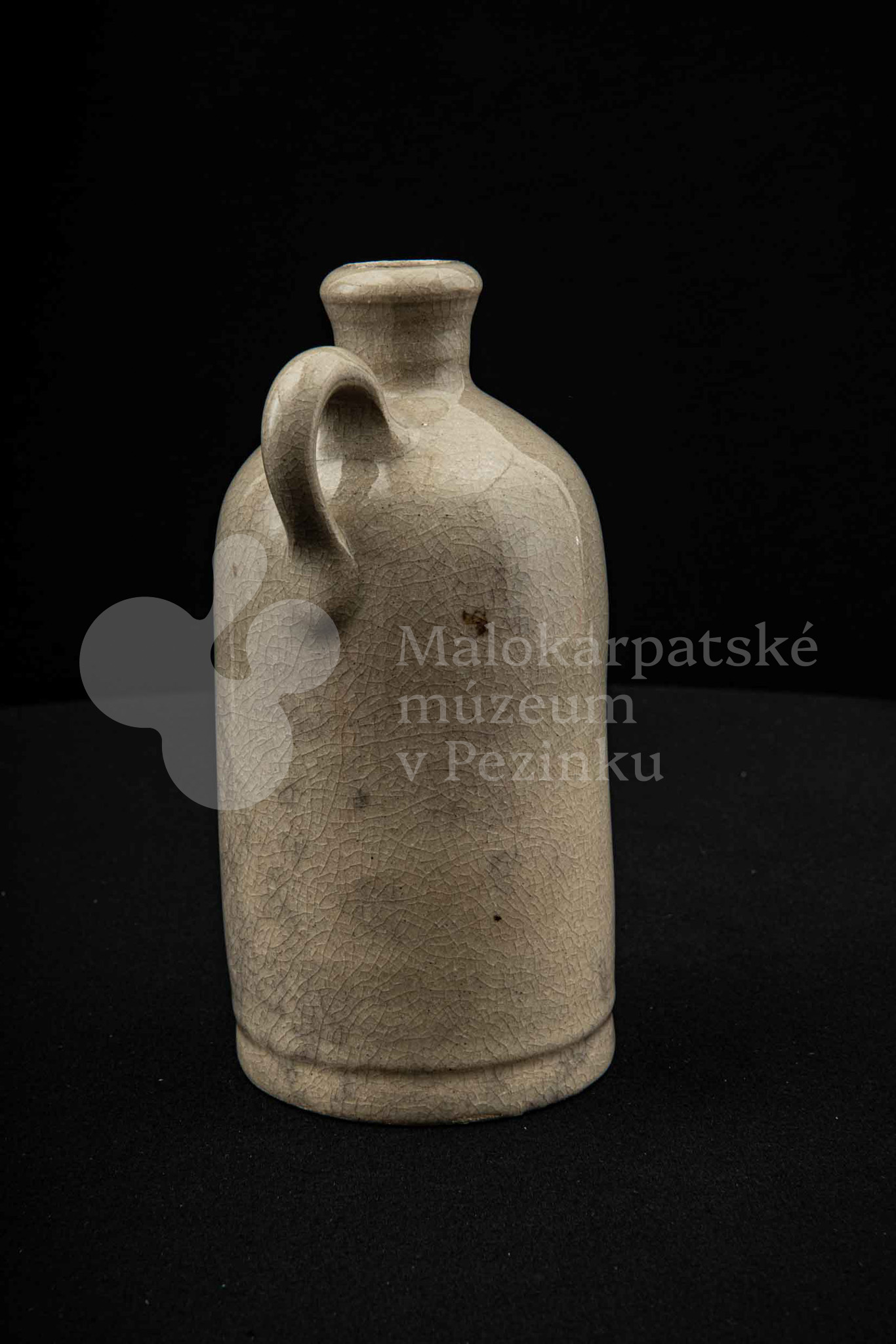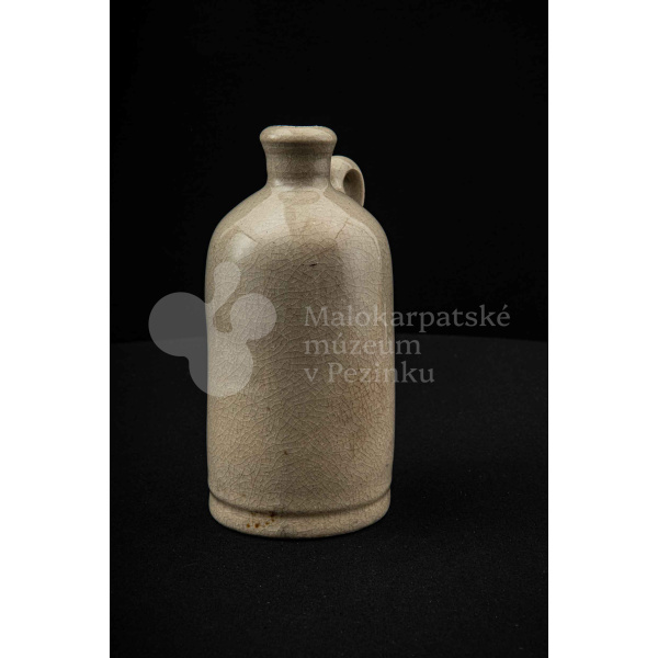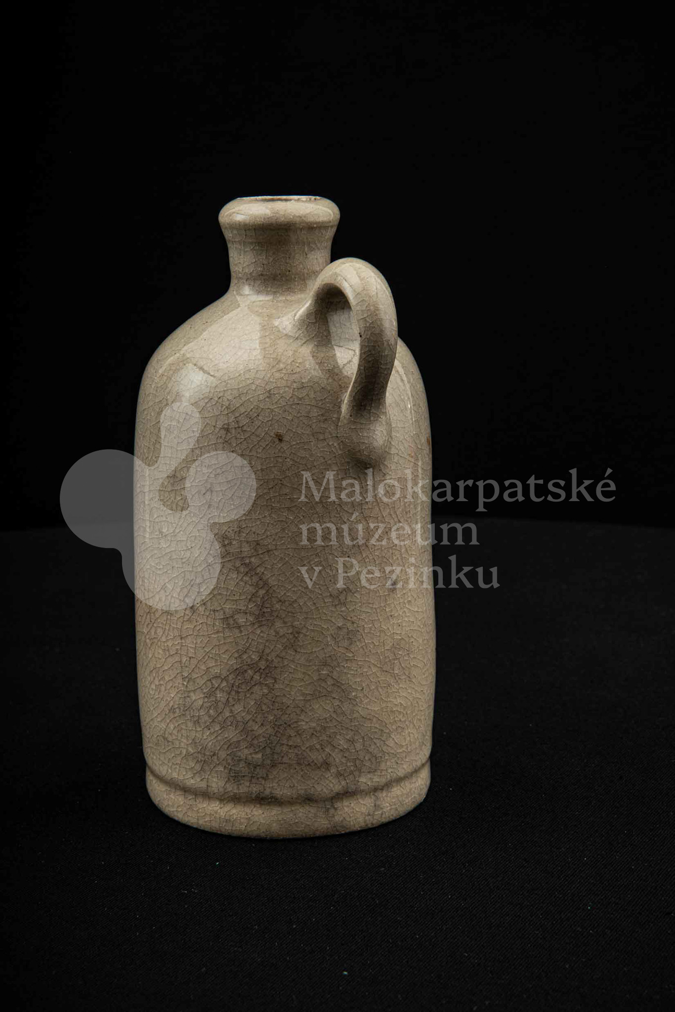Keramická nádoba valcového tvaru rovného s jedným uchom a úzkym hrdlom. Dolu zdobená plastickým vrúbkom. Po celej ploche bieloglazovaná. Bez značenia. Pochádza z 18. storočia.