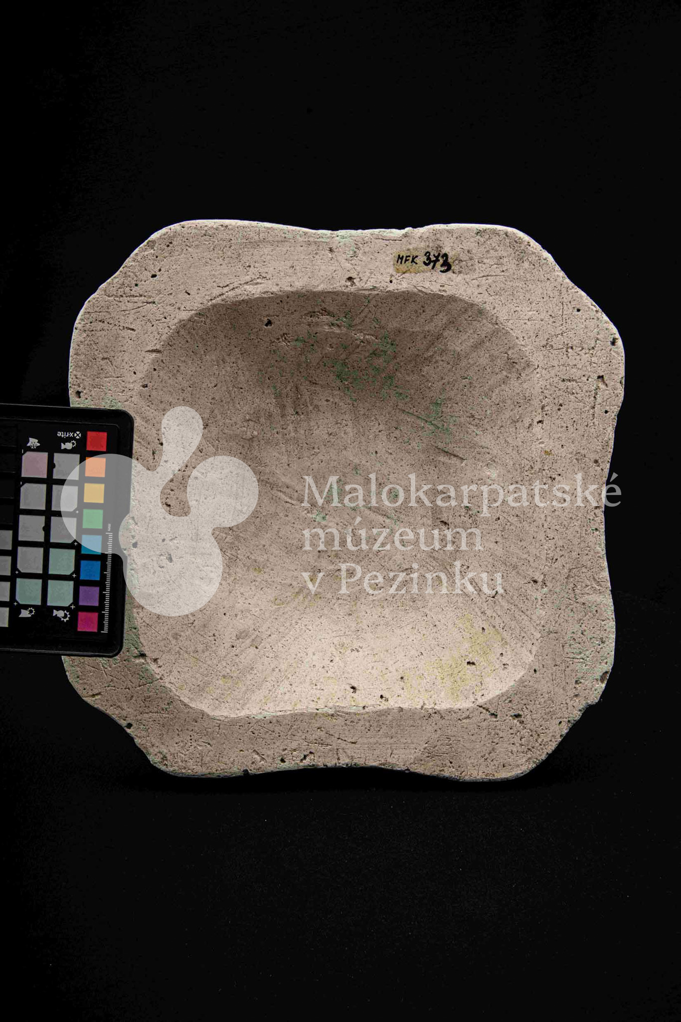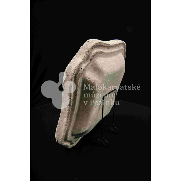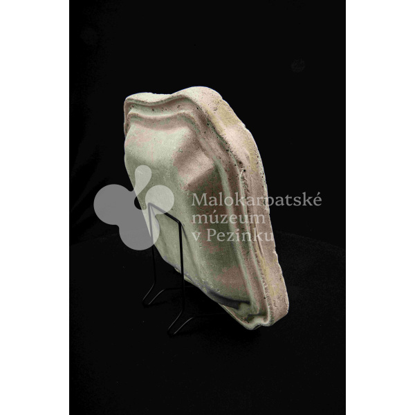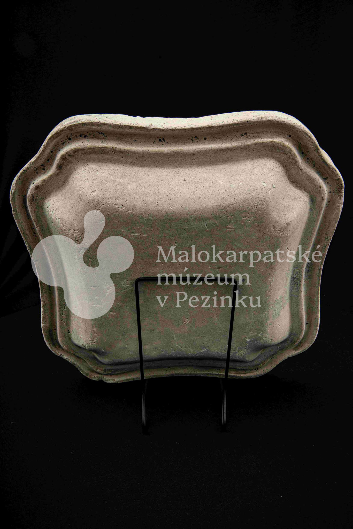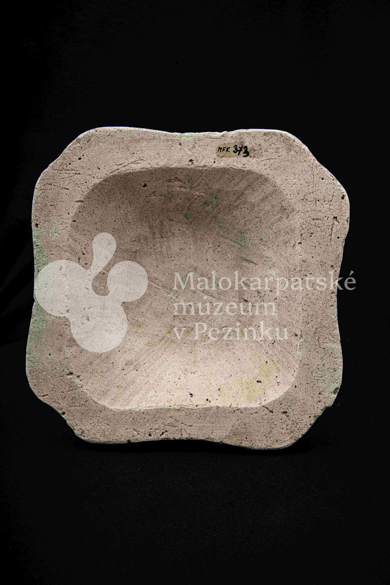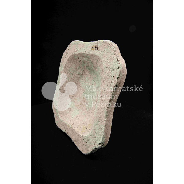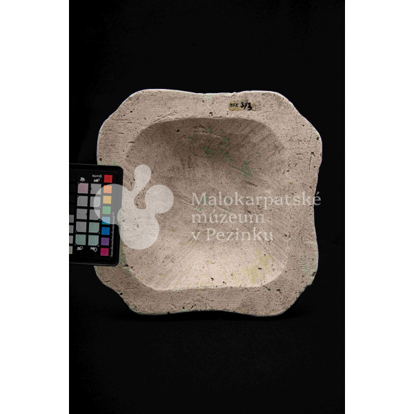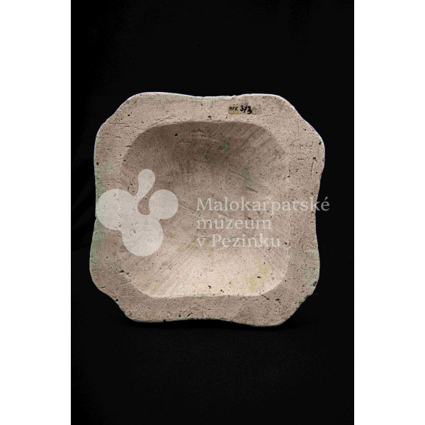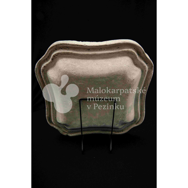 Sadrová forma na štvrohrannú hlbšiu misu, s tvarovaným okrajom. Bez značenia.