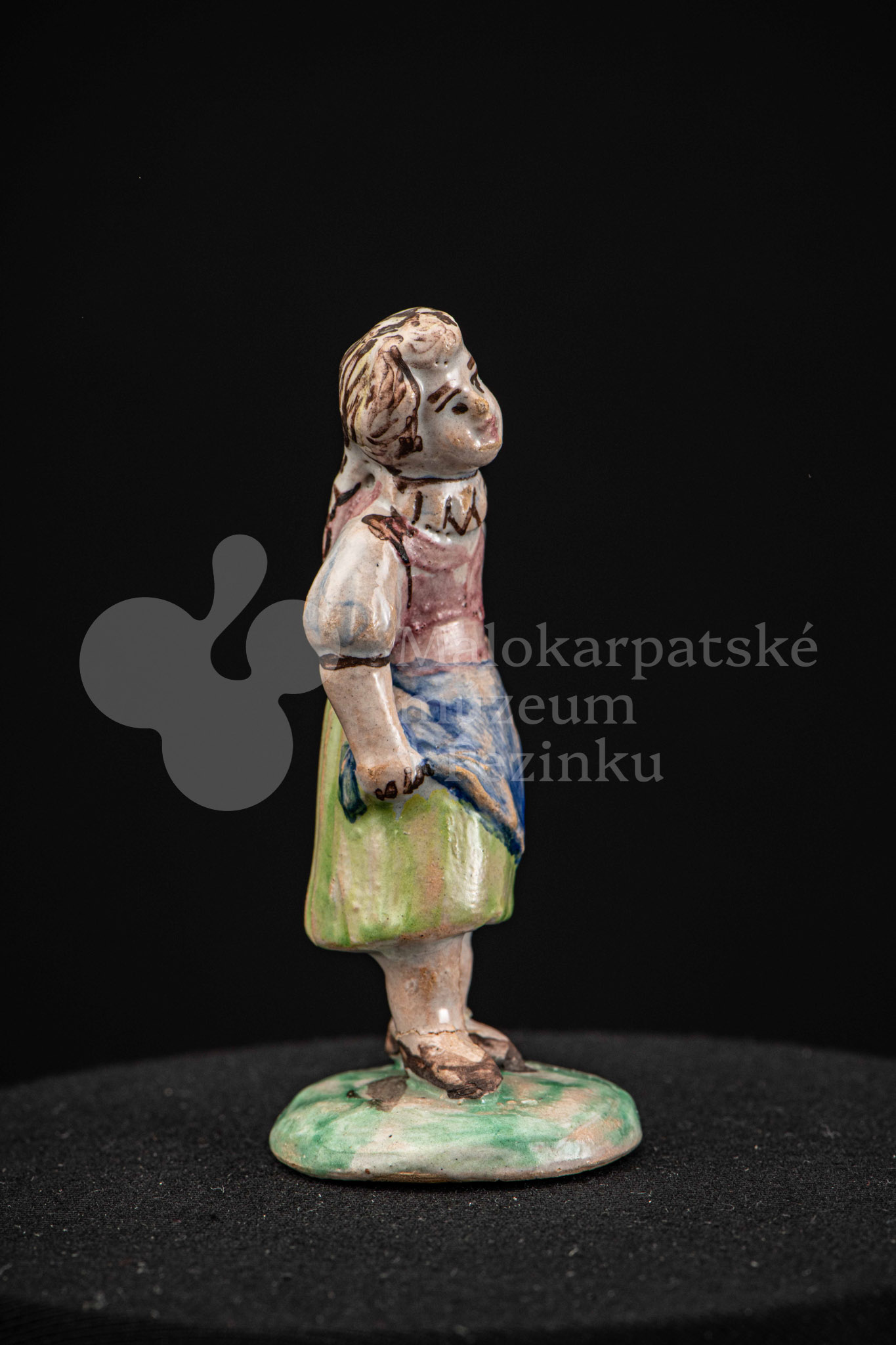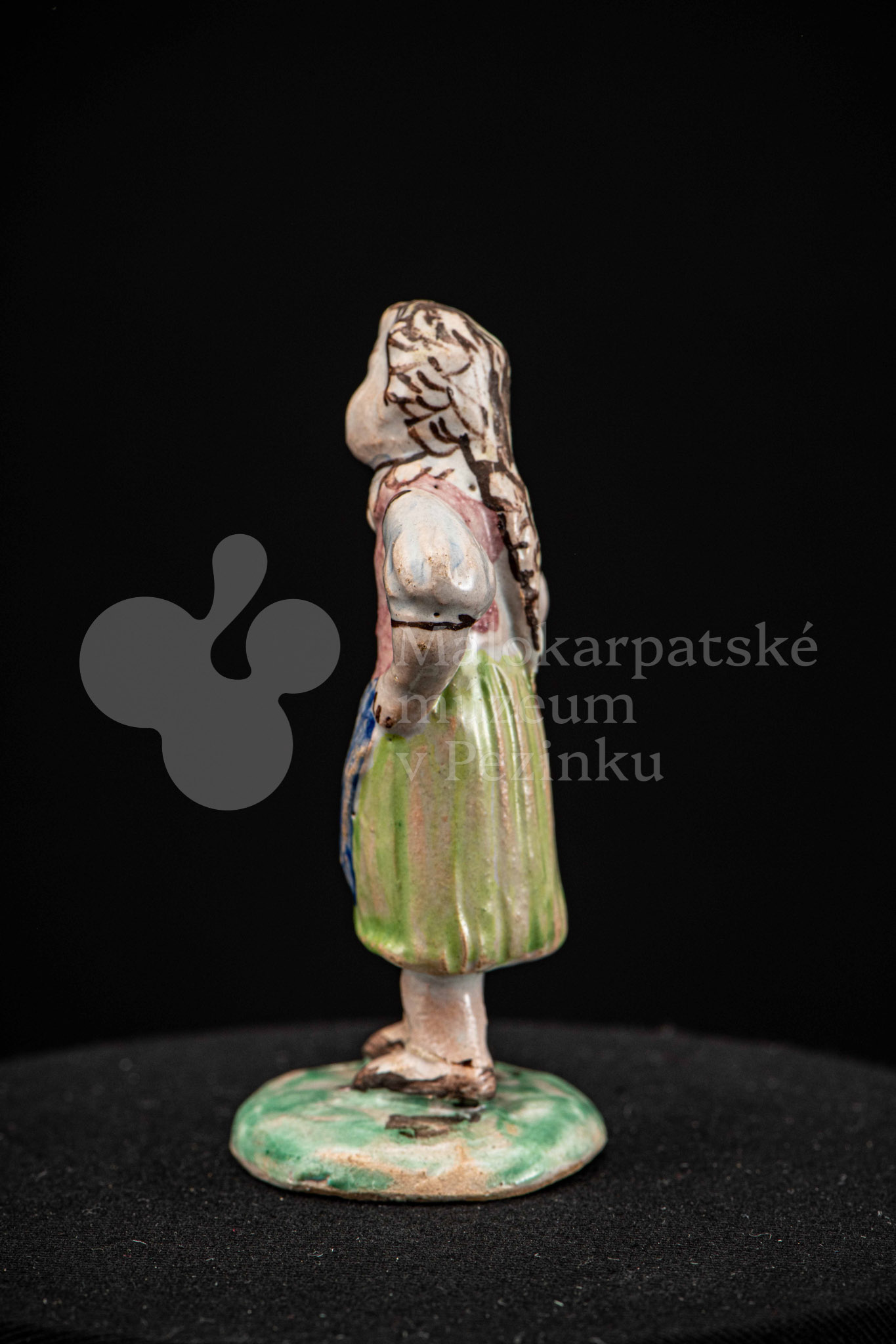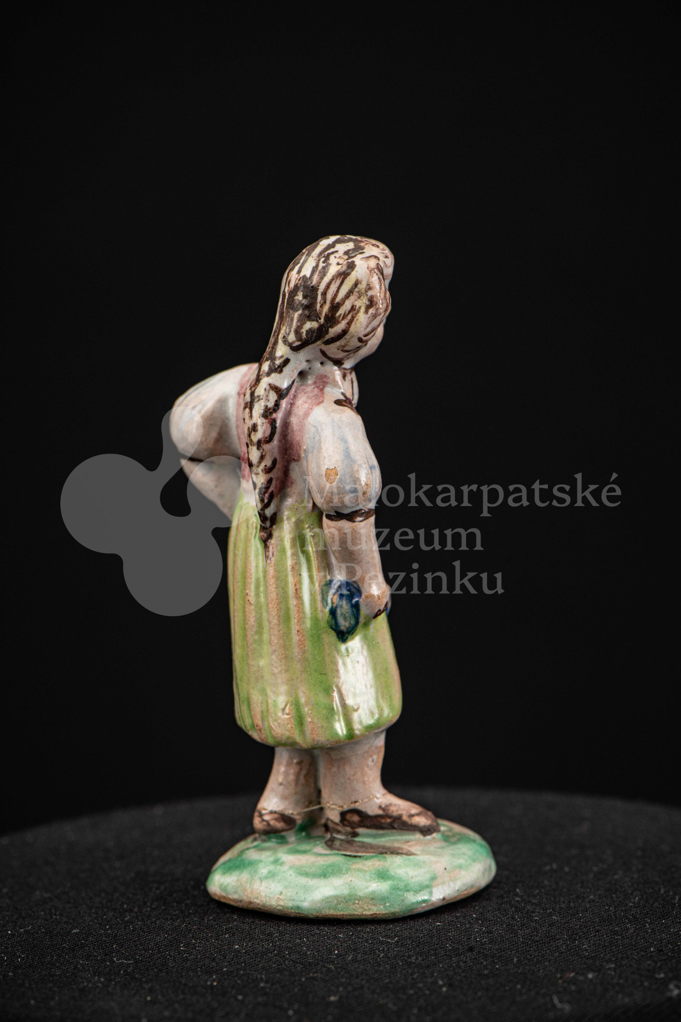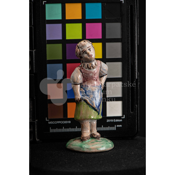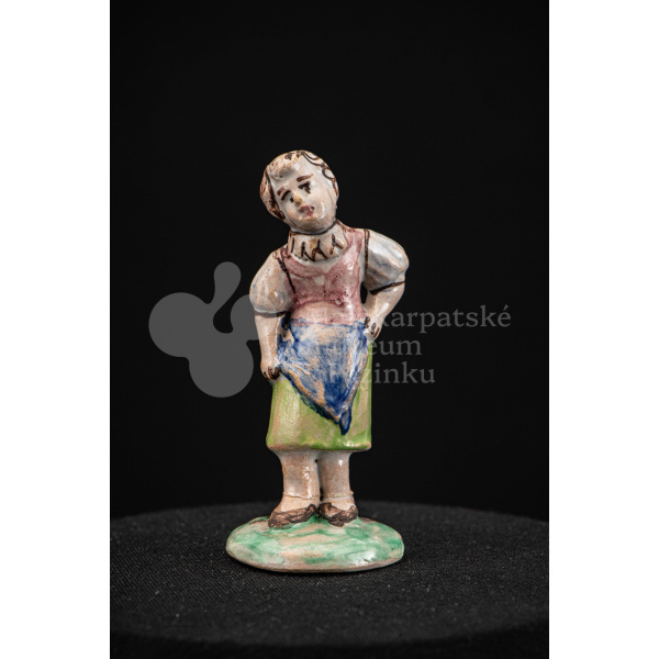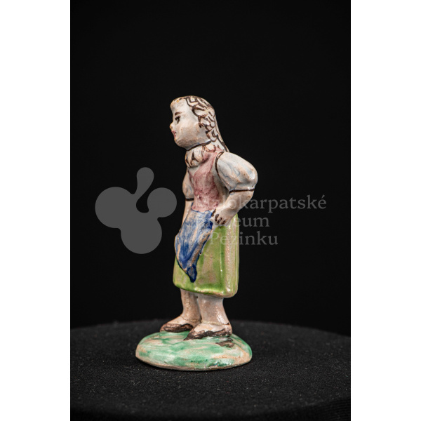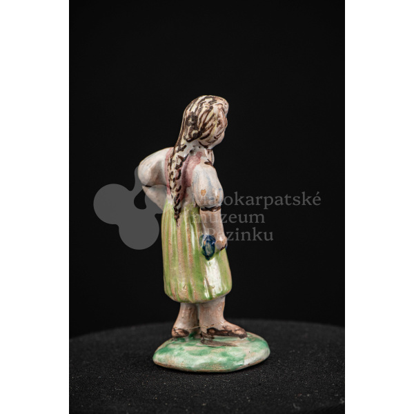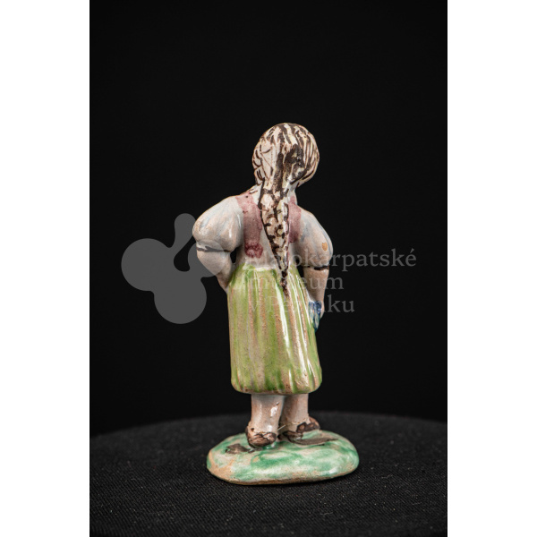 Plastika fajansová – dievča s vrkočom, v kroji pestrých farieb, s ľavou rukou podopretá v bok, stojí na okrúhlom podstavci zelenej farby. Na rube podstavca je značenie FK.ST.