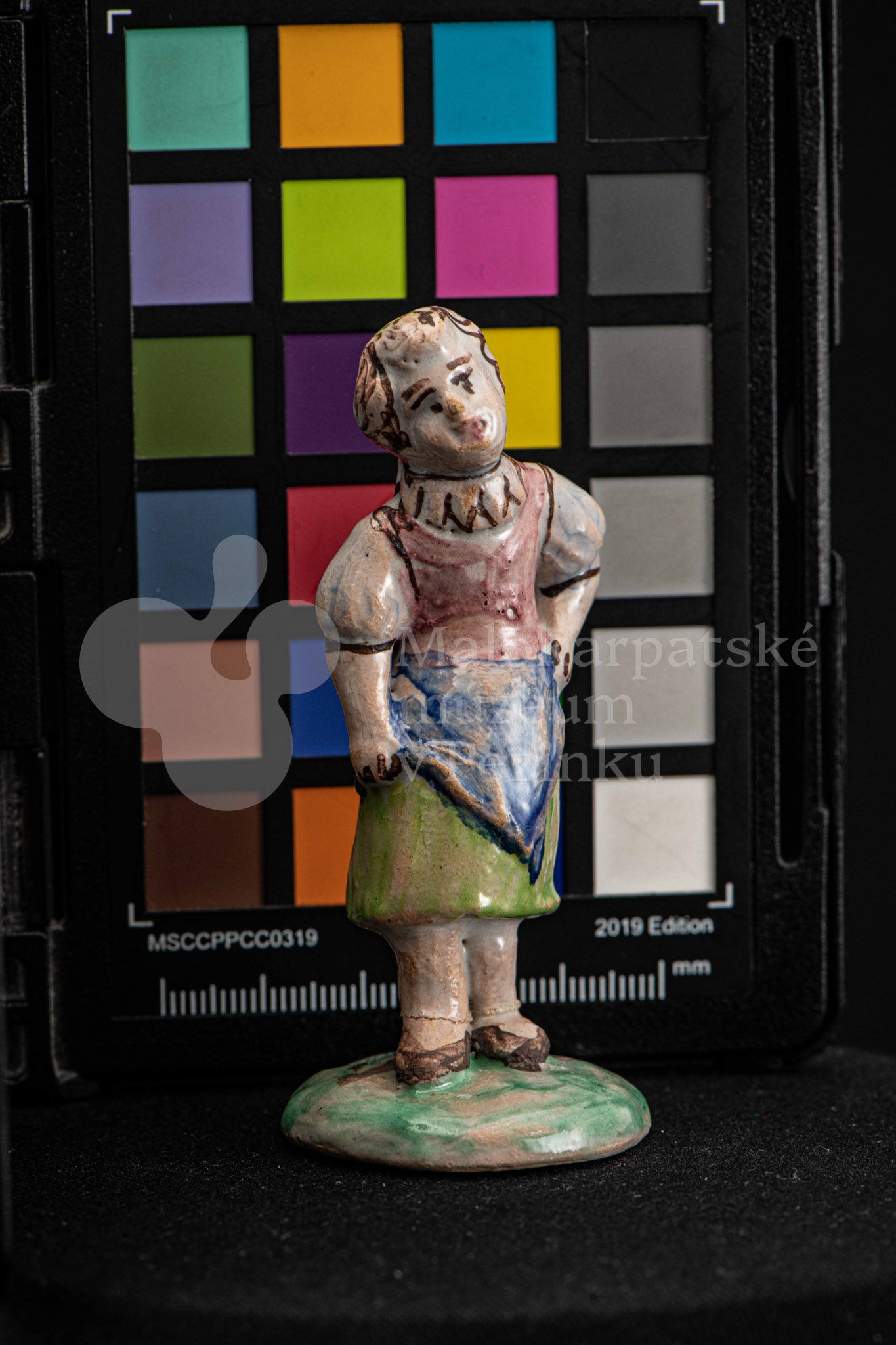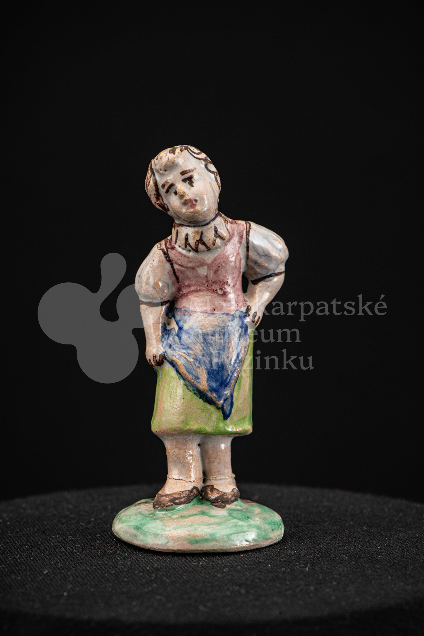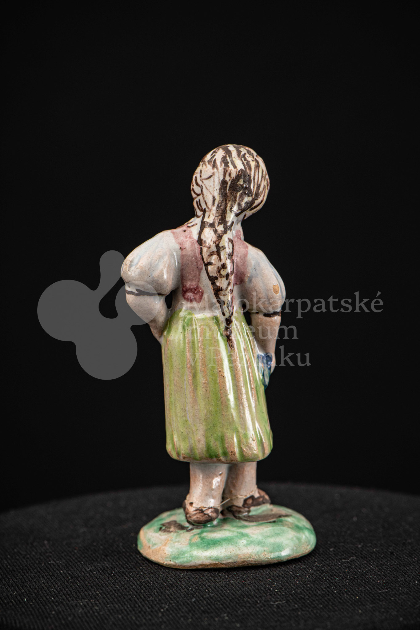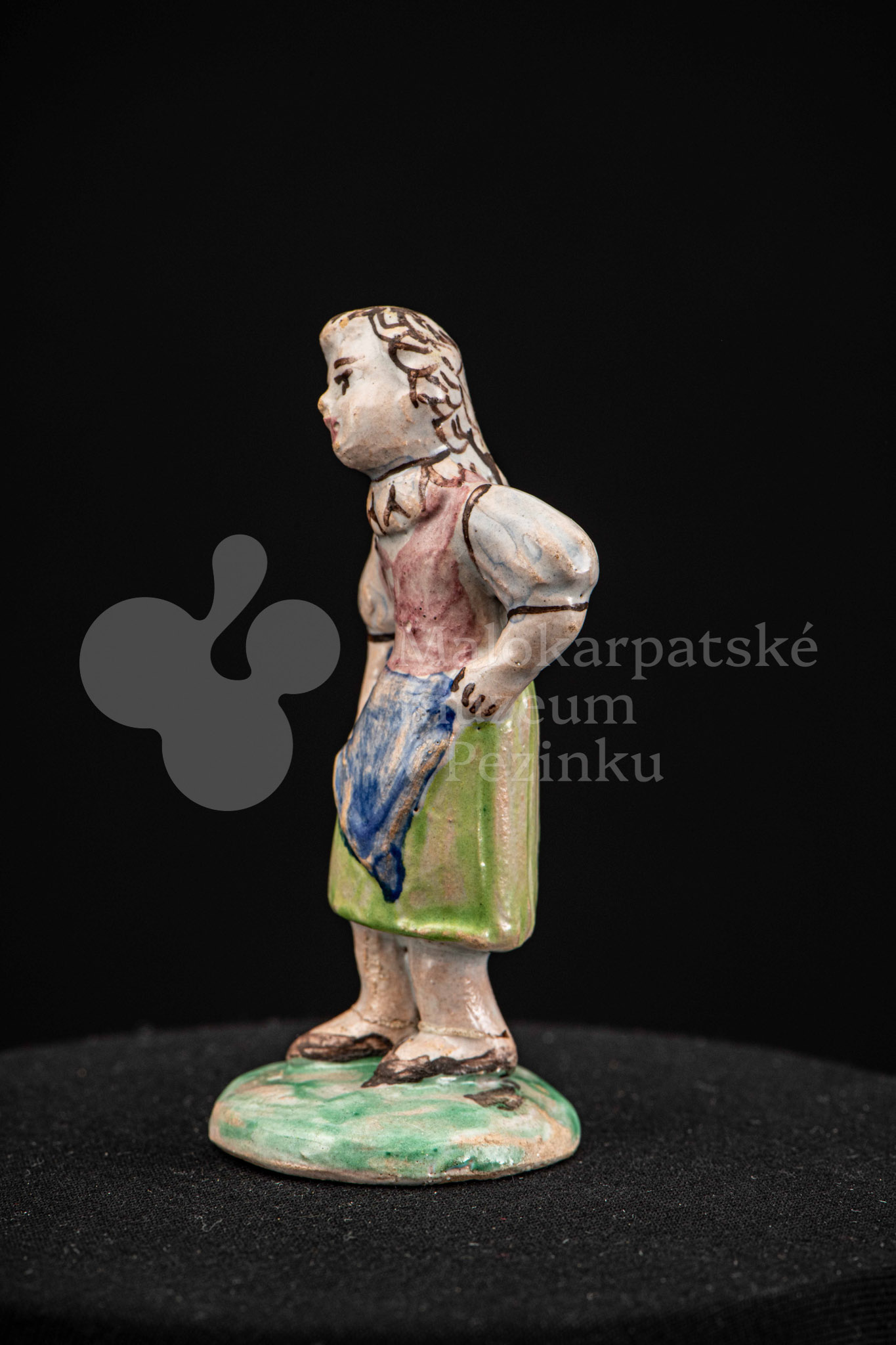 Plastika fajansová – dievča s vrkočom, v kroji pestrých farieb, s ľavou rukou podopretá v bok, stojí na okrúhlom podstavci zelenej farby. Na rube podstavca je značenie FK.ST.