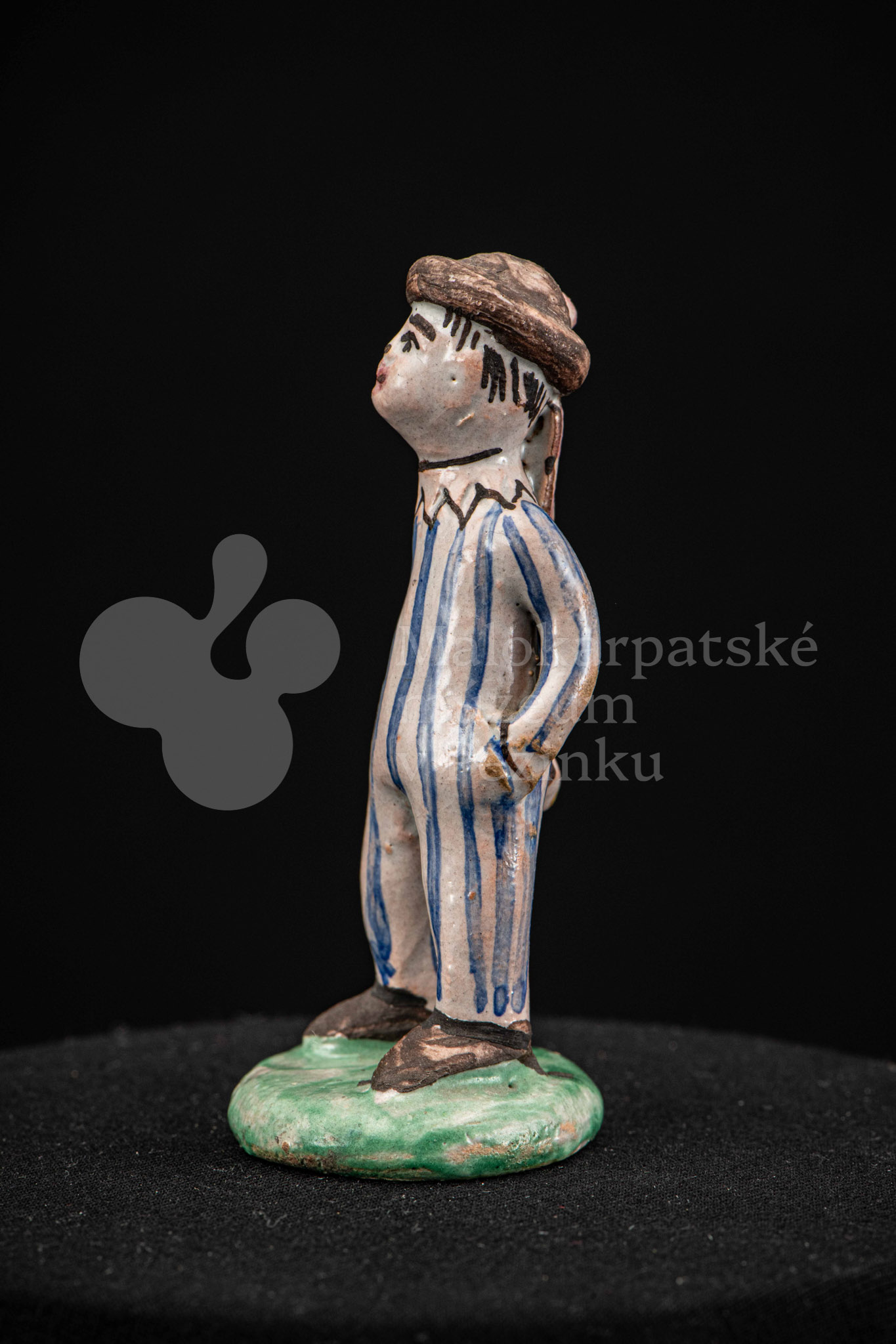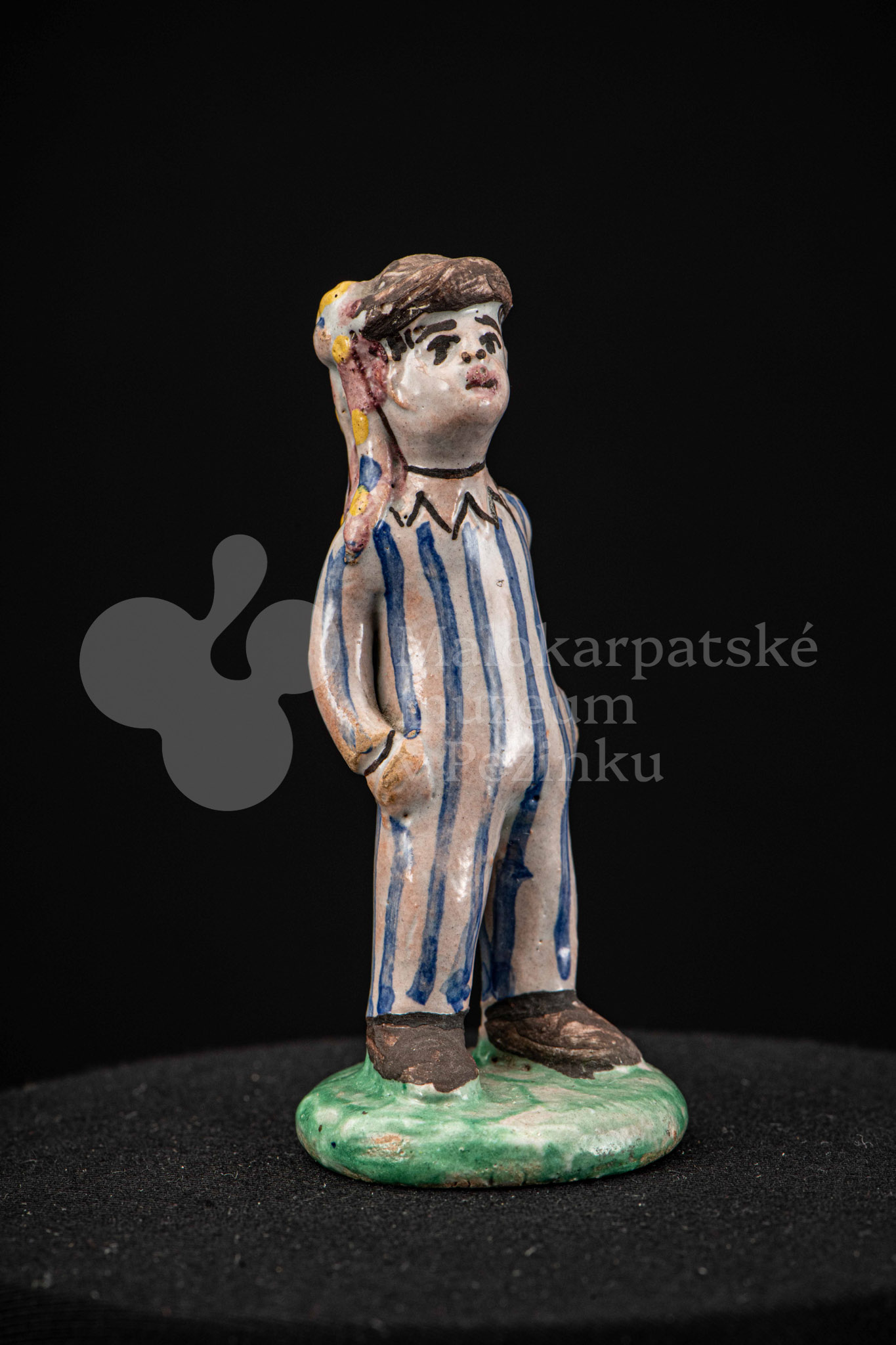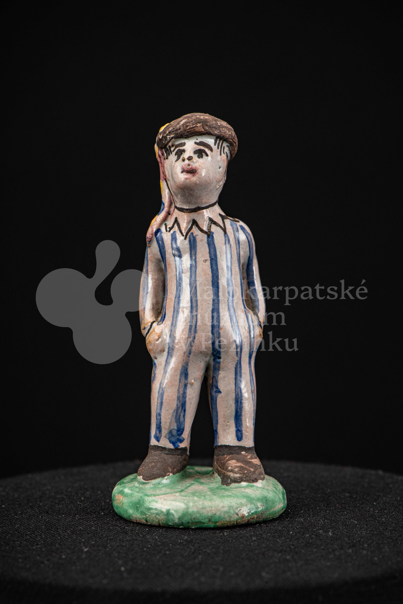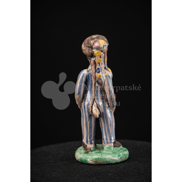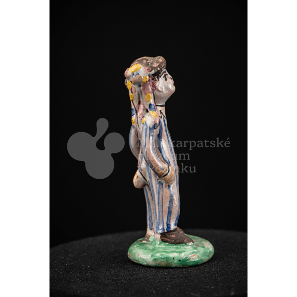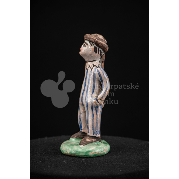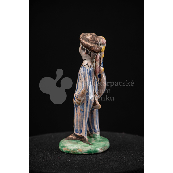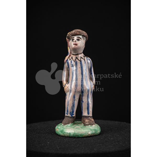 Plastika fajansová – stojaci chlapec v pruhovaných bielomodrých šatách, s manganovým klobúčikom. Okrúhly podstavec je zelený. Na rube podstavca je značenie F.K. ST.